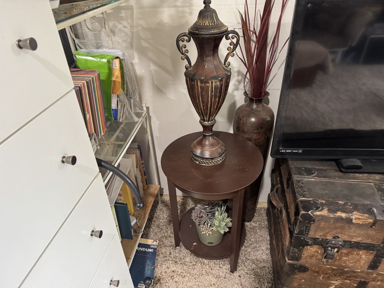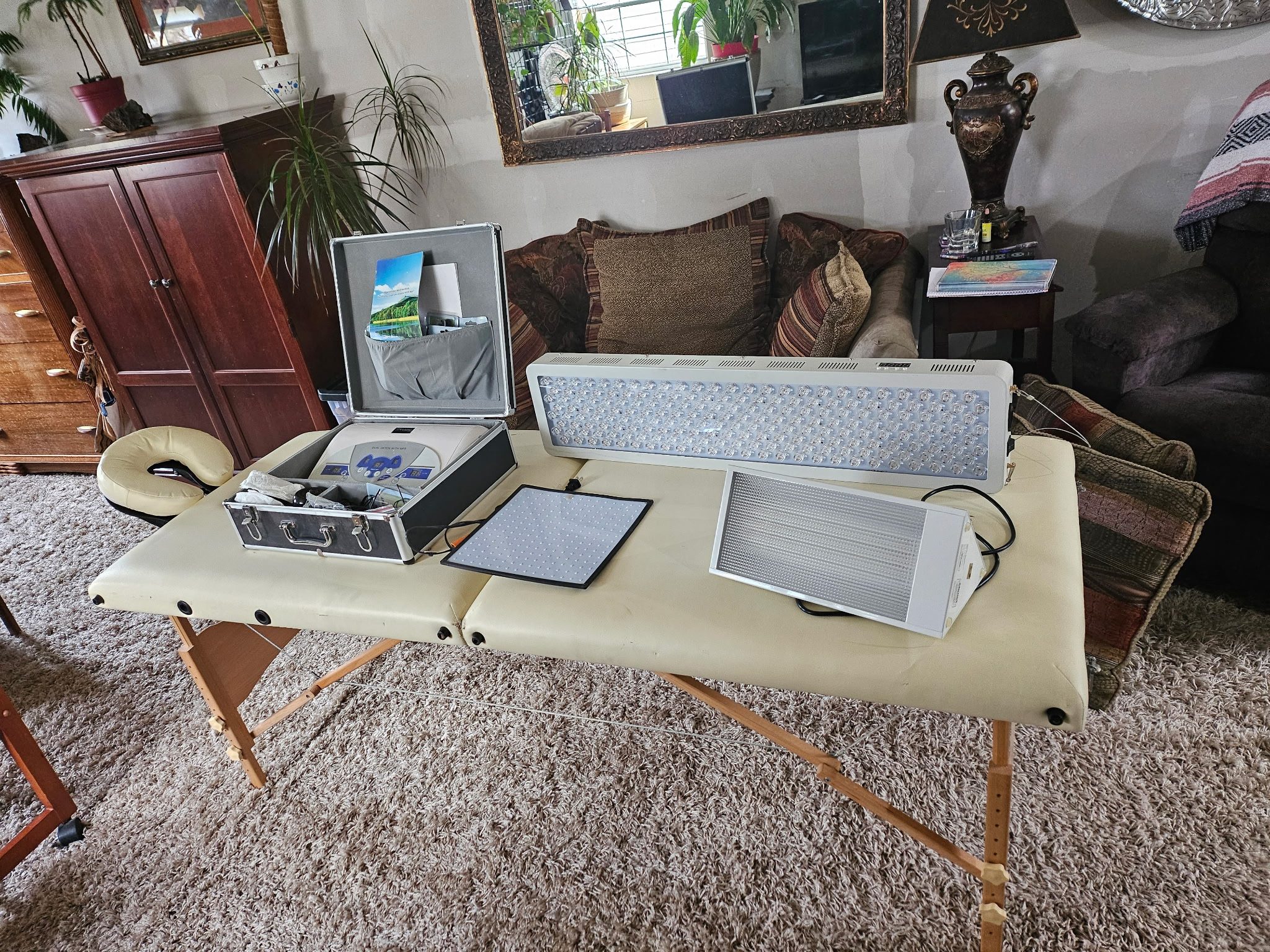 Household & Misc: Frigidaire Stacked Washer & Dryer – Inferred Deep Red Penetrating Light System – Full Spectrum Light System – Oak Dresser – Oak Armoire – Singer Heavy Duty Sew Machine – Thread – Beads – Sewing Items – Cork Purses – Sheets of Cork – Zen Living Ation System – Framed Mirror – Sofa – Lamps – Rocker Recliner – Wall Decor – Water Filtration System – Paintings & Prints – Drop Leaf Table – Oak End Table – Cast Iron Dutch Oven – Frigidaire Refrigerator – Cast Iron Skillets – White Dresser – Antique Trunks – Television – Claw Feet Table – (100’s) Movies – Oak Arm Chair – Oak & Wicker Cabinets – Twin Size Bed – Live Potted Plants