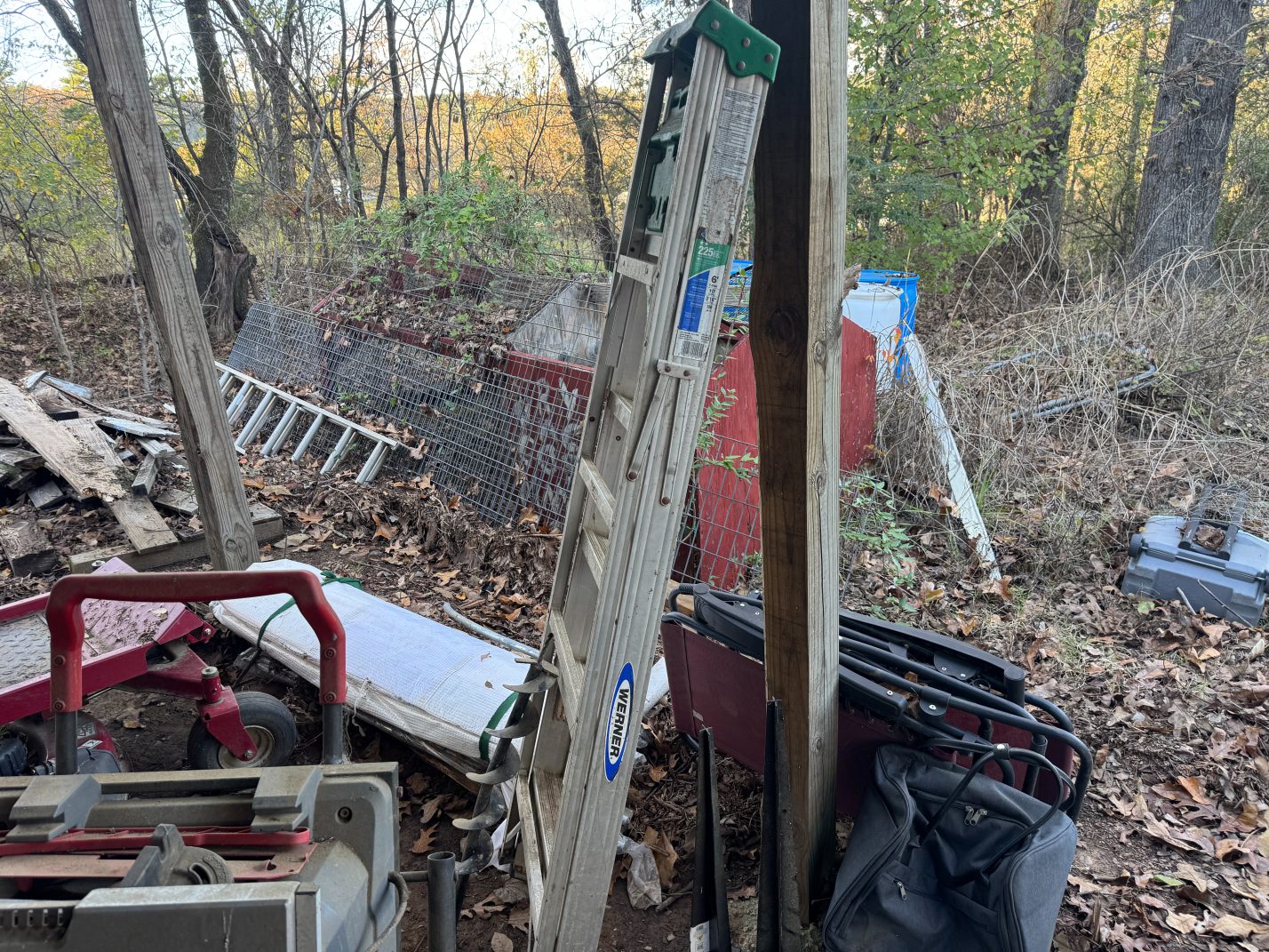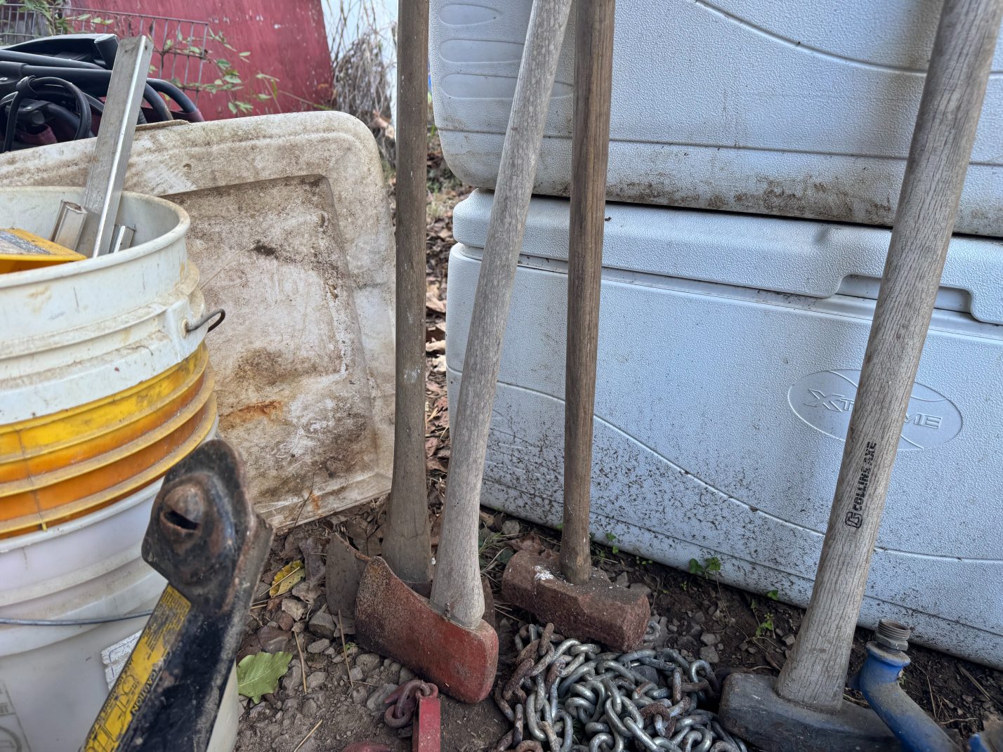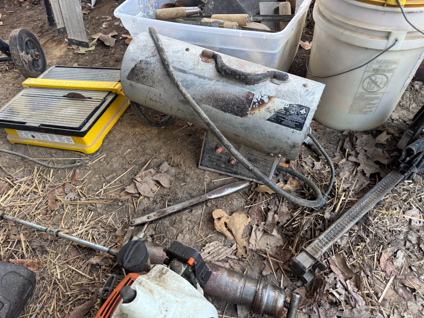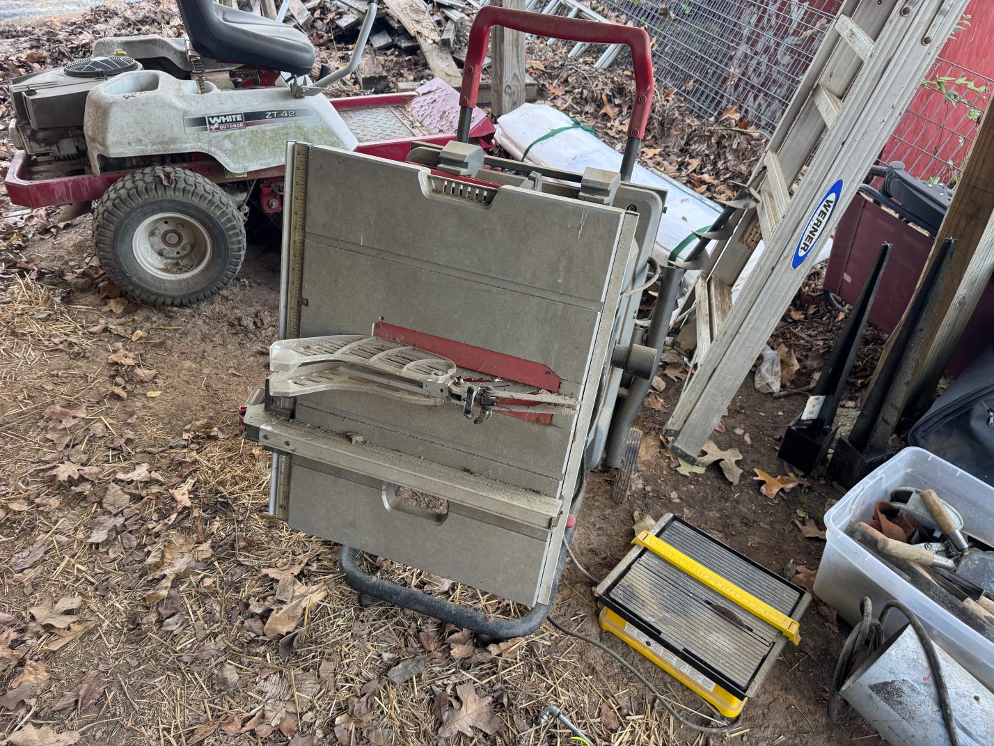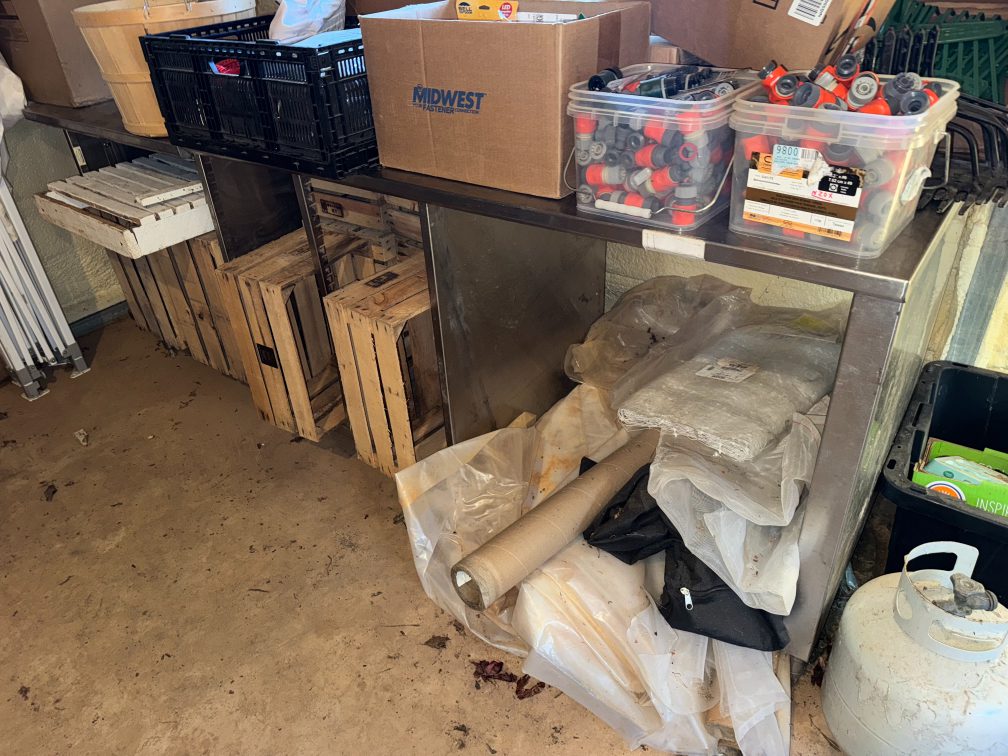 Tools/Shop Items: Sears Reciprocating Saw – Black & Decker Power Miter Saw – Stihl Chainsaw – Come Along – Belt Sander – Bench Vise – Log Chain – Chain Binder – Sledgehammers – Freeze Proof Faucet – Axes – Tile Saw – Ryobi Electric Weed Eater – Stihl Weedeater – Concrete Finish Tools – Gardening Hand Tools – Aluminum 6 Ft Ladder – Gas Cans – Electrical Meter Jacks – Wire Panels – Sheet Metal – Extension Cords – 50-Gallon Plastic Barrels – Dolly – Wood Crates – Wood Milk Crate – Motorcycle Helmets – Rotozip – Tools – Toolbox – Skilsaw – Toolboxes – Dremel Tools – Ryobi Compound Miter Saw – Brass Couplings – Spigot Valves – Extension Ladder – Yard Dump Trailer – Wilderness Pungo 100 Kayak – Air Compressor – Water Pumps – Grow Equipment – Table Saw On Stand – Vinyl Windows – Glass Blocks – Rubbermaid Feed Trough – Irrigation Supplies – Sprinkler Heads – Rake Heads – Propane Tank – Garden Hose – Buckets – Metal Sprinkler – Brute Trash Can – Lettuce Washer – Fire Extinguisher – Popup Canopies – Stainless Tables – Stainless Racks – Metal Cart – Stools – Metal Shelf – Propane Heater – Ice Chests – Planters