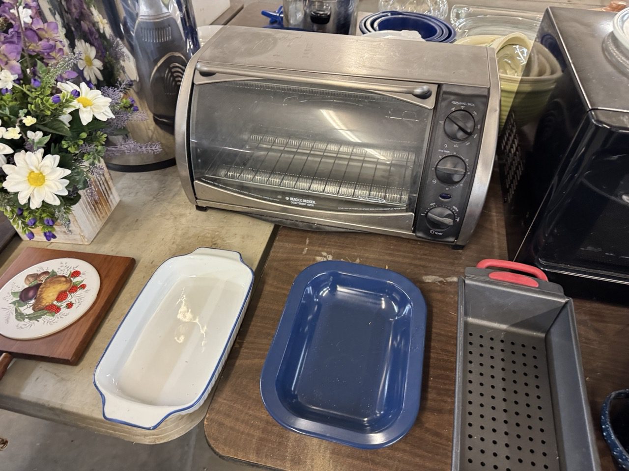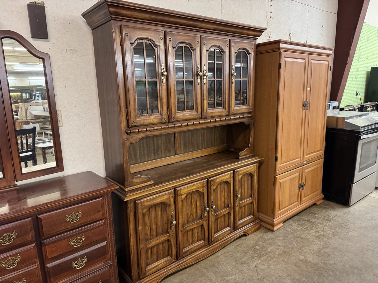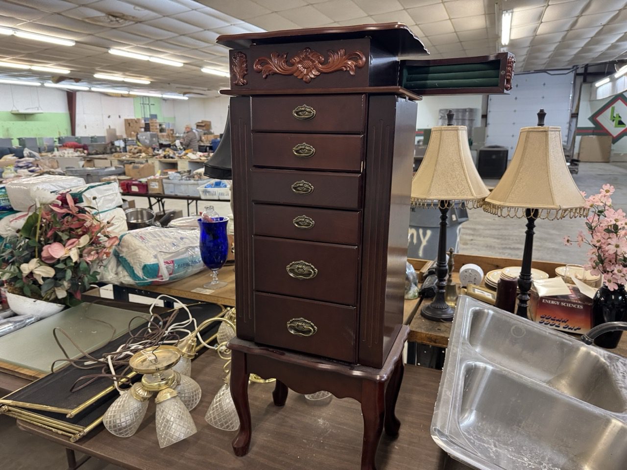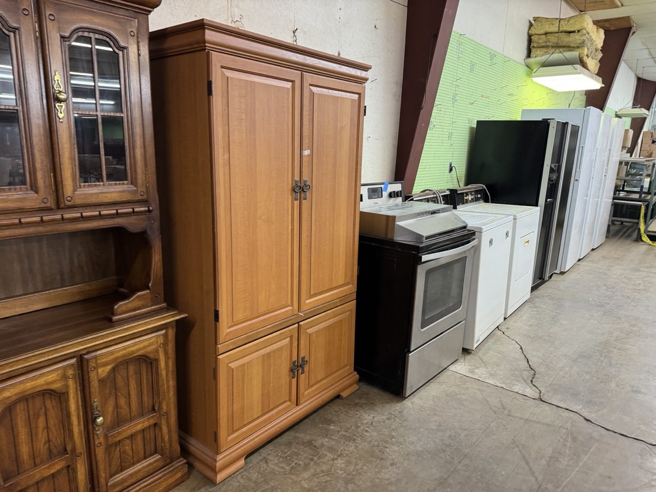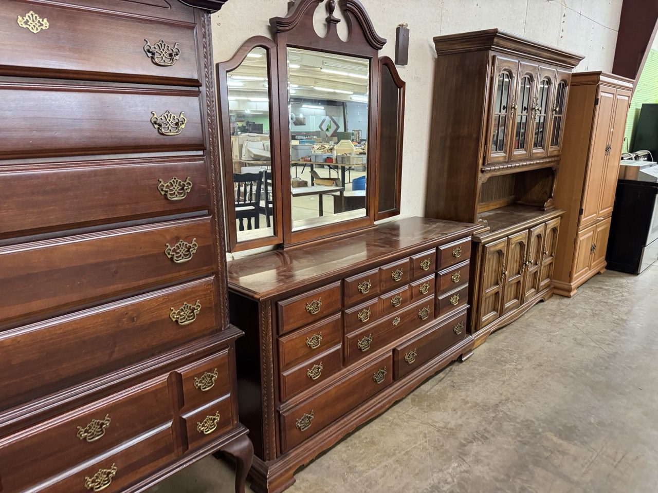 Furniture & Household:Â Ashley Office Desks – Office Chairs – Couch – Arm Chairs – Table & Chairs – Cherry Dresser, Chest & Night Stand – Oak Hutch – Hanging Wall Art & Pictures – End Tables – Curio Cabinet – Drop Leaf Table & 2 Chairs – Bakers Rack – Jewelry Armoires – Mirrors – Stainless Pots – Kitchen Utensils – Pots & Pans – Toaster Oven