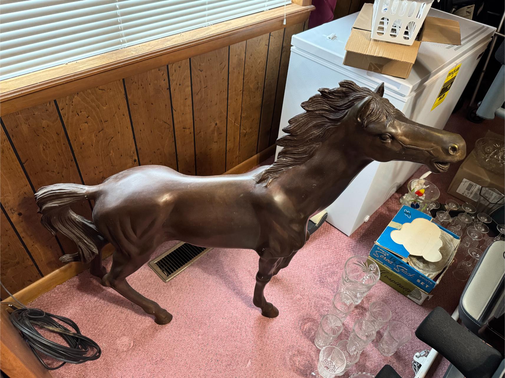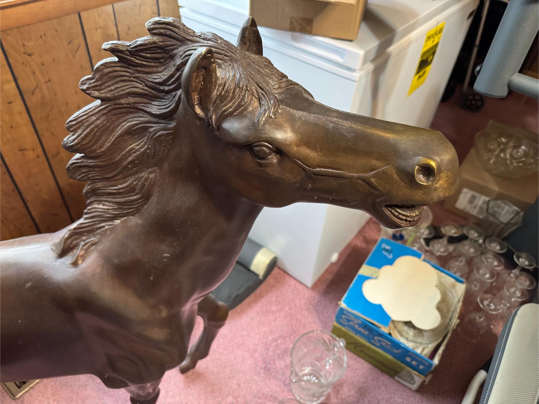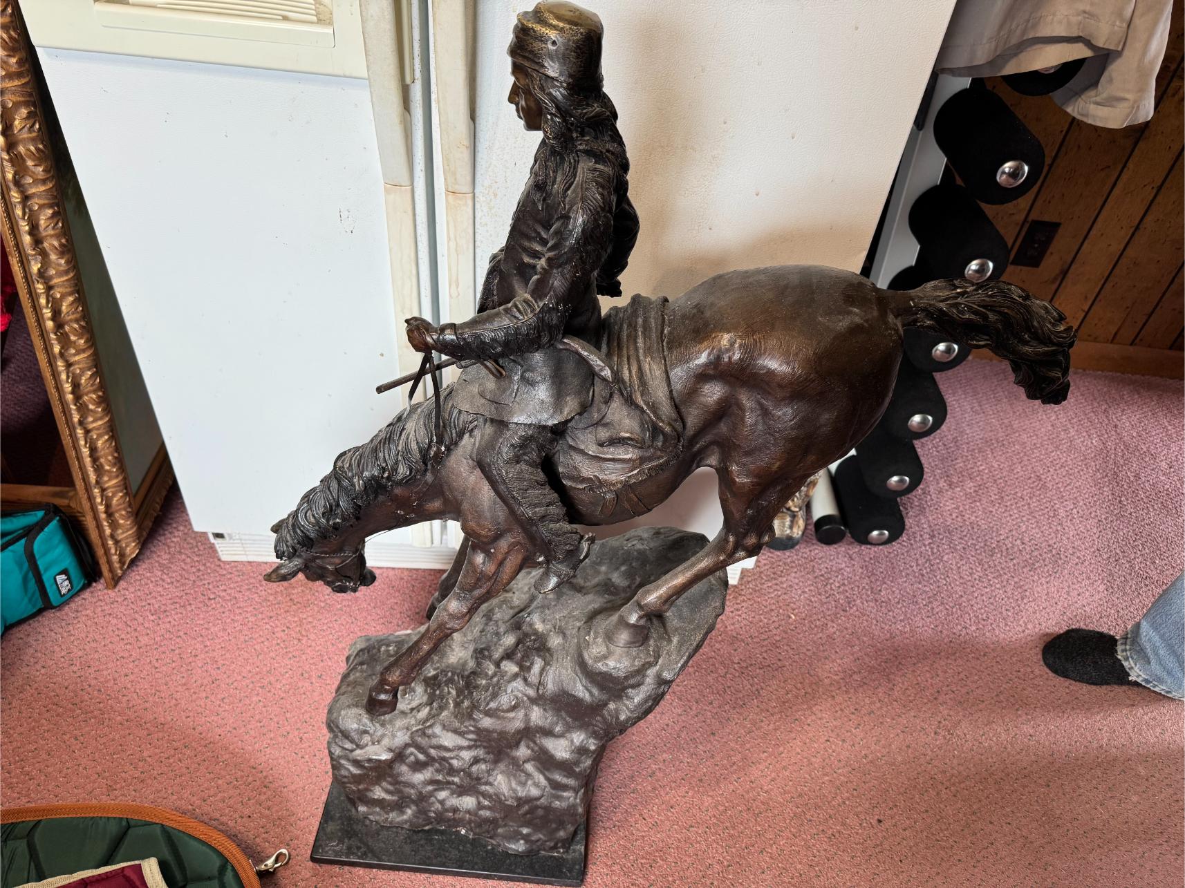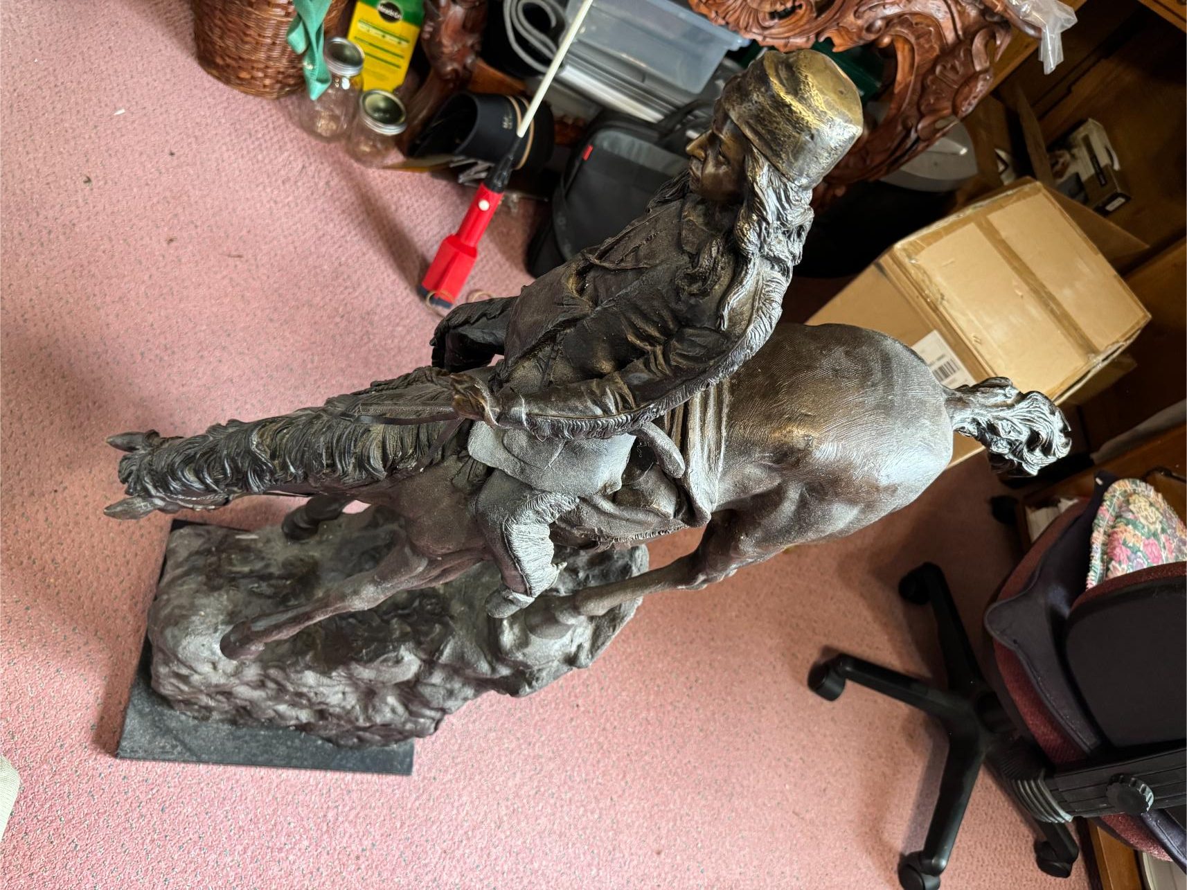 Antiques & Collectibles:Â Â Remington Bronze Hosre & Rider Statue – Bronze Horse – Cast Iron Bell – Tapestry Picture – Mist Glassware (Starburst, Clear Glass, Depression) – Quban Dishes – Lantern
