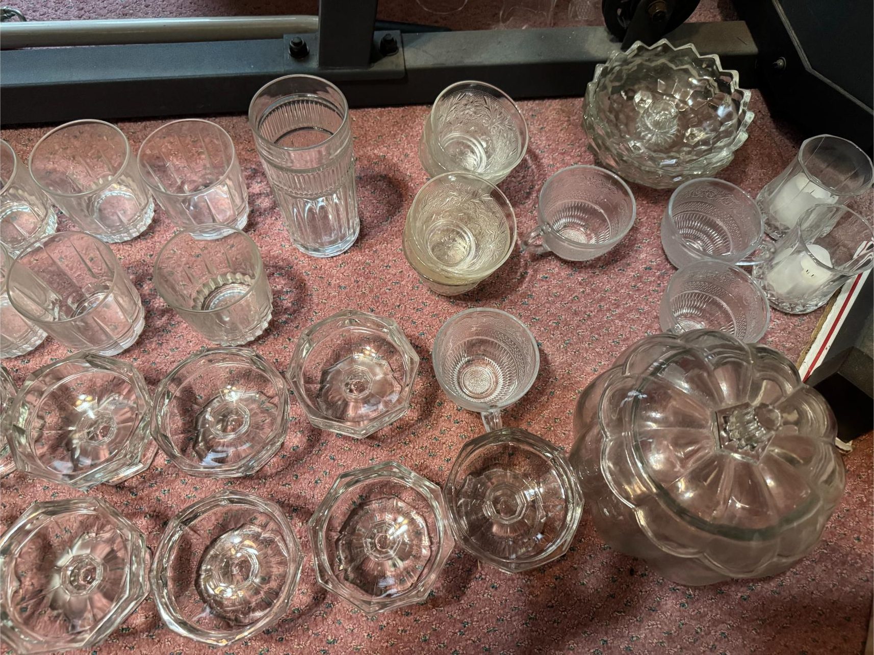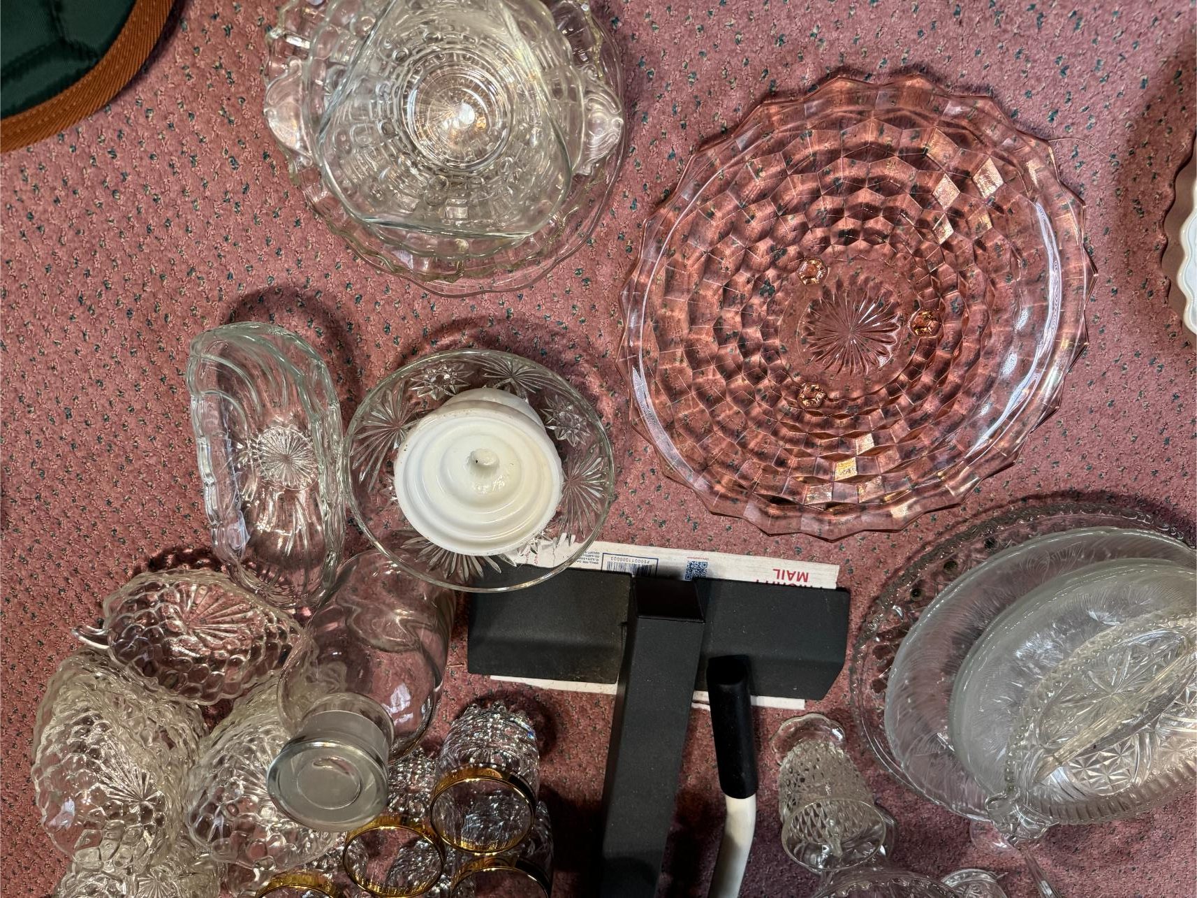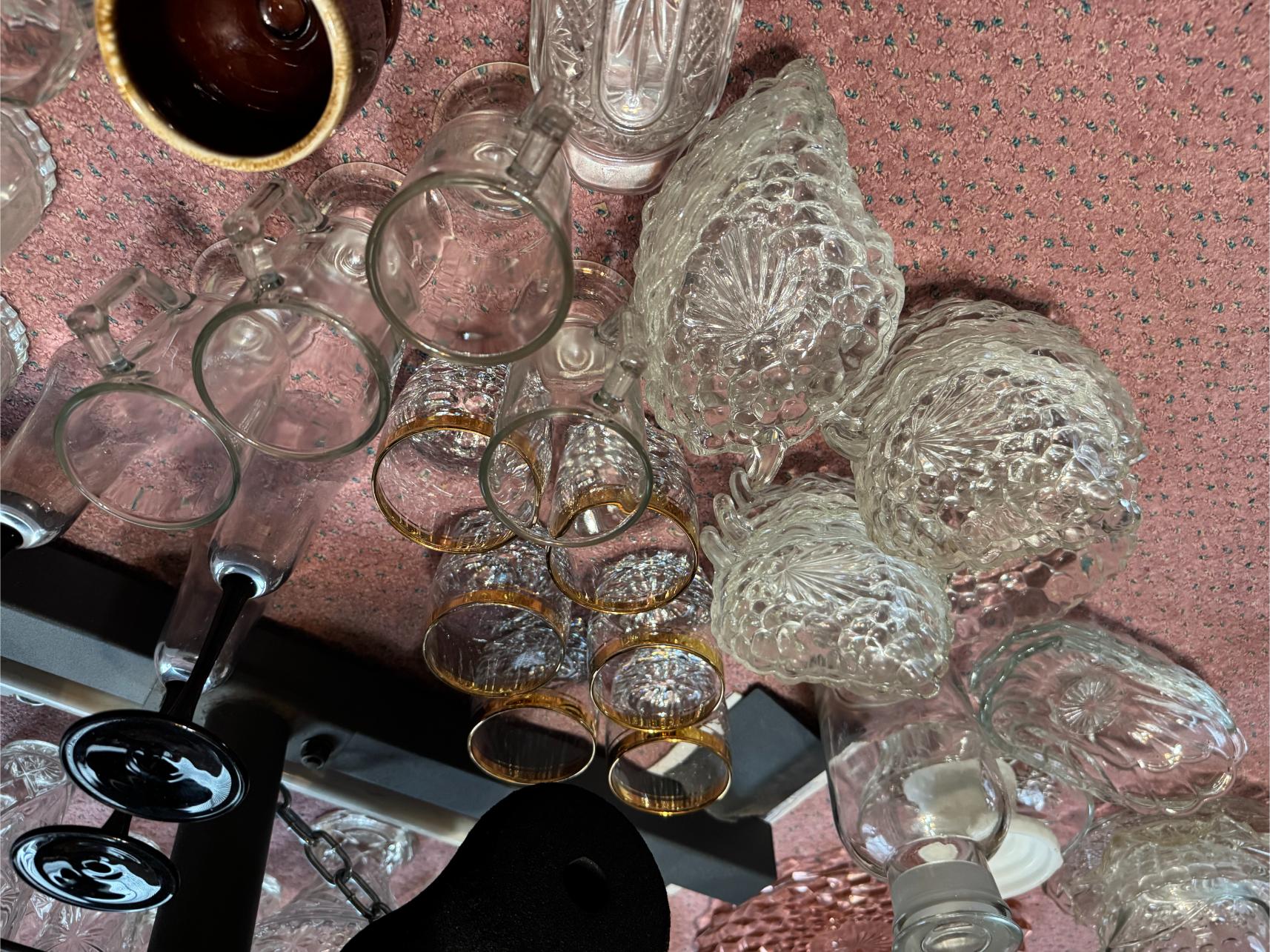 Antiques & Collectibles:Â Â Remington Bronze Hosre & Rider Statue – Bronze Horse – Cast Iron Bell – Tapestry Picture – Mist Glassware (Starburst, Clear Glass, Depression) – Quban Dishes – Lantern