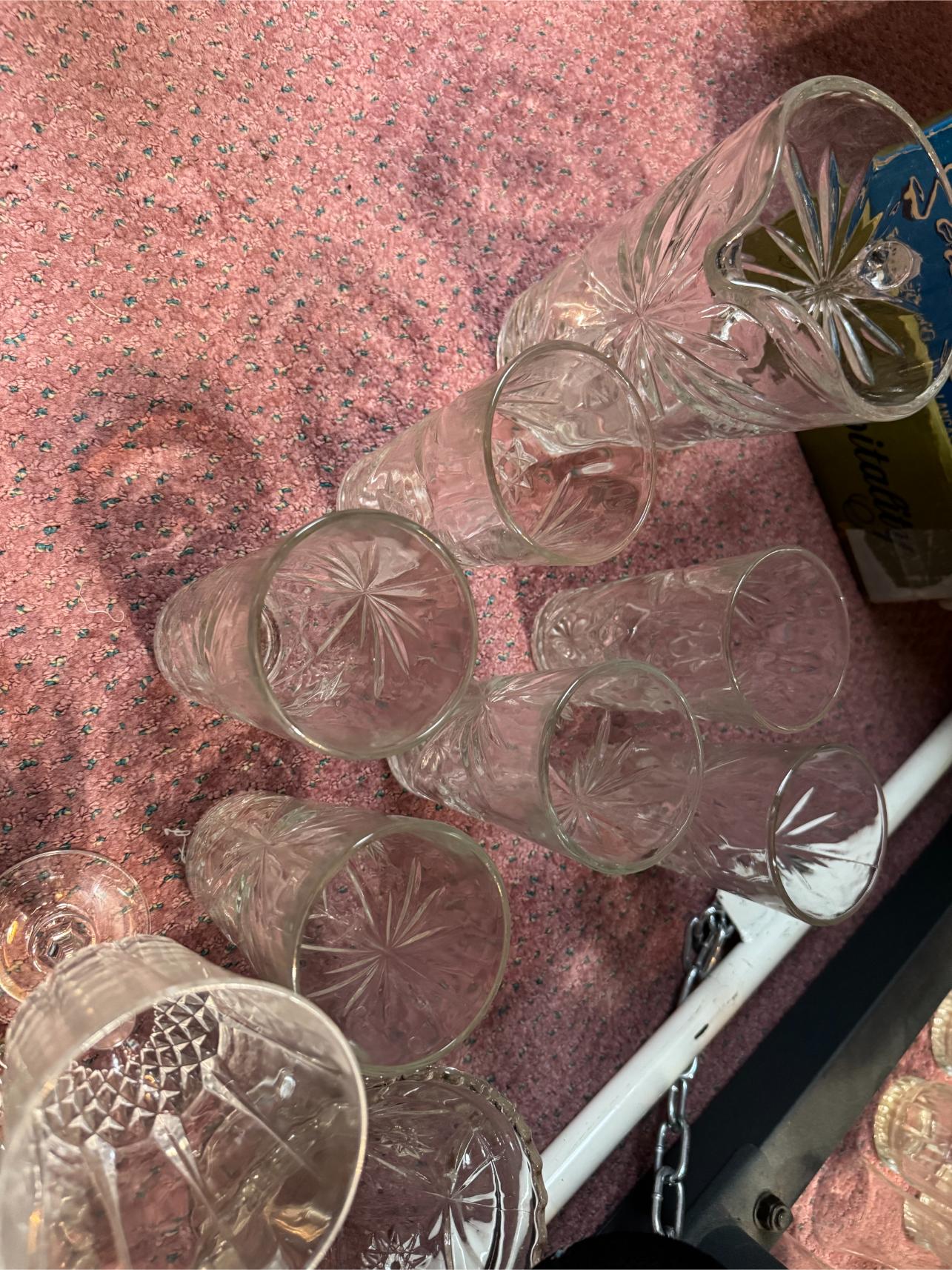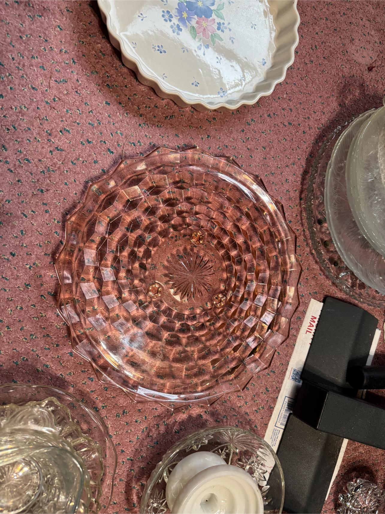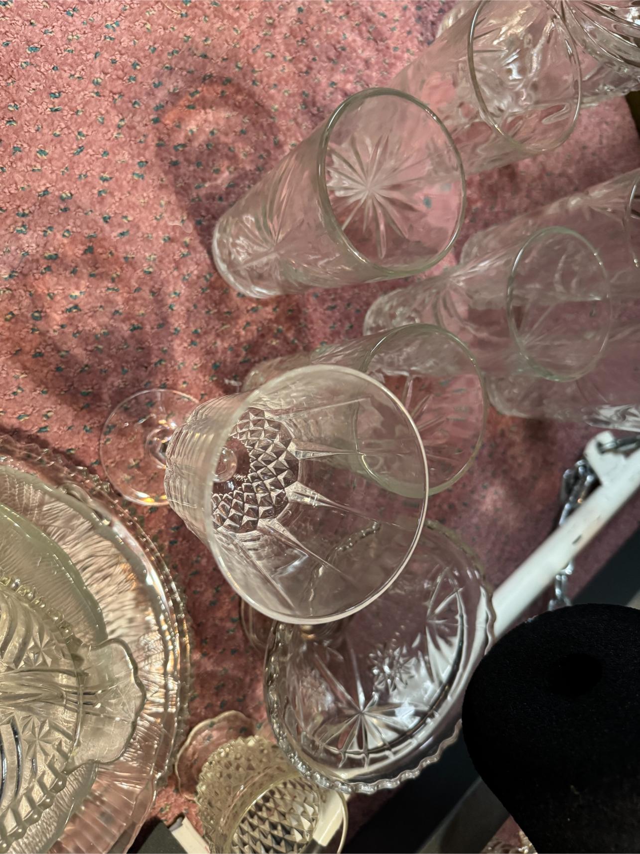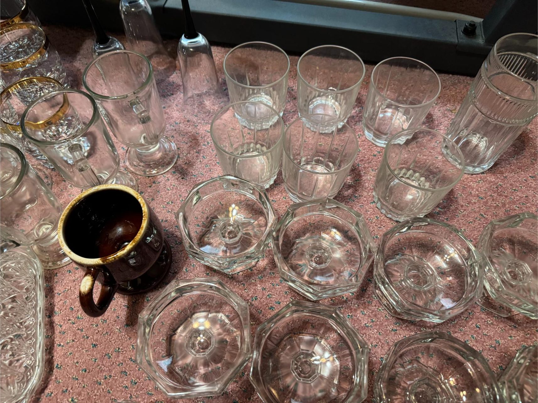 Antiques & Collectibles:Â Â Remington Bronze Hosre & Rider Statue – Bronze Horse – Cast Iron Bell – Tapestry Picture – Mist Glassware (Starburst, Clear Glass, Depression) – Quban Dishes – Lantern