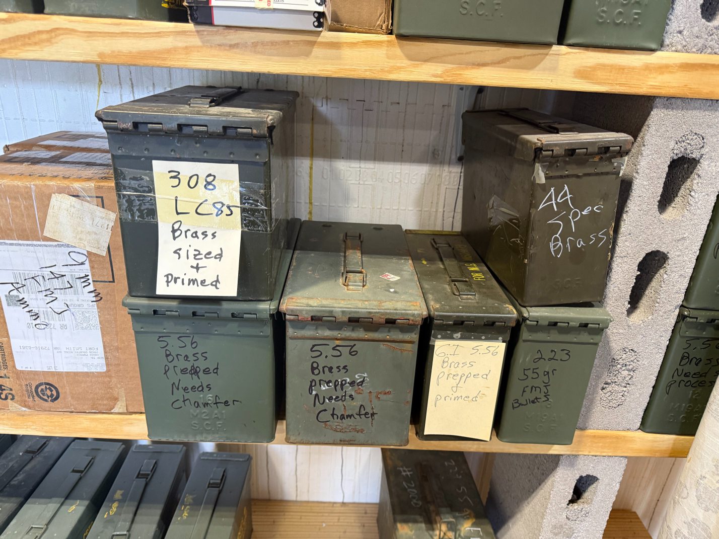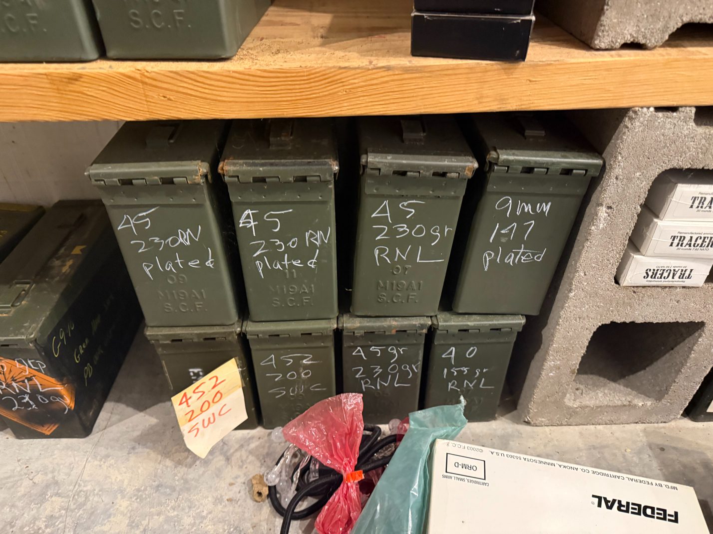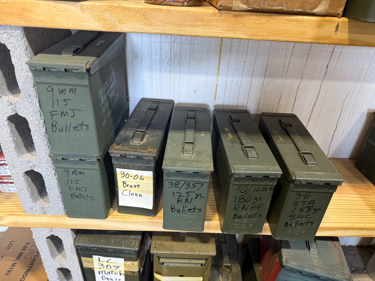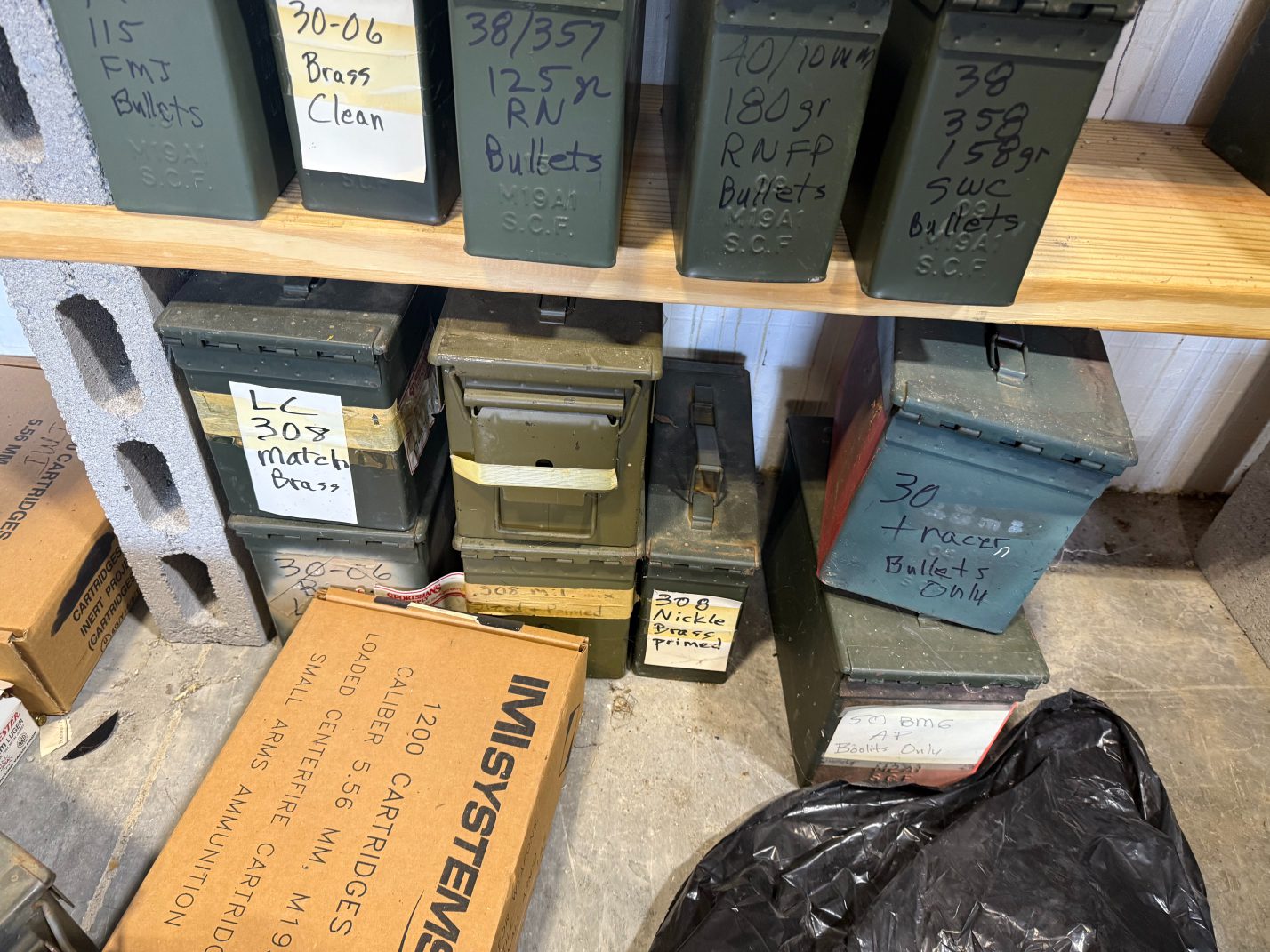 Ammunition/Reloading: 5.56 – 5.56 Tracer – .225 – Federal 5.7×28 FMJ – Barnual 5.45×39 Fact HP – XM 193 – .45 Plated – .40 – .9mm – .9mm 115 BLEM – Federal .45 ACP – .308 Mixed Brass – .45 FMJ – .300 Blackout – .223 – .9mm Luger – .12 Gauge Buck Shot – .300 Blackout Brass – Federal .280 Brass – .6mm Brass – .45 Brass – .38/.357 Bullets – .308 Match Brass – 7.62mm x 51 NATO – Reloading Press – Magazines – Metal Targets – Gun Cases – Ammo Cans – Approximately 250 LBs of Tannerite