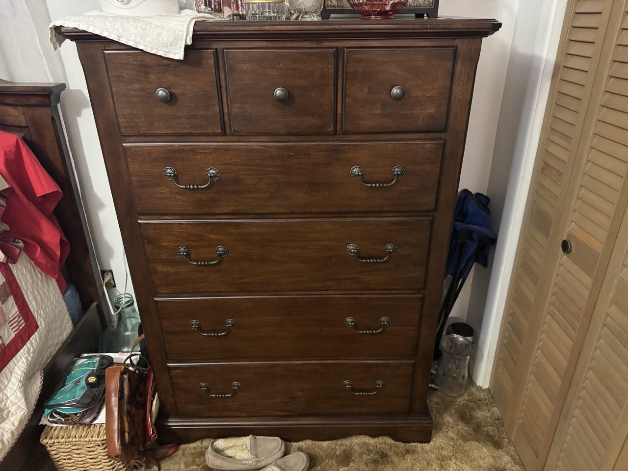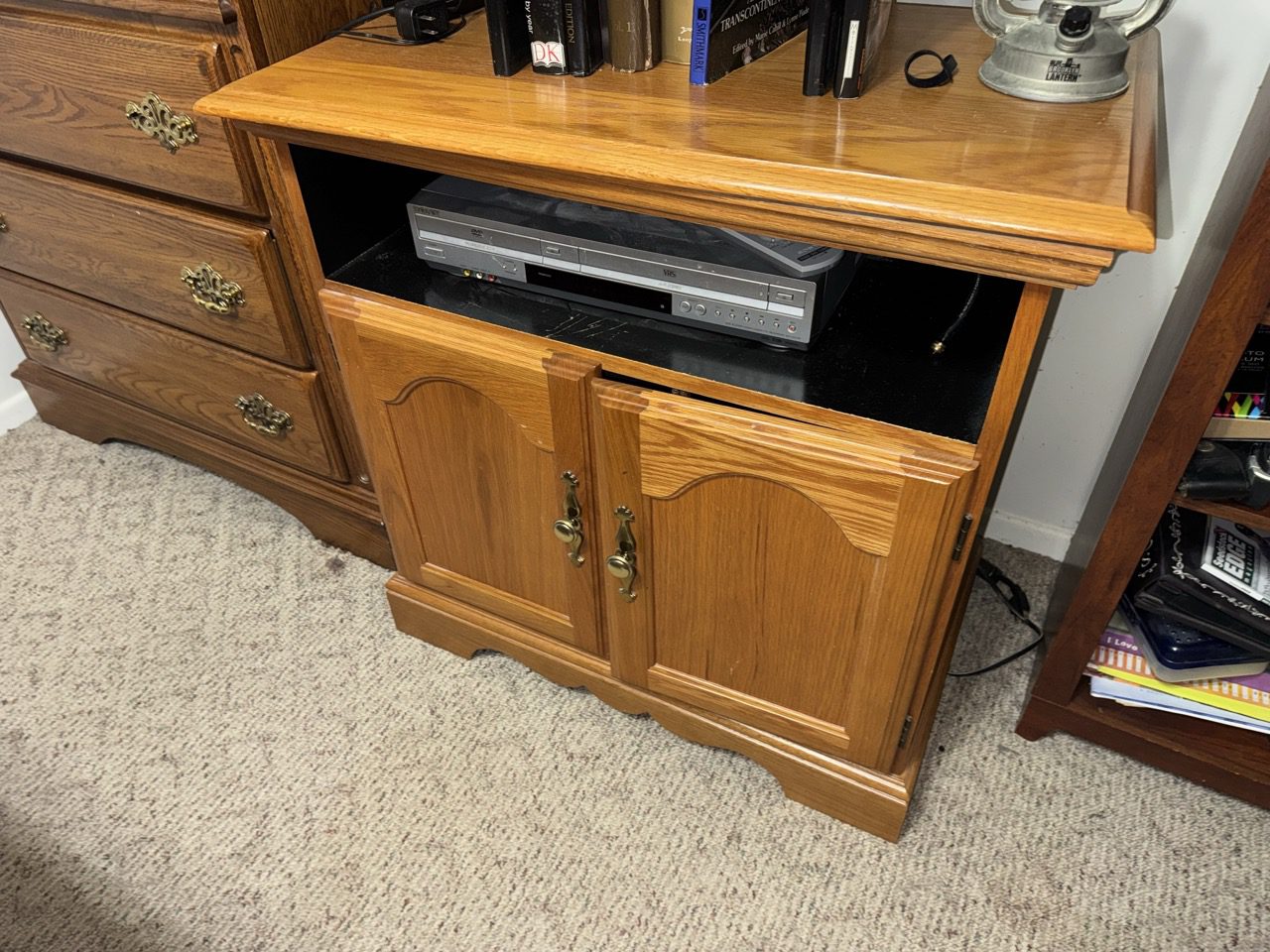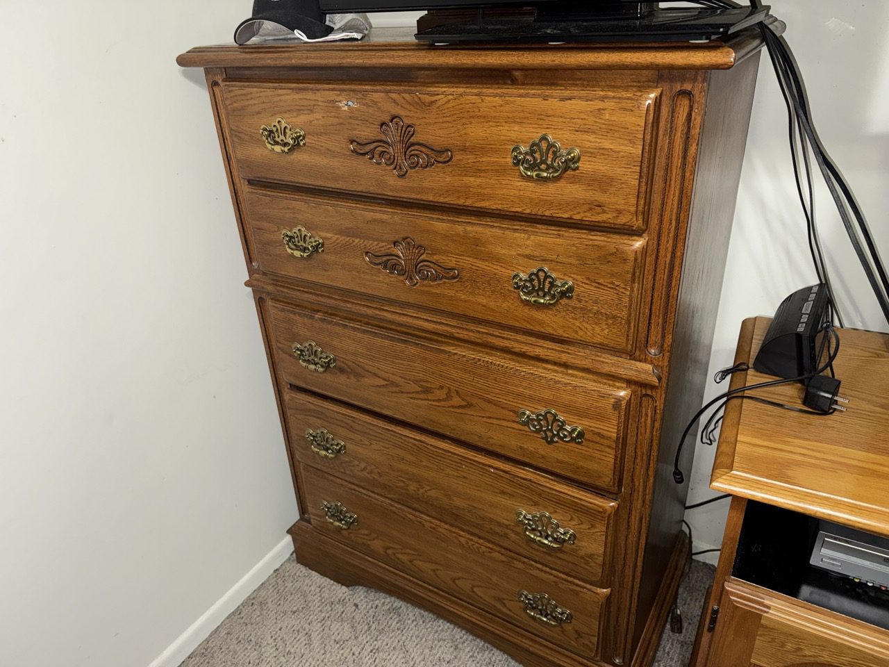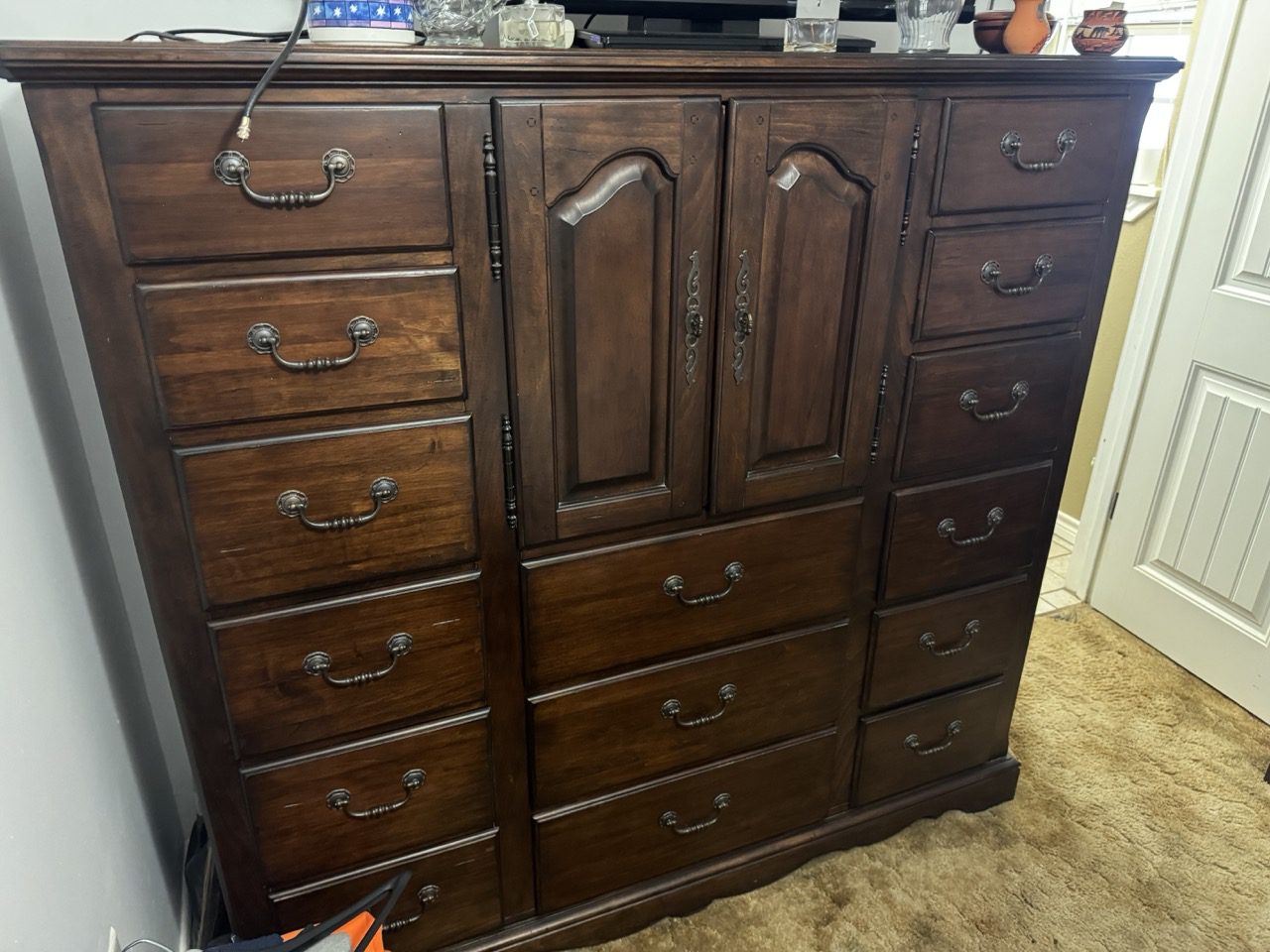 Furniture: Settee – (2) Chest of Drawers – Armoire – (2) Night Stands – (2) Queen Size Bed – Mirrors – Lamps – Wicker Chest – Oak Chest – Bookcase – Oak Gun Rack – Microsuede Armchair – End Table – Floor Lamp – Entertainment Center – Microsuede Sofa – (2) Tiffany Style Lamp – Table & Chairs