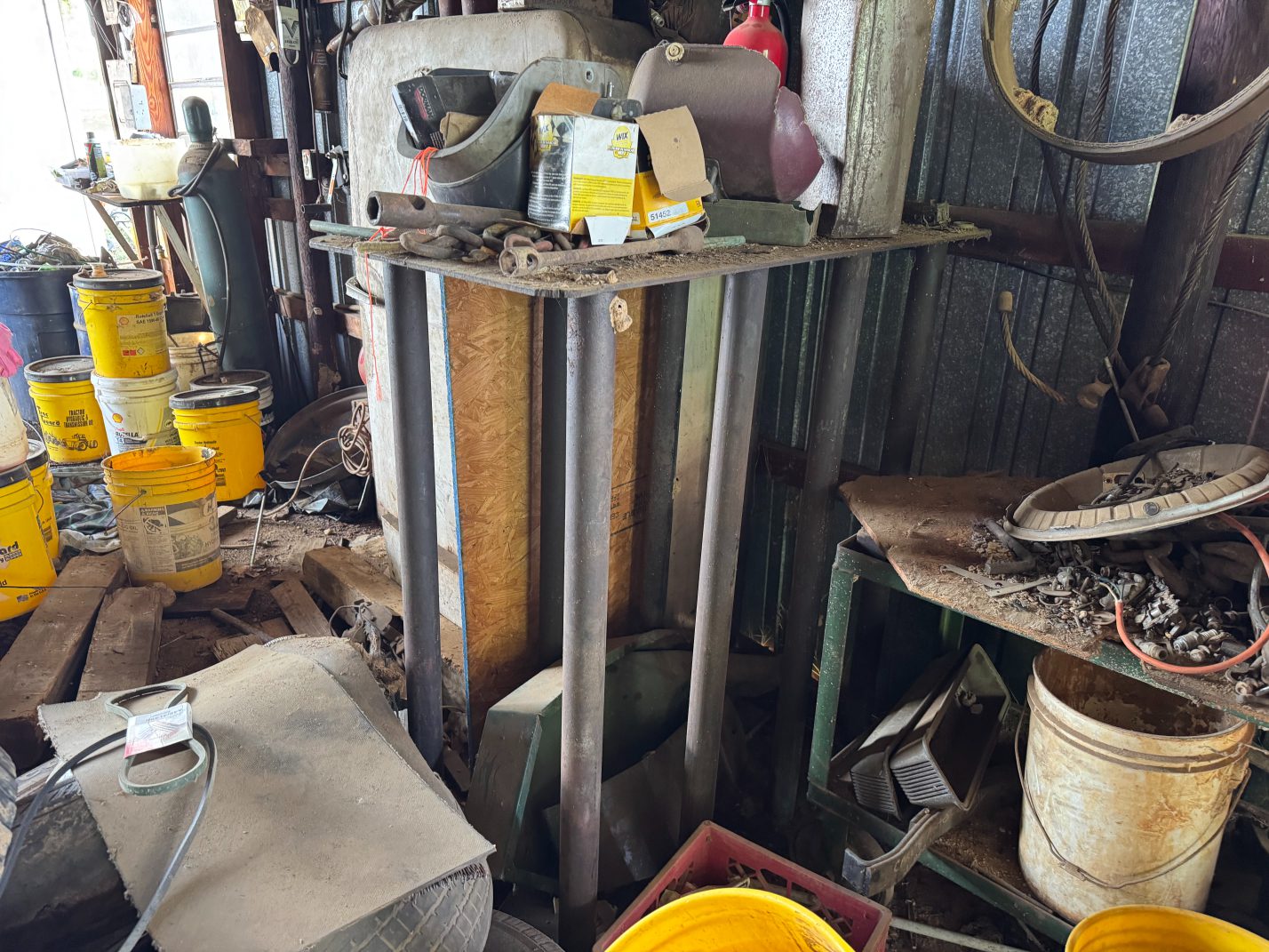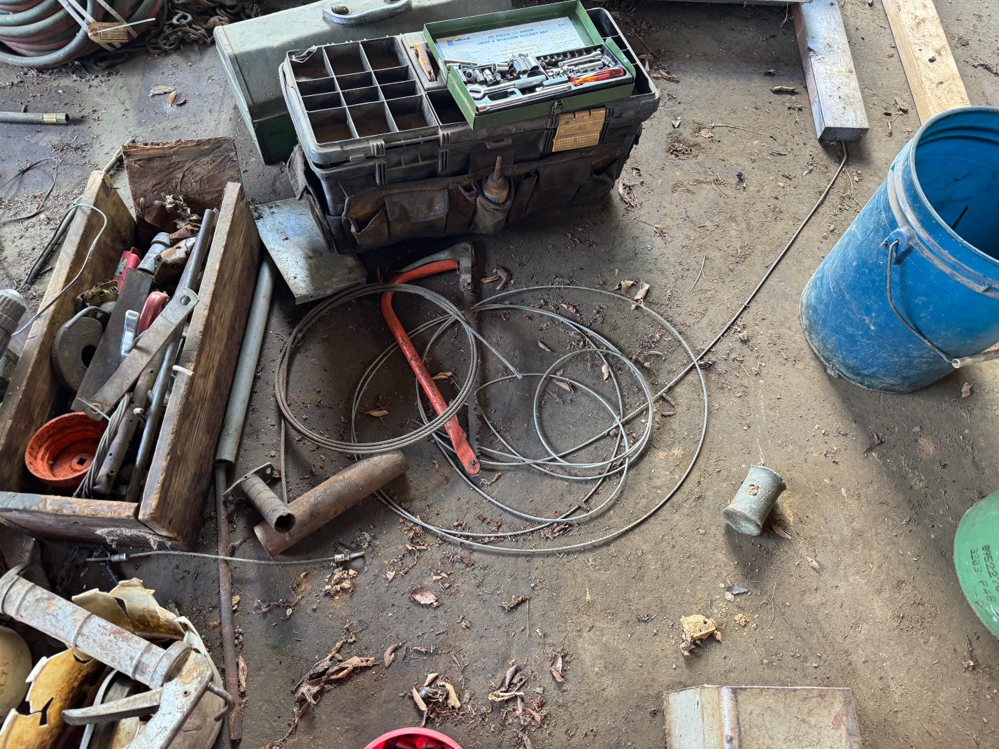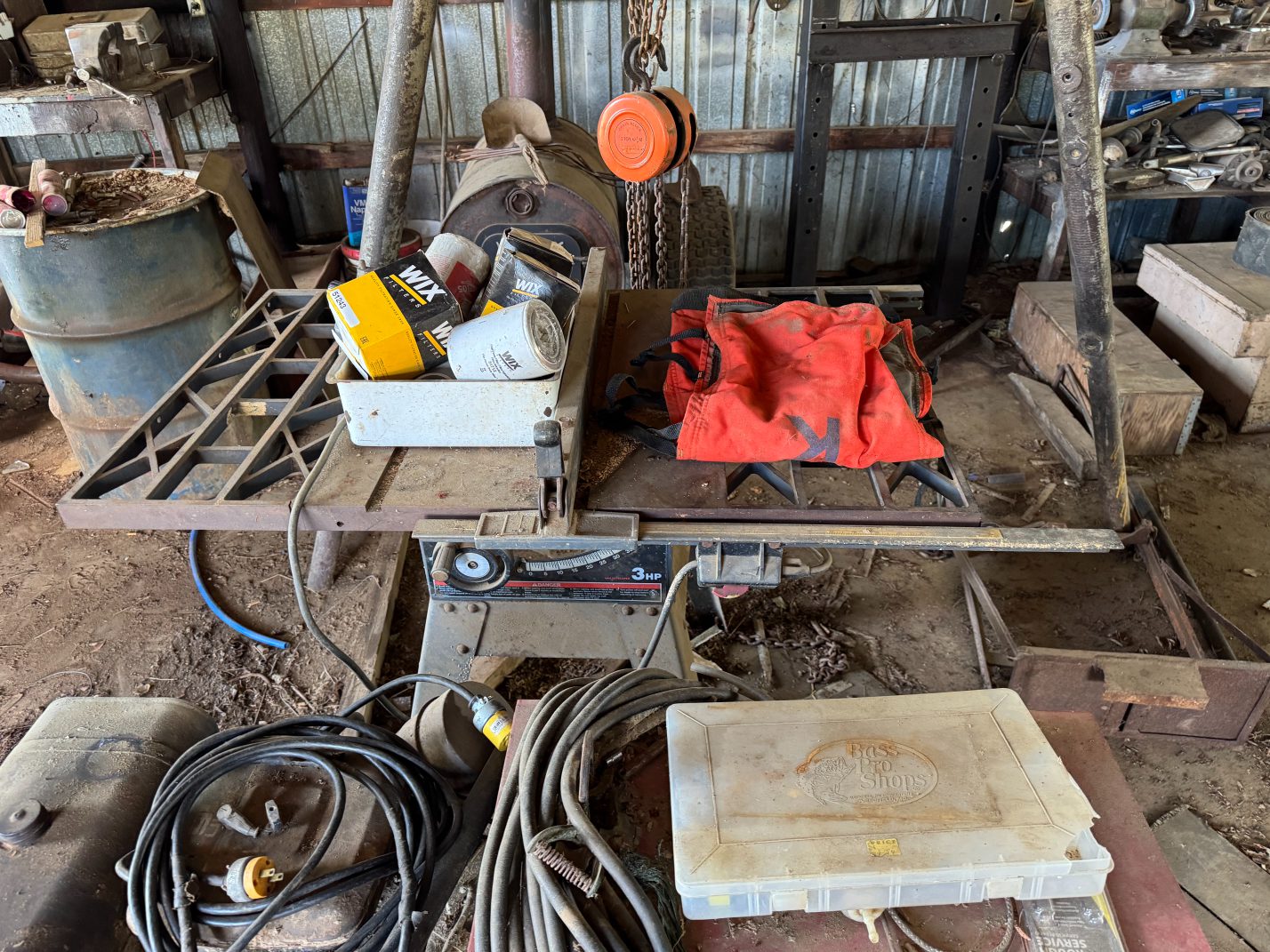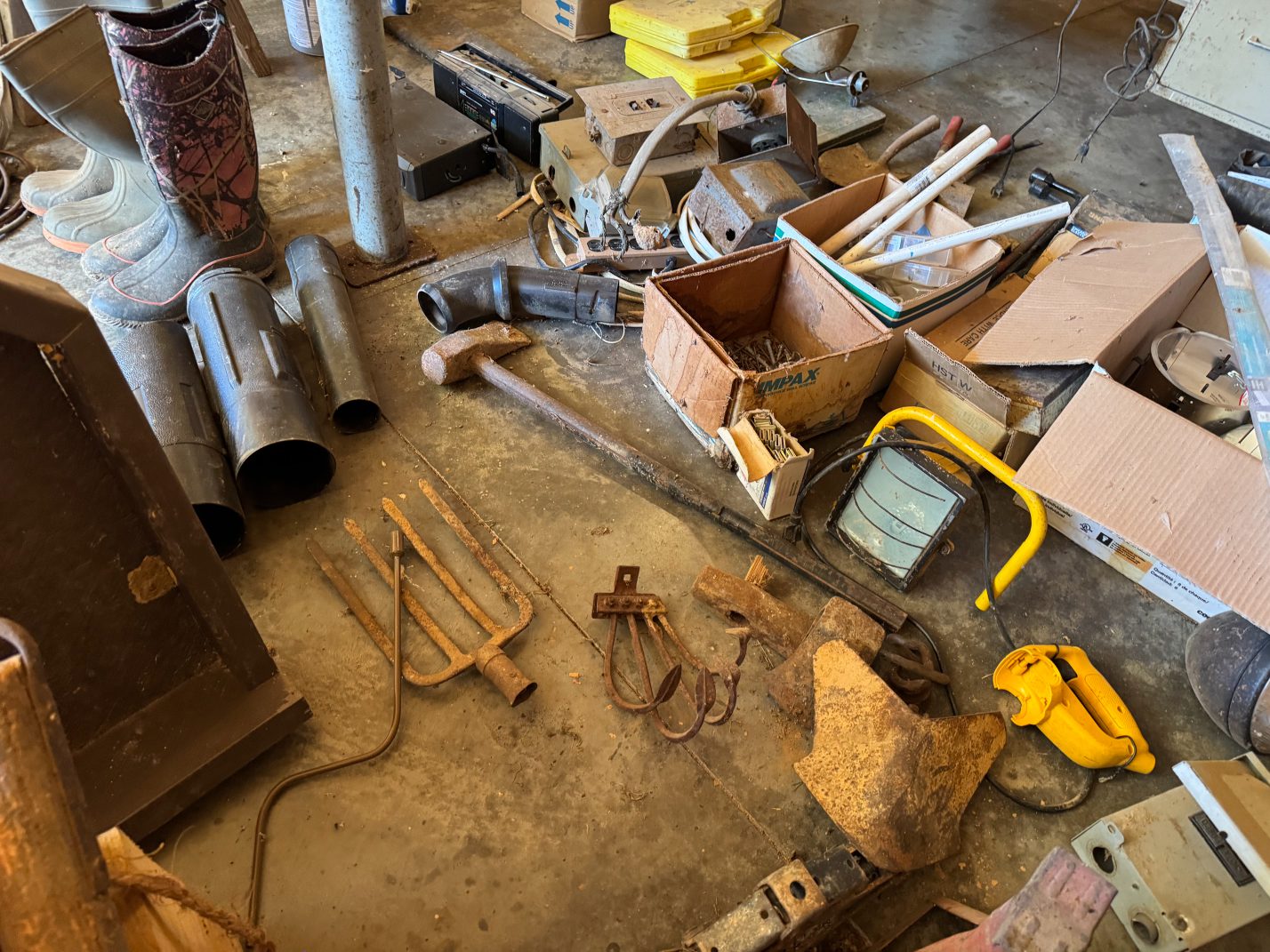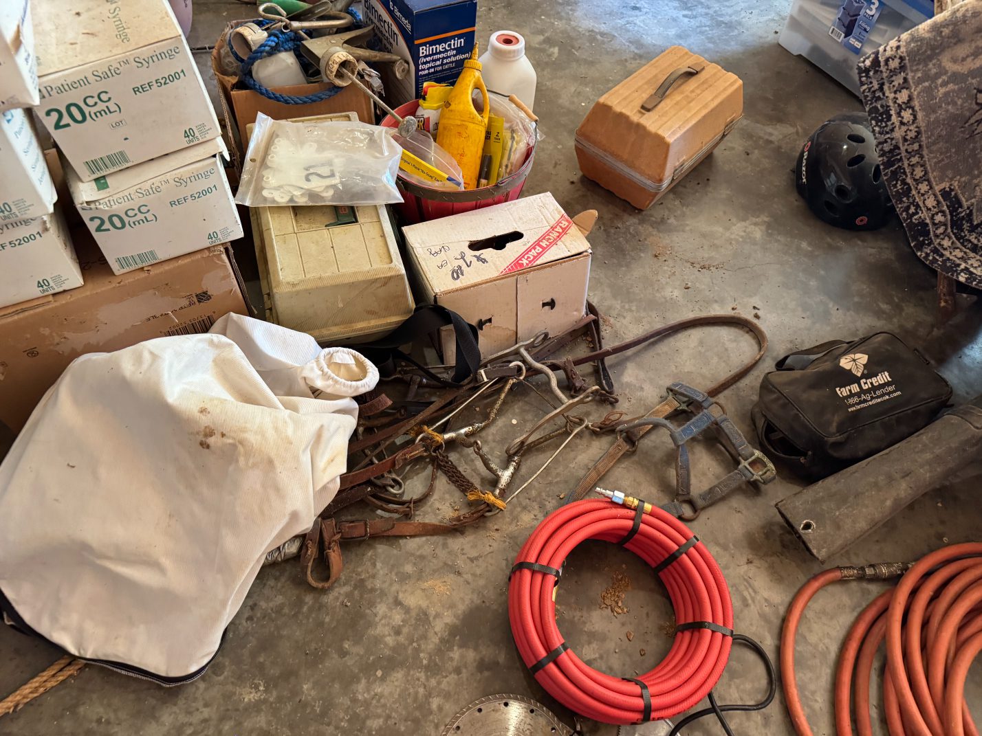 Tools/Shop Items: Post Hole Diggers – T-Posts (100s) – Wooden Chicken Coop – Electric Fencing – Barbed Wire – Wire Fencing – Chicken Wire – Tractor Tires – Tires – Wrought Iron Railing – Galvanized Tub – Misc. Wire – Misc. Cable – Metal Barrels – Plastic Barrels – Turnbuckles – Chicken House Fans – Baler Belts – Baler Chains – Metal Pipe – Square Metal Tubing – Window Air Units – Metal Shelving – Medical Supplies and Equipment – Propane Tanks – Saw Horses – Industrial Air Compressor – Air Hoses – Corder Grinders – Horse Tack – Tile Saw – Shop Vac – 10in. Radial Arm Saw – Hand Saws – Hack Saws – Pipe Cutter – Jack Stands – Hub Caps – Whiskey Barrel – Gas Cans – Kerosine Cans – Water Skis – Tarps – Can Hooks – Pitch Forks – Splitting Maul – Halogen Shop Lights – Faucets – Electrical Supplies – Saddles – Railroad Anvils – Grinder – Bolt Bins – Vise – Chain Hoists – Metal Plate – C-Clamps – Bottle Jacks – Cutting-Torch Hoses – Drain Pipe – Creepers – Chop Saws – Transmission Jack – Wheels – Ryobi Chop Saw – Boomers – Socket Set – Tackle Box – Metal Roll Around Cart – Log Chains – Welding Helmets – Come-A-Longs – Air Tank – Hydraulic Hoses – Hydraulic Fittings – Shop Fan – Floor Jacks – Car Parts – ¾ Socket Set – Ratchet Straps – Transmission – Lincoln Weldanpower 225 G7 – Craftsman Table Saw – Radiators – Air Hammer Drill – Acetylene Bottles
