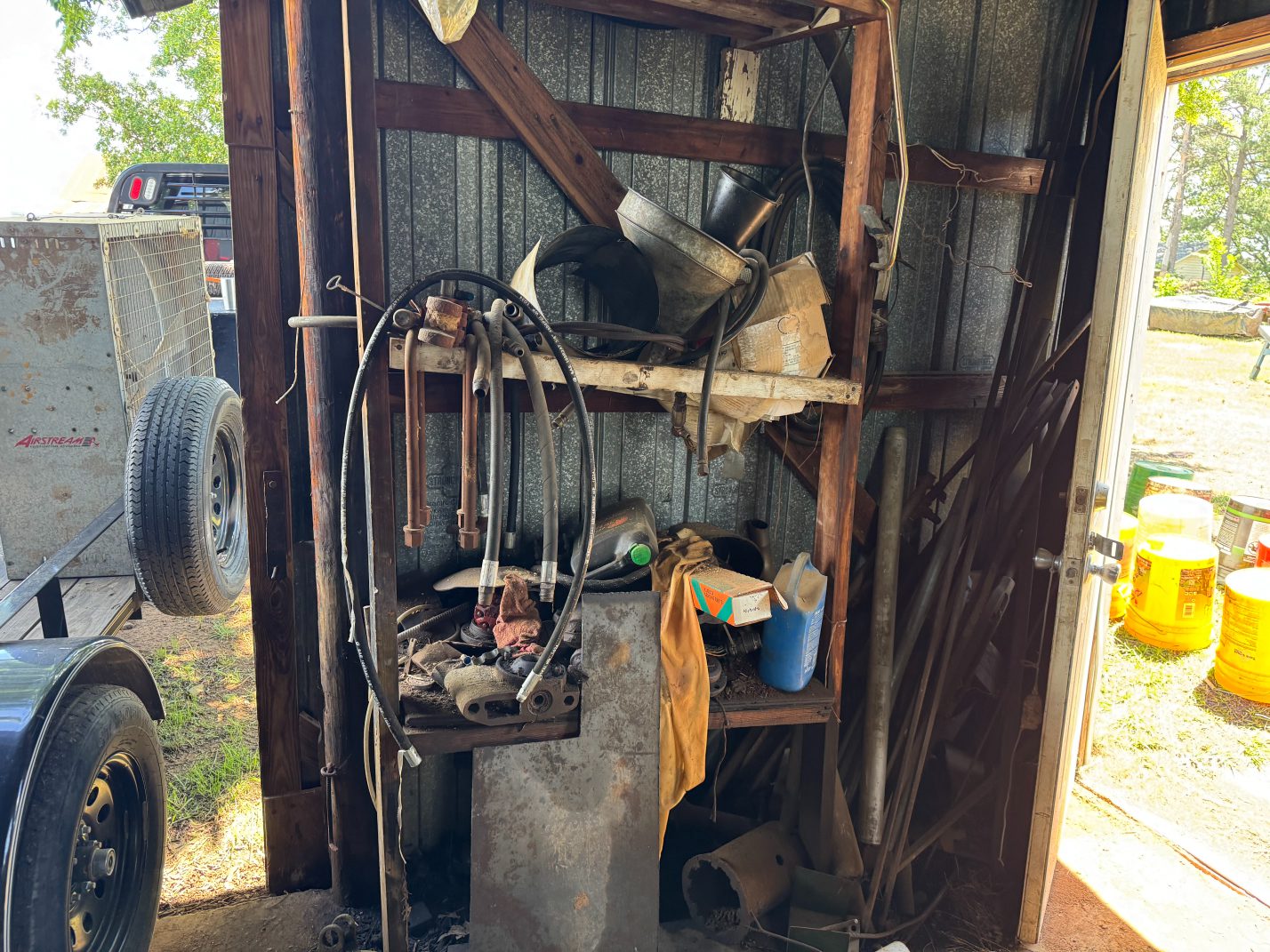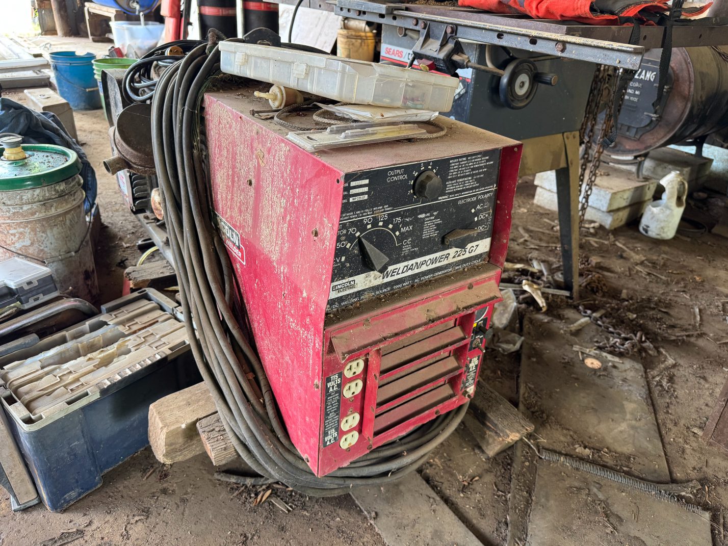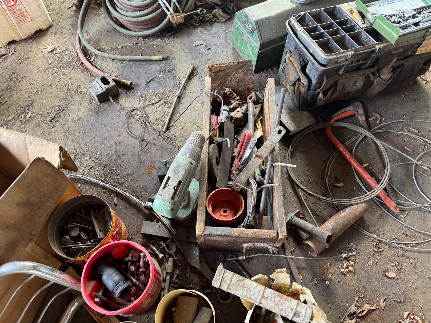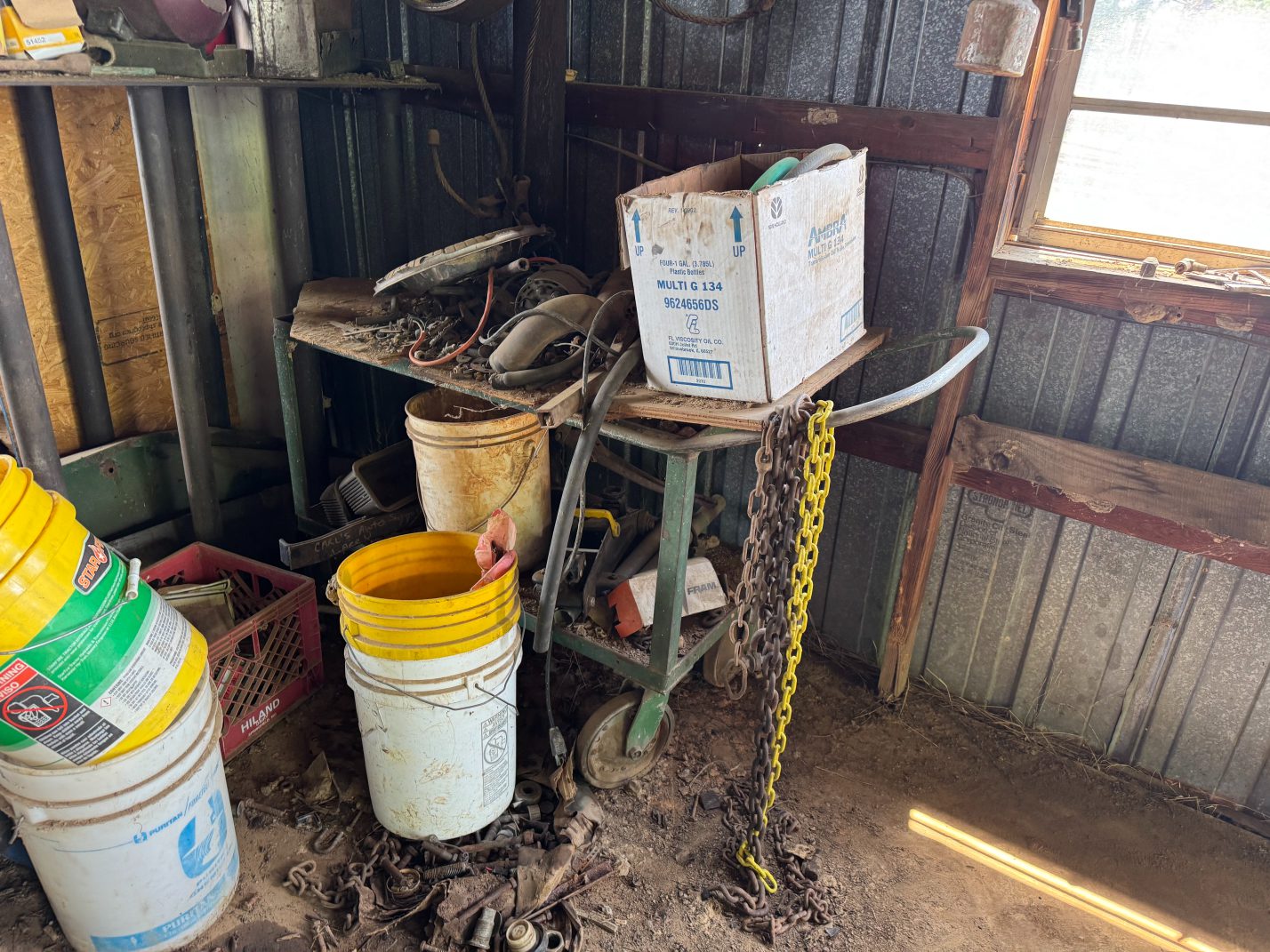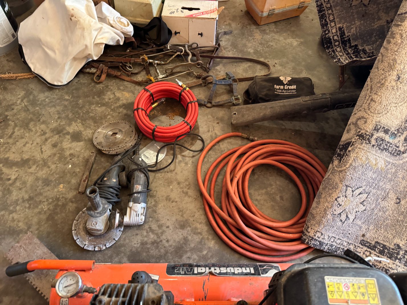 Tools/Shop Items: Post Hole Diggers – T-Posts (100s) – Wooden Chicken Coop – Electric Fencing – Barbed Wire – Wire Fencing – Chicken Wire – Tractor Tires – Tires – Wrought Iron Railing – Galvanized Tub – Misc. Wire – Misc. Cable – Metal Barrels – Plastic Barrels – Turnbuckles – Chicken House Fans – Baler Belts – Baler Chains – Metal Pipe – Square Metal Tubing – Window Air Units – Metal Shelving – Medical Supplies and Equipment – Propane Tanks – Saw Horses – Industrial Air Compressor – Air Hoses – Corder Grinders – Horse Tack – Tile Saw – Shop Vac – 10in. Radial Arm Saw – Hand Saws – Hack Saws – Pipe Cutter – Jack Stands – Hub Caps – Whiskey Barrel – Gas Cans – Kerosine Cans – Water Skis – Tarps – Can Hooks – Pitch Forks – Splitting Maul – Halogen Shop Lights – Faucets – Electrical Supplies – Saddles – Railroad Anvils – Grinder – Bolt Bins – Vise – Chain Hoists – Metal Plate – C-Clamps – Bottle Jacks – Cutting-Torch Hoses – Drain Pipe – Creepers – Chop Saws – Transmission Jack – Wheels – Ryobi Chop Saw – Boomers – Socket Set – Tackle Box – Metal Roll Around Cart – Log Chains – Welding Helmets – Come-A-Longs – Air Tank – Hydraulic Hoses – Hydraulic Fittings – Shop Fan – Floor Jacks – Car Parts – ¾ Socket Set – Ratchet Straps – Transmission – Lincoln Weldanpower 225 G7 – Craftsman Table Saw – Radiators – Air Hammer Drill – Acetylene Bottles