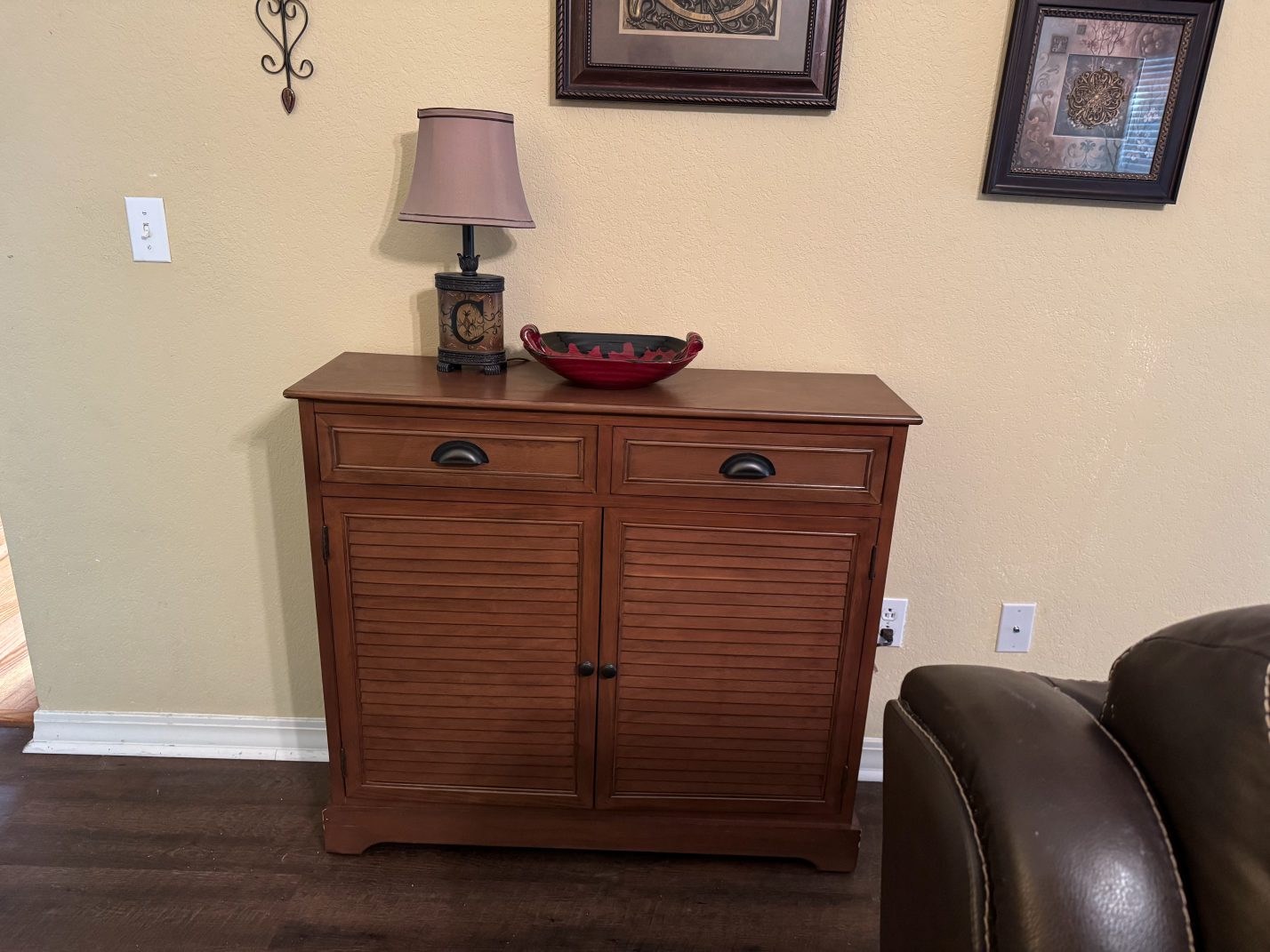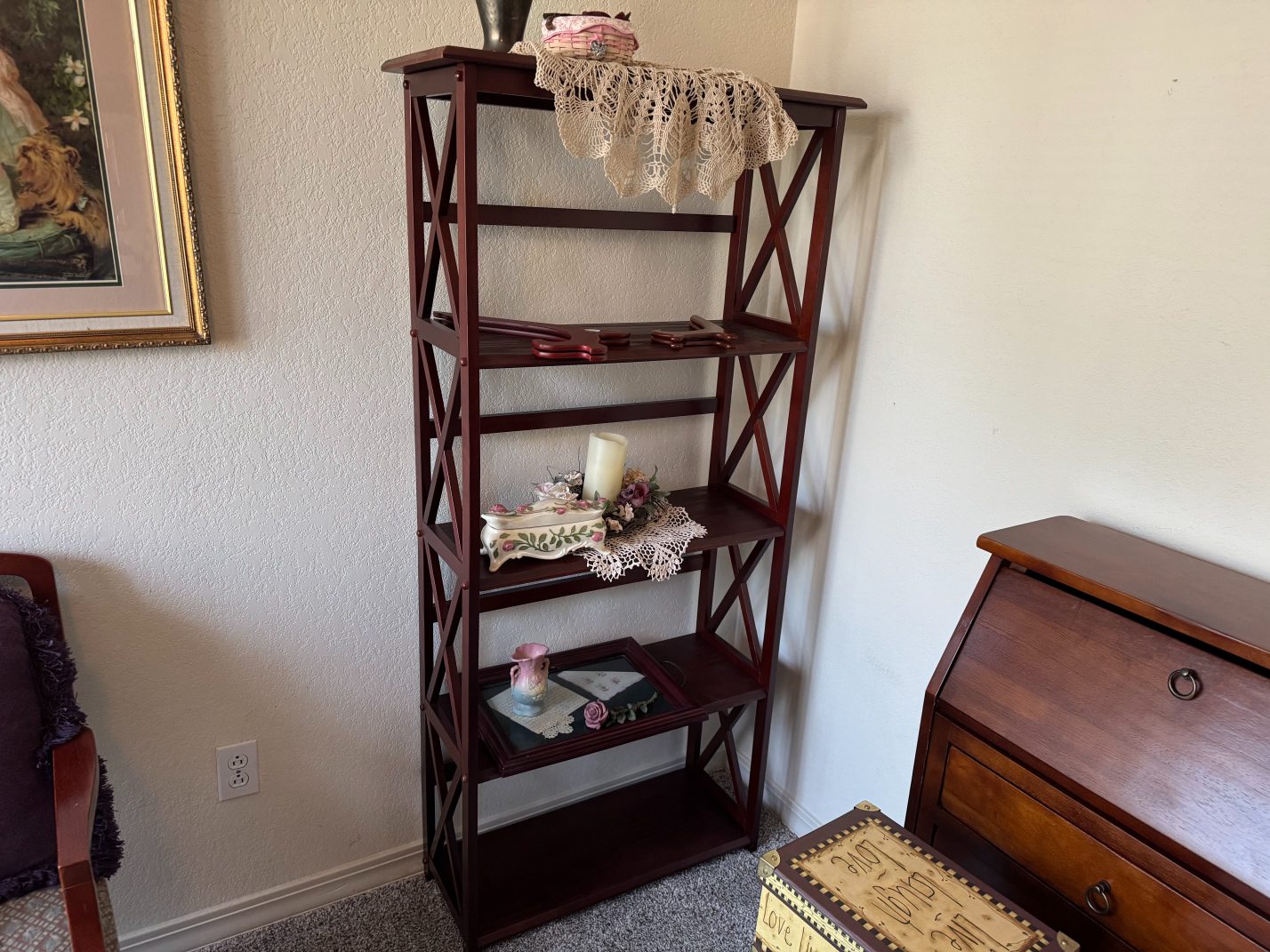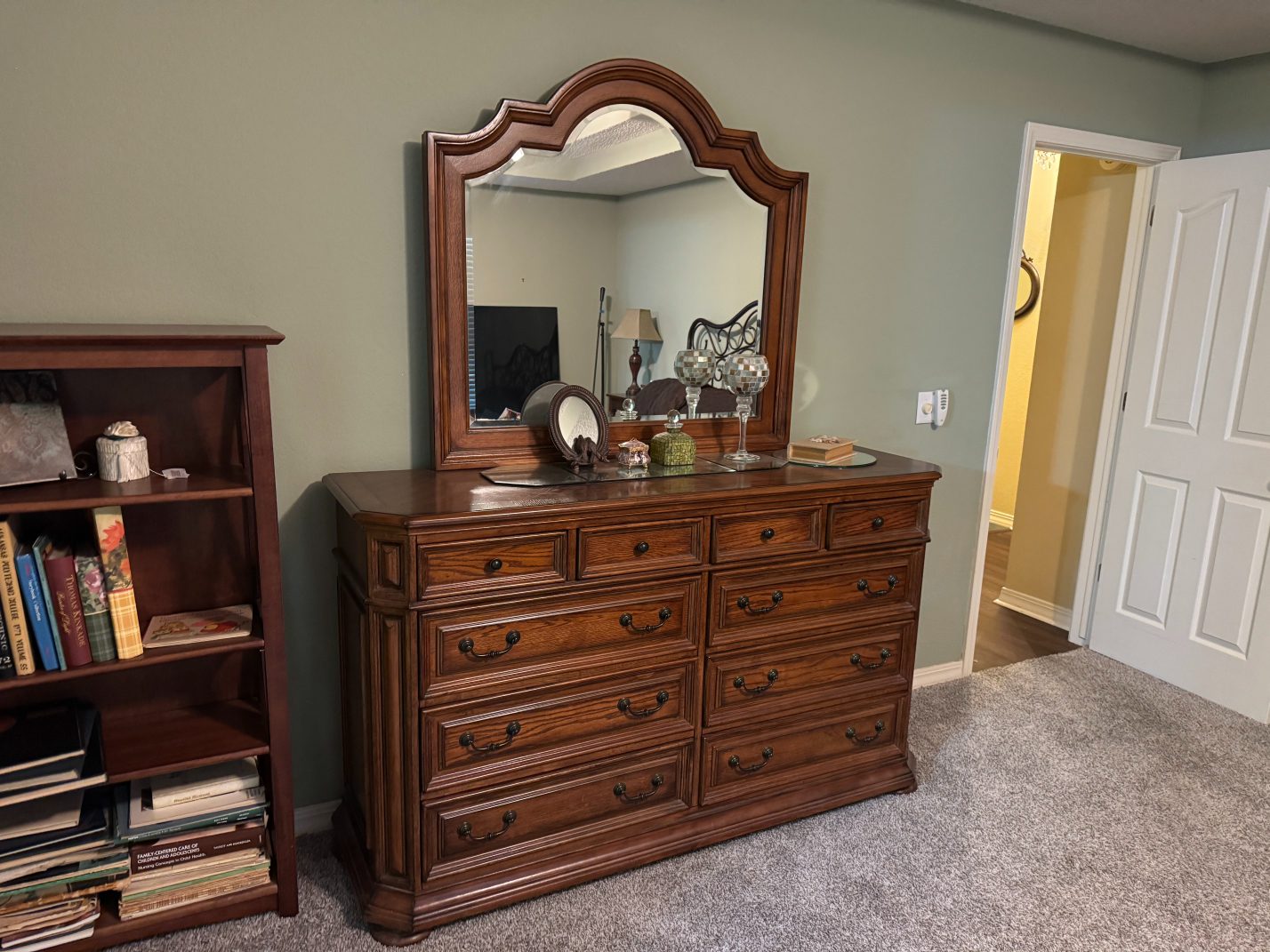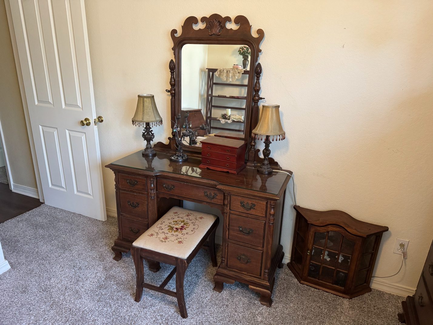 Furniture: Leather Double Recliner – Sofa – Leather Ottoman – Leather Accent Chairs – Library Table – End Tables – TV Console – Kitchen Table W/ (6) Chairs – China Hutch – Entertainment Center – Lawyer’s Bookcase – Bookshelf – Chest of Drawers – Curio Cabinet – Antique Vanity – Day Bed – King-Size Bed – Dresser – Wrought Iron Patio Furniture