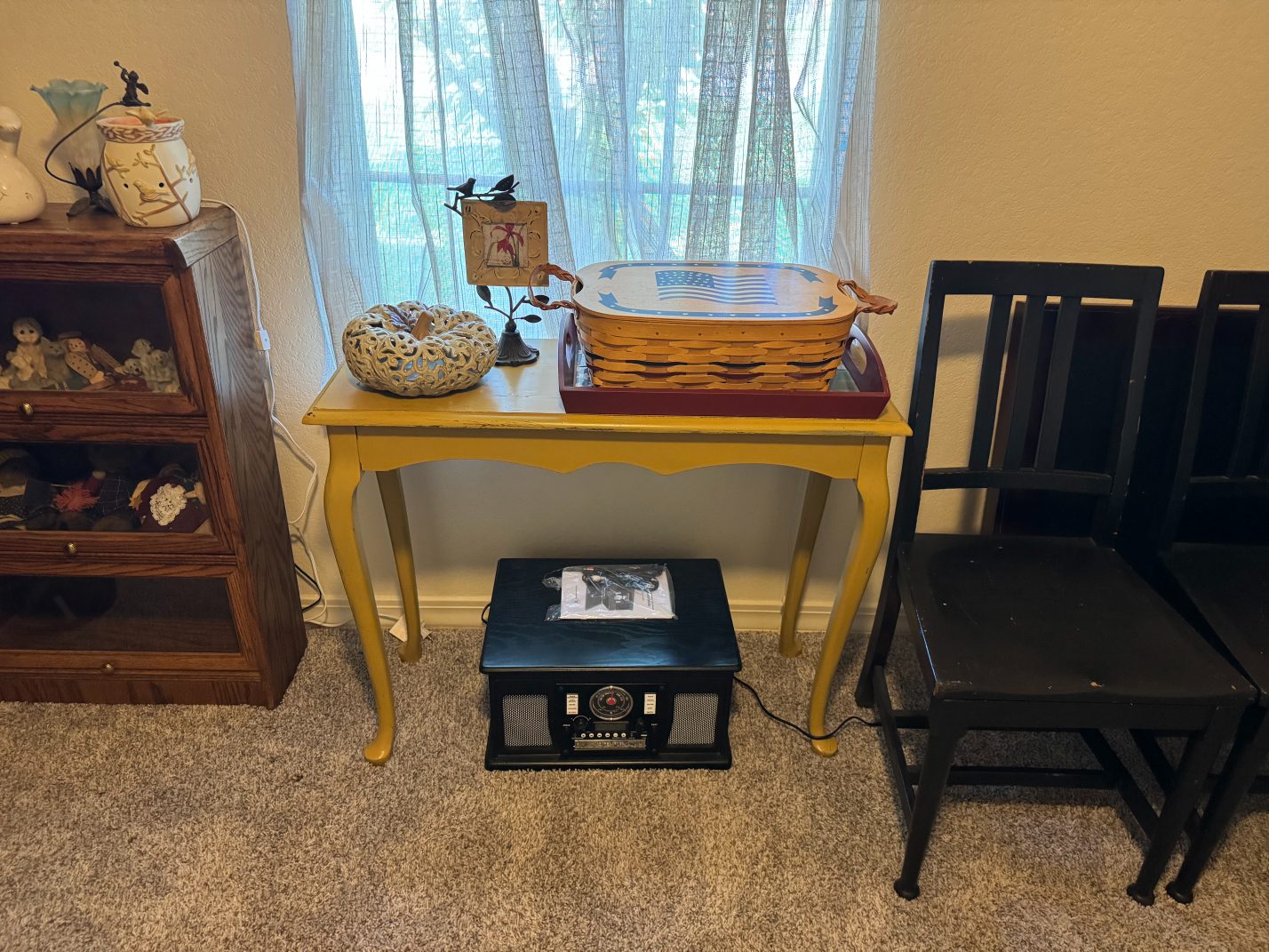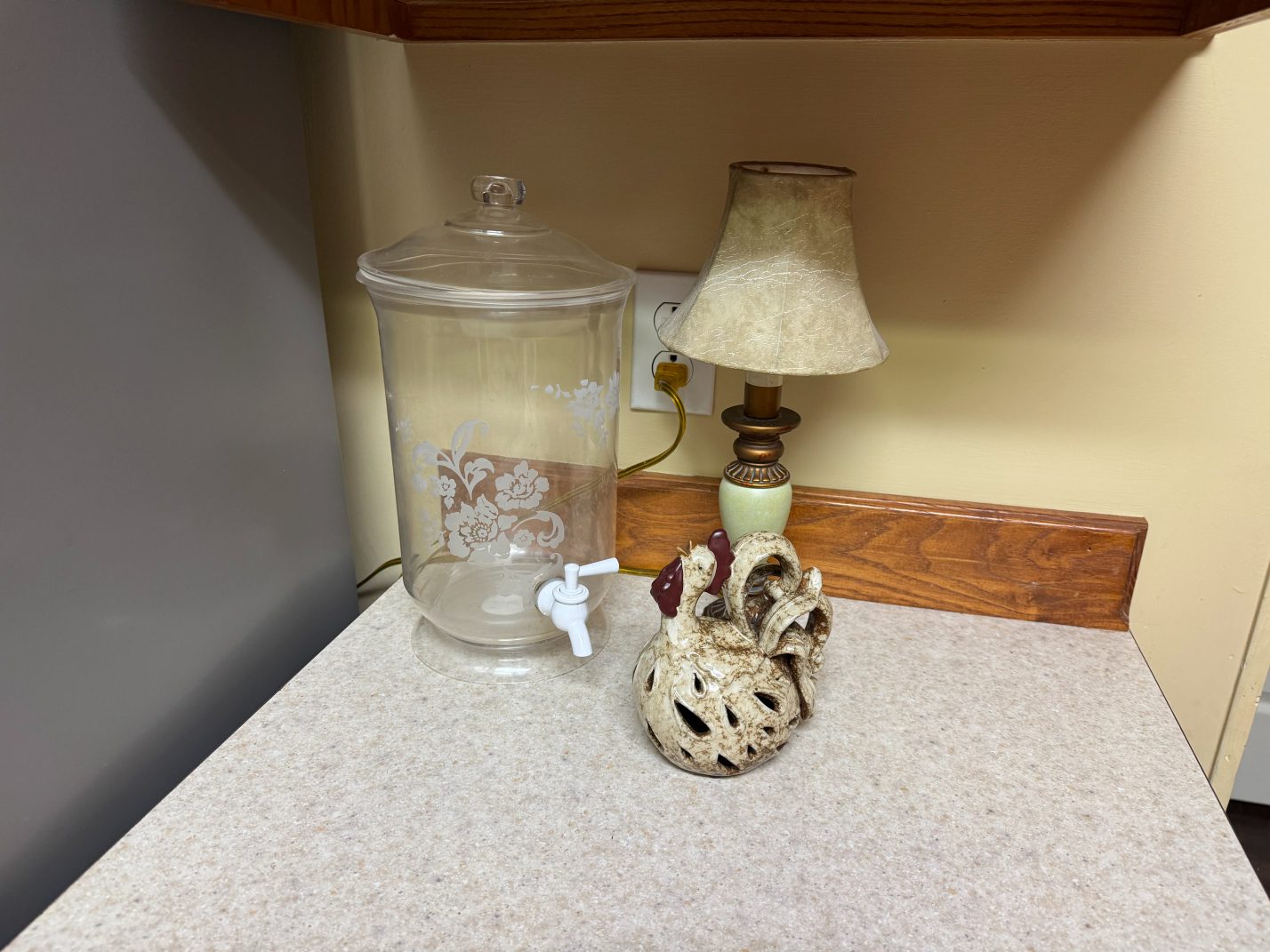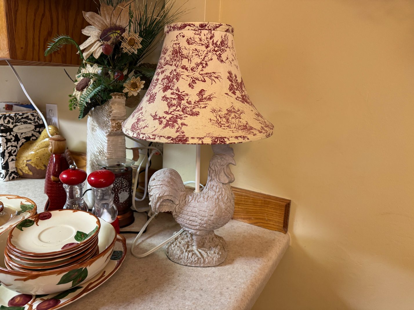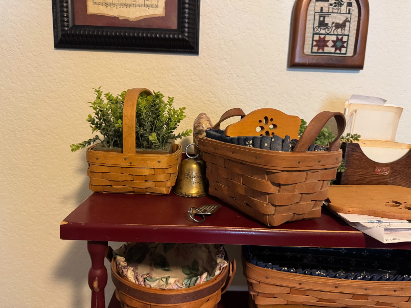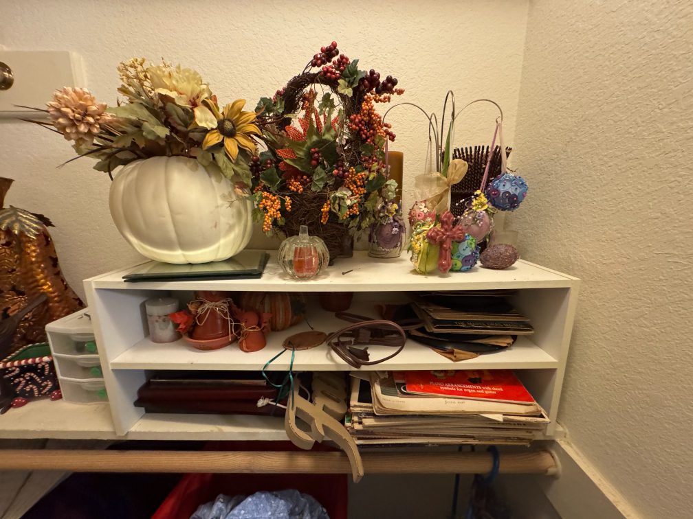Household Items: Vases – Plant Stand – Lamps – Panasonic Surround Sound System – Longaberger Baskets – Pitchers – Glassware – Kitchen Utensils – Spoon Collection – Crystal Candy Dishes – Frankoma Glassware – Cookbooks – Kitchenaid Mixer – Egg Scale – Pyrex Glassware – Radio/Record Player – Canon Printer – Computer Speakers – Wall Decor – Price Guide Books – Paintings – Pictures – Jewelry (Rings, Pins, Necklaces, Etc.) – Christmas Decorations – Mirrors – Kenmore Sewing Machine – Sewing Boxes – Fall Decorations – Luggage – Plastic Organizers – Coolers – Crock – Christmas Wreaths – Roomba Vacuum – Flower Pots – Wind Chimes – Grill – Bird Bath