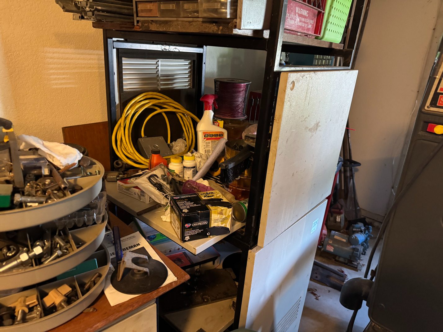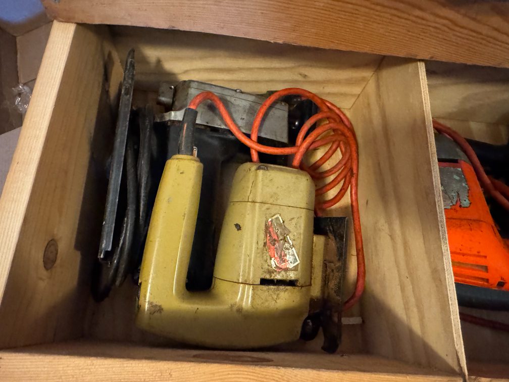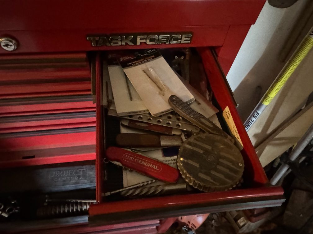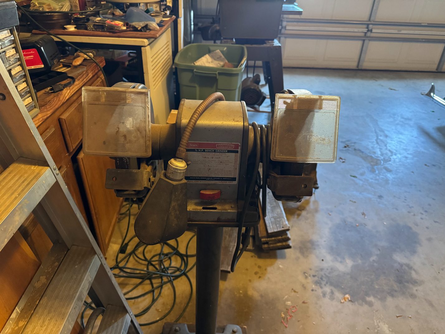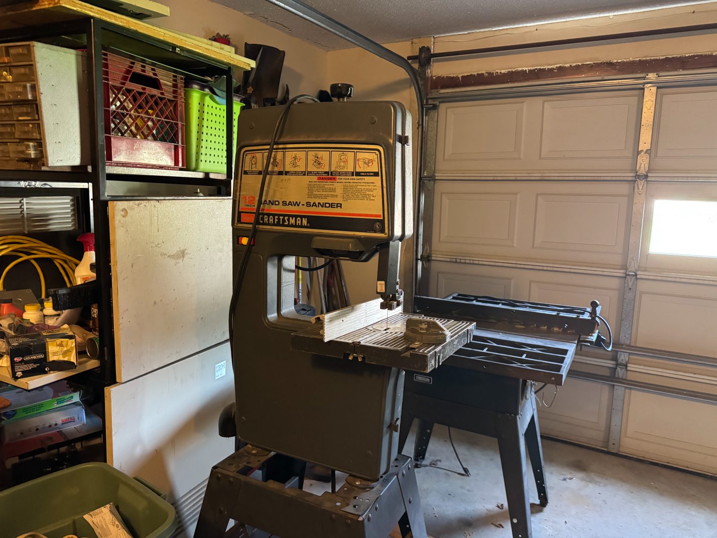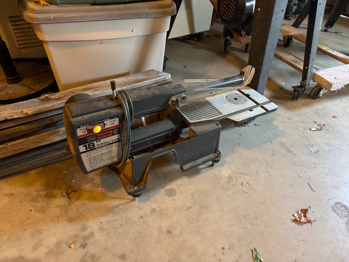 Tools/Shop Items: Sears Bench Grinder on Stand – Sears/Craftsman Scroll Saw – Craftsman Band Saw – Craftsman Table Saw – Task Force Rollaround Toolbox – Weed Eaters – Bolt Bins – Hack Saws – Loppers – Shovels – Rakes – Mallets – Electrical Wire – Clamps – Extension Cords – Battery Charger – Nails – Screws – Nuts – Bolts – Come-Along – Coleman Lantern – Limb Saw – Levels – Wrenches – Backpack Blower – Shop Vac – Furniture Clamps – Saw Horses – Water Hoses – Ladders – Creeper – Sanders – Air Hoses – Corded Drills – Jig Saws – Pocket Knives – Craftsman Wrenches – Ratchets – Sockets – Tin Snips – Drill Bits