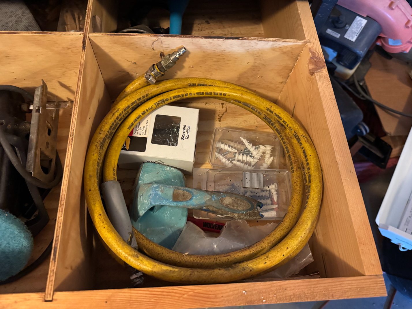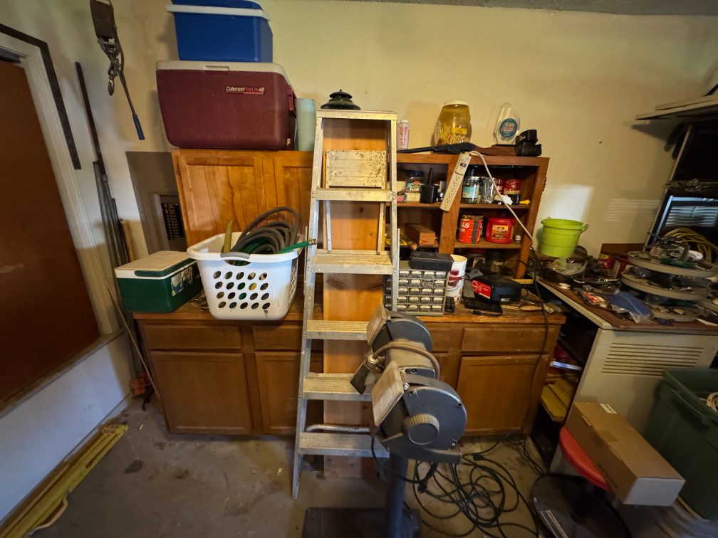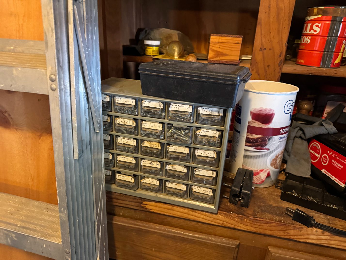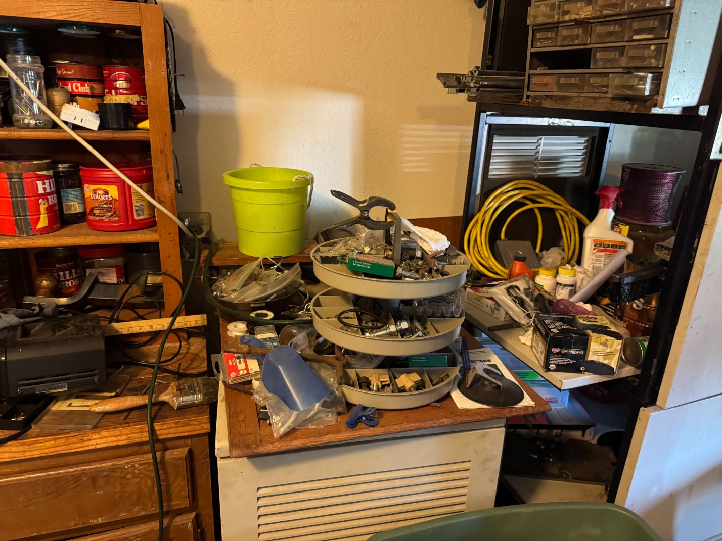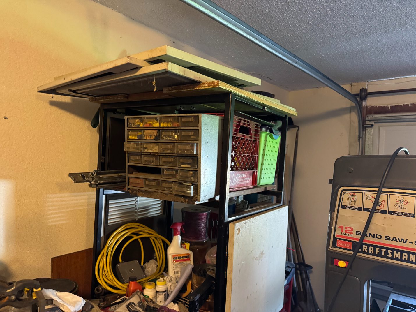 Tools/Shop Items: Sears Bench Grinder on Stand – Sears/Craftsman Scroll Saw – Craftsman Band Saw – Craftsman Table Saw – Task Force Rollaround Toolbox – Weed Eaters – Bolt Bins – Hack Saws – Loppers – Shovels – Rakes – Mallets – Electrical Wire – Clamps – Extension Cords – Battery Charger – Nails – Screws – Nuts – Bolts – Come-Along – Coleman Lantern – Limb Saw – Levels – Wrenches – Backpack Blower – Shop Vac – Furniture Clamps – Saw Horses – Water Hoses – Ladders – Creeper – Sanders – Air Hoses – Corded Drills – Jig Saws – Pocket Knives – Craftsman Wrenches – Ratchets – Sockets – Tin Snips – Drill Bits