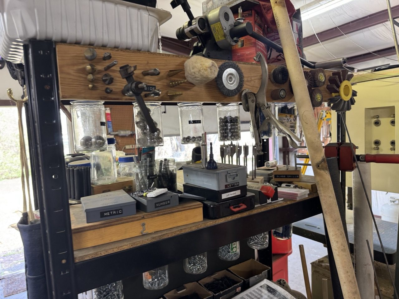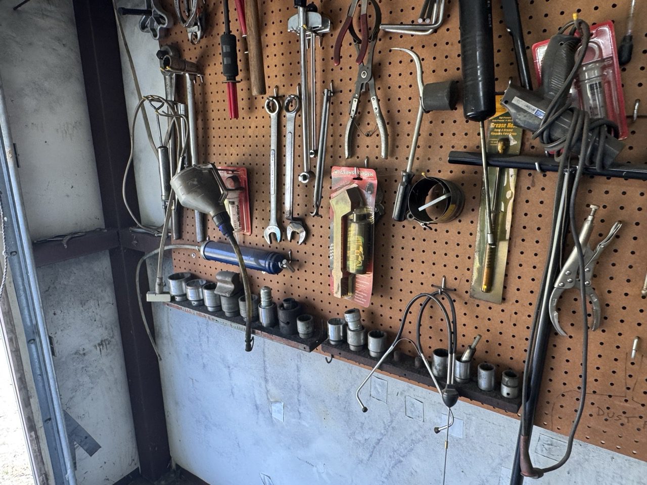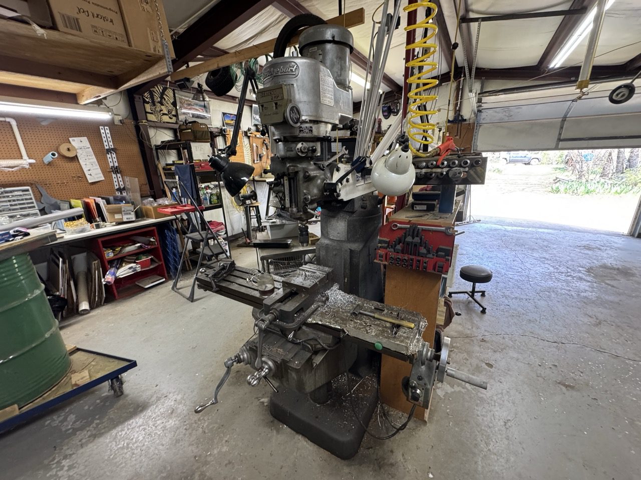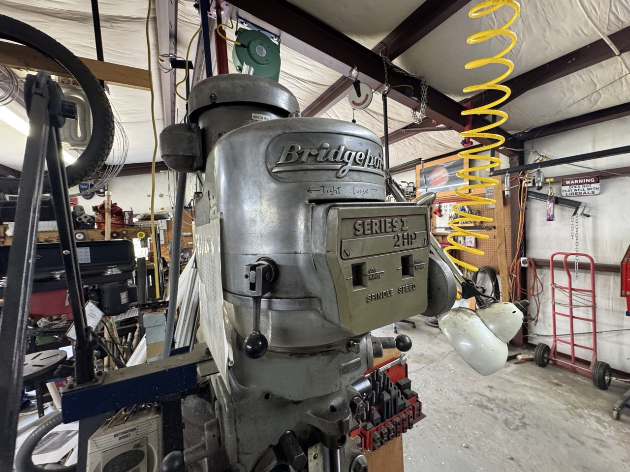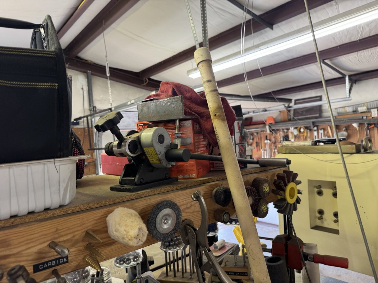 Shop & Outdoor Items: Bench Lathe – Sand Blasting Cabinet – Accura Band Saw – Hydraulic Shop Press – Parts Washer – Drill Press – Belt Sander – Delta Miter Saw – Bridgeport Milling Machine – Tire Changer – Grinder on Stand – Black and Decker Grinder – Makita Power Tools – Craftsman Hand Tools – Craftsman Wrenches – Craftsman Sockets – S-K Ratchets – Proto Sockets – Pittsburgh Ratcheting Wrenches – Crescent Wrenches – Nut Drivers – Hammers – Chisels – Files – Vise Grips – Channel Locks – Pliers – Drill Bits – Gear Pullers – Tin Snips – Clamps – Saw Blades – High Lift Jack – Floor Jacks – Saw Horses – Creepers – Air Tanks – Air Hoses – Cable – Extension Cords – Step Ladder – 8 ft. Aluminum Ladder – Extension Ladder – Log Chains – Ramps – Bolt Bins – Screws – Bolts – Nails – Metal Shelving – Metal Pipe – Angle Iron – Rebar – Lumber – Plywood – Metal Barrels – Flower Pots – Metal Targets – Metal Trailer – Pipe Stands – Roll Around Carts – Live Traps – Fence Stretcher – Yard Tools – Limb Saw – Electric Pressure Washer – Seeder – Spray Paint – Transmission Fluid – Power Steering Fluid – Gas Cans – Mason Jars – Coleman Lanterns – Survival Food