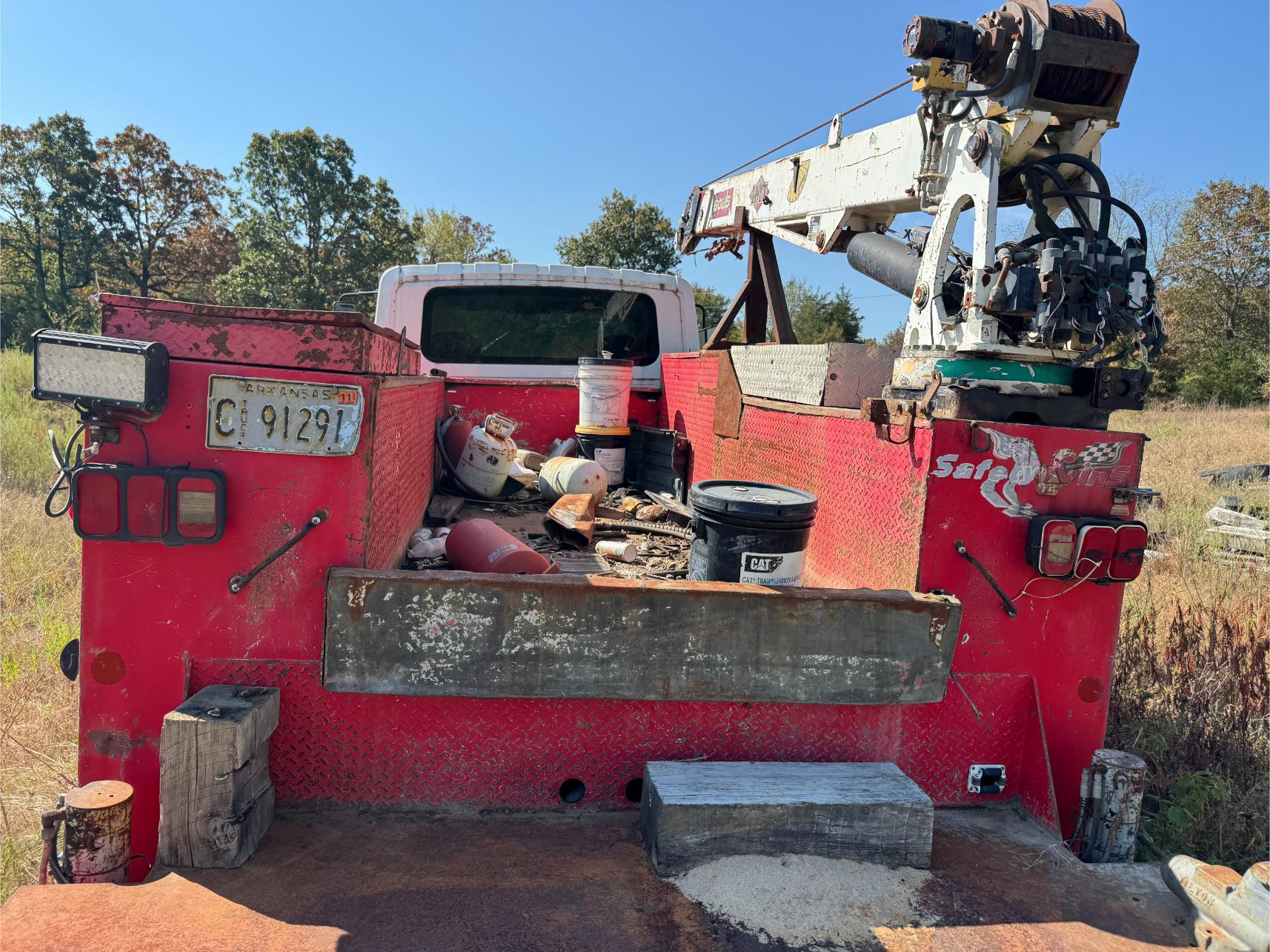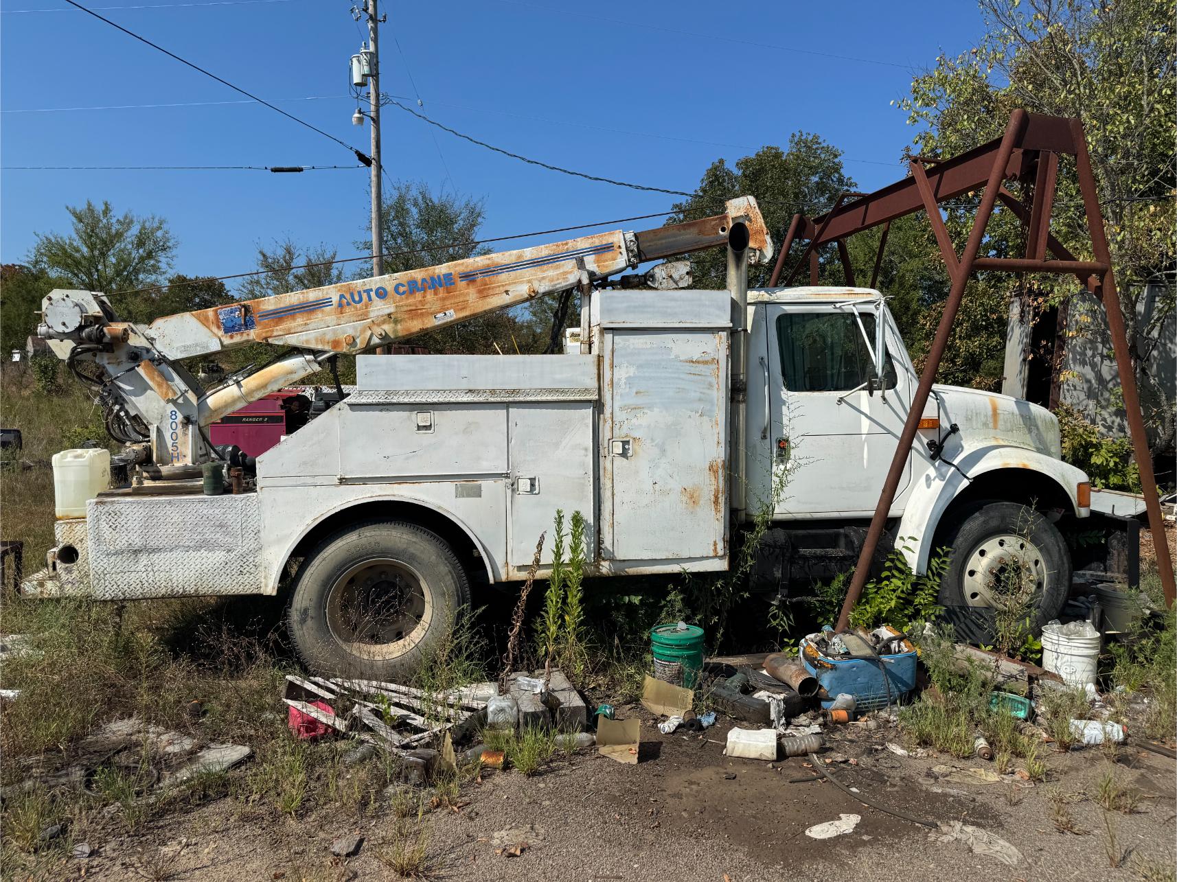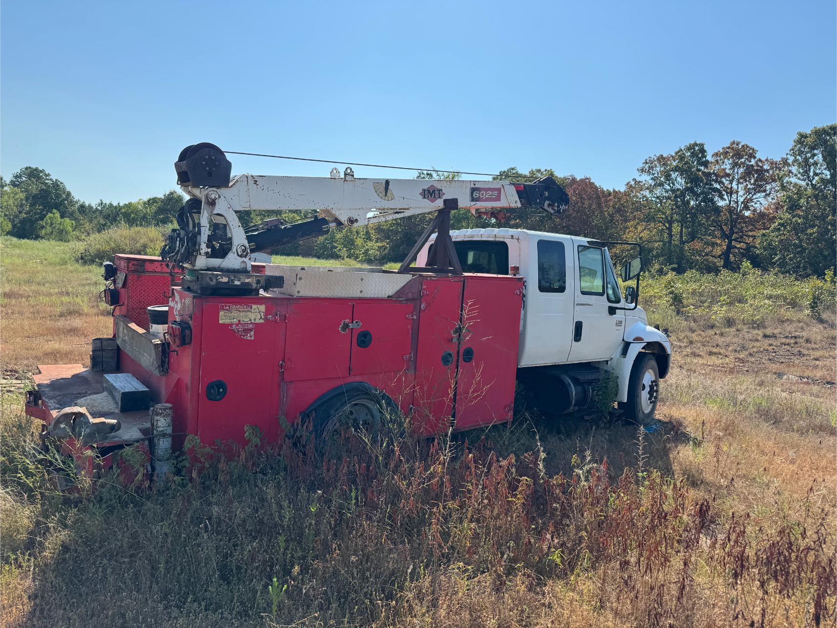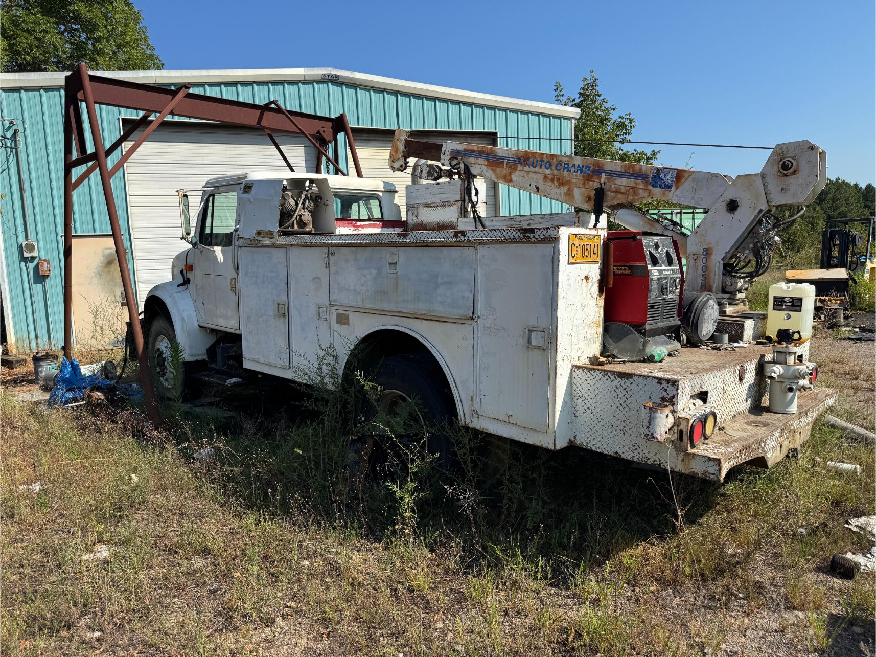 Trucks, etc: 2007 International 4300 DT 466 Service Truck w/IMT 6025 Crane – 1992 International Service Truck 2/Auto Crane & Lincoln Ranger 8 Welder – 20′ Metal Shipping Container – Semi Trailer (for salvage) – Hyster 30 Forklift (for Parts or Salvage) – Service Bed – 1000 gal Fuel Tank – Gas Pump – Tires – Lots of Salvage