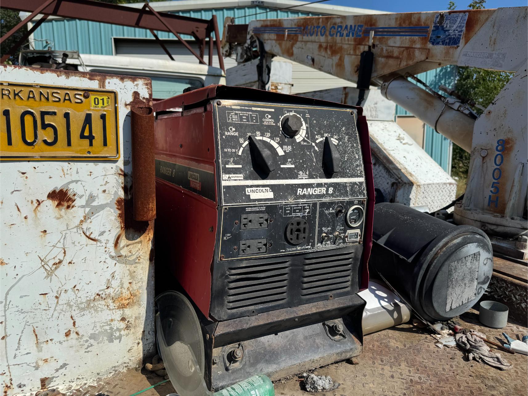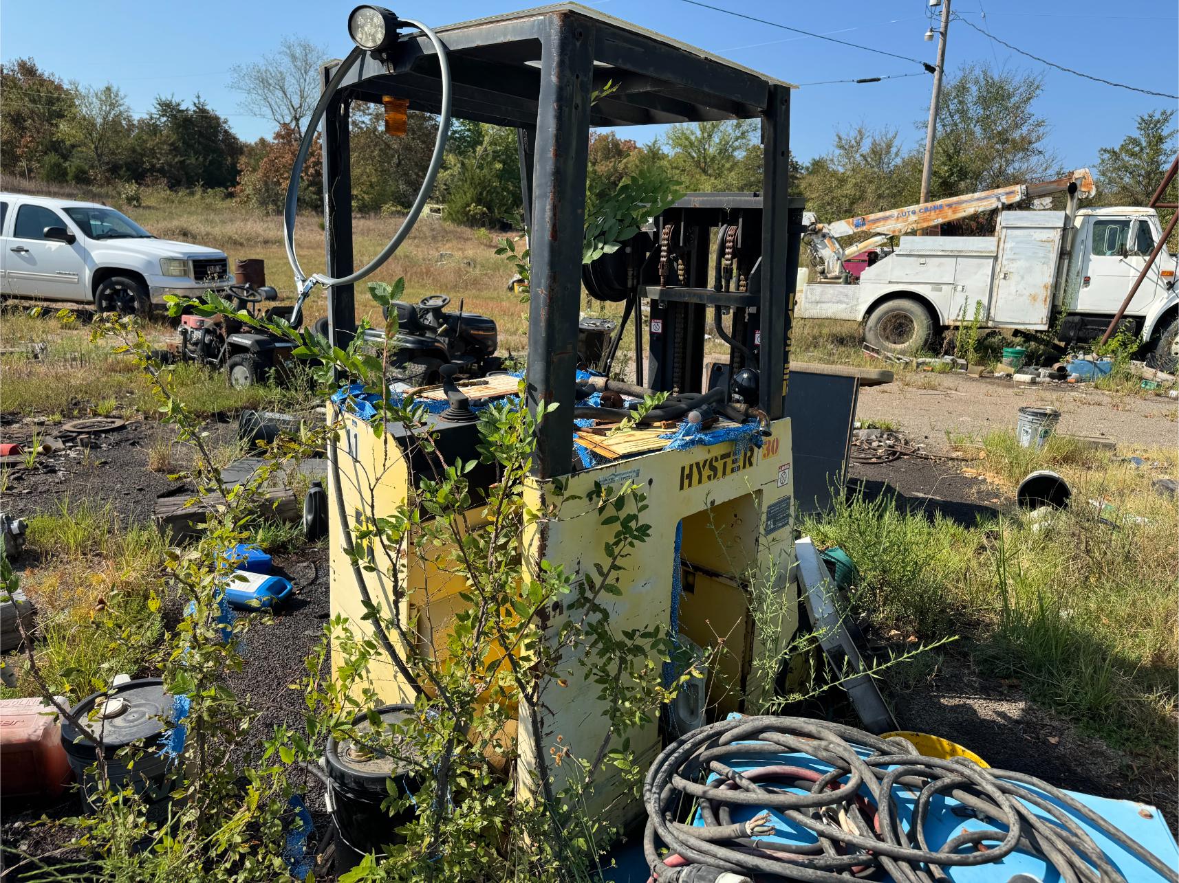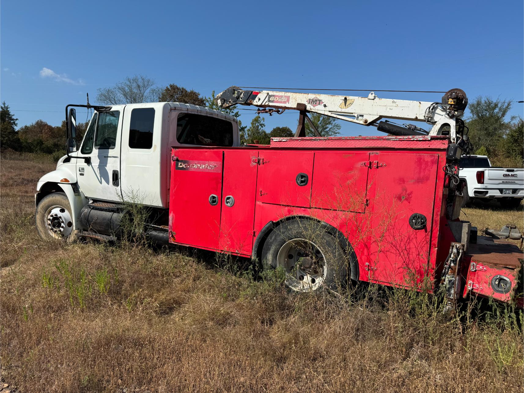 Trucks, etc: 2007 International 4300 DT 466 Service Truck w/IMT 6025 Crane – 1992 International Service Truck 2/Auto Crane & Lincoln Ranger 8 Welder – 20′ Metal Shipping Container – Semi Trailer (for salvage) – Hyster 30 Forklift (for Parts or Salvage) – Service Bed – 1000 gal Fuel Tank – Gas Pump – Tires – Lots of Salvage
