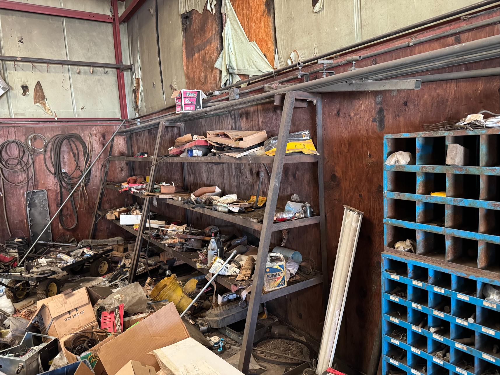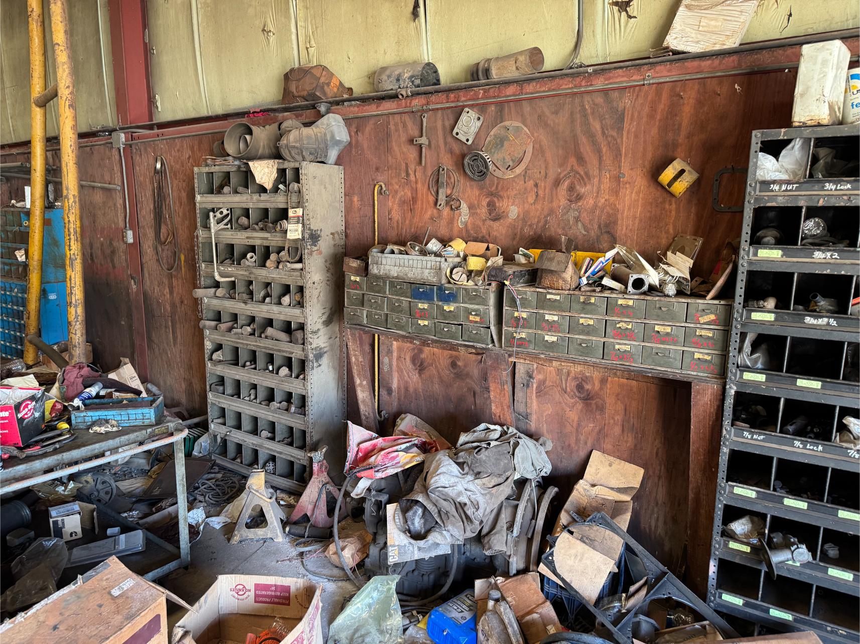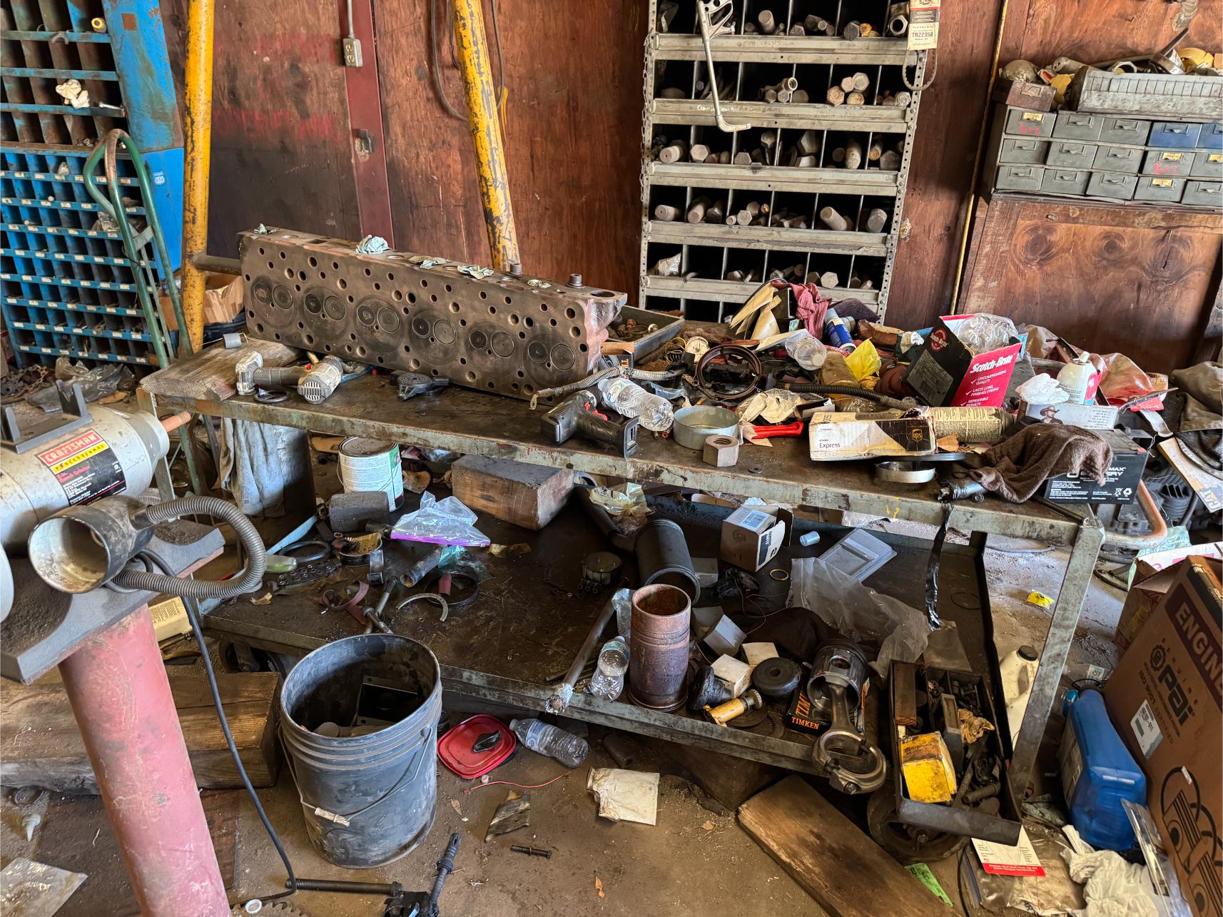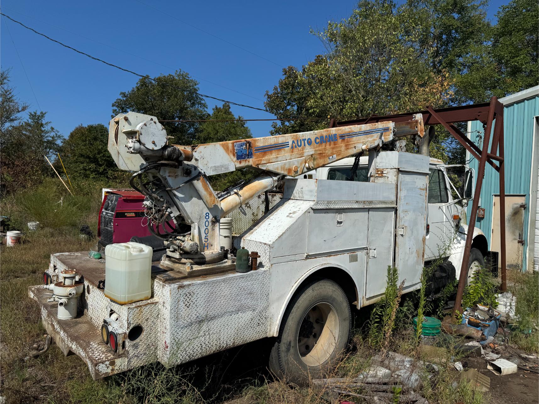 Trucks, etc: 2007 International 4300 DT 466 Service Truck w/IMT 6025 Crane – 1992 International Service Truck 2/Auto Crane & Lincoln Ranger 8 Welder – 20′ Metal Shipping Container – Semi Trailer (for salvage) – Hyster 30 Forklift (for Parts or Salvage) – Service Bed – 1000 gal Fuel Tank – Gas Pump – Tires – Lots of Salvage