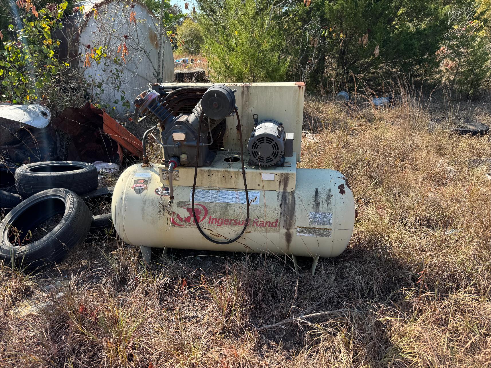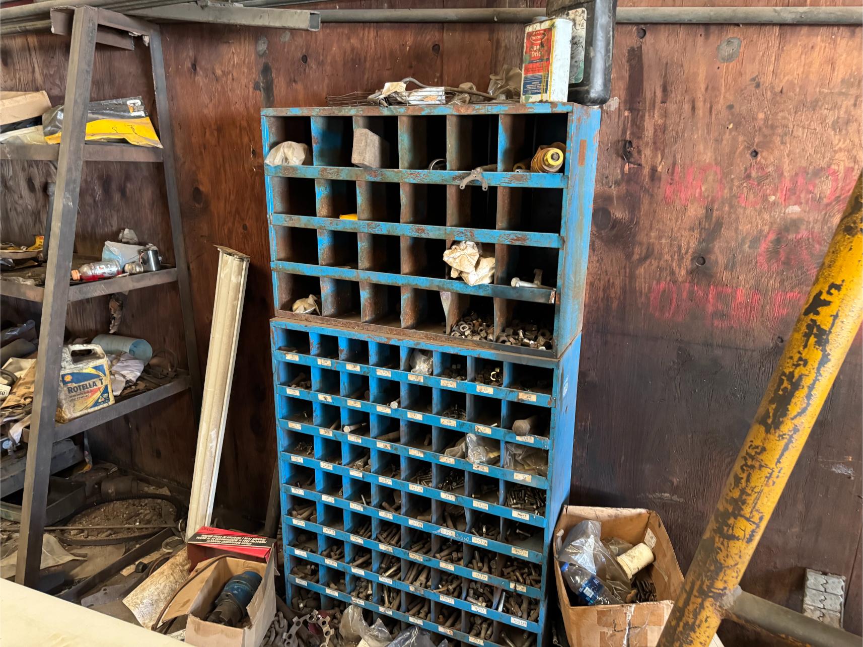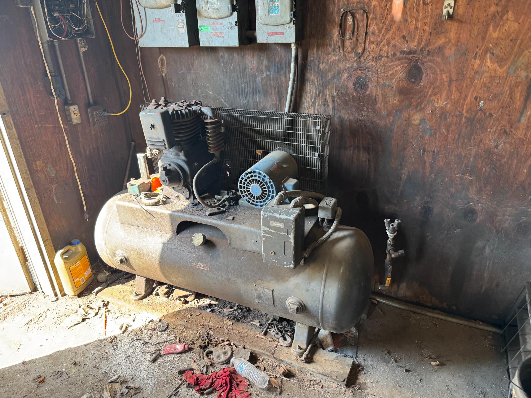 Shop, etc: Metal Shop Tables – Metal Roll Around Carts – Commercial Air Compressor – Dayton Drill Press – Bolt Bins – Shop Fans