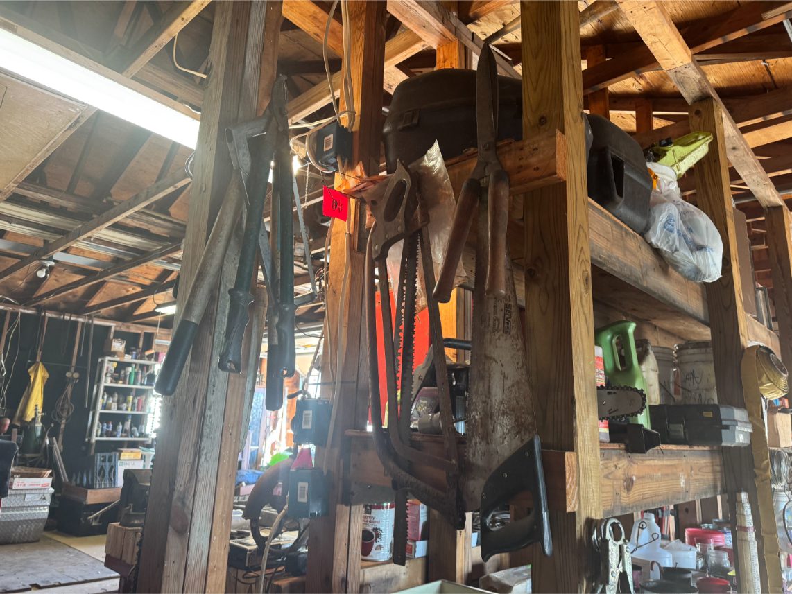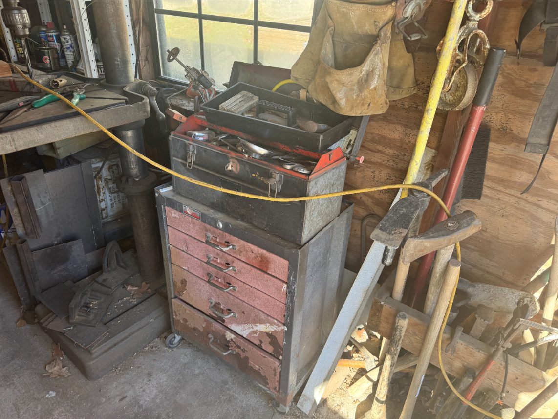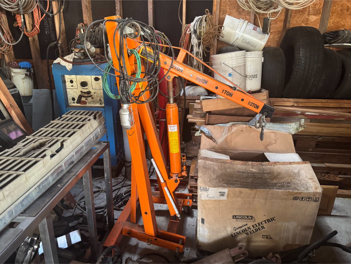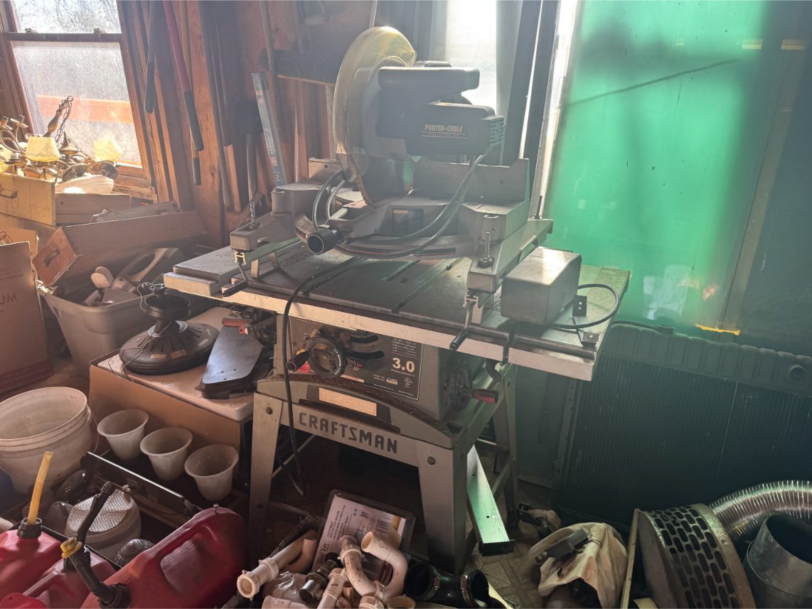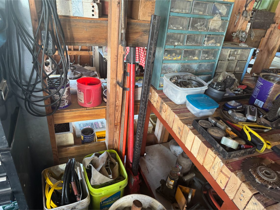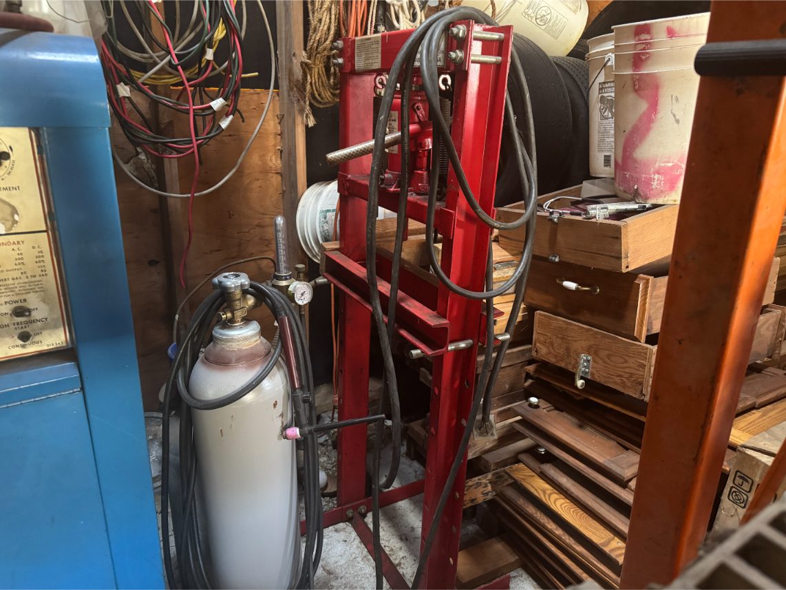 Tools/Shop Items: Miller Welder – Torch Set – 12 Ton Hydraulic Press – Generator – 2 Ton Hydraulic Engine Hoist – Mulchers and Wood Chippers – Plasma Cutter – Tire Machine – Tires – Miscellaneous Car Parts – Wires – Sheet Metal – Cable – Welding Helmet – Sand Blaster – Lincoln Welder/Generator – Electrical Switch Box – Batteries – Craftsman Saw – Drill Press – Refrigerant Gauge – Bracketed Caliper – Squares – Brake Pads – Tool Box – Hand Tools – Upright Air Compressor – Tool Cabinet – Dewalt Power Tools – Pipe Wrenches – Screwdrivers – Wrenches – Sockets – Scan Tool – Sears Bech Vise – Repair Cabinet – Belt Sander – Bench Grinders – Hammers – Chains – Crescent Wrenches – Power Tools – Jupiter Power Inverter – Drill Bits – Bottle Jacks – Tire Irons – Lead Hammers – Miter Saw – Vice Grip – Jerry Can – Crates – Cast Iron Pulley – Chainsaws – Wheel Balancer – Sheet Metal Break – Drywall Lift – Tire Changer – Tool Belts – Roofing Paper – Hydraulic Hose – Fuse Box -Garage Door Opener – Lumber – Wire Cable Reel – Angle Grinder – Husky Air Grinder – Floor Jack – Ratchet Wrenches – Auto Level – Saw Blades – Stihl Concrete Saw – Craftsman Table Saw – Plunge Router – Propane Tank – Metal Detector – Rigid Snakes – Tumbler – Wood Surveyor – Hand Saw – Work Light – Roofing Nails – Nail Gun – Dolly – Shovels – Plumbing PVC – Car Radiator – Ladders – Chicken Wire – Garden Fence – Paint Sprayers – Putty Knife – Blower Fan -Bolt Cutter – Tilt Trailer – Tires – Concrete Mixer – Water Pump – Pressure Tank – Yard Man Riding Lawn Mower – Rain Barrel – PVC Pipes – Wheelbarrow – Battery Charger – Air Compressor – Truck Toolbox – HVAC Units – Pallet Racking – Extension Cords – Tackle Boxes – Bicycle – Metal Barrels