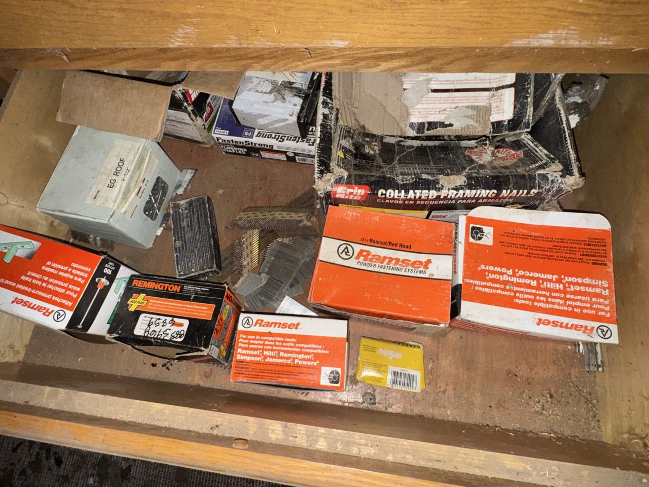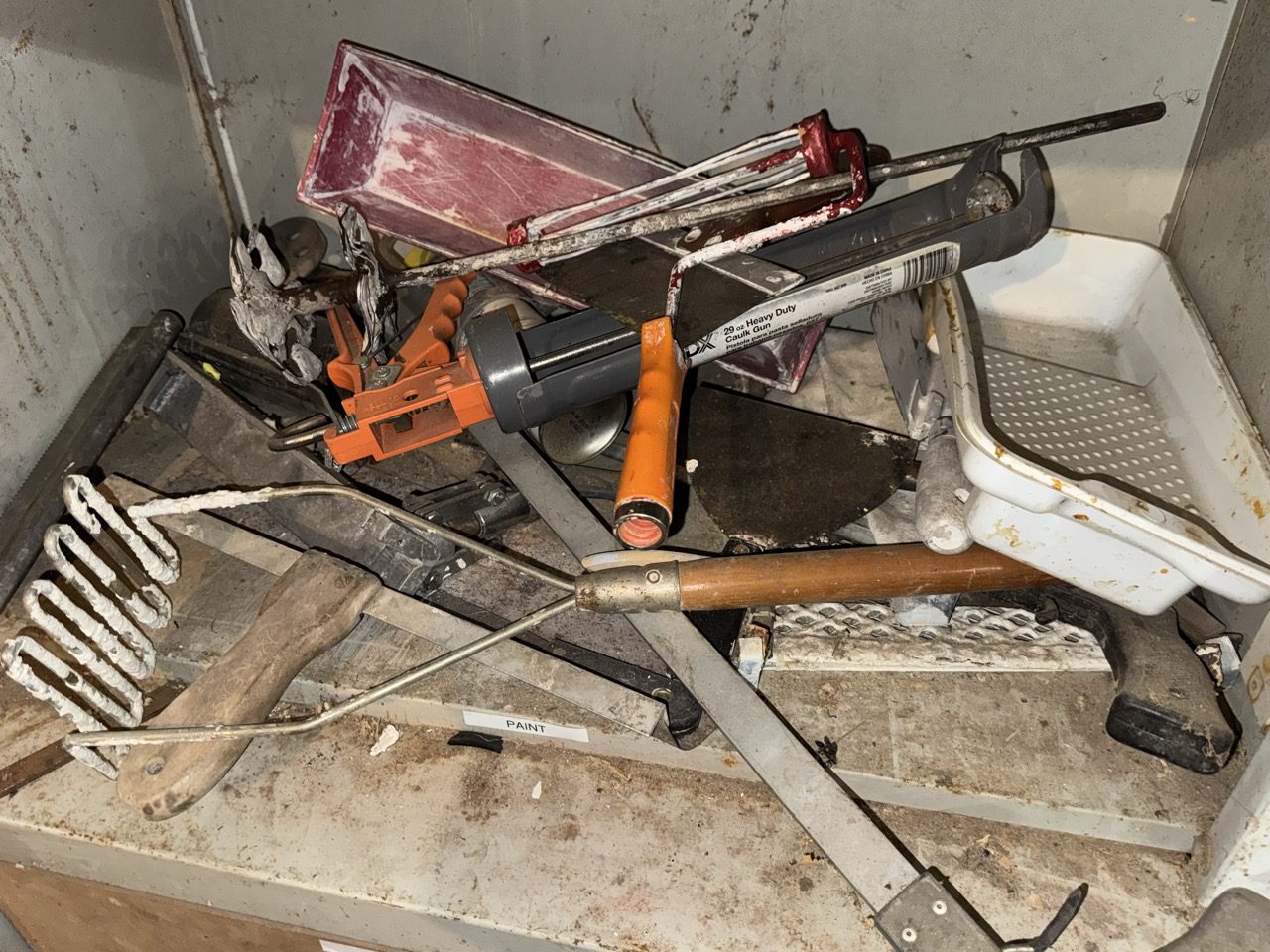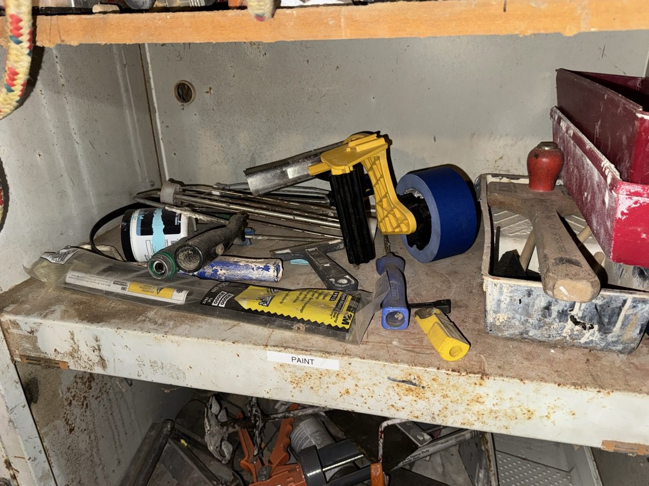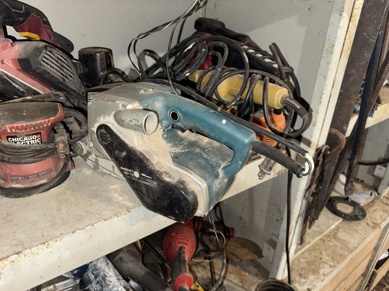 Woodshop Machinery & Tools: Delta Shaper – Central Machinery Belt Sander – Grizzly Shaper – Grizzly Band Saw – Craftsman Table Saw – Chicago Electric Miter Saw – Ridgid Planer – Grizzly Drum Sander – Delta Wood Lathe – Central Machinery Jointer – Grizzly Drill Press – Delta Dust Collector – Titanium Unlimited 200 Wire Welder – Hobart Handler 135 Welder – Lincoln AC/DC Arc Welder – Chicago Electric Wire Welder – Chicago Electric Plasma Cutter – Ryobi Cordless Reciprocating Saw, Circular Saw, Right Angle Drill, 1/2 in Impact Wrench, Impact Driver, Cut-Out Tool, Drills, Batteries & Chargers – Cutting Torch – Shop Press – Shaper Bits – Sockets – Wrenches – Welding Table – Master Mechanic Toolbox – Craftsman Toolbox – Furniture Clamps – Pliers – Screwdrivers – Air Compressor – Grizzly Bench Grinder – Craftsman Radial Arm Saw – Delta Miter Saw – Air Nailers (Banks, Porter Cable, Ridgid) – Chisels – Tap & Dies – Tile Saw – Electric Motors – Hole Saw Bits – Power Tools – Dremel – Ratchet Socket Sets – Routers – Sanders – Grinders – Pipe Wrenches – Ridgid Shop Vac – Chain Hoist