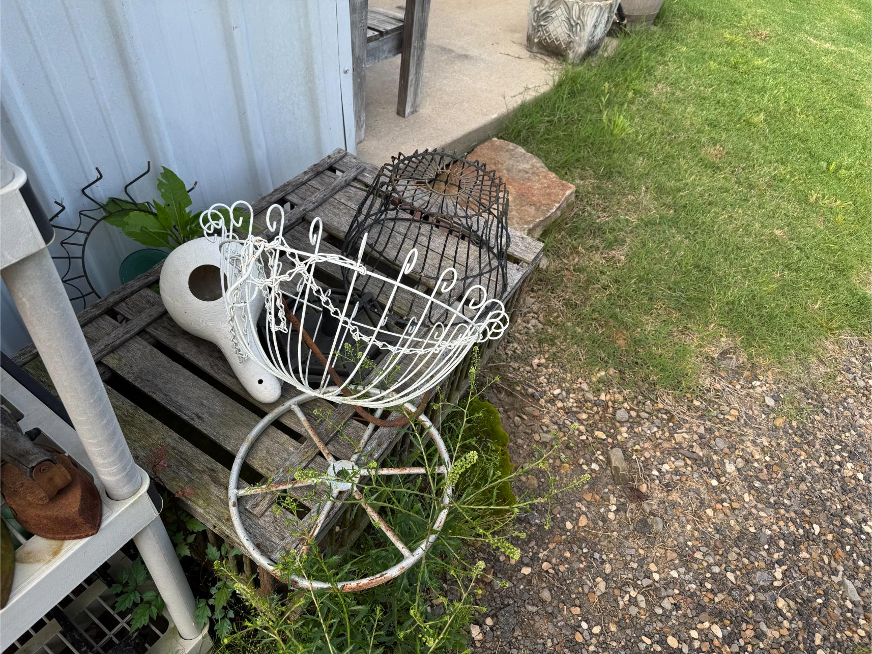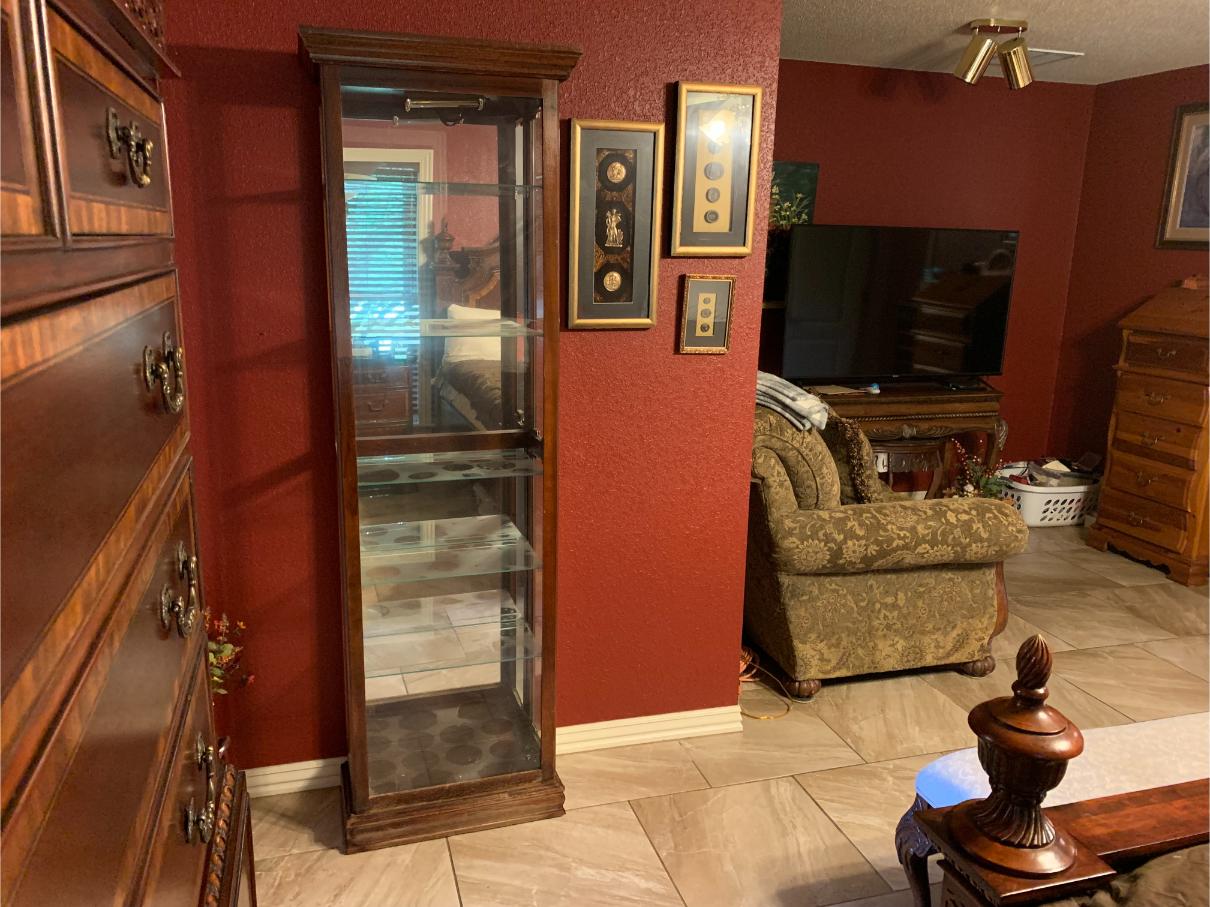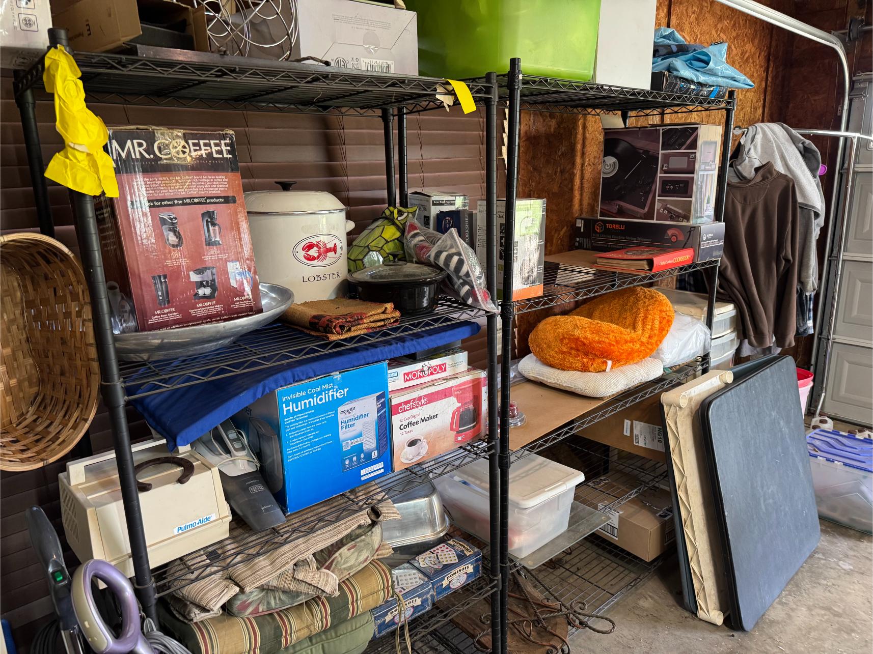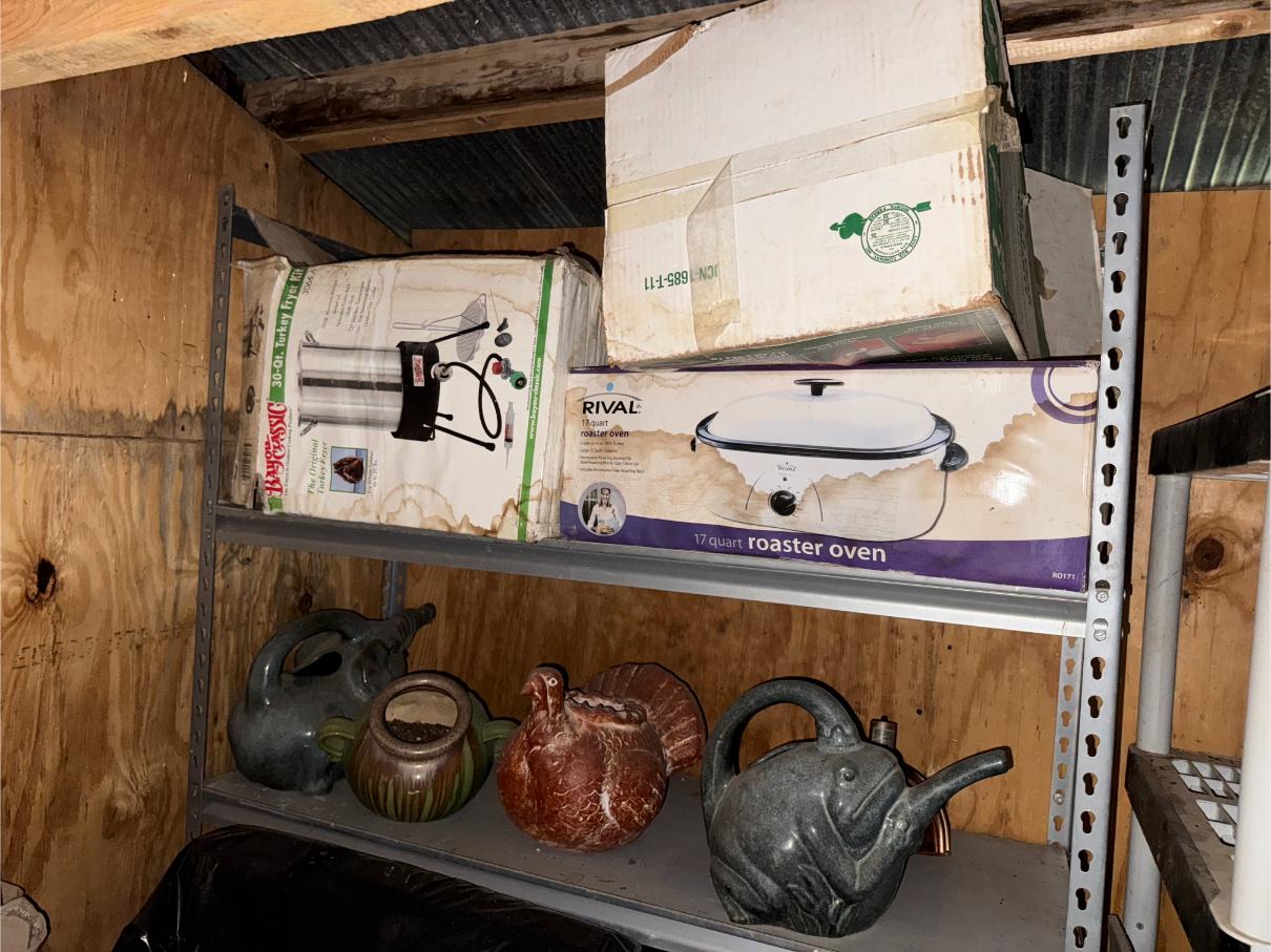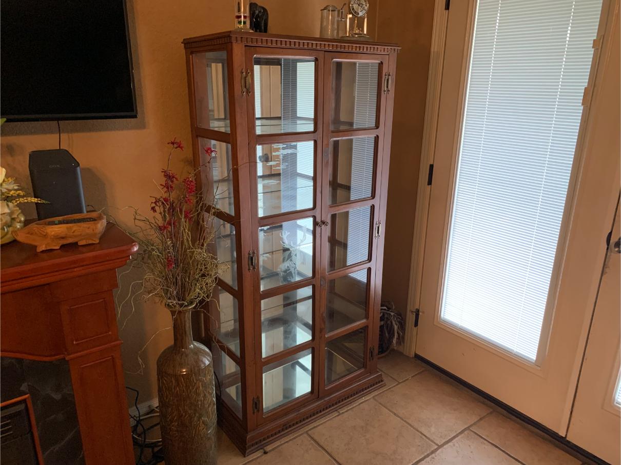 Household:Â Leather Sofa – (2) La-Z-Boy Leather Recliners – Leather Chair & Ottoman – Sofa – Coffee & End Tables – Sofa Table – Pine Dining Table & Chairs & China Cabinet – Iron Base w/Glass Top Dining Table & Chairs – Several Oak & Glass Curio Cabinets – Lawyer’s Bookcase – Desk – Occasional Tables & Chairs – Roll Around Kitchen Island – Baker’s Rack – Cherry King Size Bed, (2) Chests & (2) Nightstands – Lingerie Chest – Jewelry Armoire – Trunk – Elec Fireplace – Whirlpool Refrigerator – Speed Queen Washer – Whirlpool Cabrio Dryer – Small Appliances – Pots & Pans – Corningware – Misc Dishes & Kitchen Items – TV’s (Vizio) – Clocks – Yard Ornaments – Flower Pots – Concrete Razorback Bench – Patio Furniture – Fire Pit – Seasonal Decorations – Home Decor – Area Rugs – Books – Linens – Roomba Vac