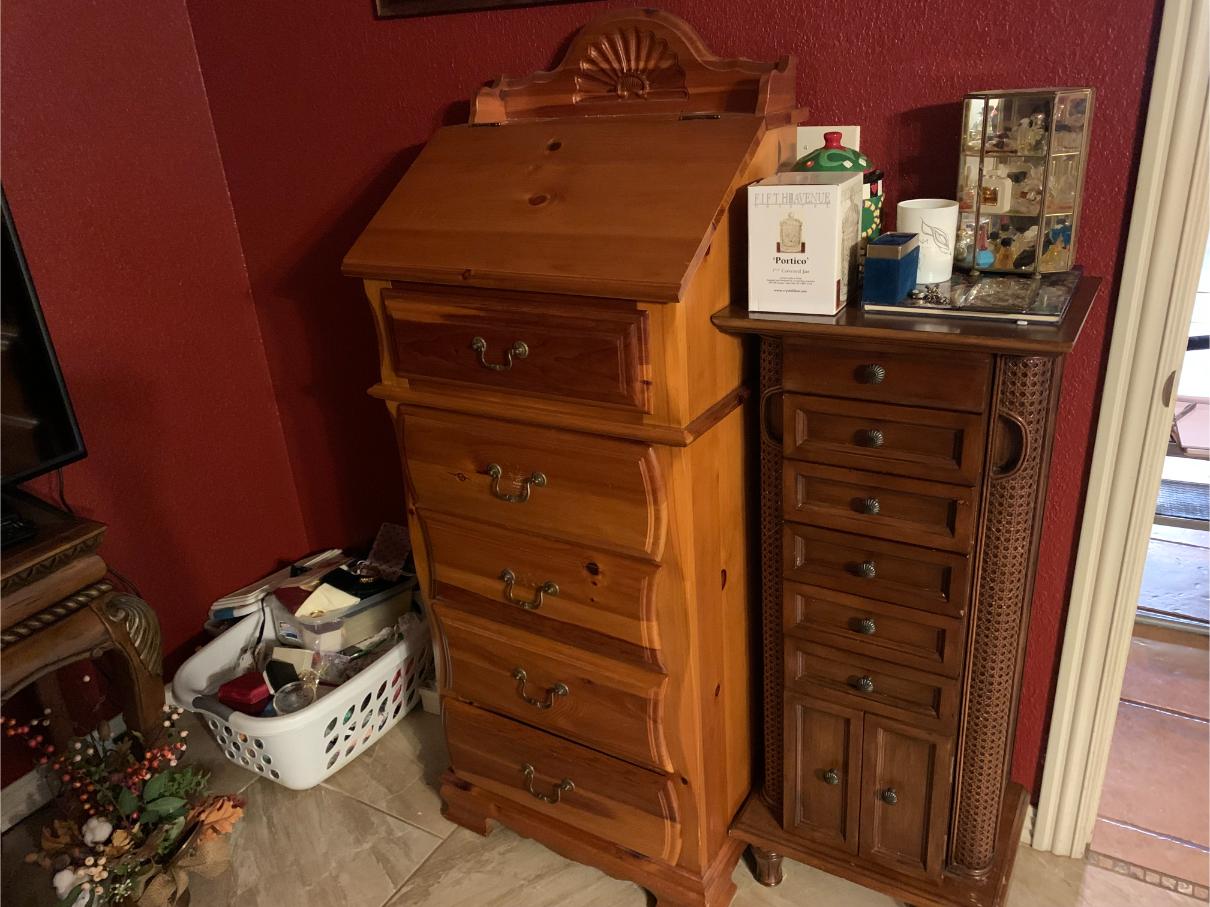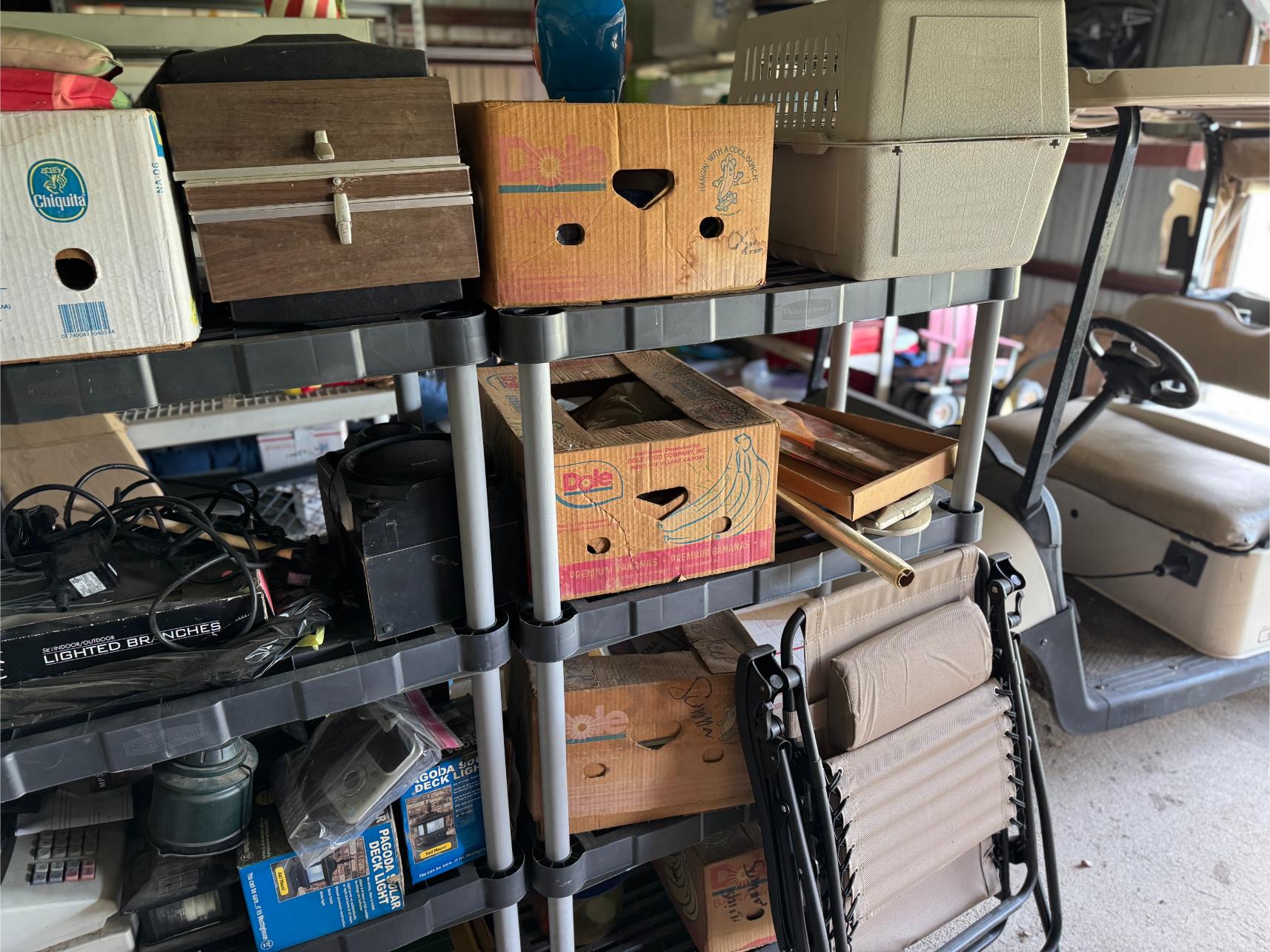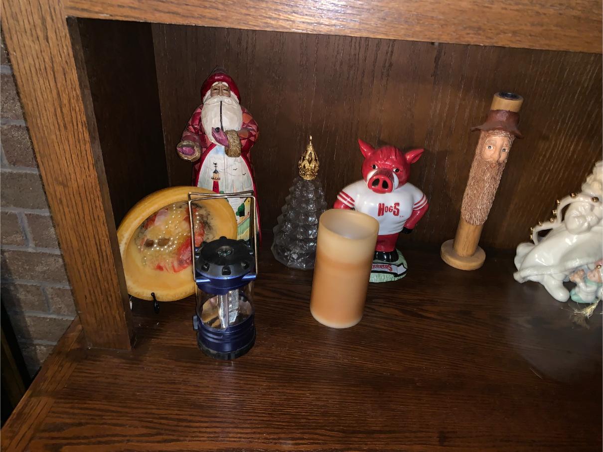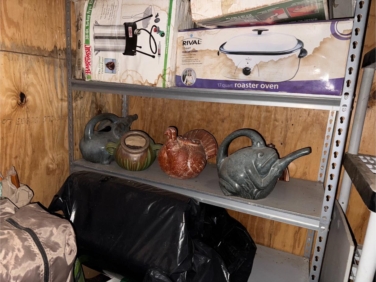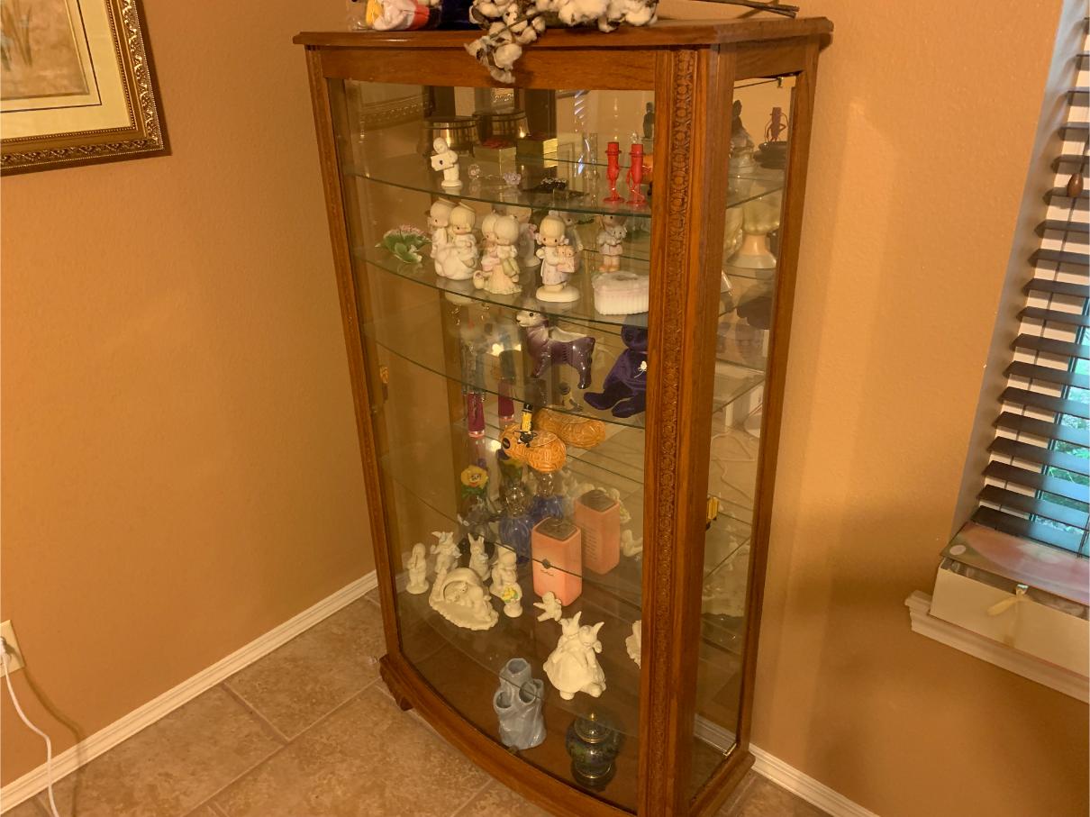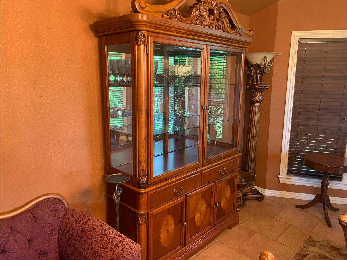 Household:Â Leather Sofa – (2) La-Z-Boy Leather Recliners – Leather Chair & Ottoman – Sofa – Coffee & End Tables – Sofa Table – Pine Dining Table & Chairs & China Cabinet – Iron Base w/Glass Top Dining Table & Chairs – Several Oak & Glass Curio Cabinets – Lawyer’s Bookcase – Desk – Occasional Tables & Chairs – Roll Around Kitchen Island – Baker’s Rack – Cherry King Size Bed, (2) Chests & (2) Nightstands – Lingerie Chest – Jewelry Armoire – Trunk – Elec Fireplace – Whirlpool Refrigerator – Speed Queen Washer – Whirlpool Cabrio Dryer – Small Appliances – Pots & Pans – Corningware – Misc Dishes & Kitchen Items – TV’s (Vizio) – Clocks – Yard Ornaments – Flower Pots – Concrete Razorback Bench – Patio Furniture – Fire Pit – Seasonal Decorations – Home Decor – Area Rugs – Books – Linens – Roomba Vac