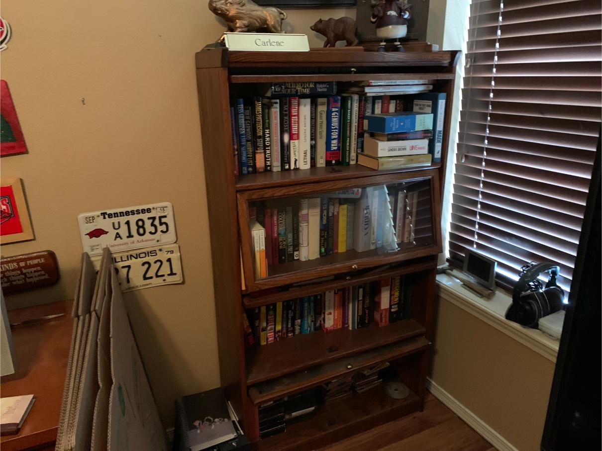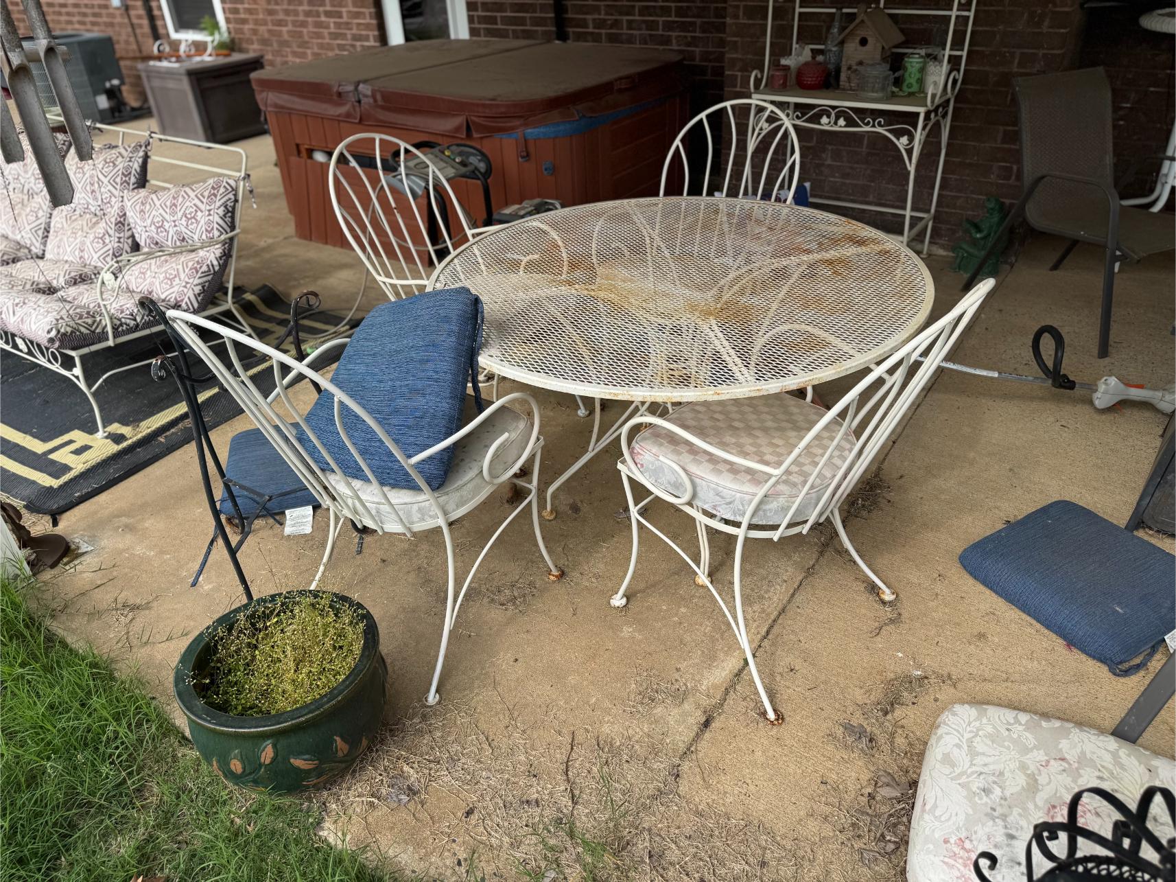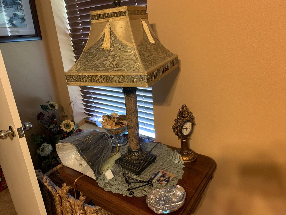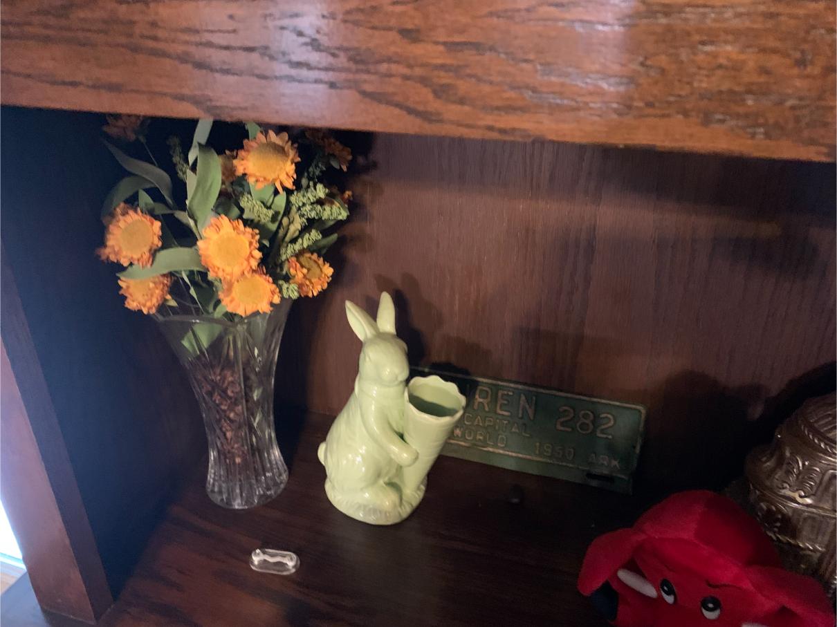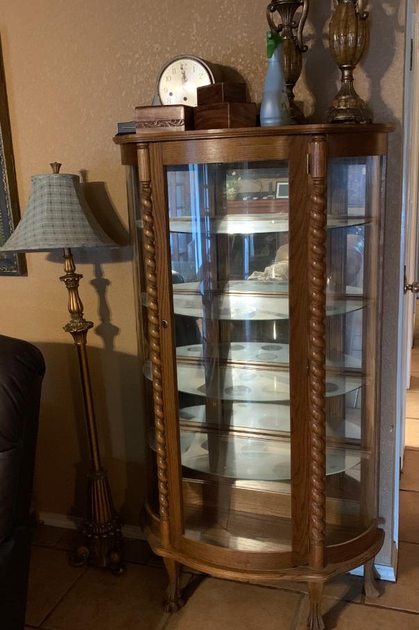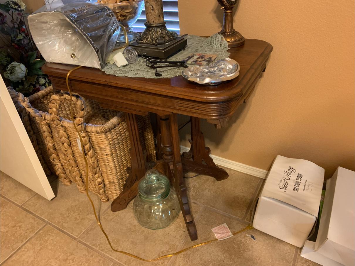 Household:Â Leather Sofa – (2) La-Z-Boy Leather Recliners – Leather Chair & Ottoman – Sofa – Coffee & End Tables – Sofa Table – Pine Dining Table & Chairs & China Cabinet – Iron Base w/Glass Top Dining Table & Chairs – Several Oak & Glass Curio Cabinets – Lawyer’s Bookcase – Desk – Occasional Tables & Chairs – Roll Around Kitchen Island – Baker’s Rack – Cherry King Size Bed, (2) Chests & (2) Nightstands – Lingerie Chest – Jewelry Armoire – Trunk – Elec Fireplace – Whirlpool Refrigerator – Speed Queen Washer – Whirlpool Cabrio Dryer – Small Appliances – Pots & Pans – Corningware – Misc Dishes & Kitchen Items – TV’s (Vizio) – Clocks – Yard Ornaments – Flower Pots – Concrete Razorback Bench – Patio Furniture – Fire Pit – Seasonal Decorations – Home Decor – Area Rugs – Books – Linens – Roomba Vac