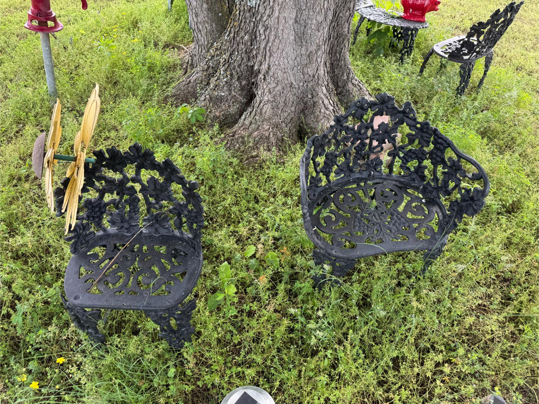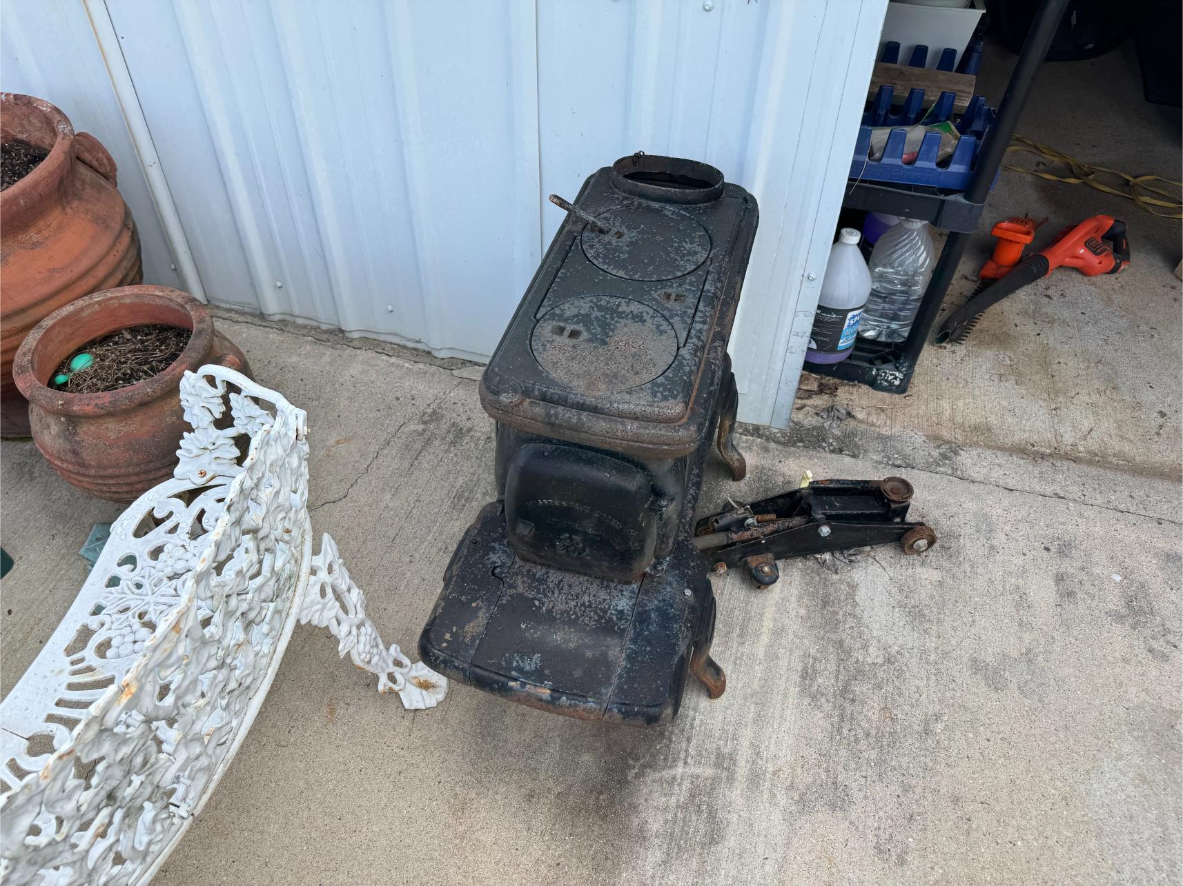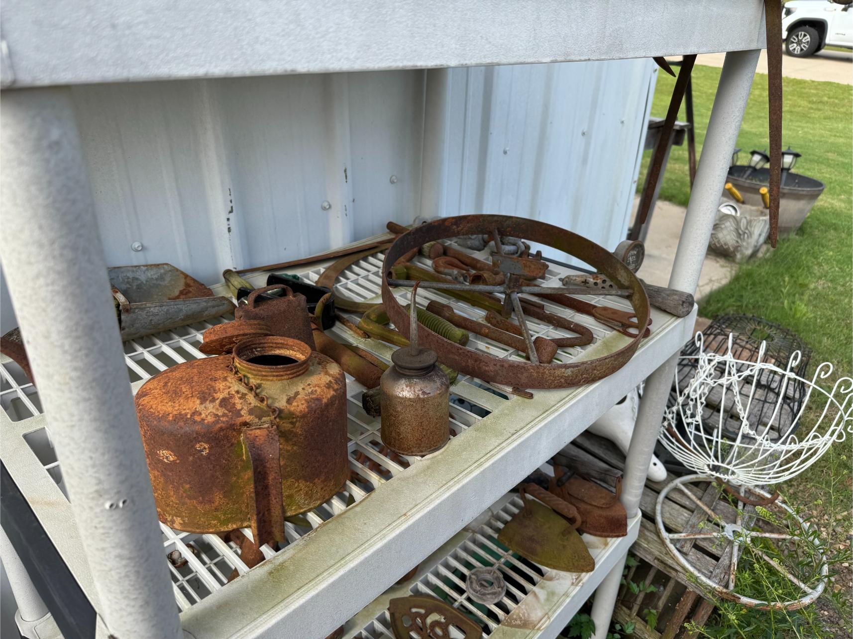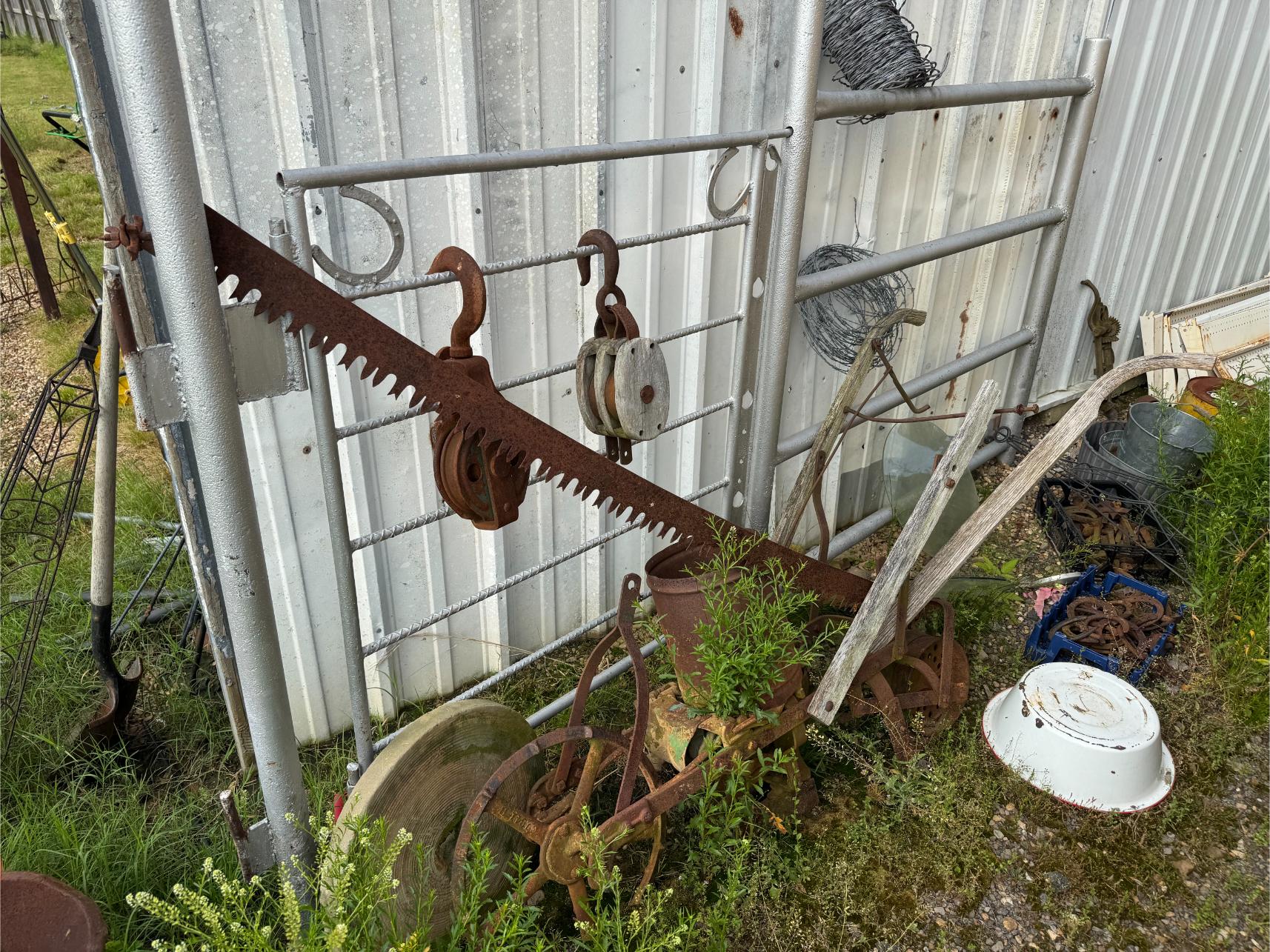 Antiques & Collectibles:Â (2) Oak Bow Front China Hutches – Oak Buffet – (2) Victorian Sofa & (2) Chairs – (2) Duncan Phyfe Round End Tables – Center Table – Oak Rockers – Eastlake Chairs – Mirrors, Pictures, Paintings – Stained Glass – Lamps, Floor Lamps – Kerosene Lamp – Mantle Clocks – Dazey Glass Churn – Pyrex Mixing Bowls – Cookie Jars – Planters Peanut Collectibles – Copper Bucket – Collector Plates – Misc Glassware – Iron Skillets – Wood Bowls – Crocks – Silver Plated Items – Rub Board – Galv Tubs – Tubs on Stands – Sleds – Planters – Well Pulley – Iron Tub Feet – Iron Wash Pot – Cast Iron Stove – Wrought Iron Furniture – Jewelry – Masonic Pins – Gold Plated Flatware in Case – Thailand 1966 Utensil Set in Case – Model Airplanes – Pitcher Pump – Push Plows