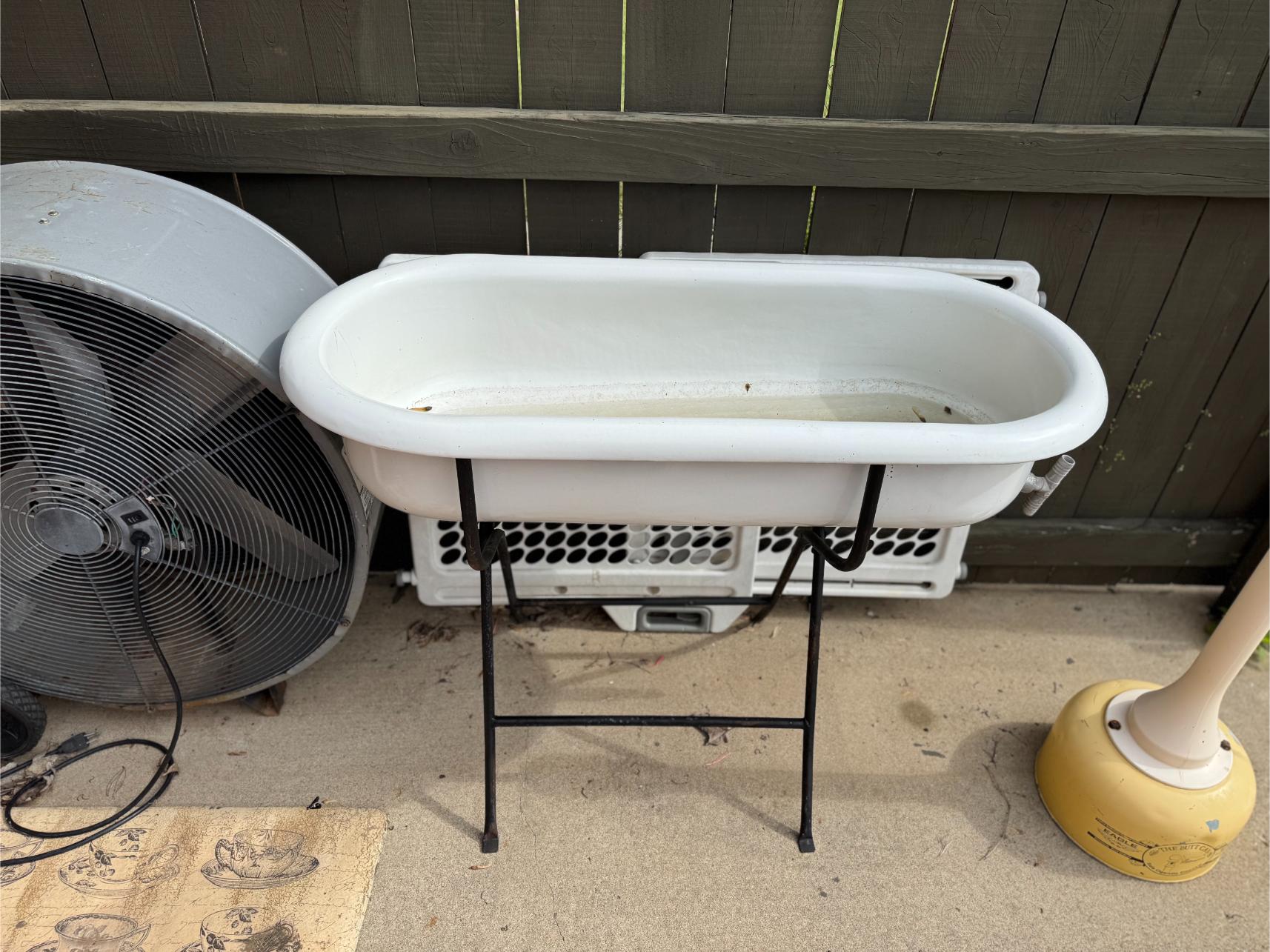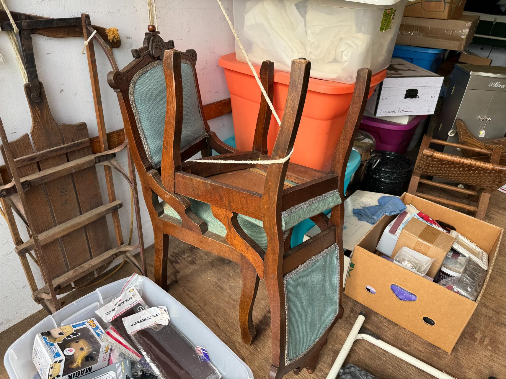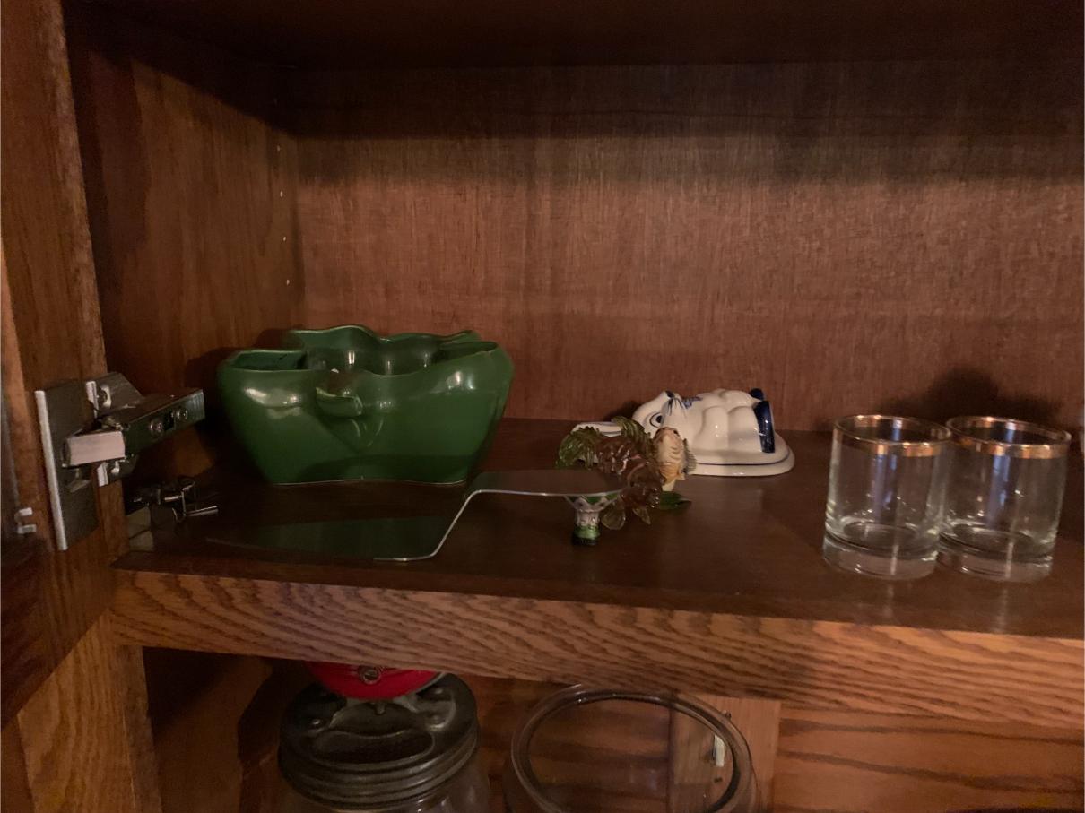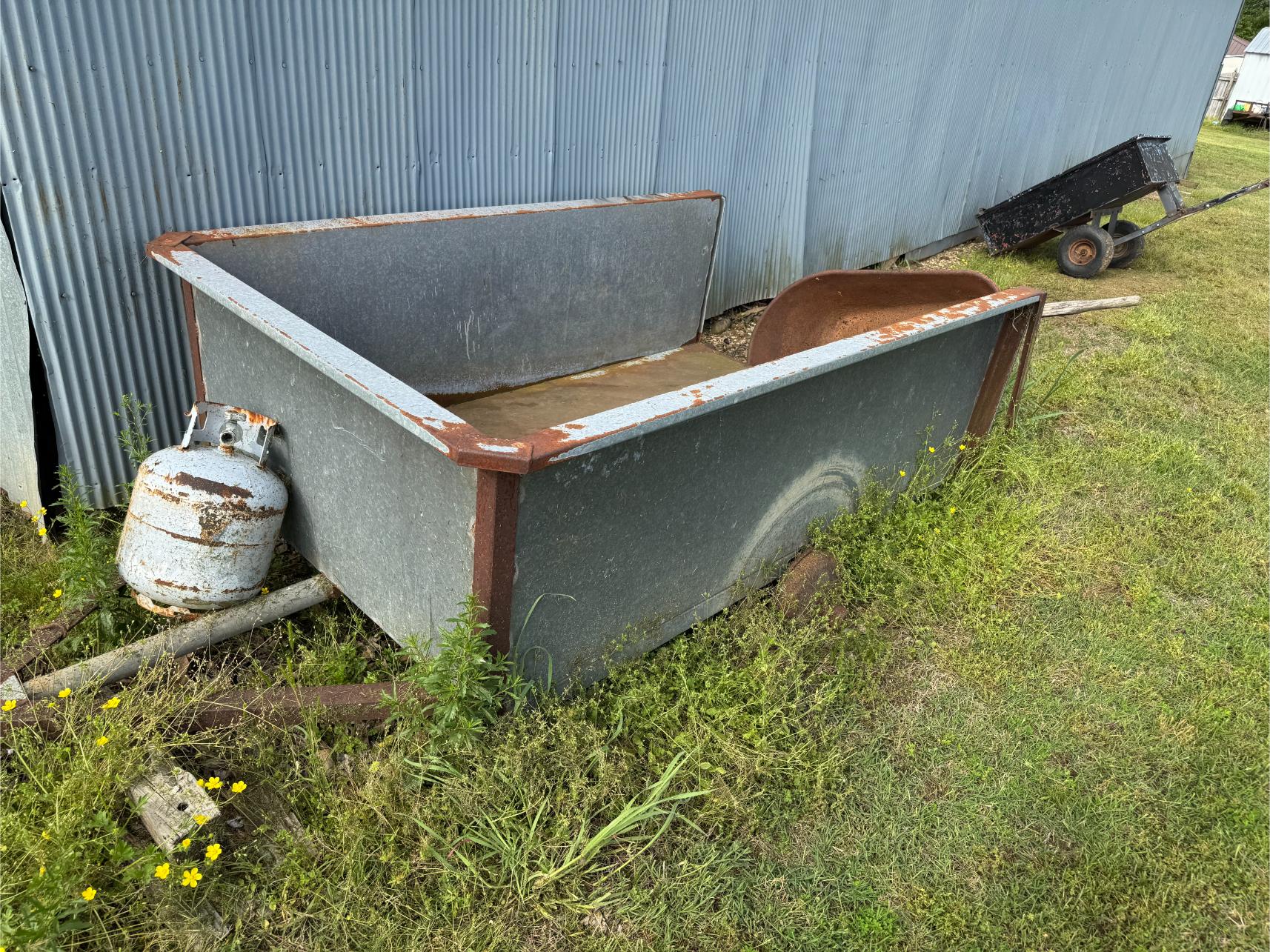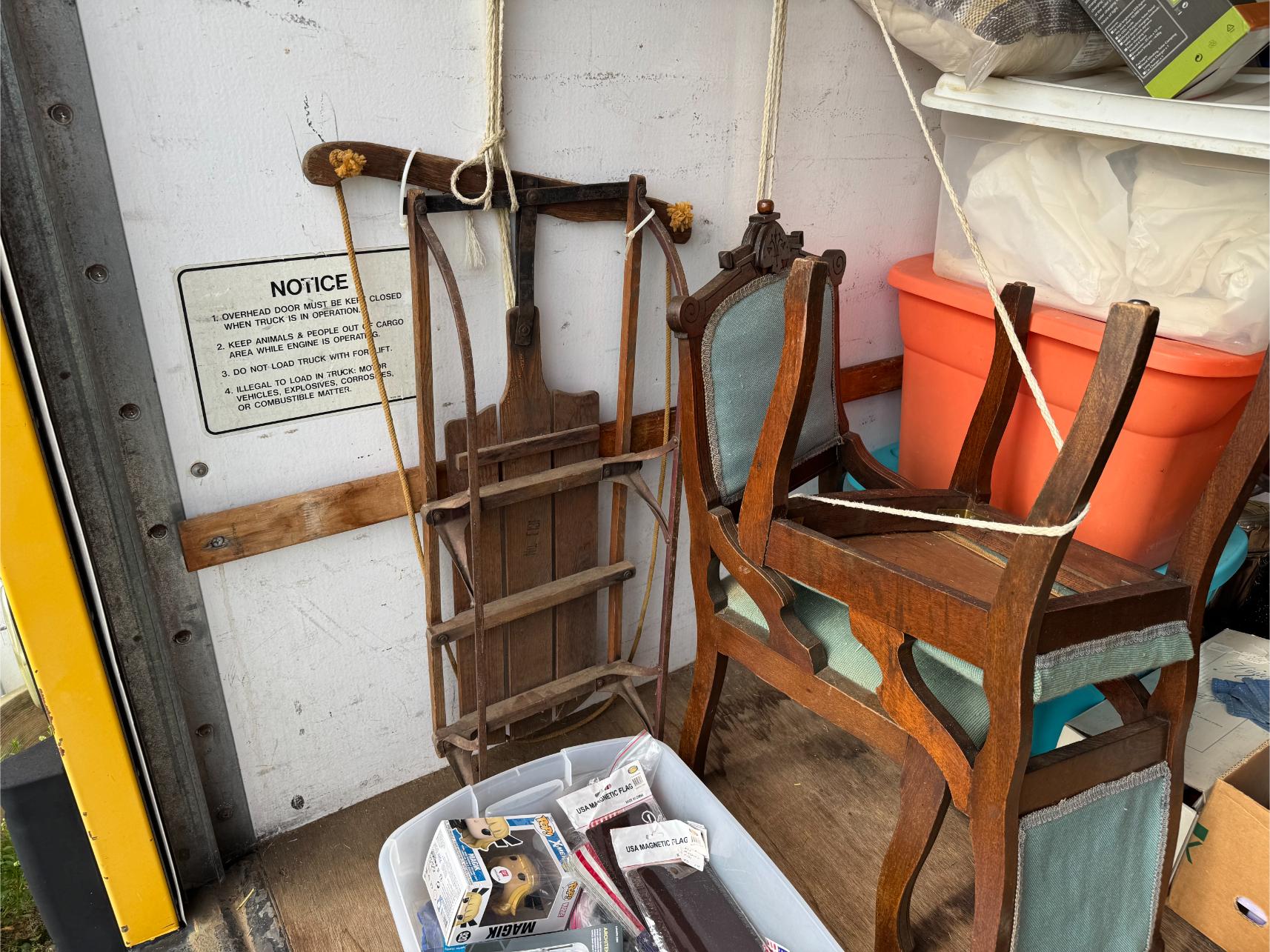 Antiques & Collectibles:Â (2) Oak Bow Front China Hutches – Oak Buffet – (2) Victorian Sofa & (2) Chairs – (2) Duncan Phyfe Round End Tables – Center Table – Oak Rockers – Eastlake Chairs – Mirrors, Pictures, Paintings – Stained Glass – Lamps, Floor Lamps – Kerosene Lamp – Mantle Clocks – Dazey Glass Churn – Pyrex Mixing Bowls – Cookie Jars – Planters Peanut Collectibles – Copper Bucket – Collector Plates – Misc Glassware – Iron Skillets – Wood Bowls – Crocks – Silver Plated Items – Rub Board – Galv Tubs – Tubs on Stands – Sleds – Planters – Well Pulley – Iron Tub Feet – Iron Wash Pot – Cast Iron Stove – Wrought Iron Furniture – Jewelry – Masonic Pins – Gold Plated Flatware in Case – Thailand 1966 Utensil Set in Case – Model Airplanes – Pitcher Pump – Push Plows