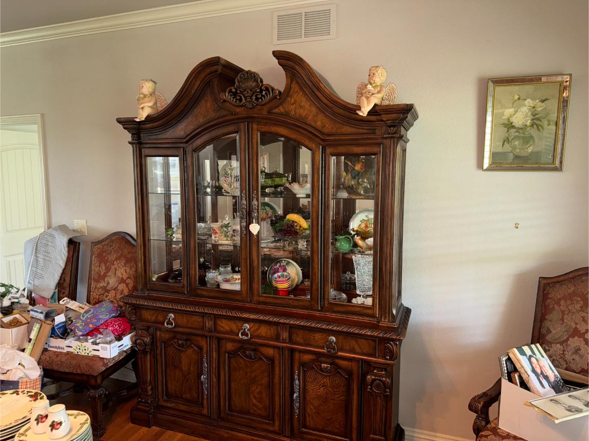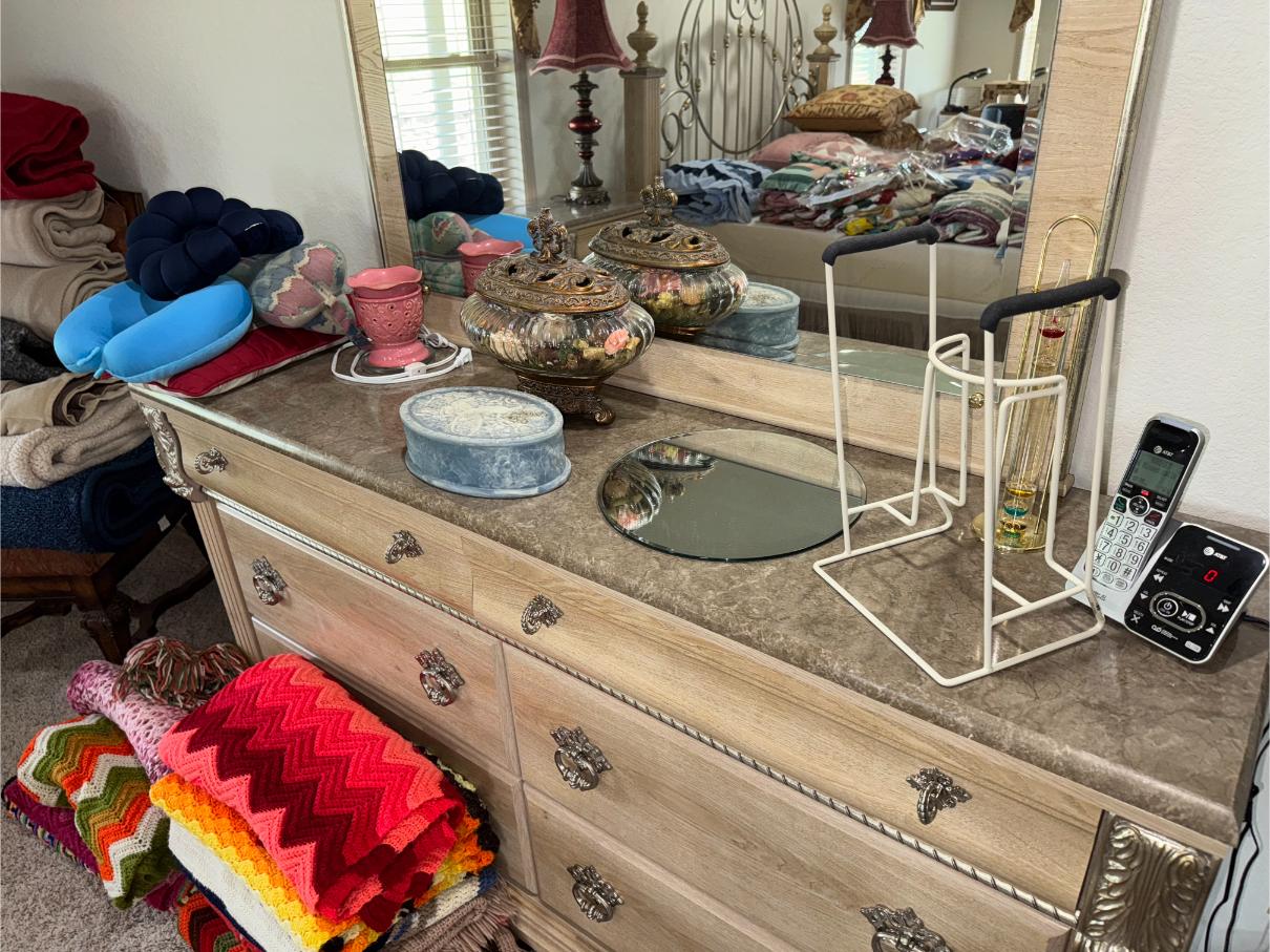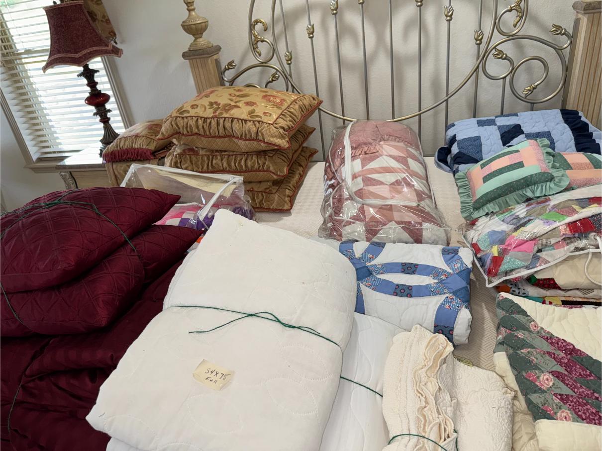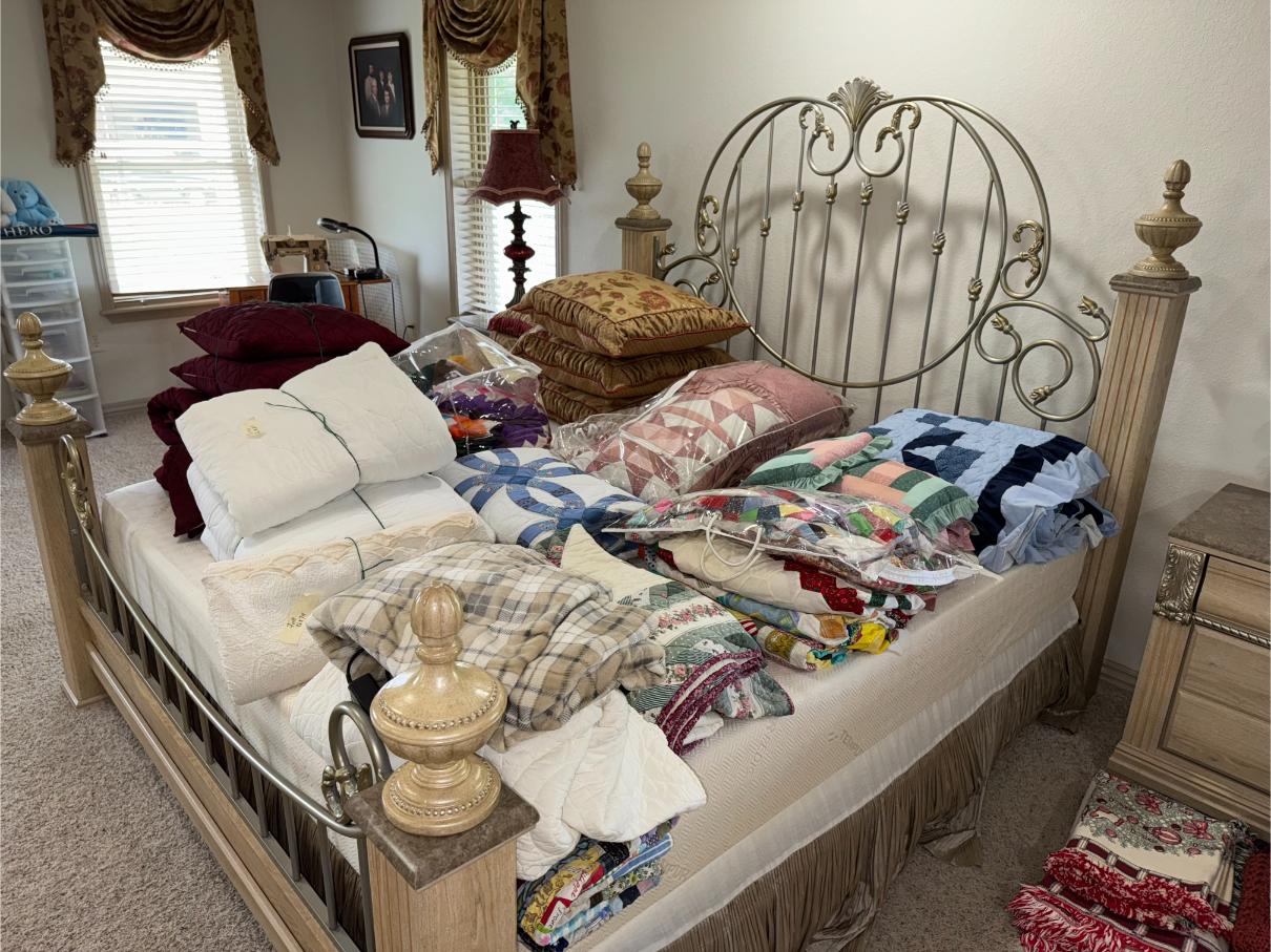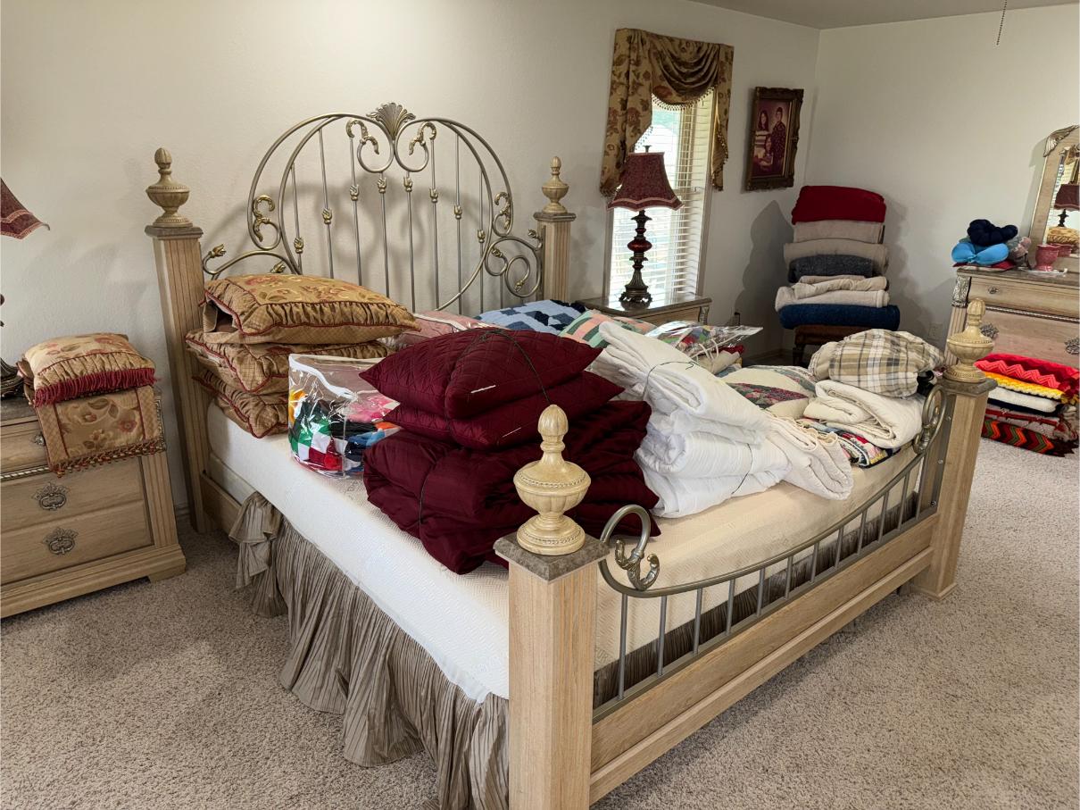 Household:Â (2) Leather Recliners – Micro-Suede Recliner – Sofa – Coffee & End Tables – Dining Room Table & (10) Chairs & Matching China Cabinet – Marble Top Table & (4) Chairs – Oak Table & Chairs – Bombay Style Chest – 3′ Curio Cabinet – Oak Ent Center – Bar Stool – Blonde King Size Bed, Dresser, Chest, Armoire & Nightstands – Full Size Bed – Mahogany Gentleman’s Chest & Quilt Box – Oak Nightstands – Elec Fireplace – Jewelry Armoire – Maytag 3-Door Refrigerator – Frigidaire Upright Freezer – Whirlpool Washer & Dryer – Small Appliances – Kitchen Aid Mixer – Pots & Pans – Corningware – Dishes – Pictures, Mirrors – Lamps – Home Decor – Area Rugs – TV’s (LG, Samsung) – Misc Electronics – Linens – Purses – Wrought Iron Patio Furniture – Sentry Safe – Heaters – Seasonal Decorations – Clothes RacksÂ