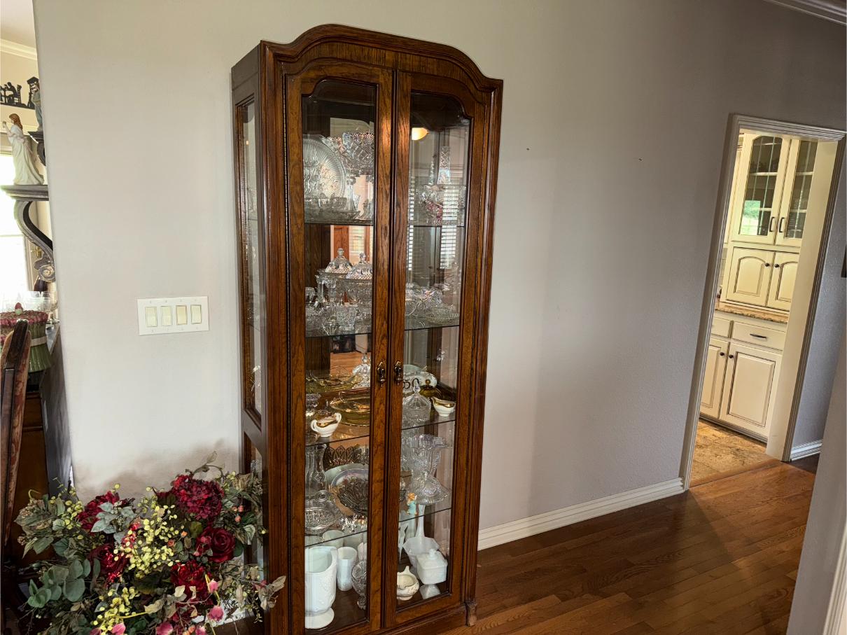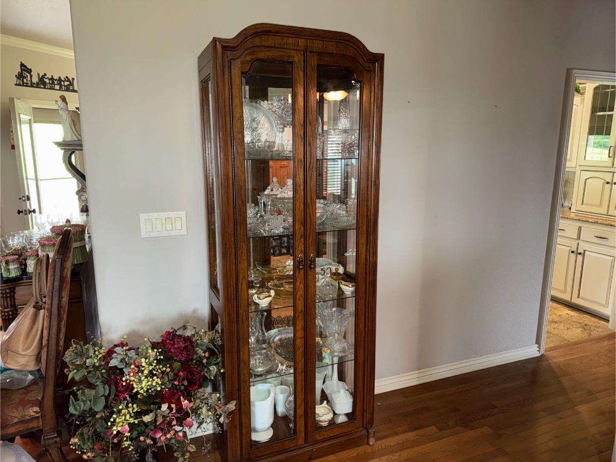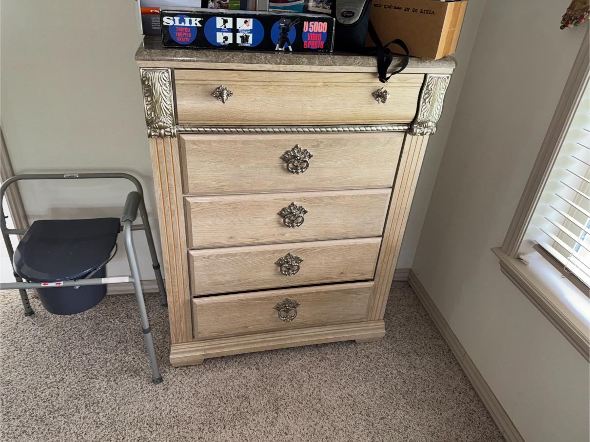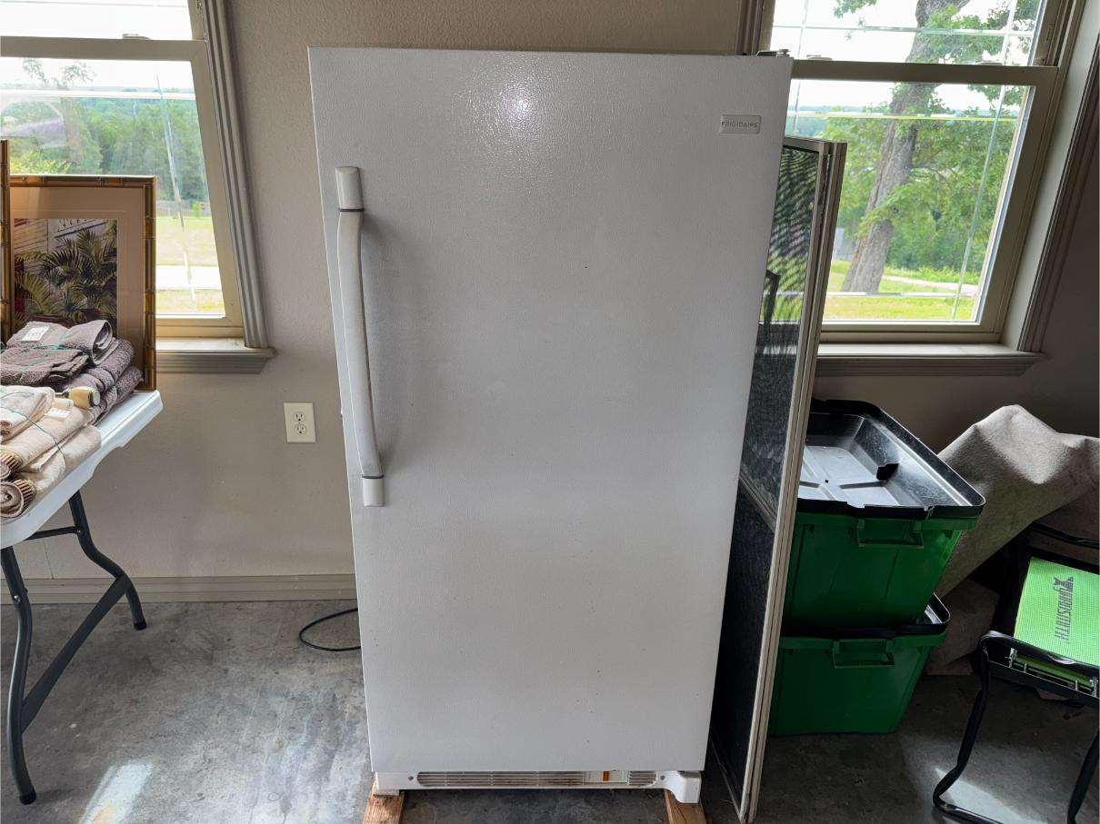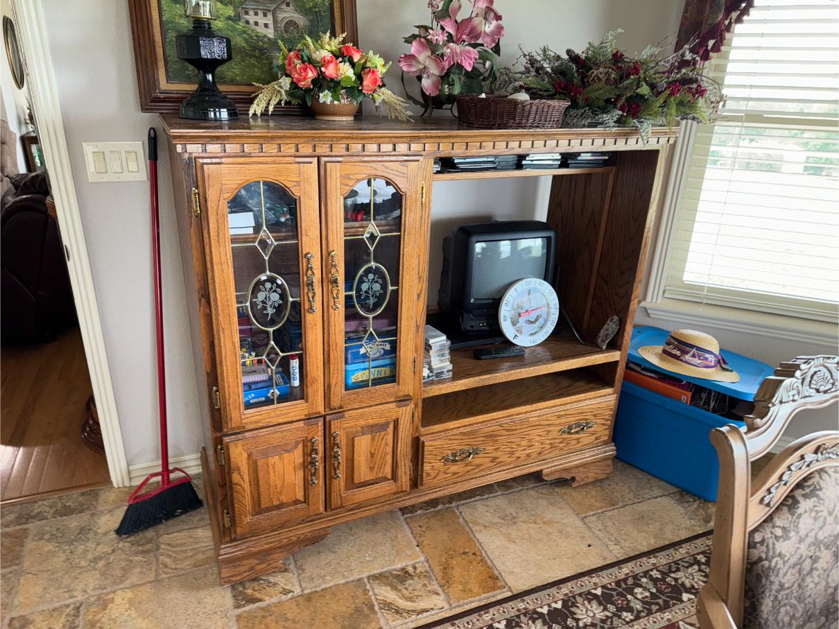 Household:Â (2) Leather Recliners – Micro-Suede Recliner – Sofa – Coffee & End Tables – Dining Room Table & (10) Chairs & Matching China Cabinet – Marble Top Table & (4) Chairs – Oak Table & Chairs – Bombay Style Chest – 3′ Curio Cabinet – Oak Ent Center – Bar Stool – Blonde King Size Bed, Dresser, Chest, Armoire & Nightstands – Full Size Bed – Mahogany Gentleman’s Chest & Quilt Box – Oak Nightstands – Elec Fireplace – Jewelry Armoire – Maytag 3-Door Refrigerator – Frigidaire Upright Freezer – Whirlpool Washer & Dryer – Small Appliances – Kitchen Aid Mixer – Pots & Pans – Corningware – Dishes – Pictures, Mirrors – Lamps – Home Decor – Area Rugs – TV’s (LG, Samsung) – Misc Electronics – Linens – Purses – Wrought Iron Patio Furniture – Sentry Safe – Heaters – Seasonal Decorations – Clothes RacksÂ