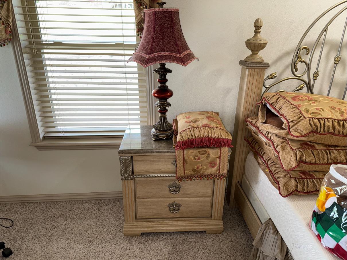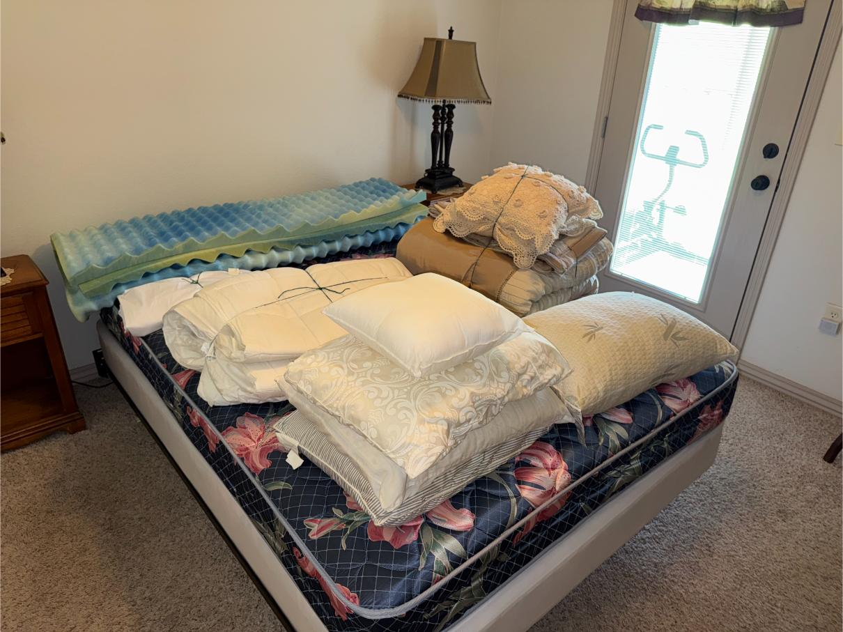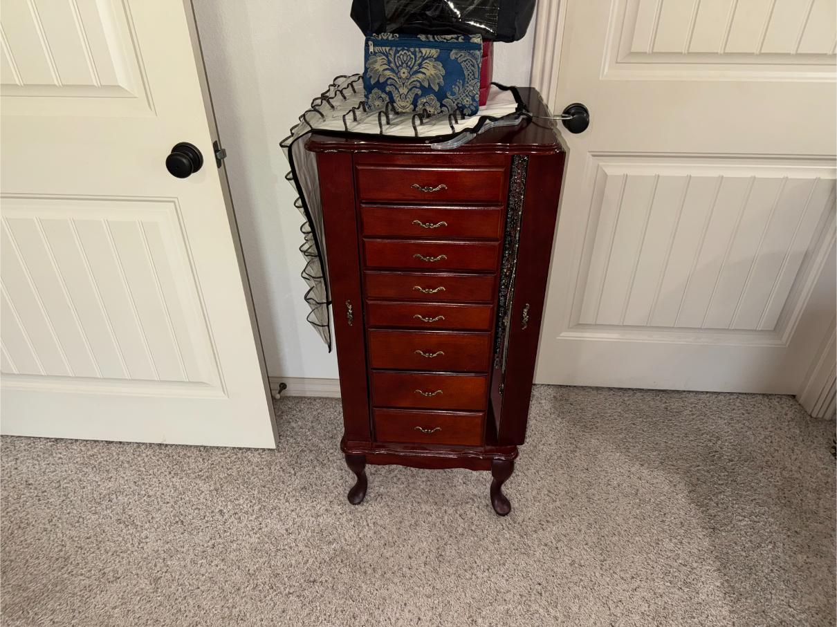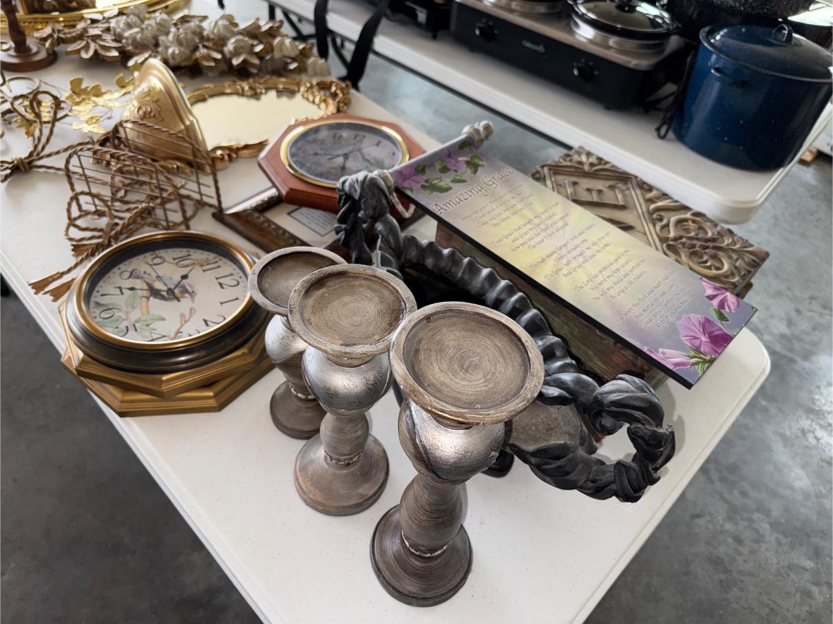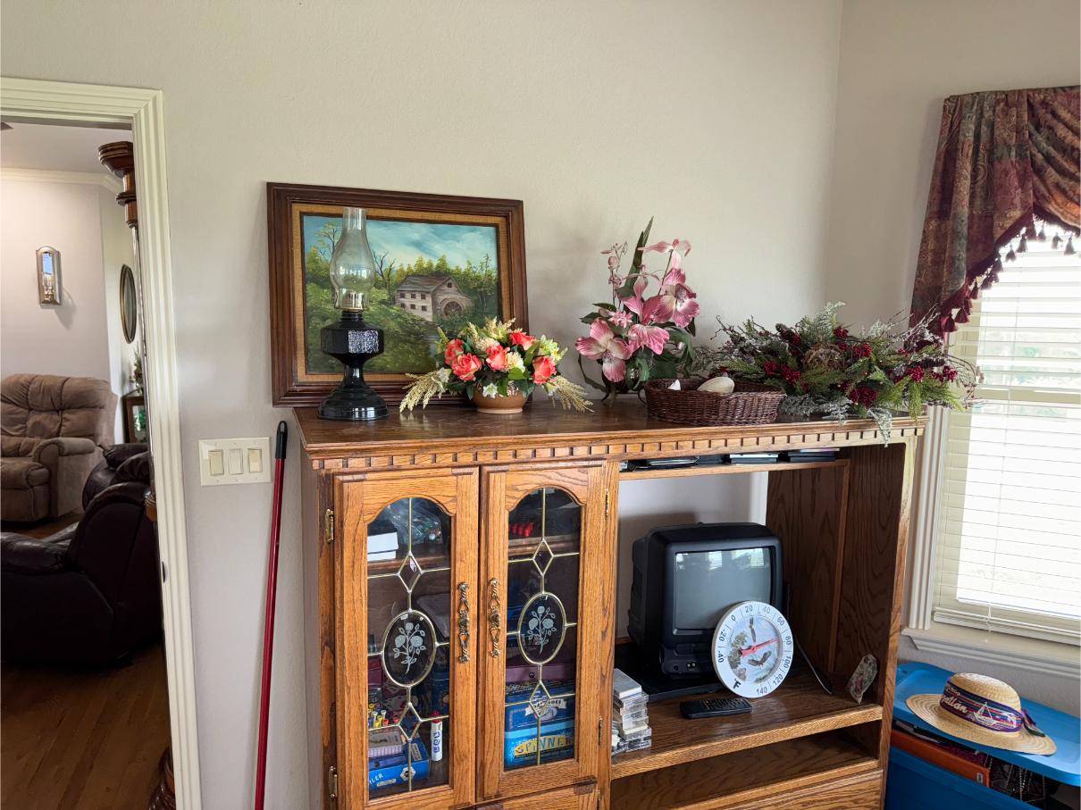 Household:Â (2) Leather Recliners – Micro-Suede Recliner – Sofa – Coffee & End Tables – Dining Room Table & (10) Chairs & Matching China Cabinet – Marble Top Table & (4) Chairs – Oak Table & Chairs – Bombay Style Chest – 3′ Curio Cabinet – Oak Ent Center – Bar Stool – Blonde King Size Bed, Dresser, Chest, Armoire & Nightstands – Full Size Bed – Mahogany Gentleman’s Chest & Quilt Box – Oak Nightstands – Elec Fireplace – Jewelry Armoire – Maytag 3-Door Refrigerator – Frigidaire Upright Freezer – Whirlpool Washer & Dryer – Small Appliances – Kitchen Aid Mixer – Pots & Pans – Corningware – Dishes – Pictures, Mirrors – Lamps – Home Decor – Area Rugs – TV’s (LG, Samsung) – Misc Electronics – Linens – Purses – Wrought Iron Patio Furniture – Sentry Safe – Heaters – Seasonal Decorations – Clothes RacksÂ