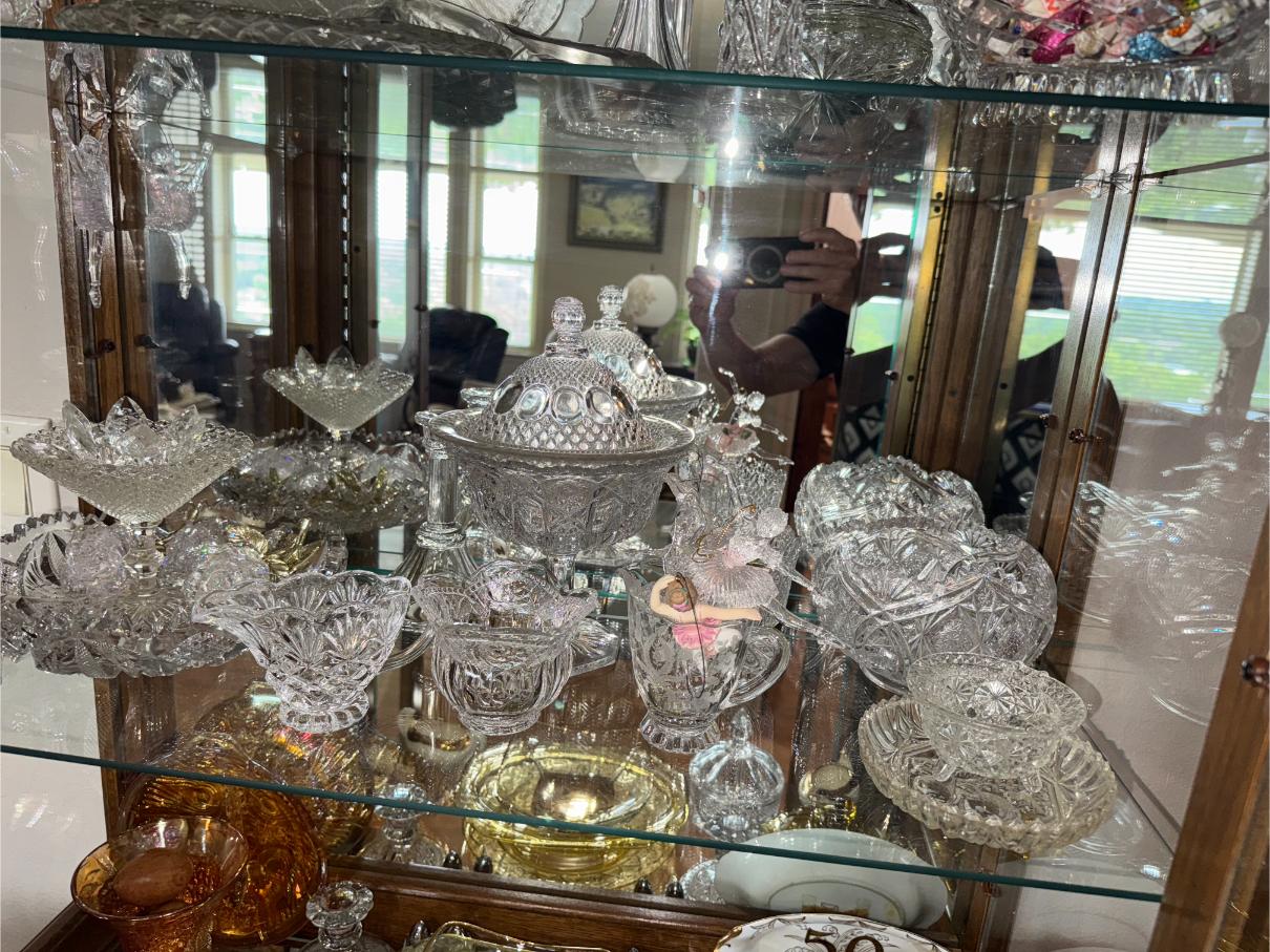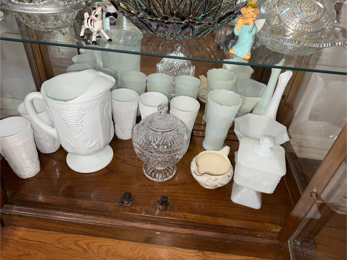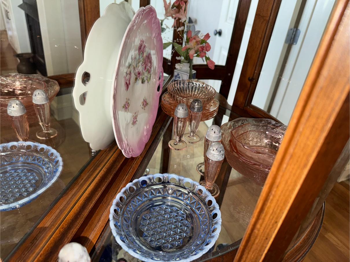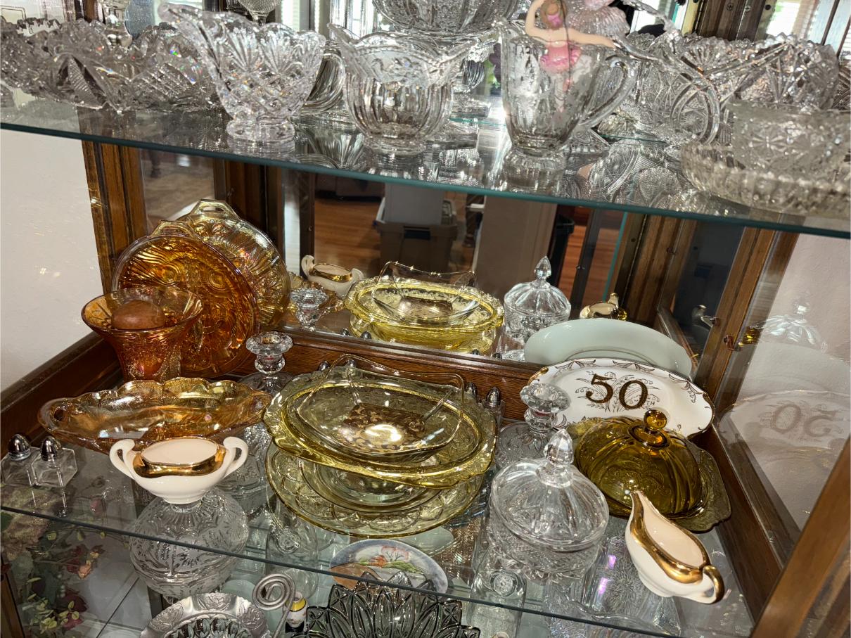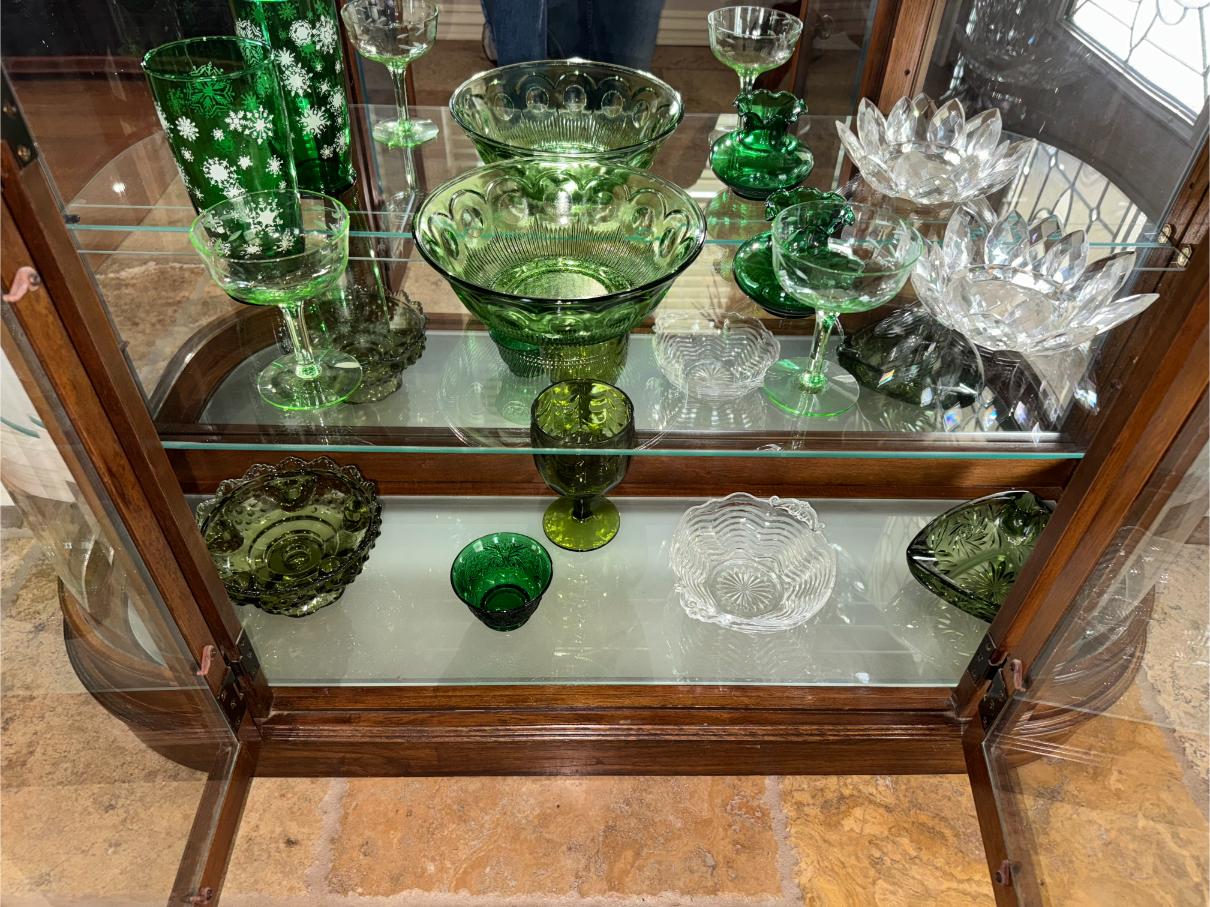 Antiques & Collectibles:Â Duncan Phyfe Round Table – Crock Bowl – Pink & Green Depression Glass – Franciscan Apple Dishes – Cedar Cove Dishes – Cut Glass – Clear Glass – Crystal – Carnival Glass – China – Lenox – S&P Collection – Cups & Saucers – Collector Plates – Homes & Edward Silverware – Brass Spittoon – Crock – Bottle Collection – Lanterns – Oak Hat Rack – Kerosene Lamp – Records – Kitchen Clock – Singer Sewing Machine & Cabinet – Afghans – Quilts – Jewelry – Makeup Stool – Needle Point Chair