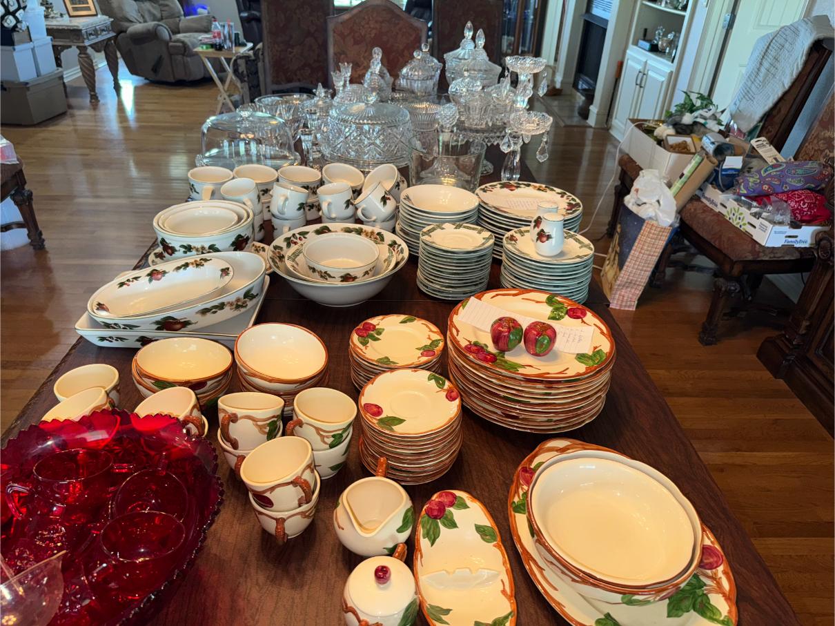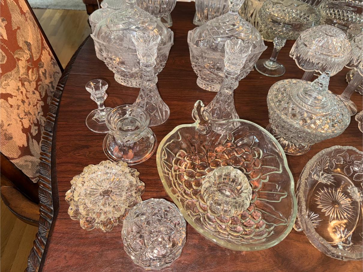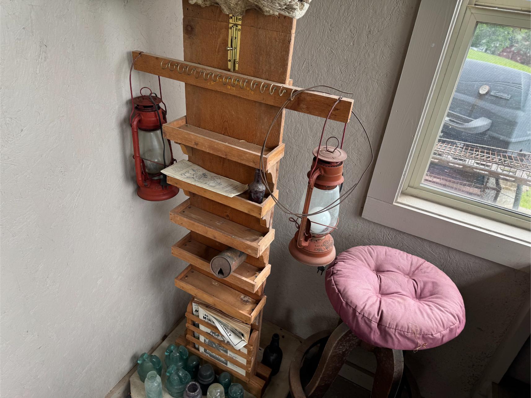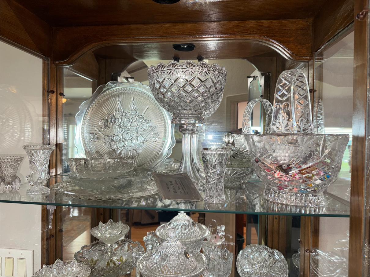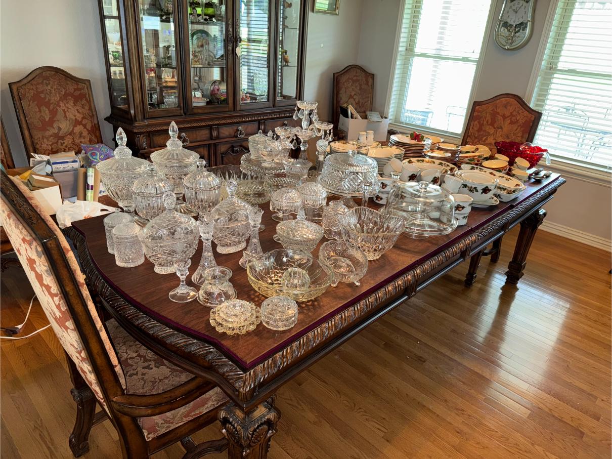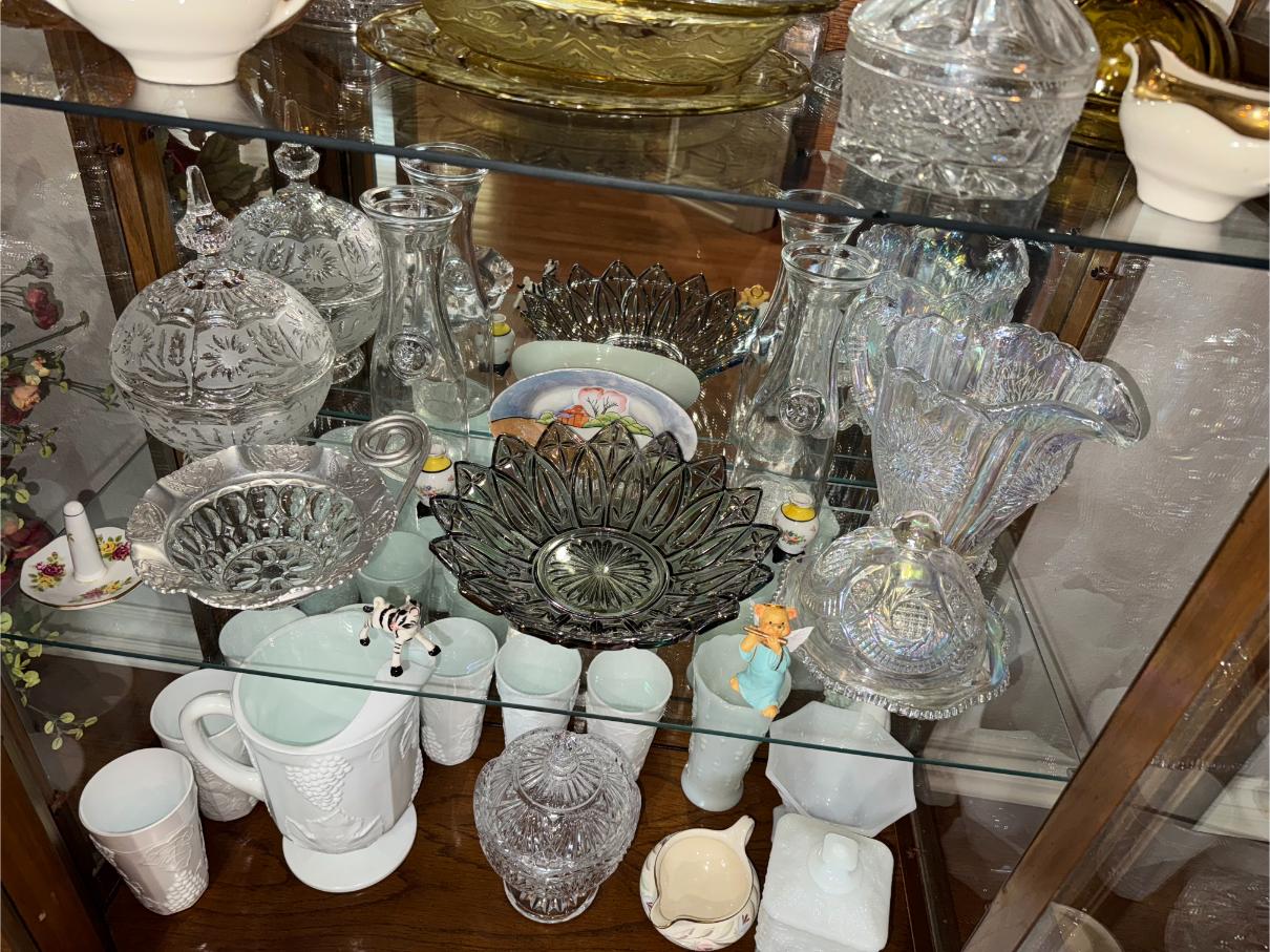 Antiques & Collectibles:Â Duncan Phyfe Round Table – Crock Bowl – Pink & Green Depression Glass – Franciscan Apple Dishes – Cedar Cove Dishes – Cut Glass – Clear Glass – Crystal – Carnival Glass – China – Lenox – S&P Collection – Cups & Saucers – Collector Plates – Homes & Edward Silverware – Brass Spittoon – Crock – Bottle Collection – Lanterns – Oak Hat Rack – Kerosene Lamp – Records – Kitchen Clock – Singer Sewing Machine & Cabinet – Afghans – Quilts – Jewelry – Makeup Stool – Needle Point Chair