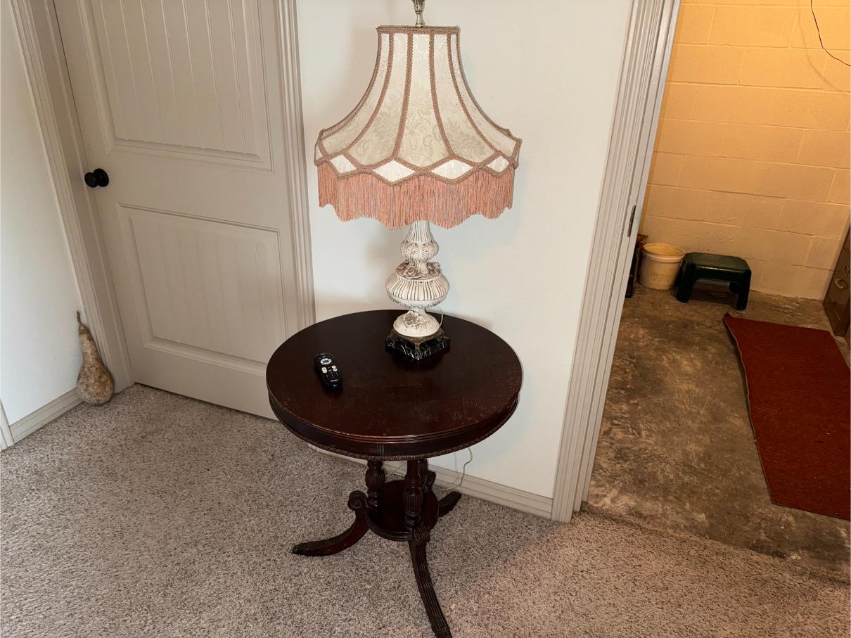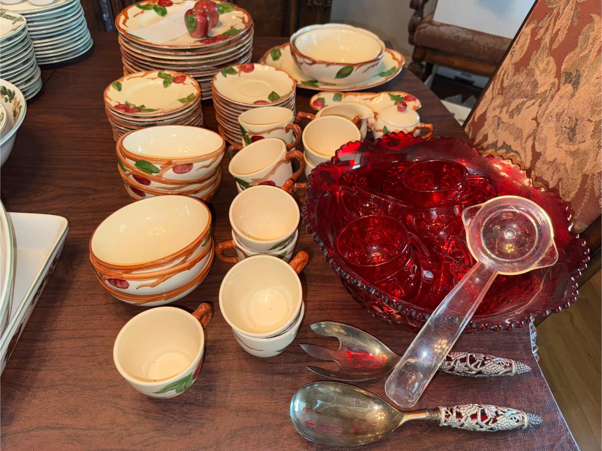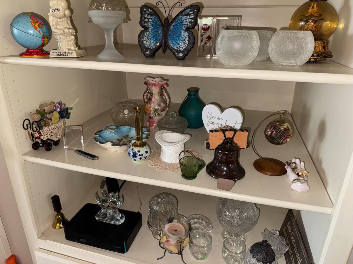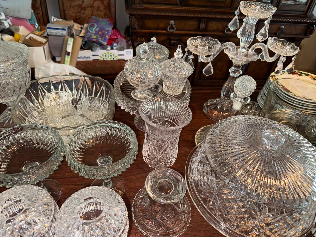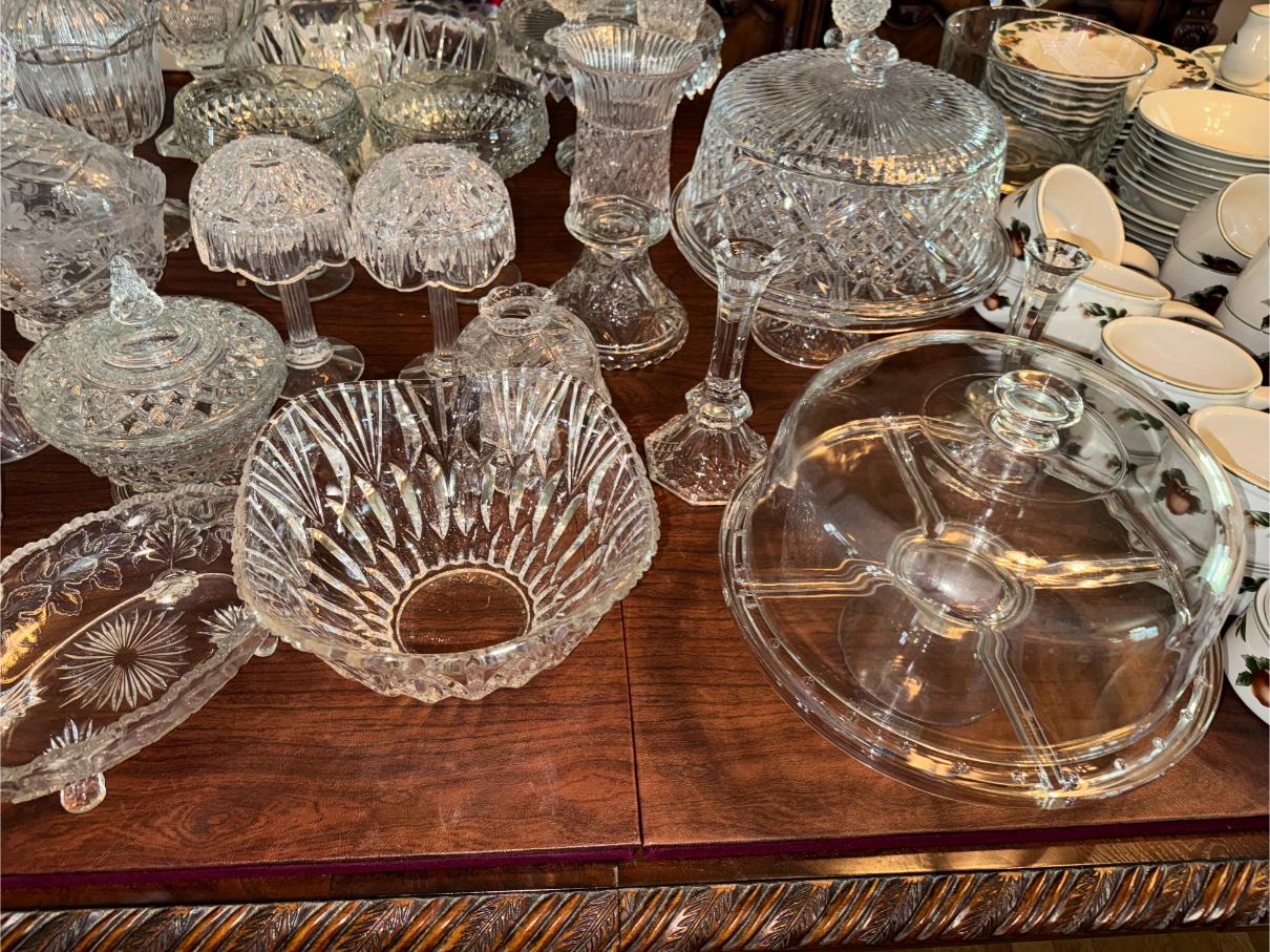 Antiques & Collectibles:Â Duncan Phyfe Round Table – Crock Bowl – Pink & Green Depression Glass – Franciscan Apple Dishes – Cedar Cove Dishes – Cut Glass – Clear Glass – Crystal – Carnival Glass – China – Lenox – S&P Collection – Cups & Saucers – Collector Plates – Homes & Edward Silverware – Brass Spittoon – Crock – Bottle Collection – Lanterns – Oak Hat Rack – Kerosene Lamp – Records – Kitchen Clock – Singer Sewing Machine & Cabinet – Afghans – Quilts – Jewelry – Makeup Stool – Needle Point Chair