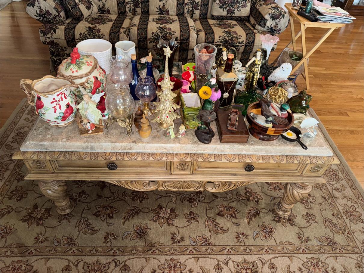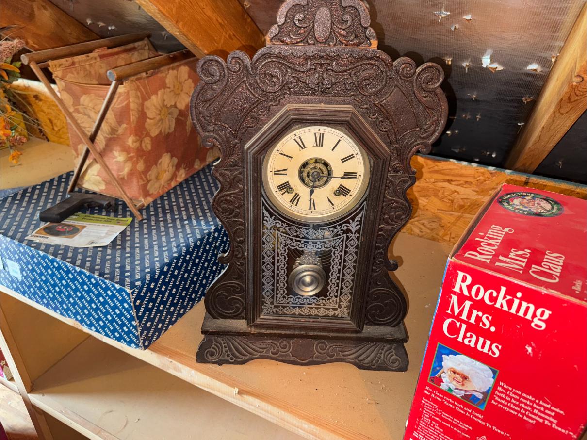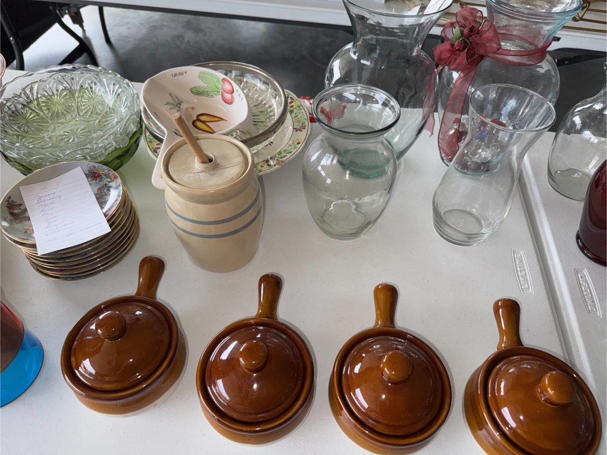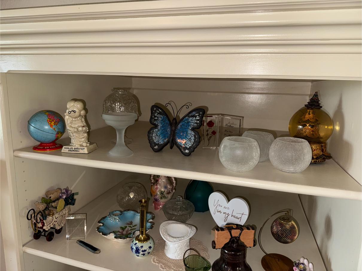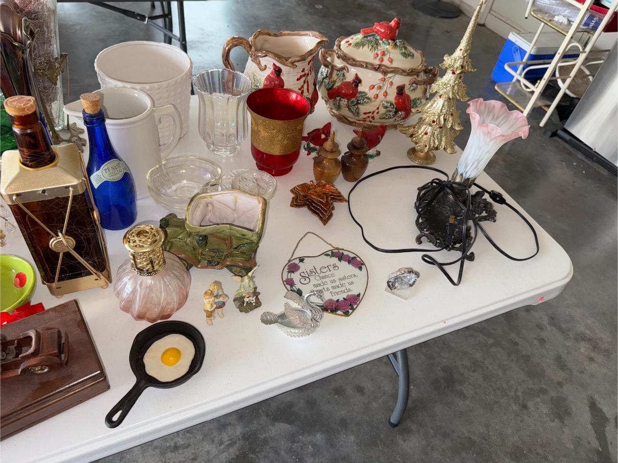 Antiques & Collectibles:Â Duncan Phyfe Round Table – Crock Bowl – Pink & Green Depression Glass – Franciscan Apple Dishes – Cedar Cove Dishes – Cut Glass – Clear Glass – Crystal – Carnival Glass – China – Lenox – S&P Collection – Cups & Saucers – Collector Plates – Homes & Edward Silverware – Brass Spittoon – Crock – Bottle Collection – Lanterns – Oak Hat Rack – Kerosene Lamp – Records – Kitchen Clock – Singer Sewing Machine & Cabinet – Afghans – Quilts – Jewelry – Makeup Stool – Needle Point Chair