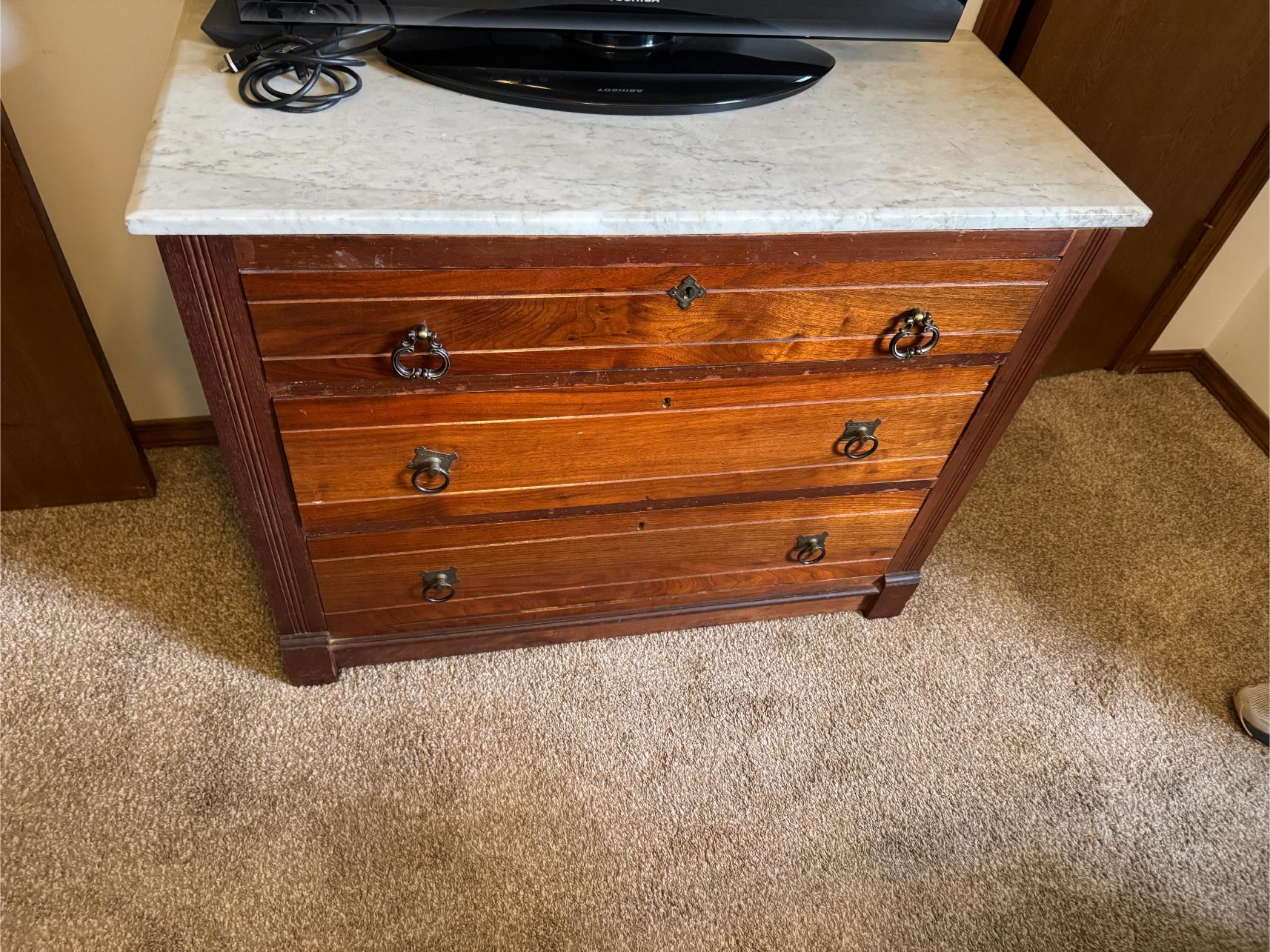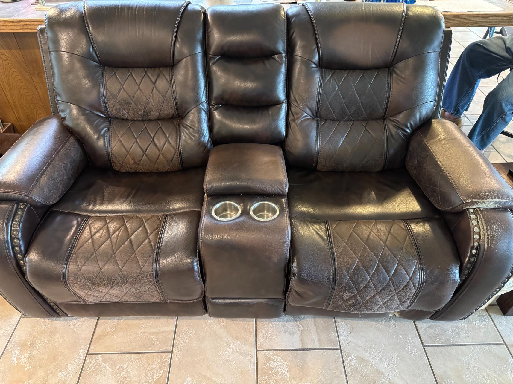Household: Leather Dual Reclining Sofa – Pub Table & Chairs – Marble Top Antique Dresser