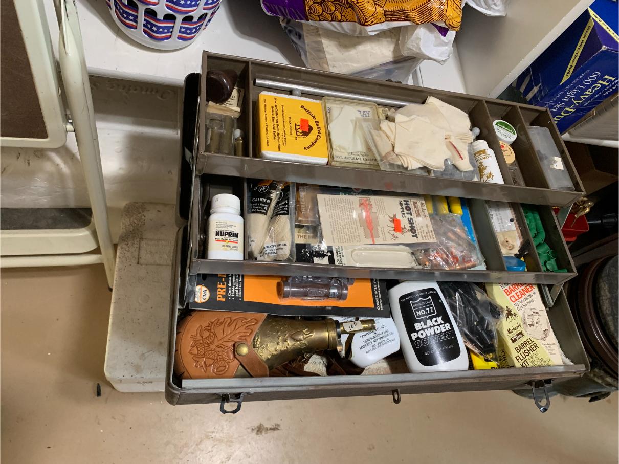 Firearms: Waffenfabrik M78 41 Swedish REM Fire Bolt Action Rifle – Springfield Armory Mod. 1863 Allin Conversion 50-70 – Thompson Center 54 Caliber Black Powder w/ Sharon Rifle Barrel – Thompson Center Fire Storm 50 Caliber Black Powder (209 Primer) New with Box – Winchester Mod. 101 Pigeon Grade w/ Wind Choke .20 Gauge Over/Under – Custom Built Argentine Mauser Action 6mm Remington Bolt Action w/ Weaver Scope – Custom Built Argentine Mauser Action 257 Roberts Bolt Action w/ Weaver Scope – Custom Built Argentine Mauser Action 7×57 Bolt Action w/ Weaver Scope – Smith and Wesson Mod. 29-2 44 Magnum Revolver 6in. Barrel Nickel Plated – Browning Medallion Belgium Made 22 Caliber Handgun – Spanish 45 Caliber Black Powder – Thompson Center 50 Caliber Black Powder – Winchester Mod. 12 16 Gauge Pump Imp. Cyl. – Winchester Mod. 70 XTR Featherweight .30-06 Bolt Action w/ Leupold Scope and Conetrol Mounts – Winchester Mod. 12 12 Gauge Pump w/ WS1 Skeet Barrel and Nickel Steel Full Choke Barrel – Winchester Mod. 70 SA 220 Swift Heavy Varmint w/ Weaver Scope – Crossman 17 Caliber Air Handgun – Holsters – Gun Cases – Hard Gun Cases – Gun Safe (½in. Steel Plate, Safe Deposit Box Locks) – Gun Books – Gun Parts – Gun Cleaning Rods – Gun Cleaning Supplies – Reloading Bench – Decker Shooting Vise – Ammo Boxes – Ammunition: 22 LR – 22 WMR – 25 Auto – 38 Spc – 357 Mag – 44 Mag – 223 – 22-250 Rem – 6mm Rem – 257 Roberts – 7mm Mauser – 270 Win – 308 Win – 338 Win Mag – 300 Win Short Mag – 32 Short Colt – 9mm Luger – 327 Mag – 38-40 – 41 Mag – 45-70 Gov
