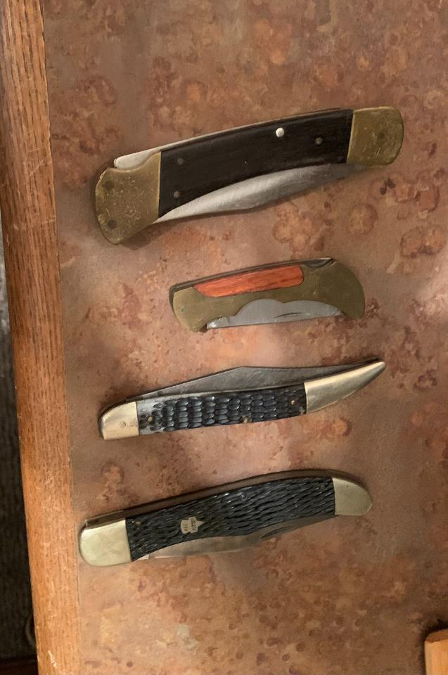 And: Marble’s Expert Fixed Blade Knife – NRA Schrade Knife Set – NRA Founders Club Knife – Jerry Fisk Fixed Blade Knife (Arkansas Game & Fish) – Tack (Halters, Bits, Leads, Blankets) – Brushes – Clippers – Branding Irons – Oxen Yoke – Saddle Bags – Fishing Rod Rack – Gun Cleaning Supplies – Pocket Knives – Bradford Hat – Stetson Winchester Hat – Resistol Straw Hat