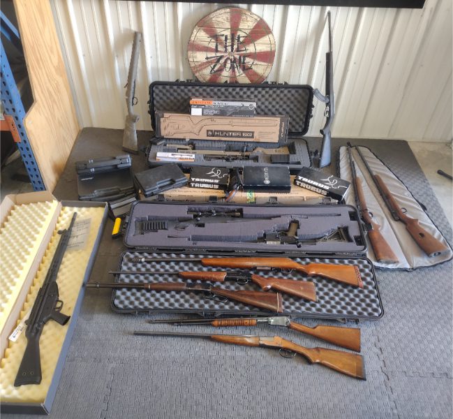 Firearms: Stevens Mod. 9400 .410 – Winchester Mod. 92 .22 Bolt Action – Winchester Mod. 74 .22 – Ruger Model 1022 (Bull Barrel) – Remington Mod. 700 .308 (Magpul Stock and Primary Arms Scope) – Stevens Mod. 311a Double Barrel – Rossi Pump .22 – Western Field EMN 175 .12 – Savage Mod. 12 .308 (Simmons Scope) – Century Arms C308 – Anderson AM15 – Canik TP9 .9mm – Beretta PX4 Storm .40 – Taurus 740 Slim .40 – Taurus M85 Ultra Light .38 spc – Ruger P85 .9mm – High Standard Deluxe .22 Revolver