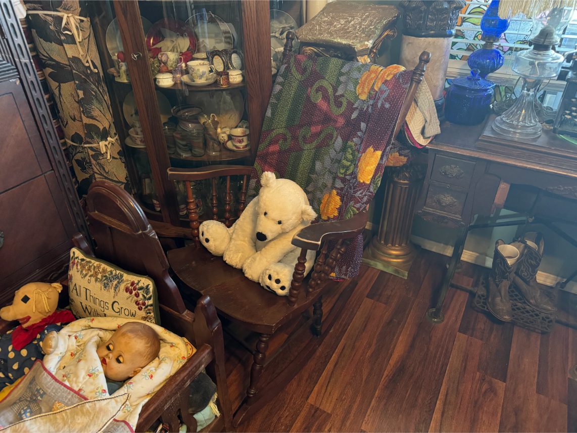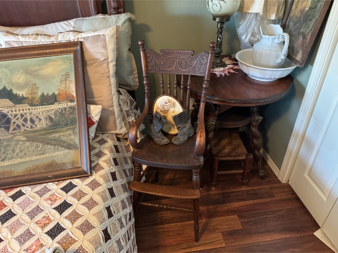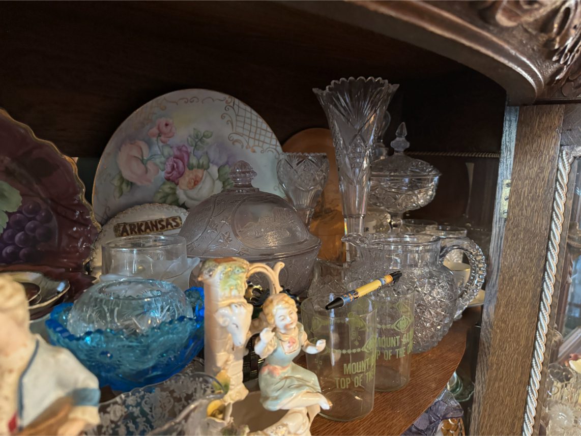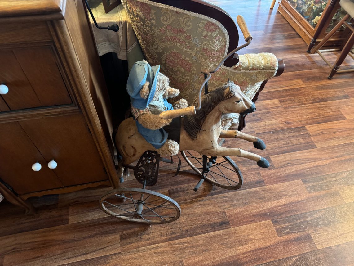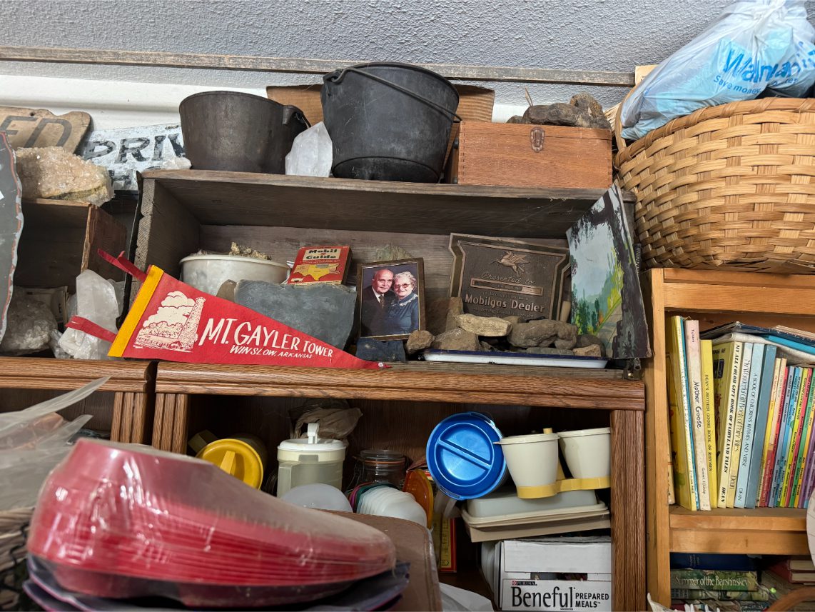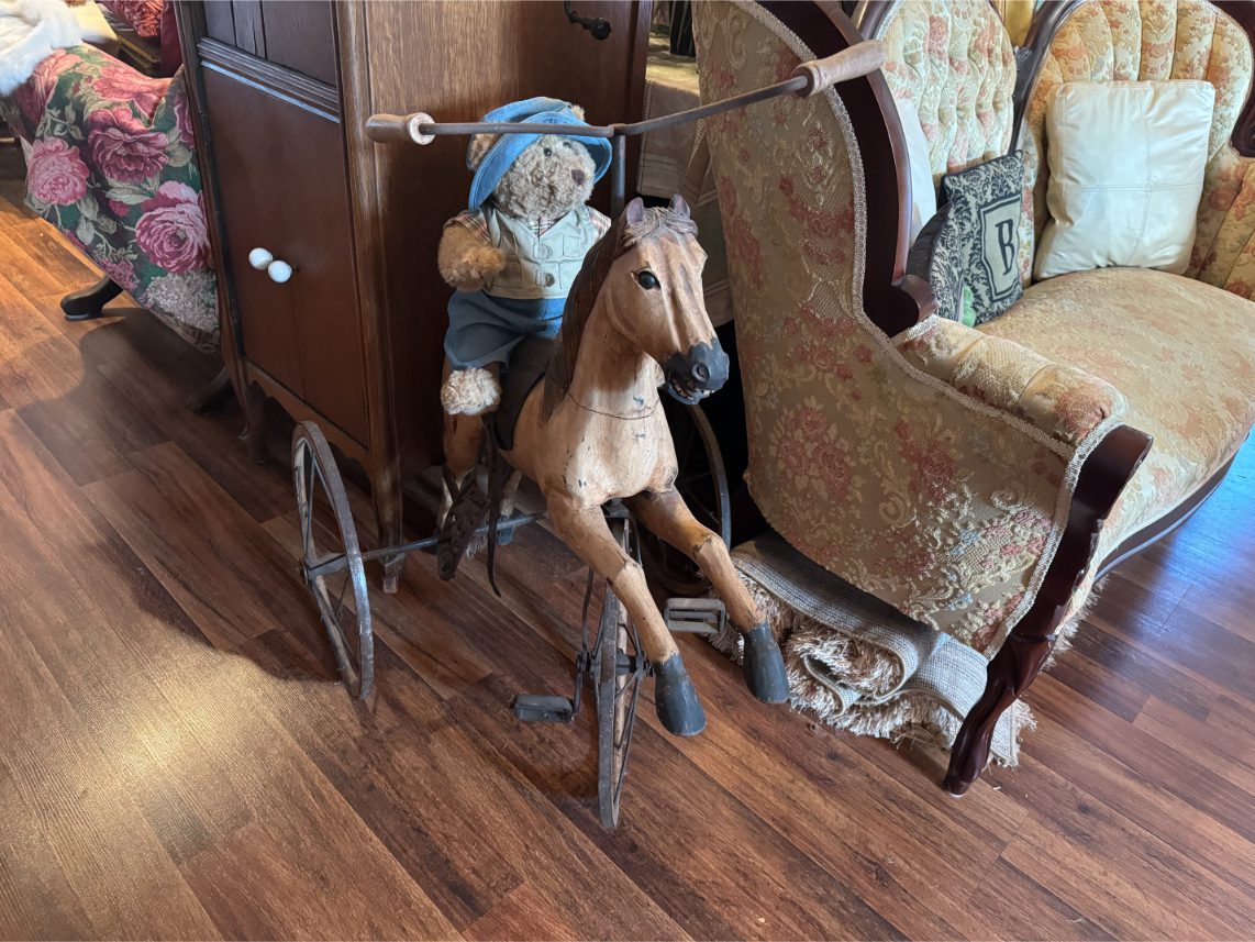 Antiques/Collectibles: Wooden Rocking Horse – Victorian Balloon Back Walnut Chair – Figurines – Arm Chair – Marble-Top Coffee Table – Tiger Oak China Hutch – Mahogany China Hutch – Victorian Children’s Horse Cycle – Victrola – Victorian Sofa – Metal Figurine Lamp – Bird Figurines – Porcelain Umbrella Stands – Pottery – Walnut Parlor Chair – Victorian Side Chairs – Vanity – Desk W/ Marble Bench – Hurricane Lamp – Audiotronics Record Player – Waltham Grandfather Clock – Cast Iron Piano Stool – Trunks – Crib – Wardrobe – Woodstock Typewriter – Treadle Sewing Machine – Chest of Drawers – Kerosine Lamps – Bronze Table Clock – Mt. Gayler Train Schedule Sign – Boston Mountain Resort Assn. Sign – Mt. Gayler Tower Pennant