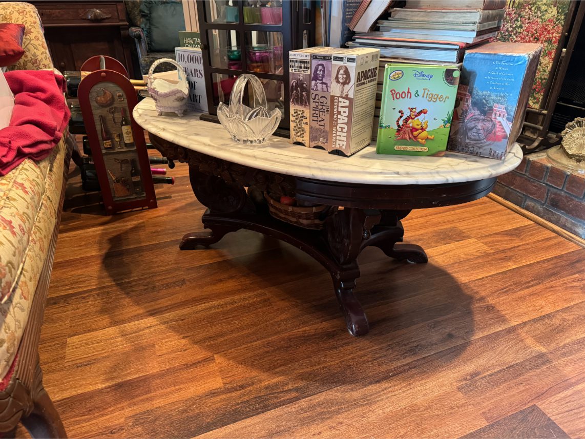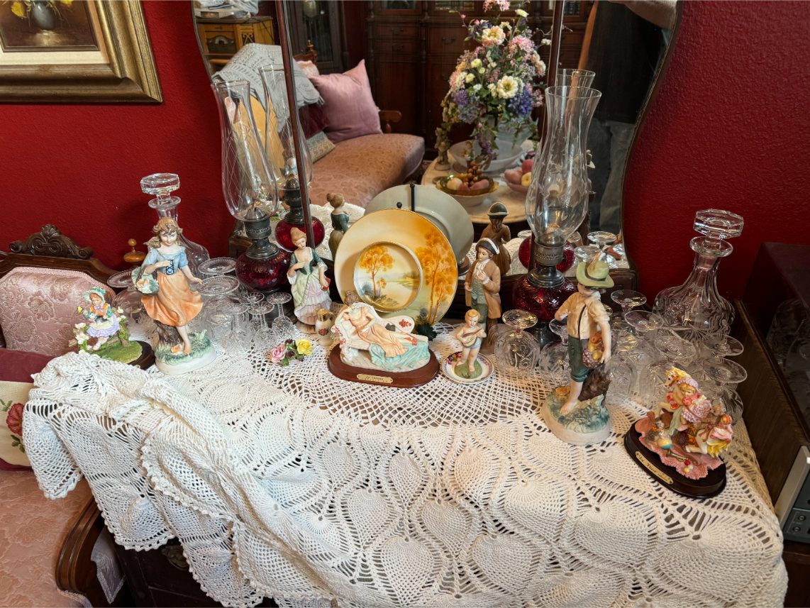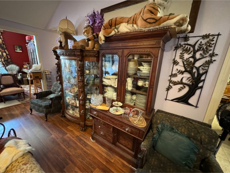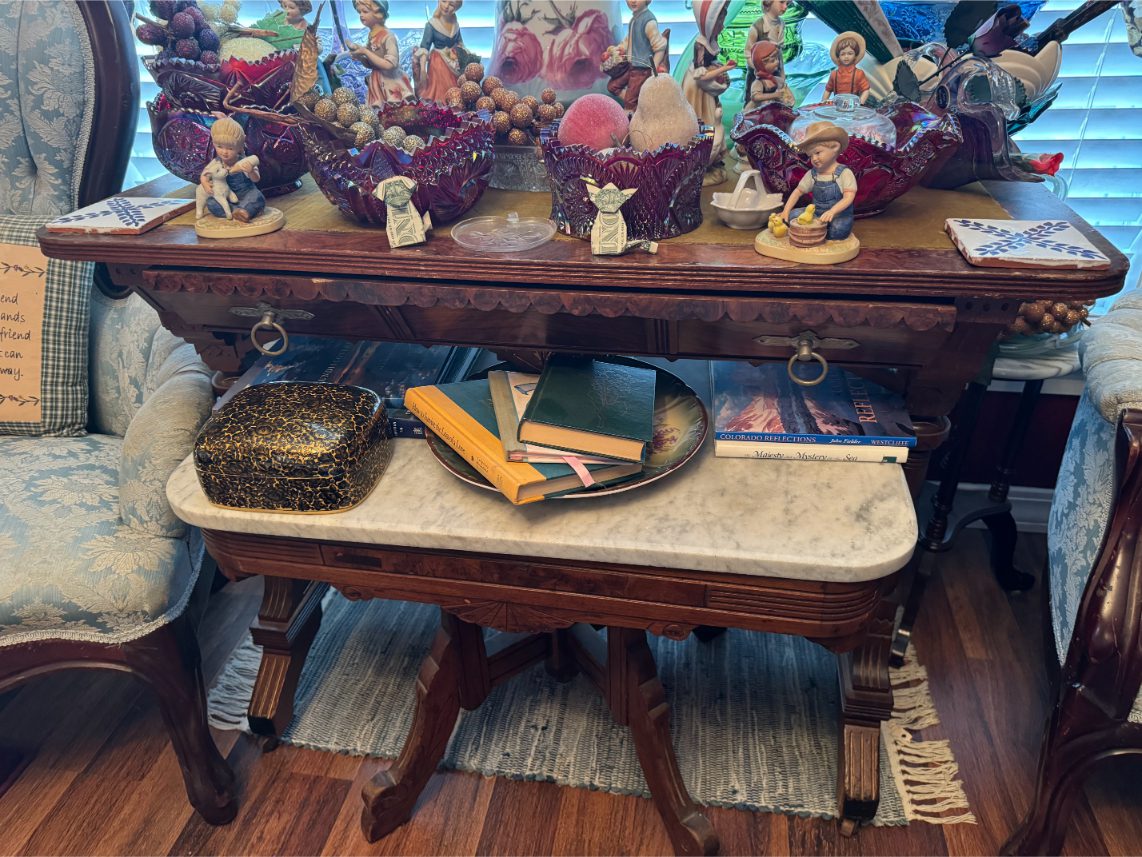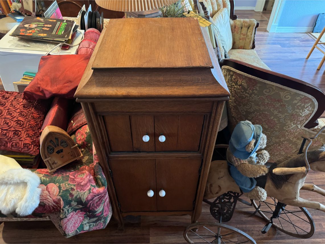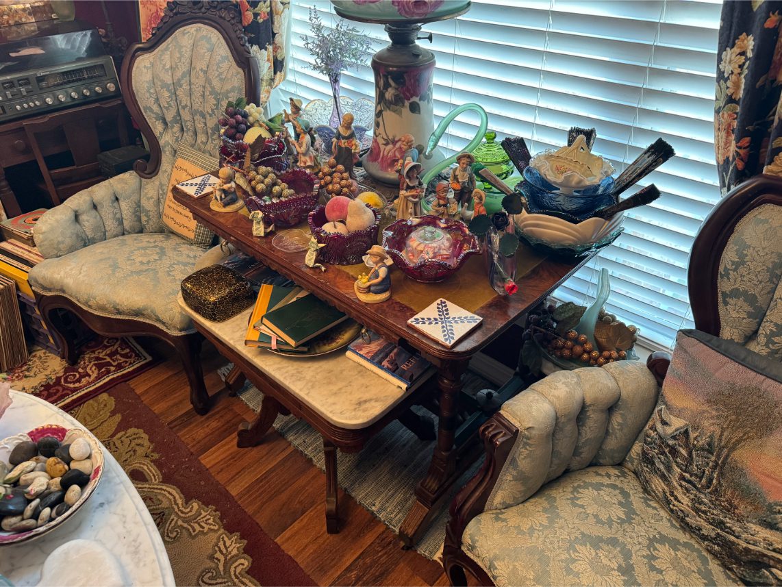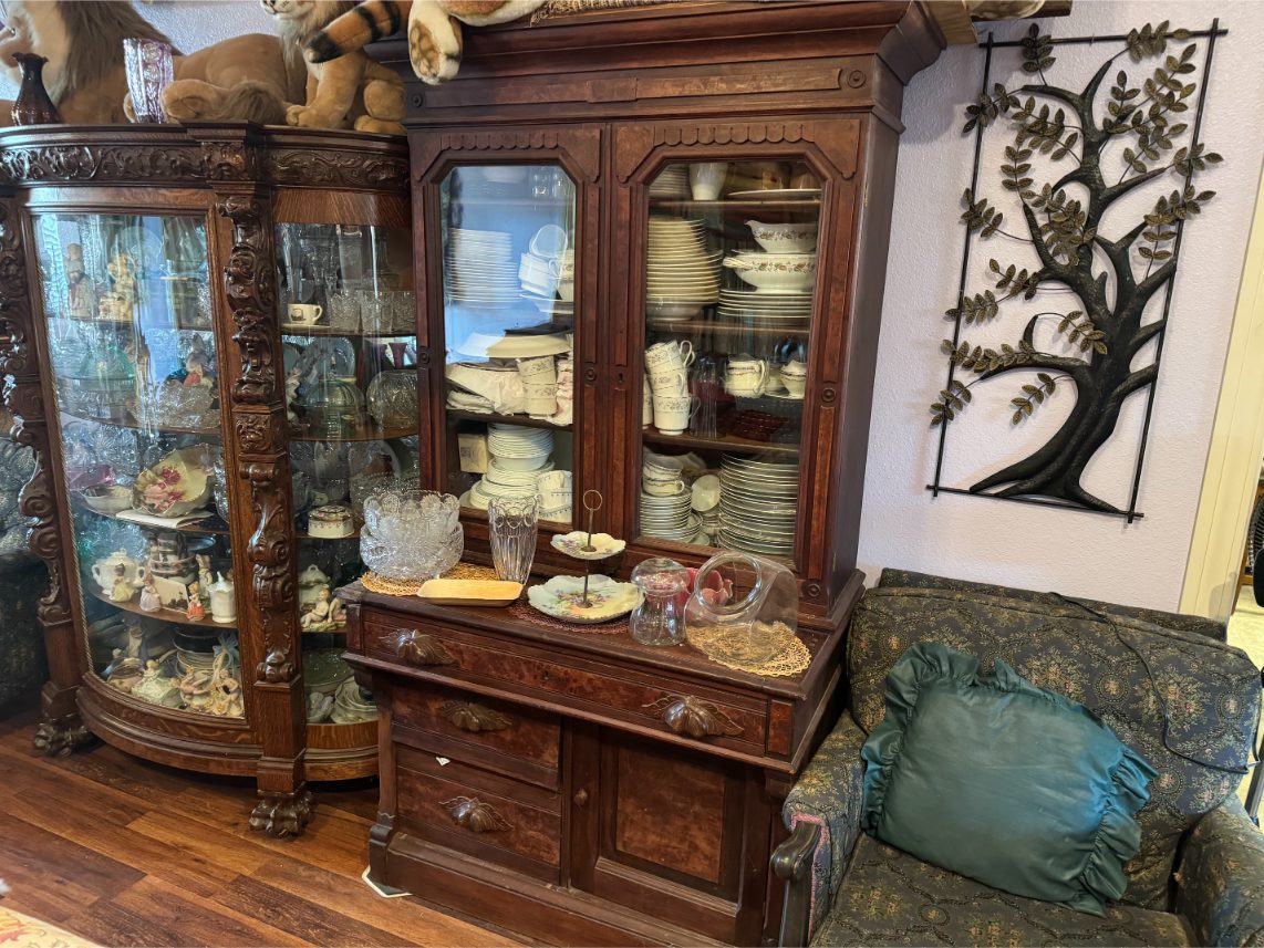 Antiques/Collectibles: Wooden Rocking Horse – Victorian Balloon Back Walnut Chair – Figurines – Arm Chair – Marble-Top Coffee Table – Tiger Oak China Hutch – Mahogany China Hutch – Victorian Children’s Horse Cycle – Victrola – Victorian Sofa – Metal Figurine Lamp – Bird Figurines – Porcelain Umbrella Stands – Pottery – Walnut Parlor Chair – Victorian Side Chairs – Vanity – Desk W/ Marble Bench – Hurricane Lamp – Audiotronics Record Player – Waltham Grandfather Clock – Cast Iron Piano Stool – Trunks – Crib – Wardrobe – Woodstock Typewriter – Treadle Sewing Machine – Chest of Drawers – Kerosine Lamps – Bronze Table Clock – Mt. Gayler Train Schedule Sign – Boston Mountain Resort Assn. Sign – Mt. Gayler Tower Pennant