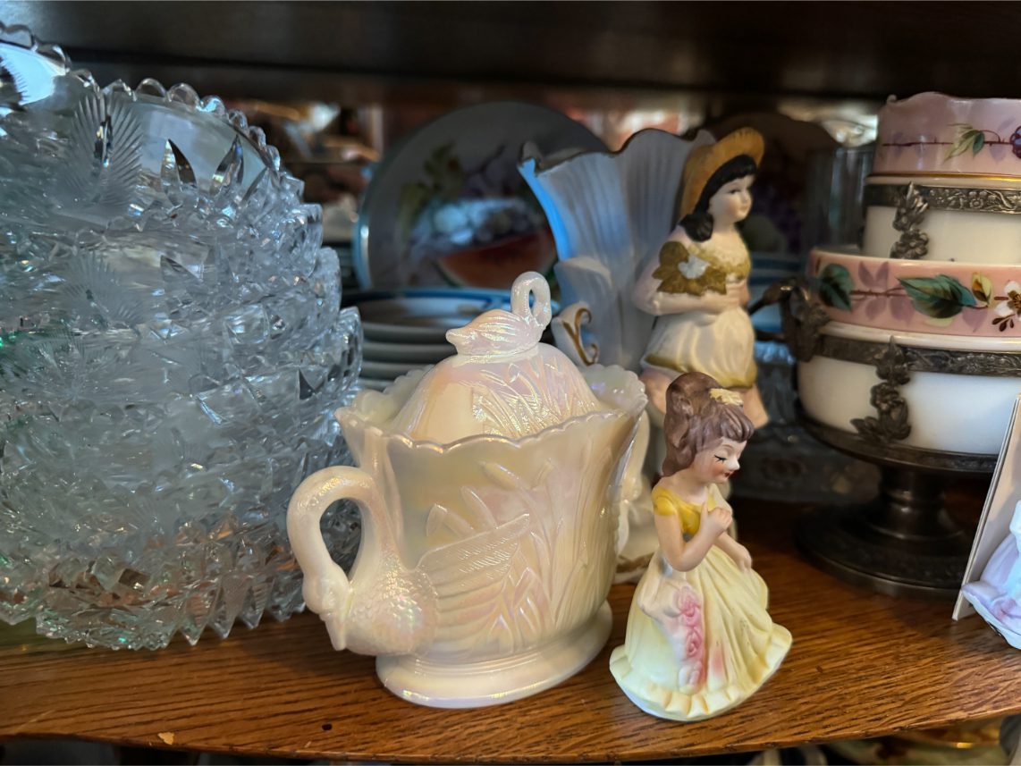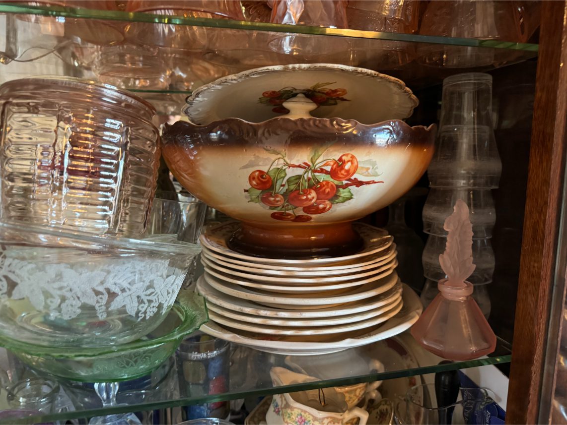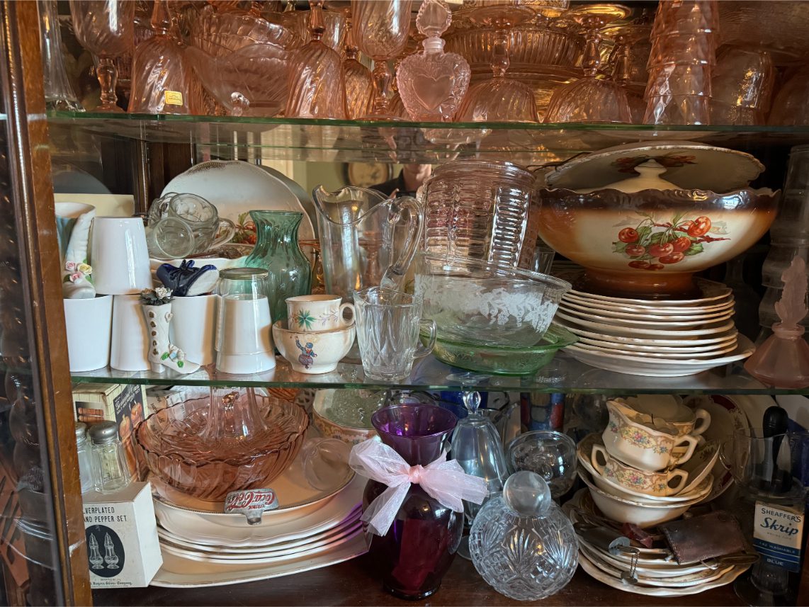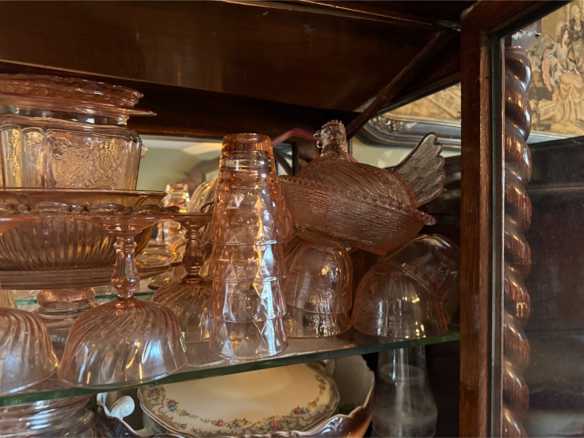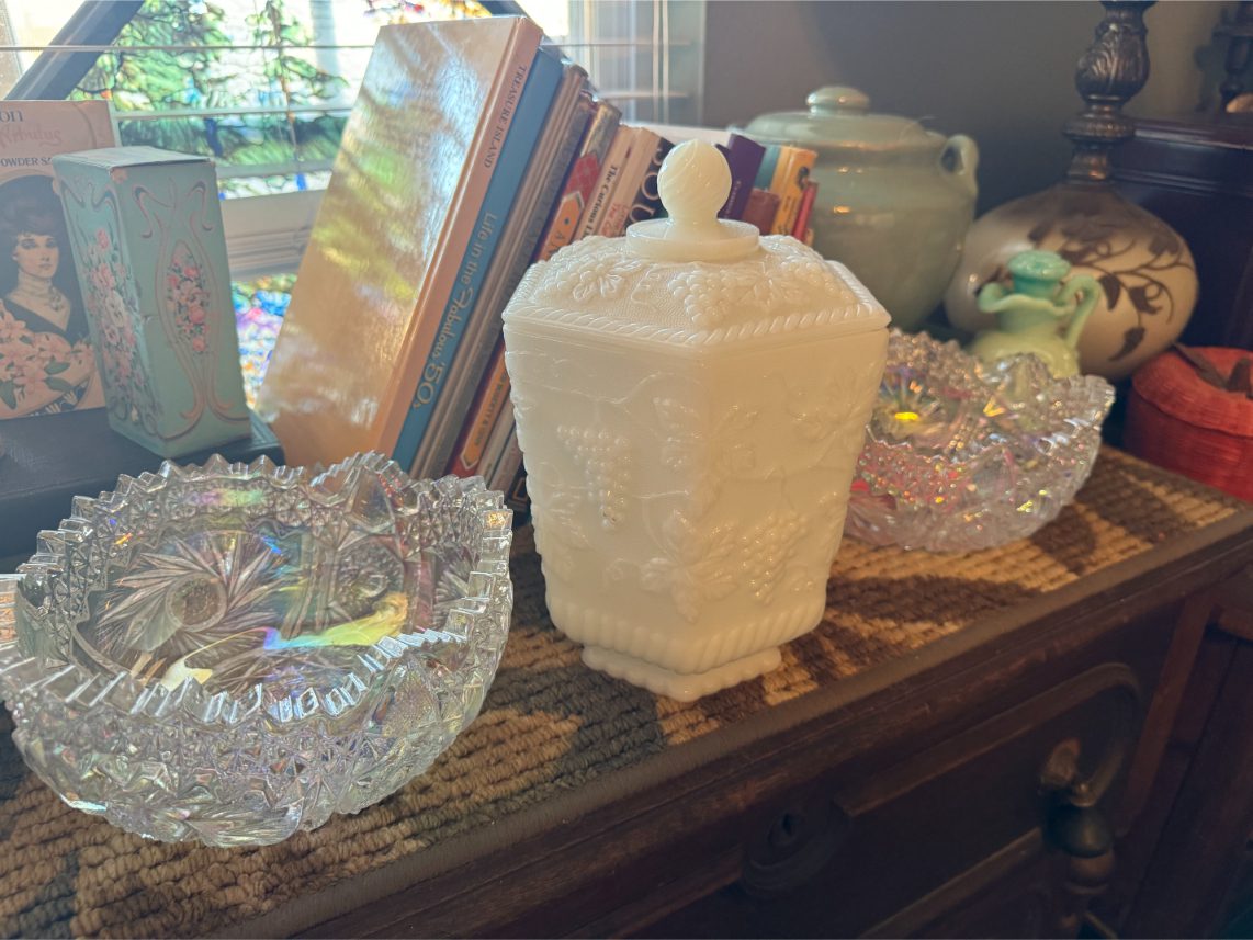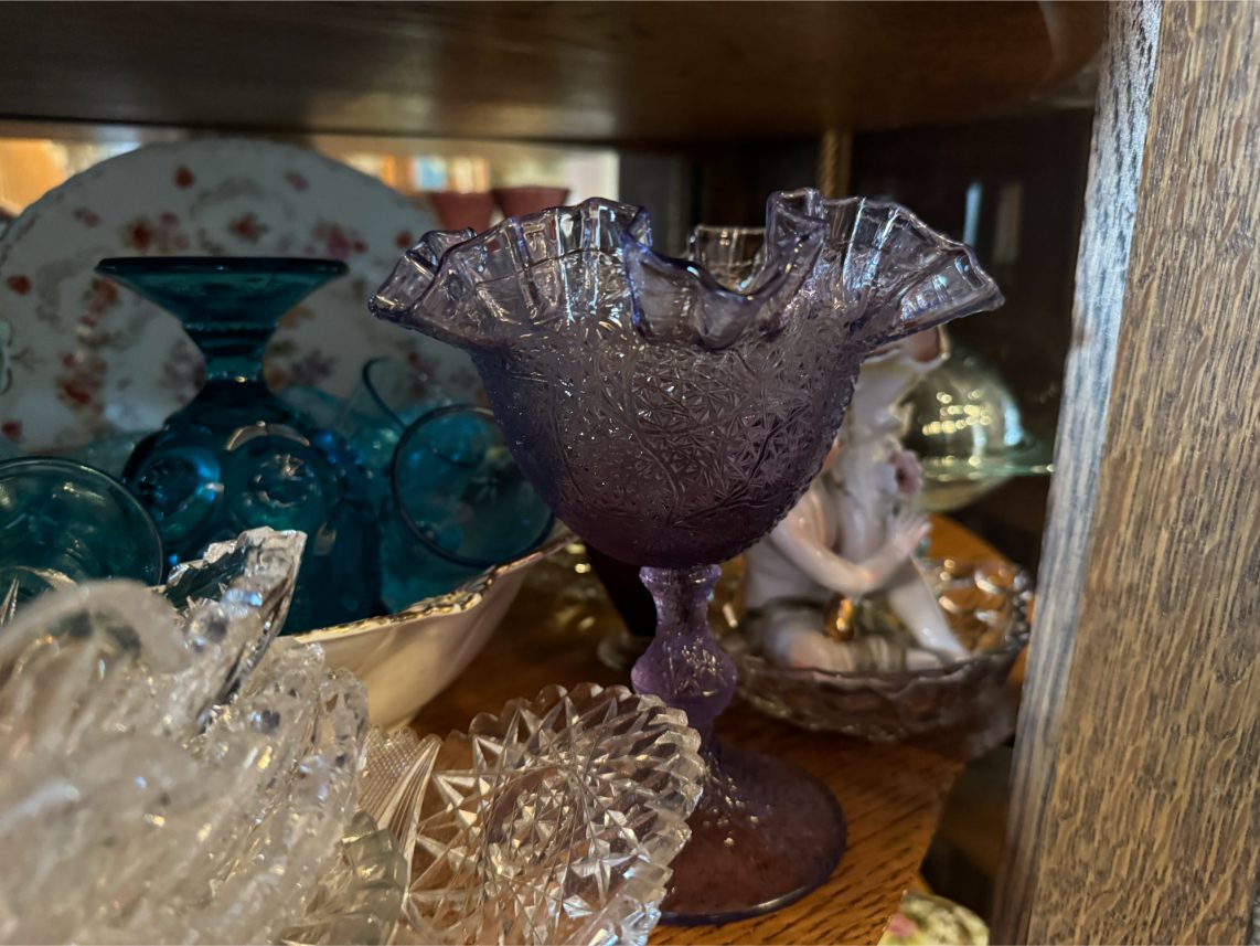 Glassware: Serving Dishes – Wine Glasses – Pitchers – Amber Glass – Fenton – Porcelain Honeypot – Dresden Pitcher – Wedding Vases – Corelle Snowflake Glasses – Crystal Bowls – Rosaline Crystal – Fenton Lavender Wisteria Tree of Life Compote – Depression – Avon Glasses – Ruby Red Glasses – Carnival Glass – Nippon Pink Roses Tea Set – Fenton Bells – Limoge Punch Bowls – CorningwareÂ
