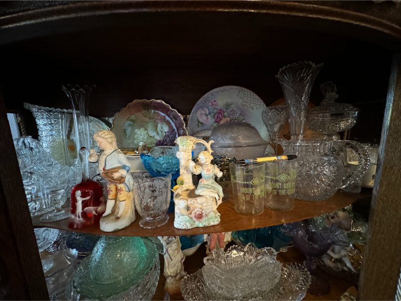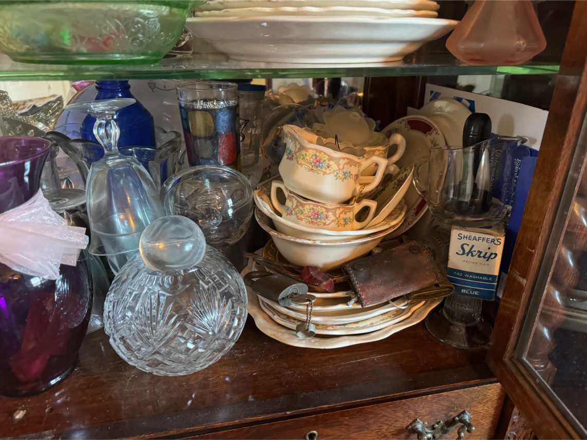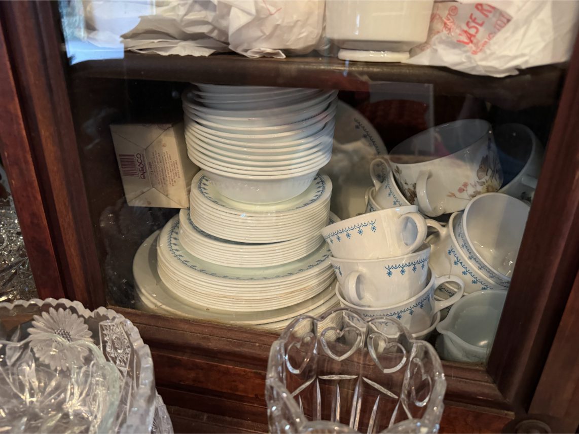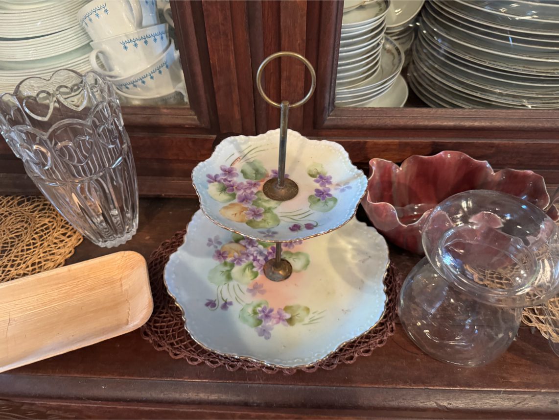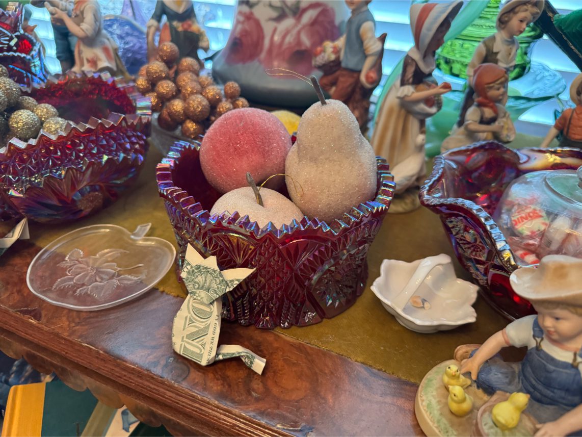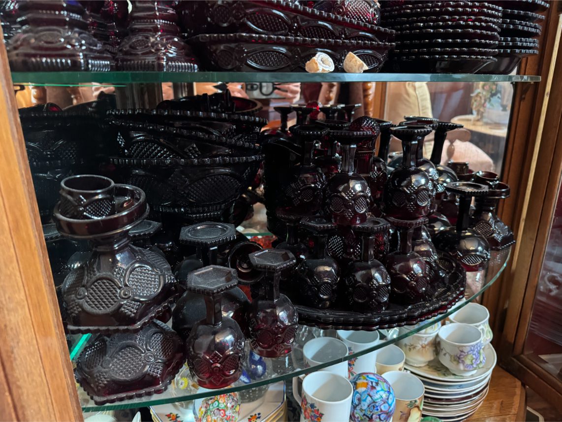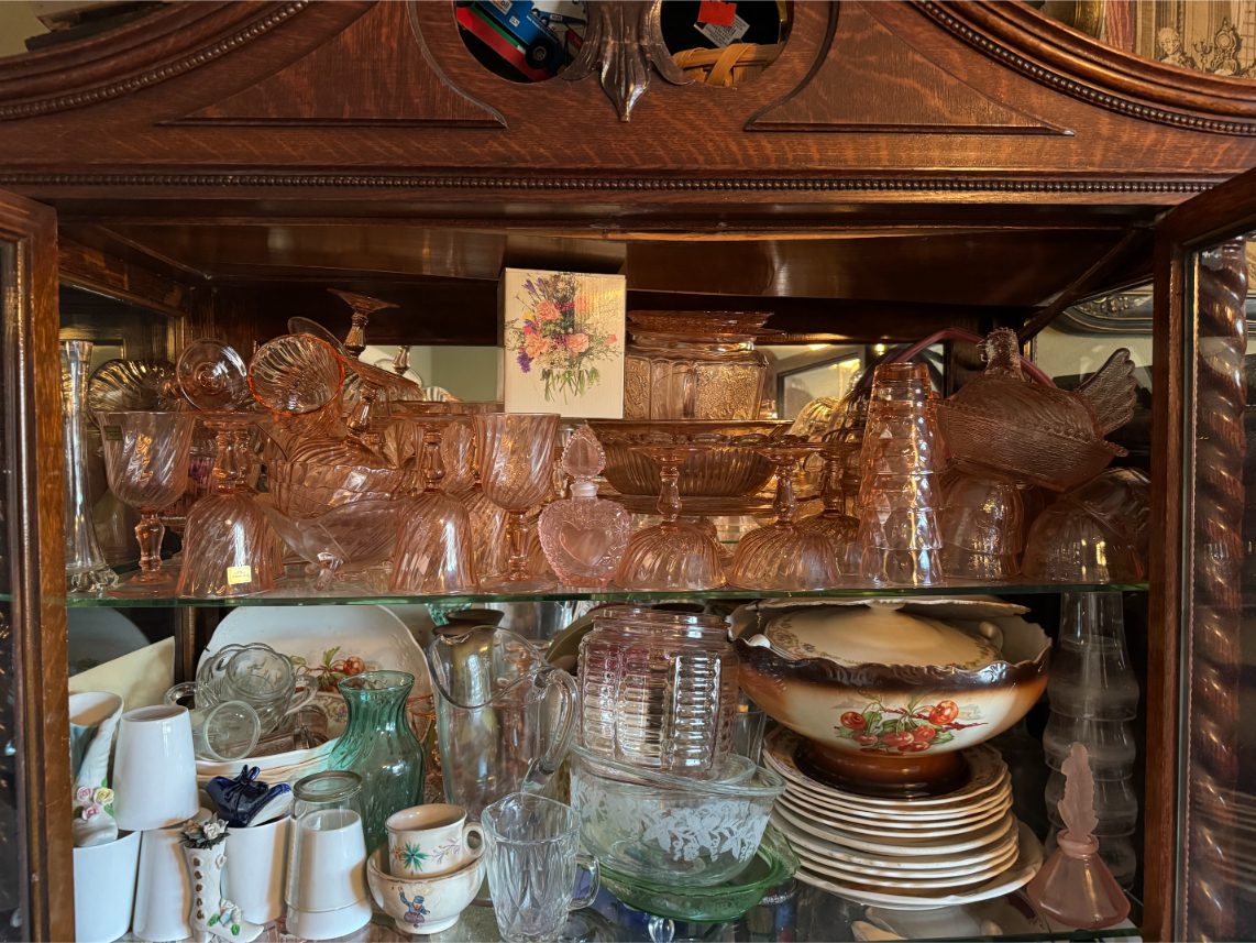 Glassware: Serving Dishes – Wine Glasses – Pitchers – Amber Glass – Fenton – Porcelain Honeypot – Dresden Pitcher – Wedding Vases – Corelle Snowflake Glasses – Crystal Bowls – Rosaline Crystal – Fenton Lavender Wisteria Tree of Life Compote – Depression – Avon Glasses – Ruby Red Glasses – Carnival Glass – Nippon Pink Roses Tea Set – Fenton Bells – Limoge Punch Bowls – CorningwareÂ