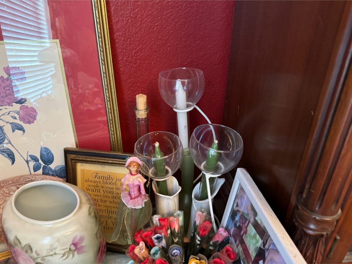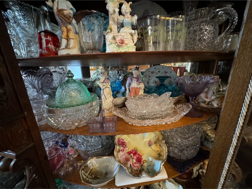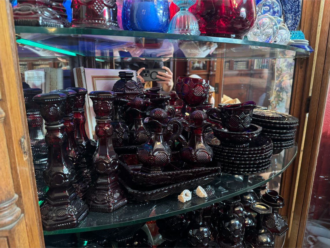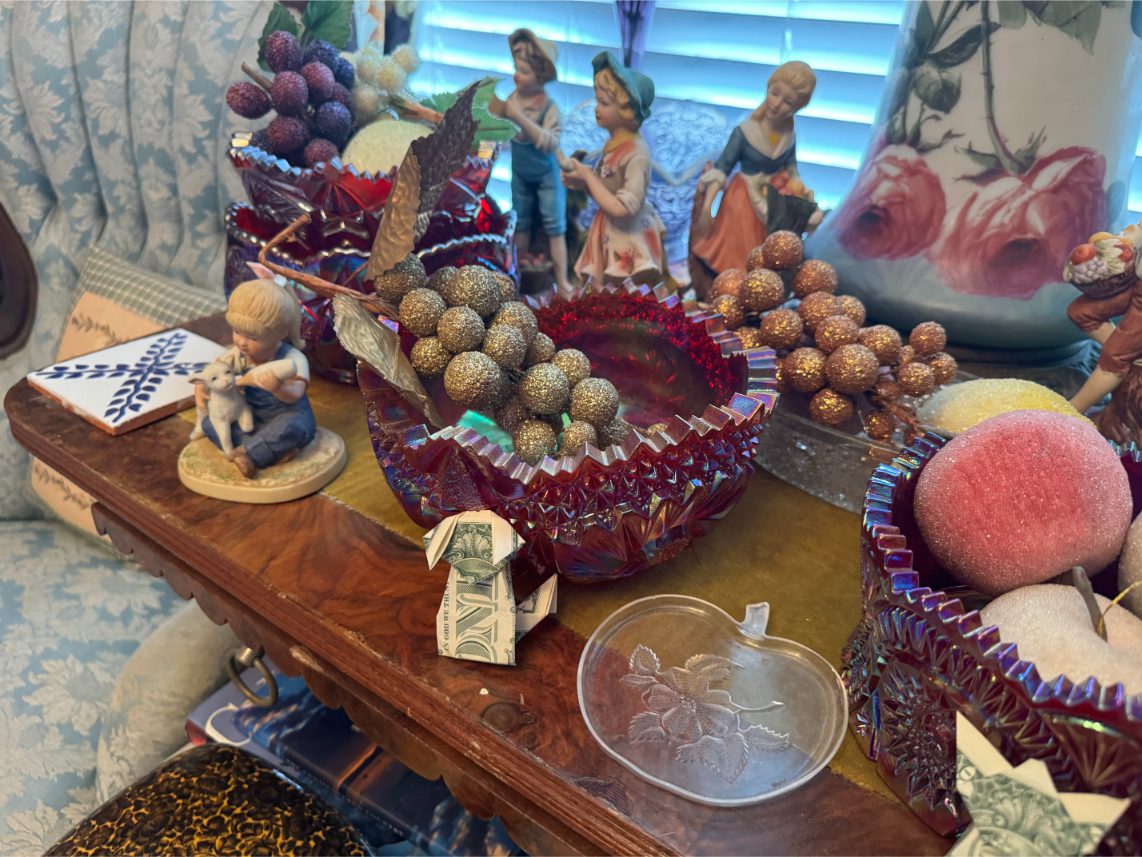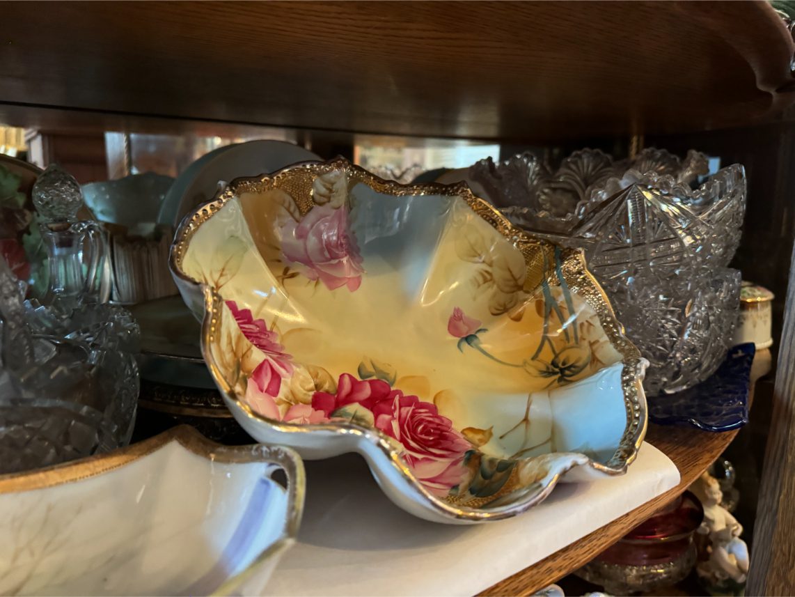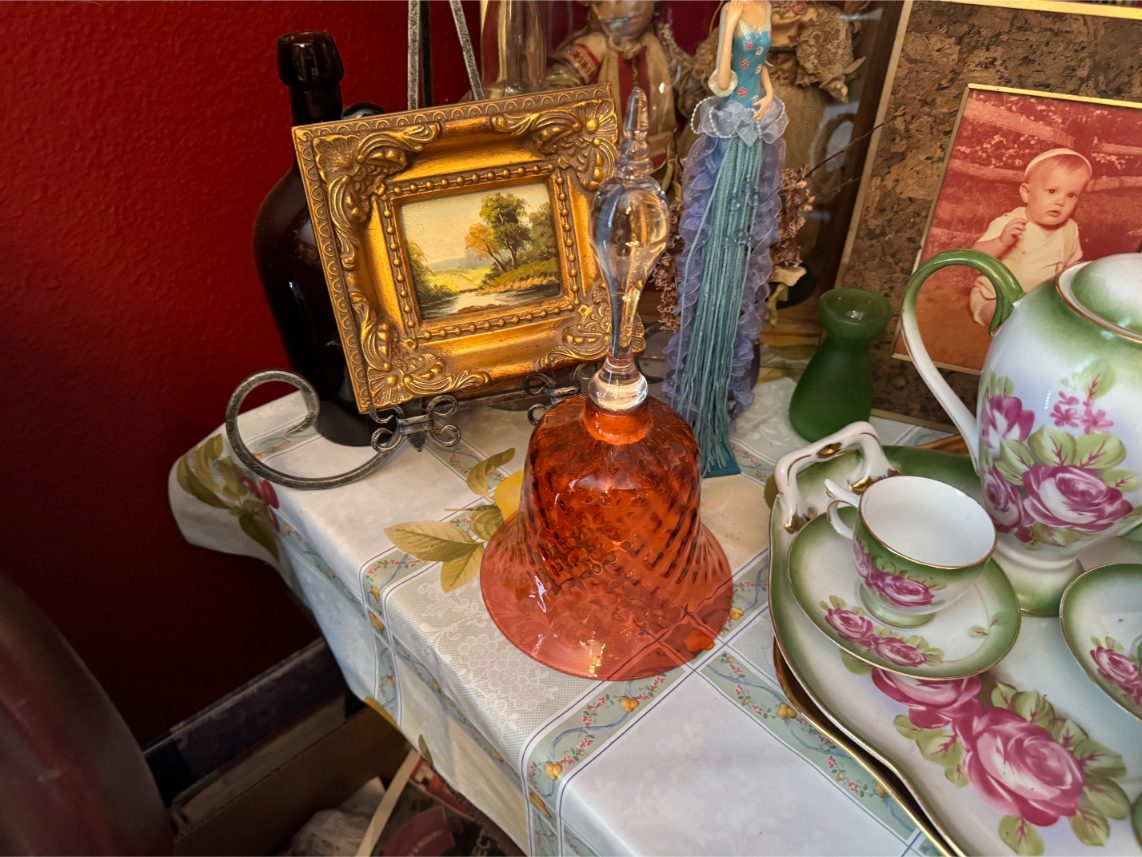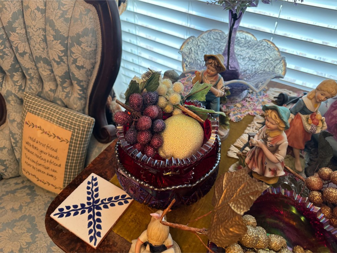 Glassware: Serving Dishes – Wine Glasses – Pitchers – Amber Glass – Fenton – Porcelain Honeypot – Dresden Pitcher – Wedding Vases – Corelle Snowflake Glasses – Crystal Bowls – Rosaline Crystal – Fenton Lavender Wisteria Tree of Life Compote – Depression – Avon Glasses – Ruby Red Glasses – Carnival Glass – Nippon Pink Roses Tea Set – Fenton Bells – Limoge Punch Bowls – CorningwareÂ