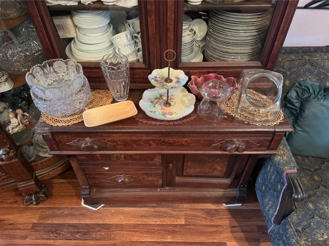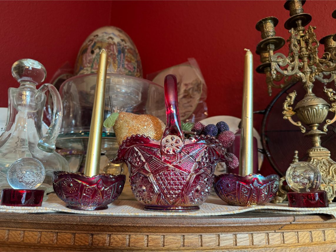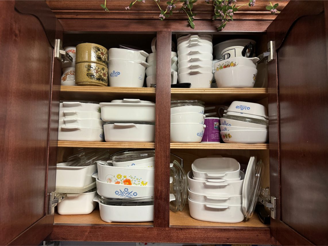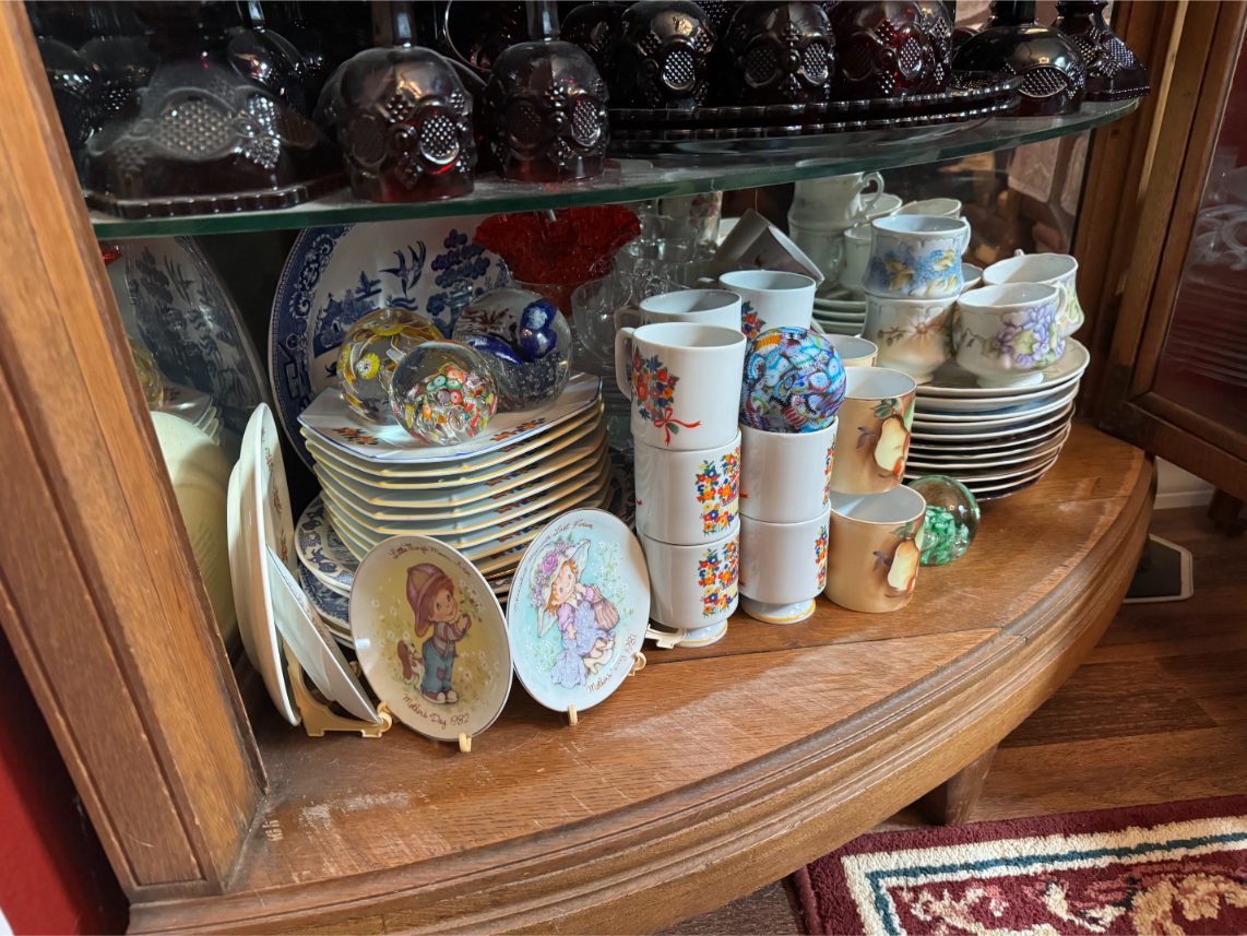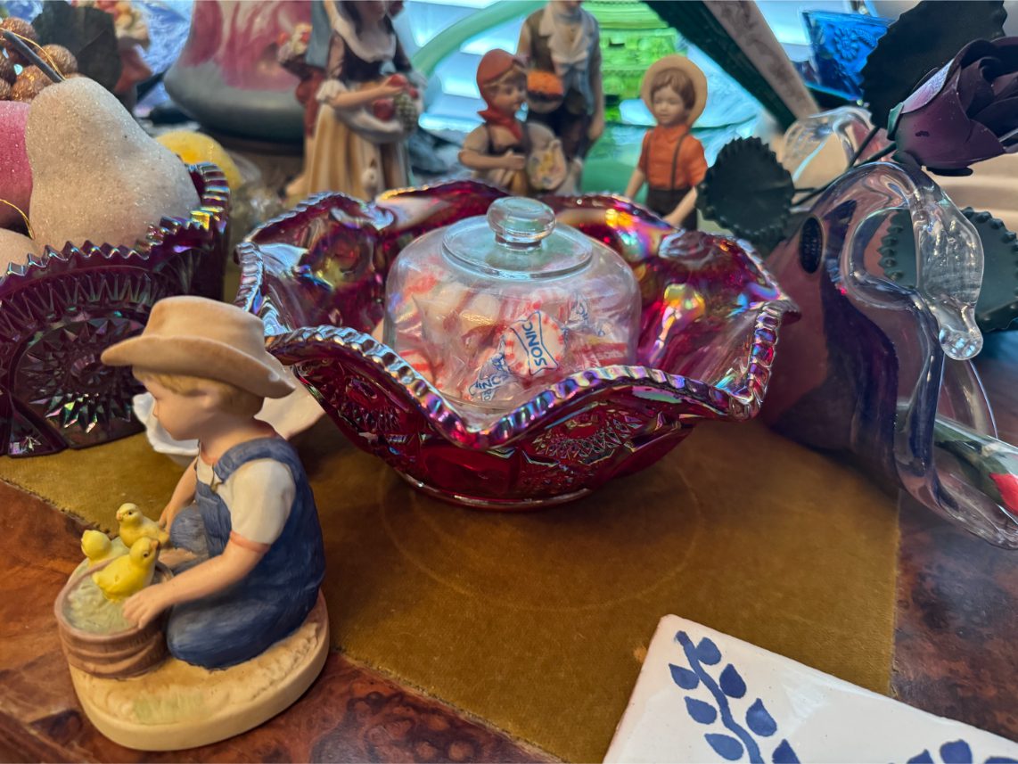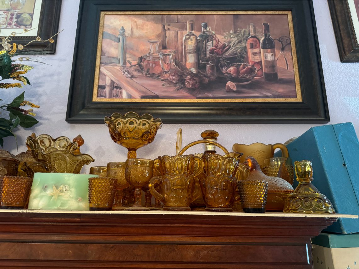 Glassware: Serving Dishes – Wine Glasses – Pitchers – Amber Glass – Fenton – Porcelain Honeypot – Dresden Pitcher – Wedding Vases – Corelle Snowflake Glasses – Crystal Bowls – Rosaline Crystal – Fenton Lavender Wisteria Tree of Life Compote – Depression – Avon Glasses – Ruby Red Glasses – Carnival Glass – Nippon Pink Roses Tea Set – Fenton Bells – Limoge Punch Bowls – CorningwareÂ