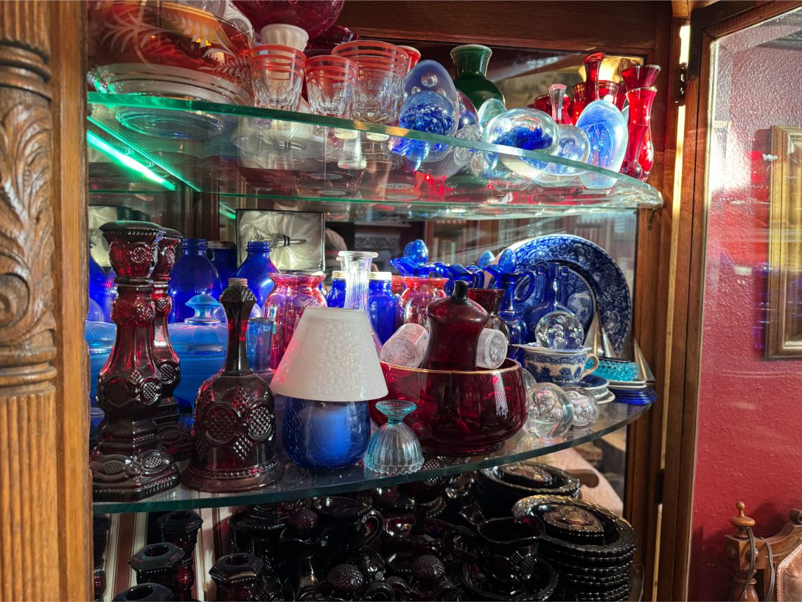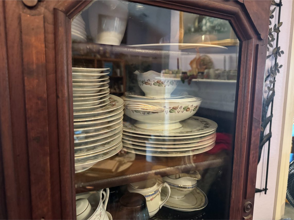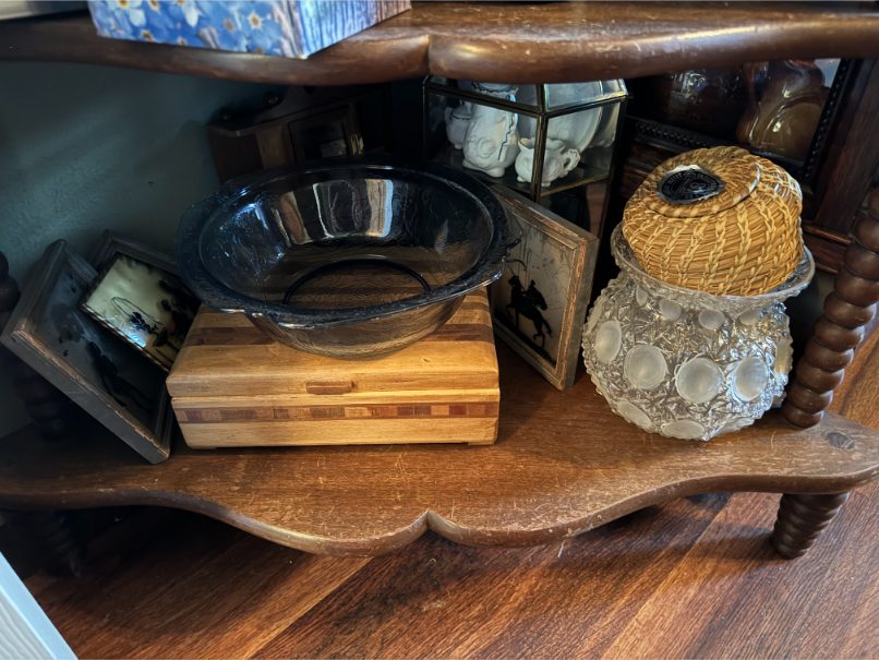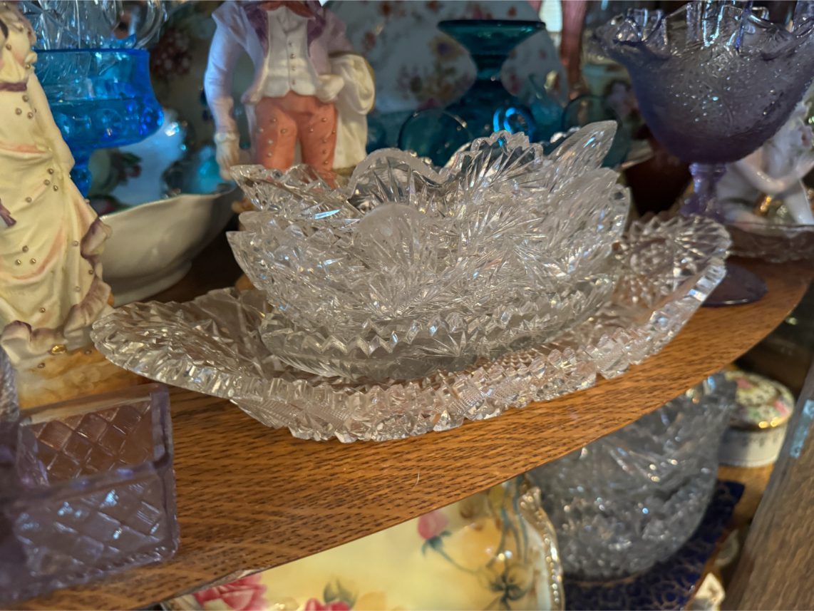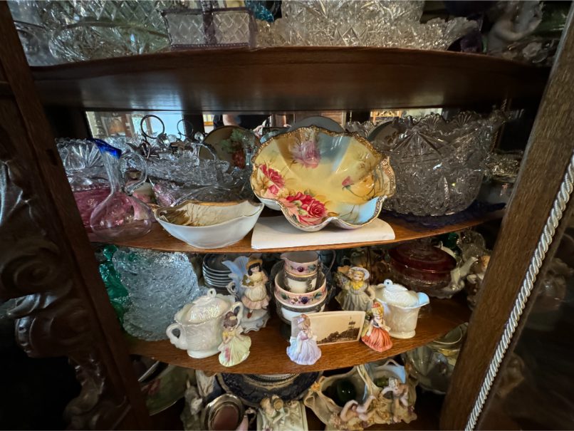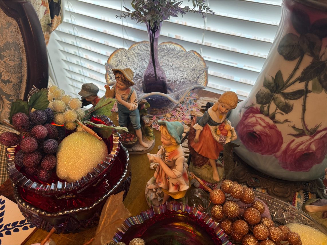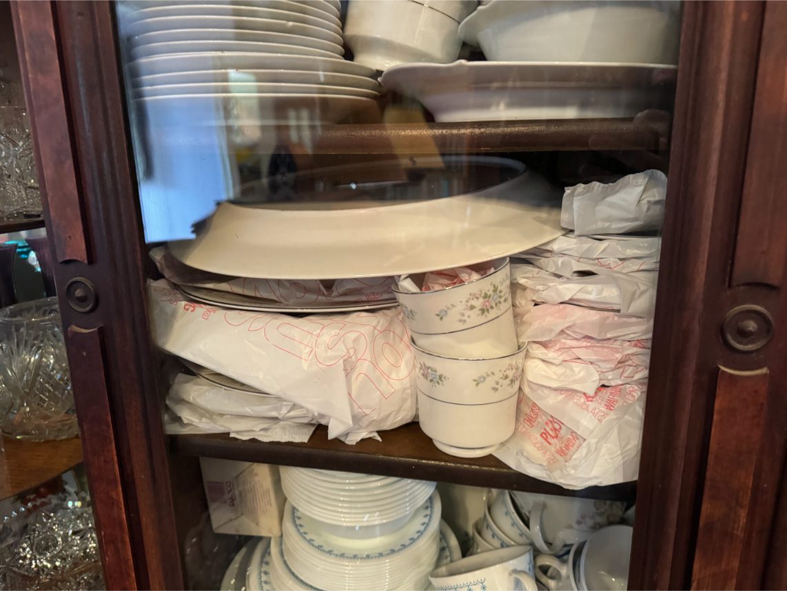 Glassware: Serving Dishes – Wine Glasses – Pitchers – Amber Glass – Fenton – Porcelain Honeypot – Dresden Pitcher – Wedding Vases – Corelle Snowflake Glasses – Crystal Bowls – Rosaline Crystal – Fenton Lavender Wisteria Tree of Life Compote – Depression – Avon Glasses – Ruby Red Glasses – Carnival Glass – Nippon Pink Roses Tea Set – Fenton Bells – Limoge Punch Bowls – CorningwareÂ