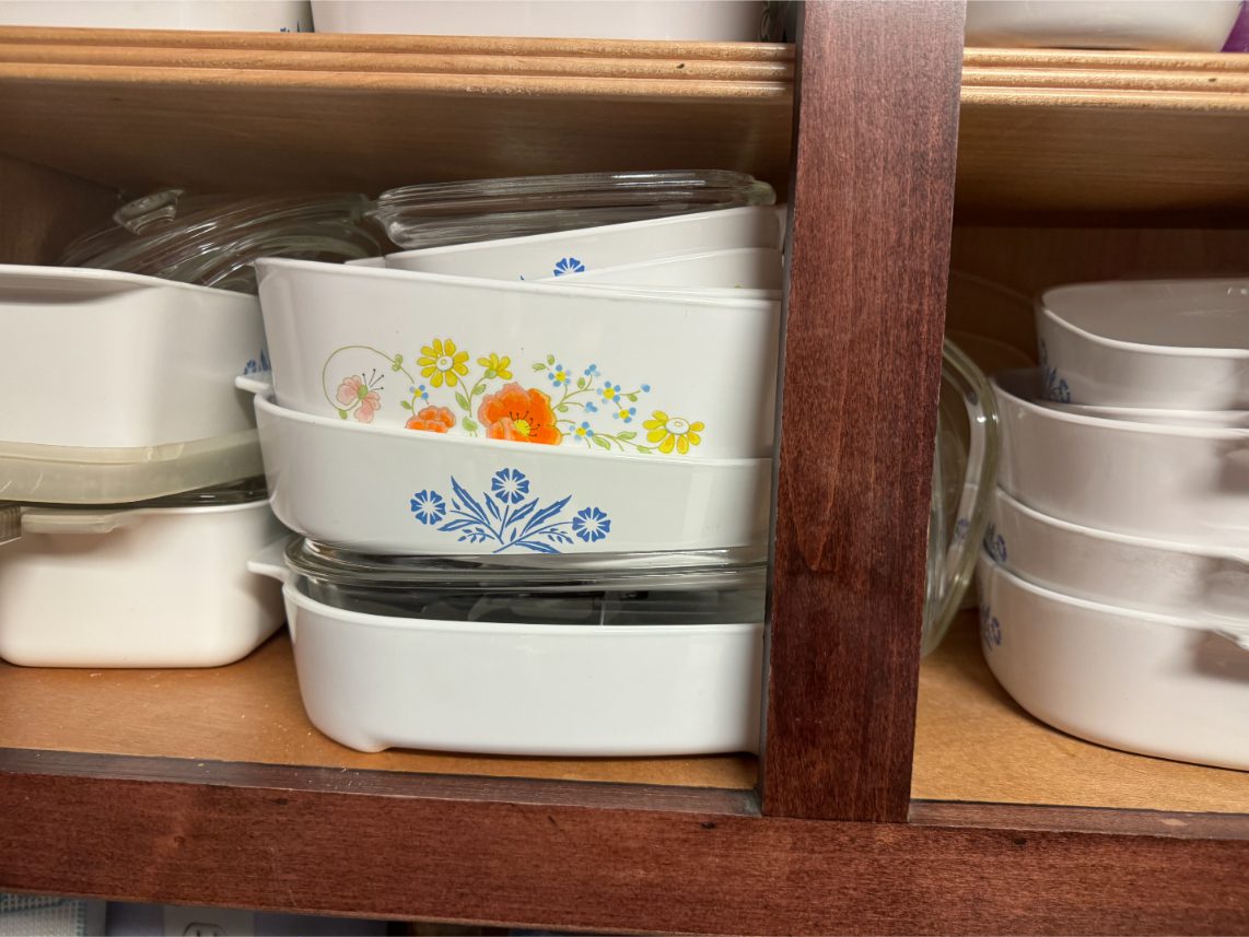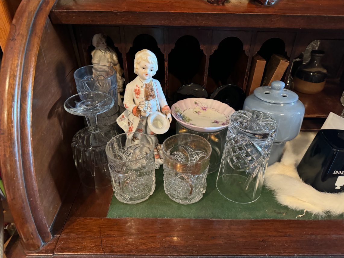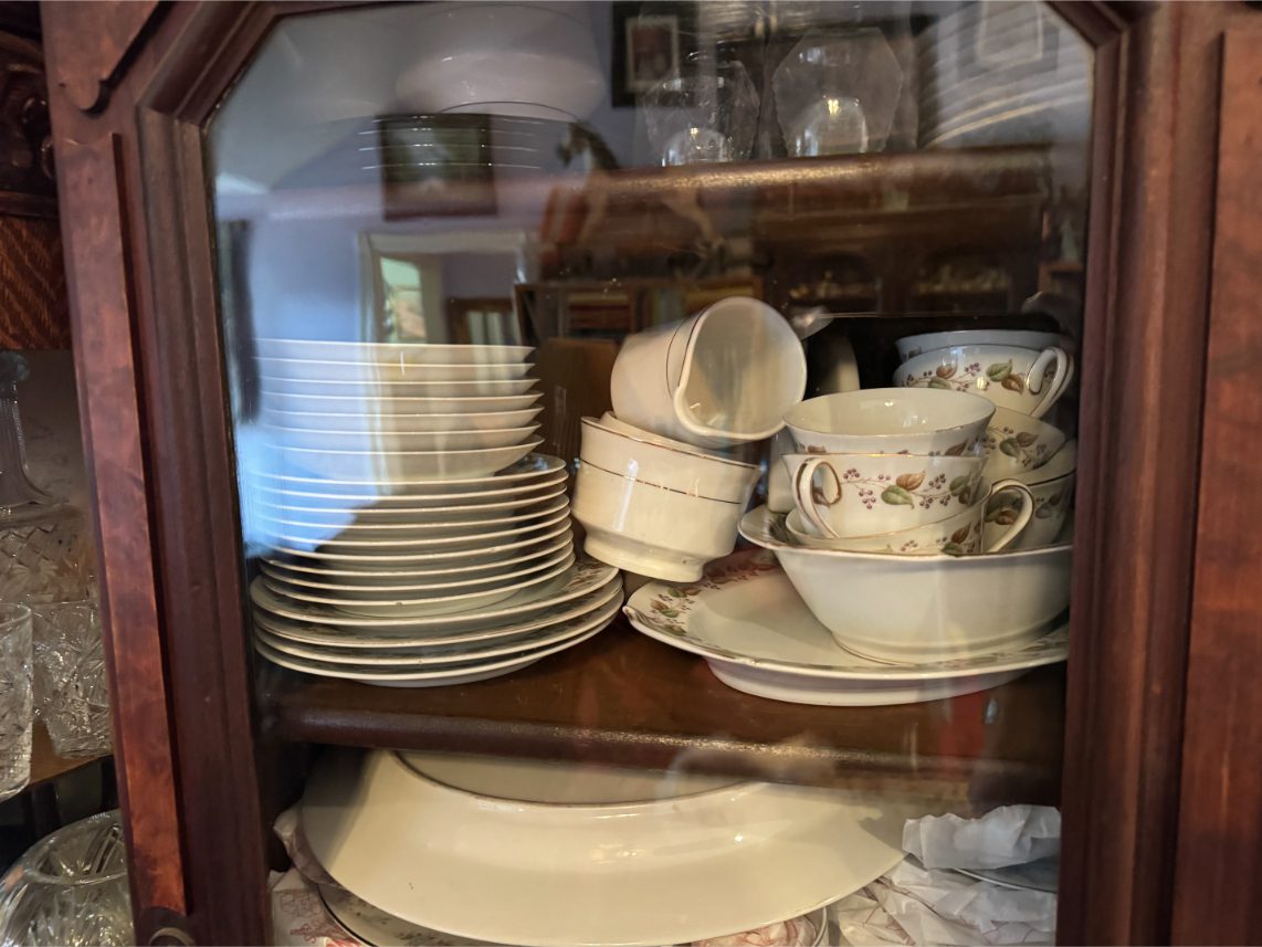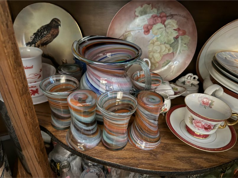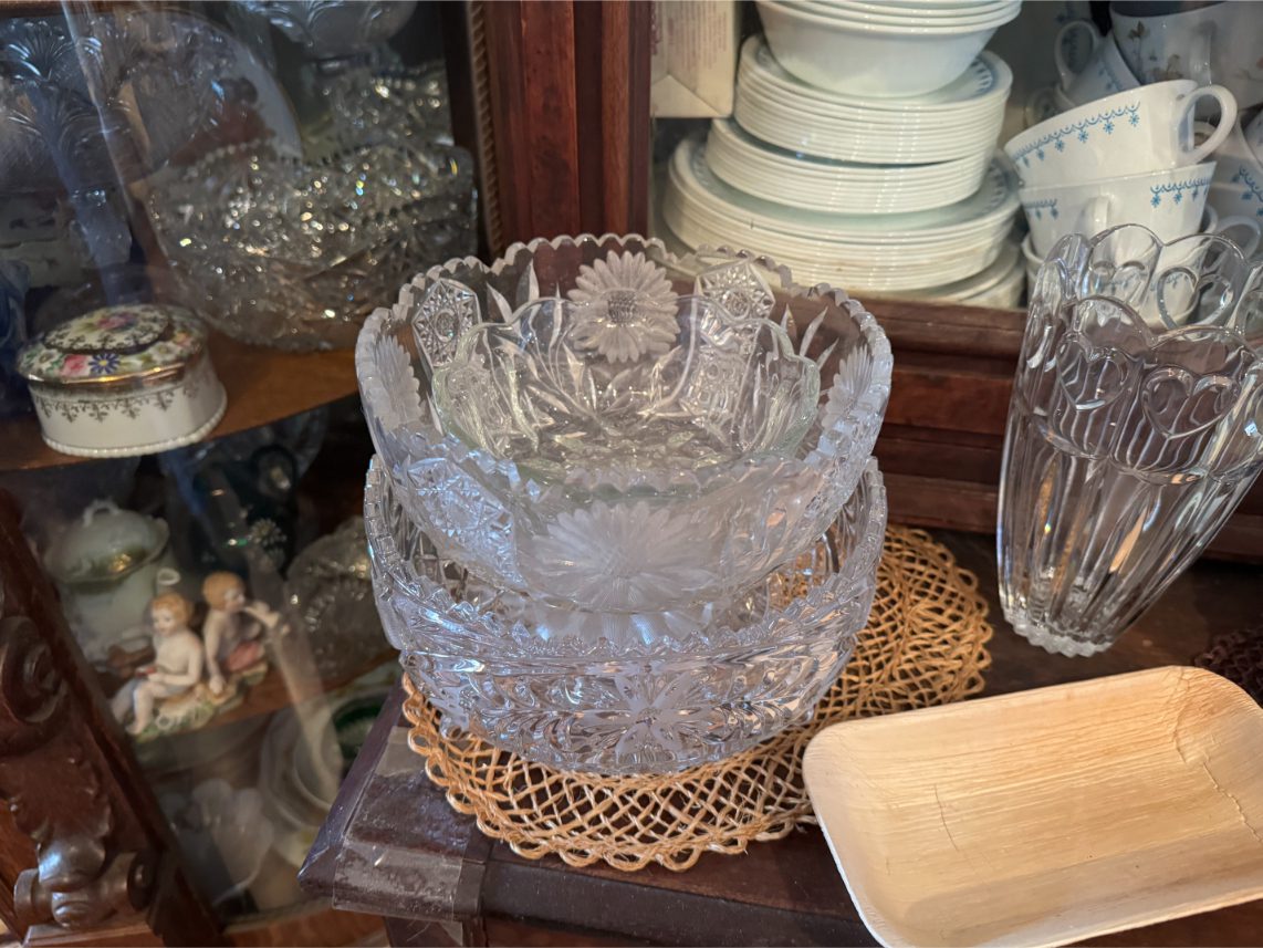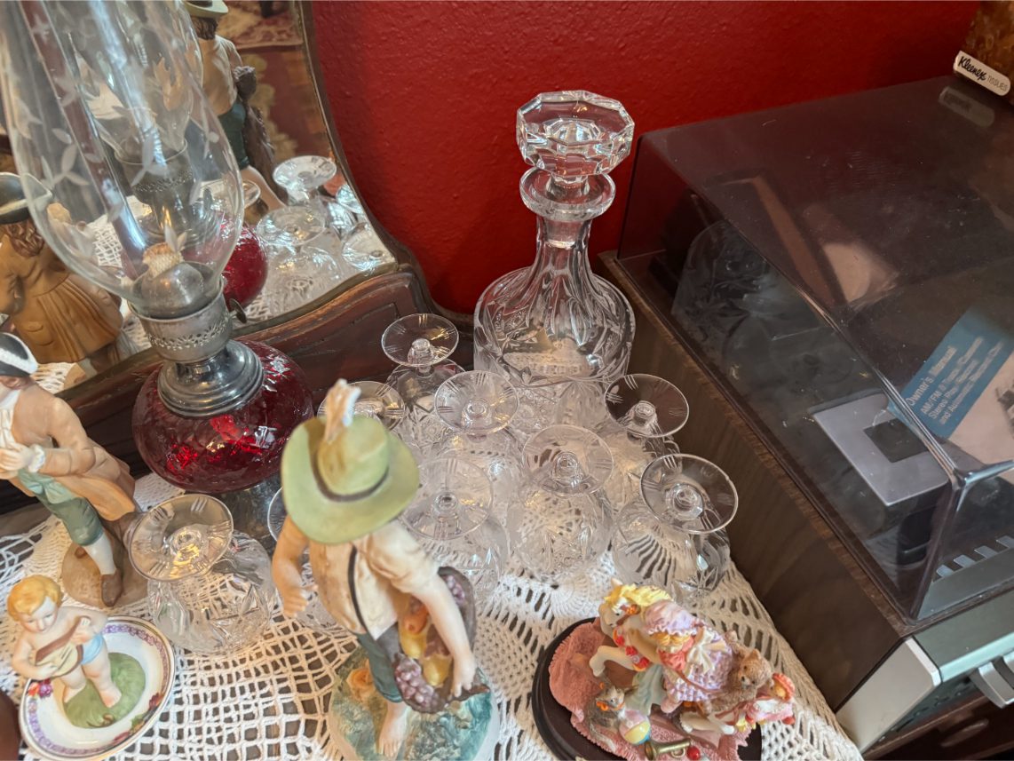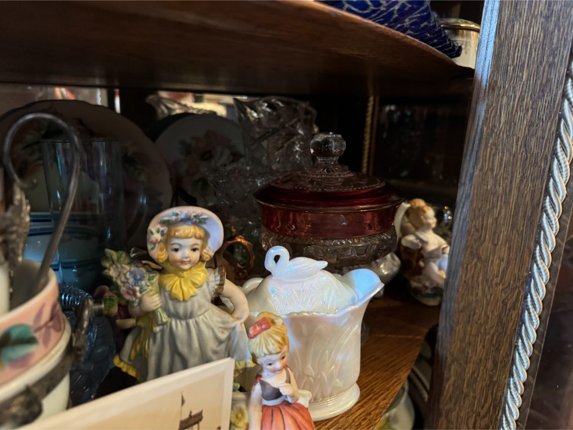 Glassware: Serving Dishes – Wine Glasses – Pitchers – Amber Glass – Fenton – Porcelain Honeypot – Dresden Pitcher – Wedding Vases – Corelle Snowflake Glasses – Crystal Bowls – Rosaline Crystal – Fenton Lavender Wisteria Tree of Life Compote – Depression – Avon Glasses – Ruby Red Glasses – Carnival Glass – Nippon Pink Roses Tea Set – Fenton Bells – Limoge Punch Bowls – CorningwareÂ