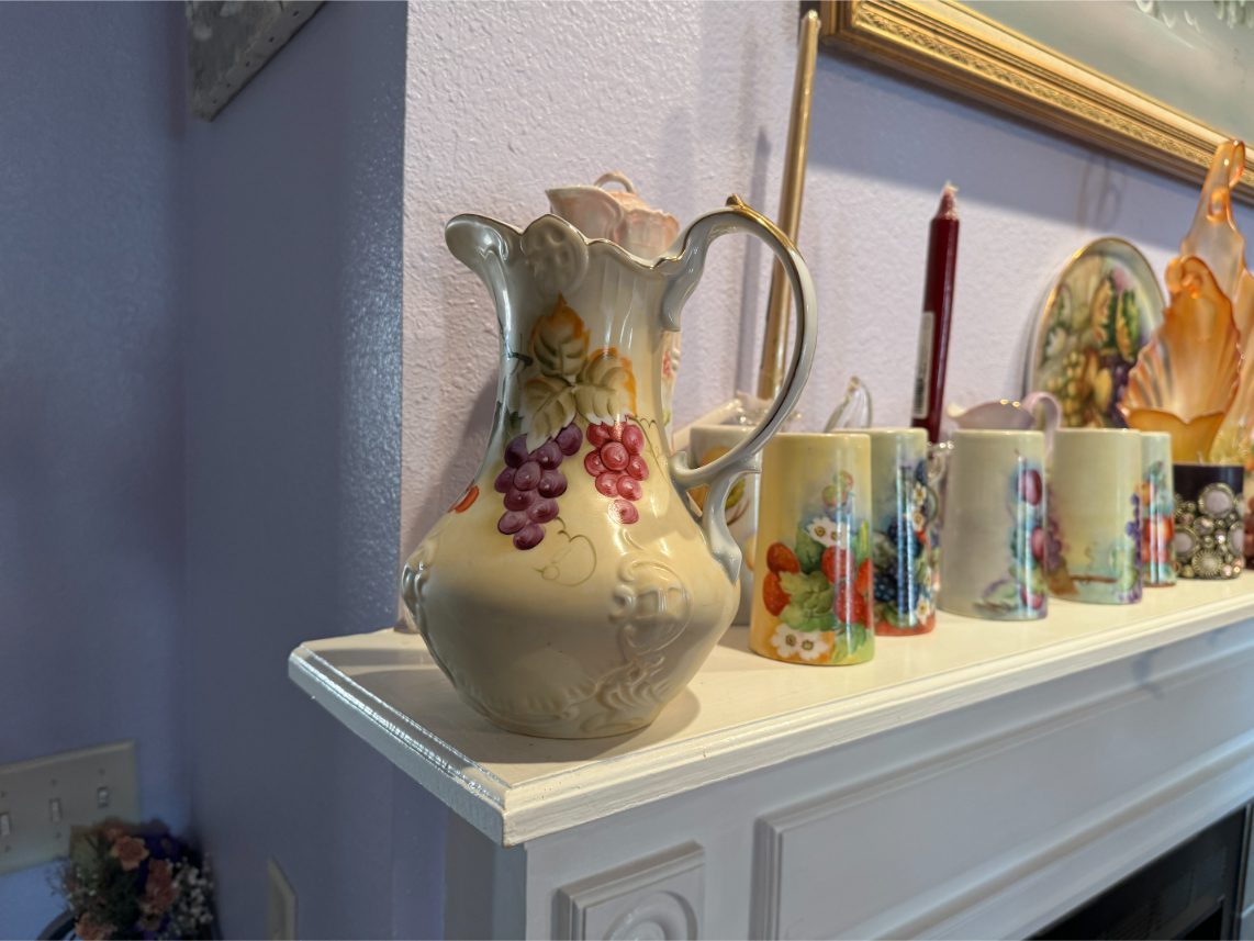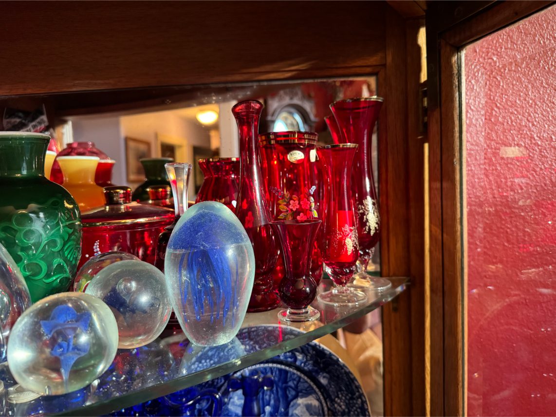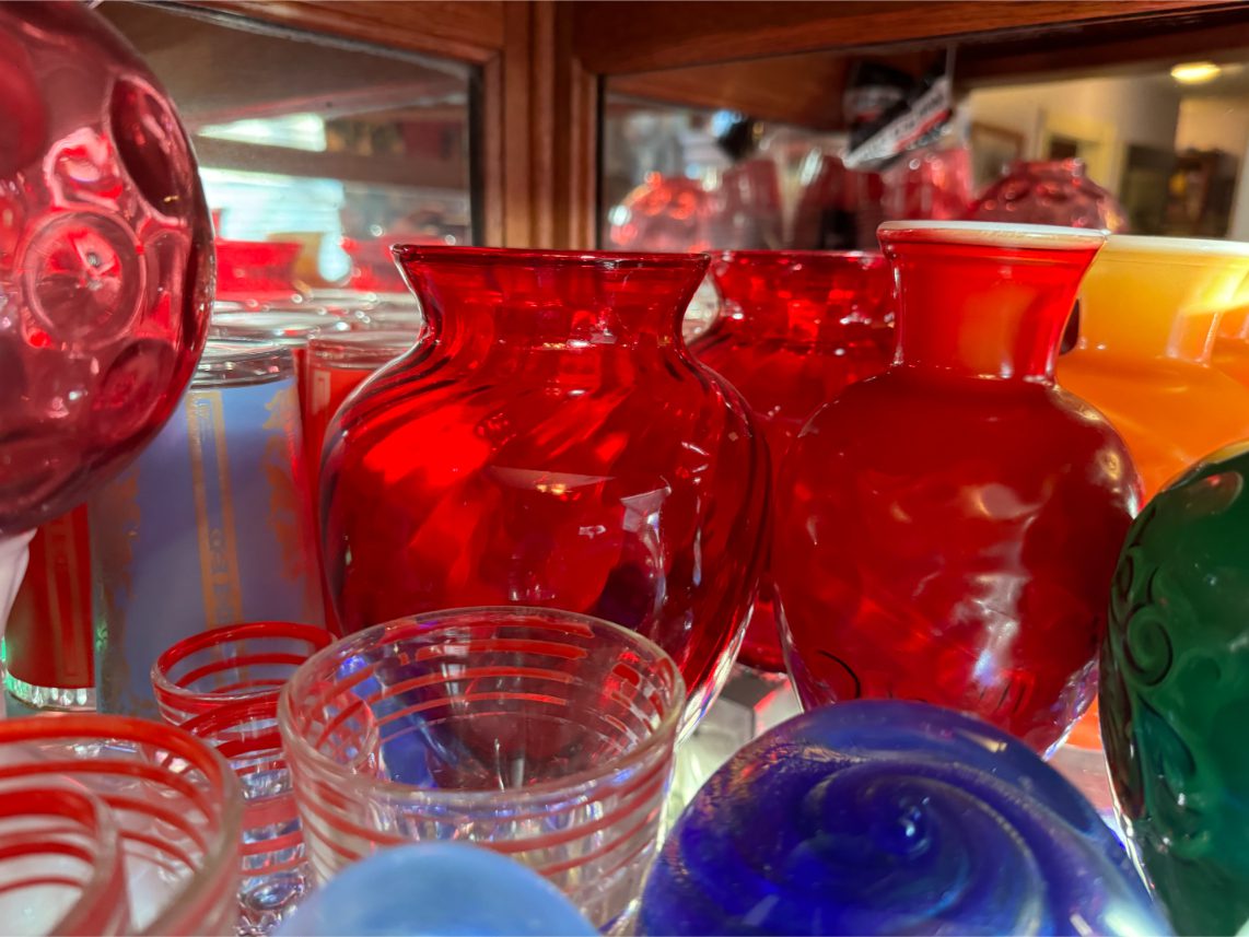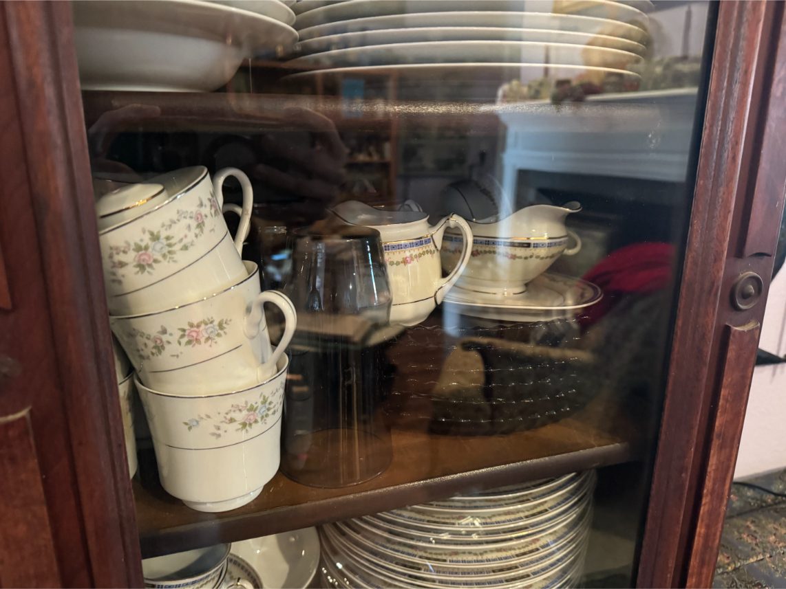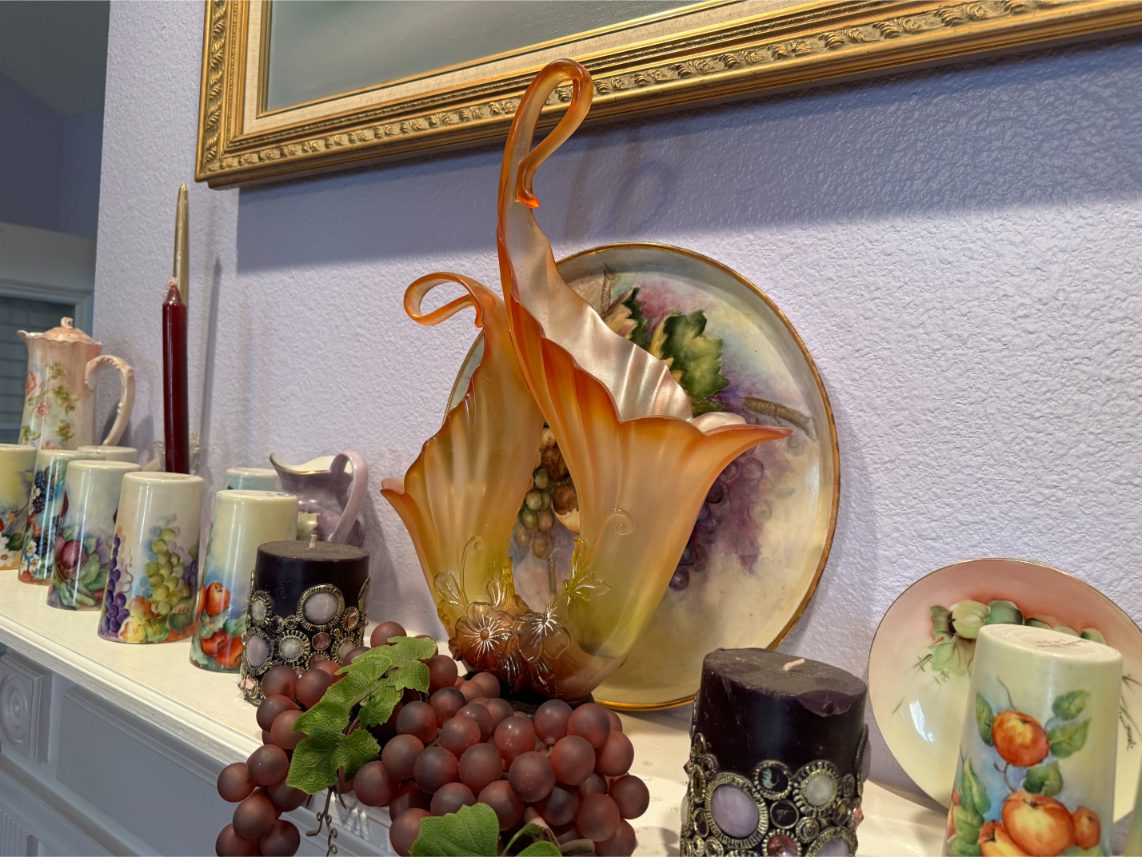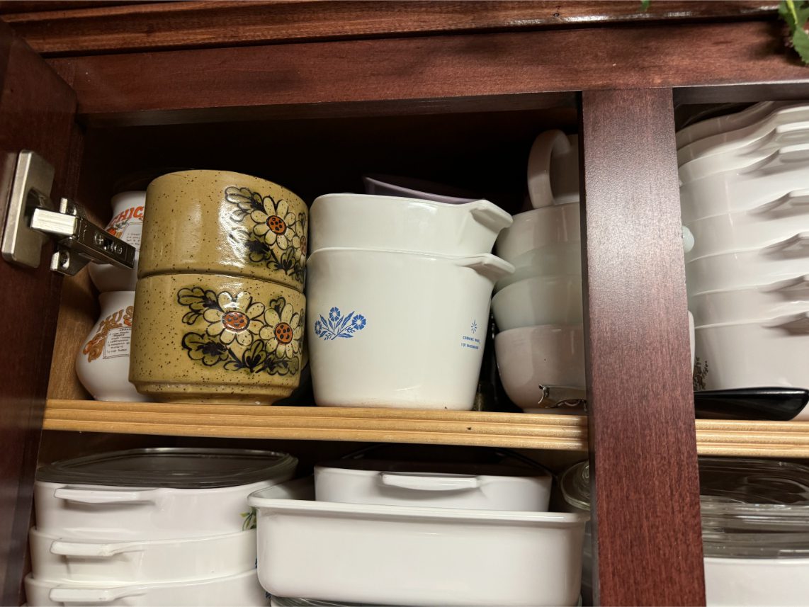 Glassware: Serving Dishes – Wine Glasses – Pitchers – Amber Glass – Fenton – Porcelain Honeypot – Dresden Pitcher – Wedding Vases – Corelle Snowflake Glasses – Crystal Bowls – Rosaline Crystal – Fenton Lavender Wisteria Tree of Life Compote – Depression – Avon Glasses – Ruby Red Glasses – Carnival Glass – Nippon Pink Roses Tea Set – Fenton Bells – Limoge Punch Bowls – CorningwareÂ