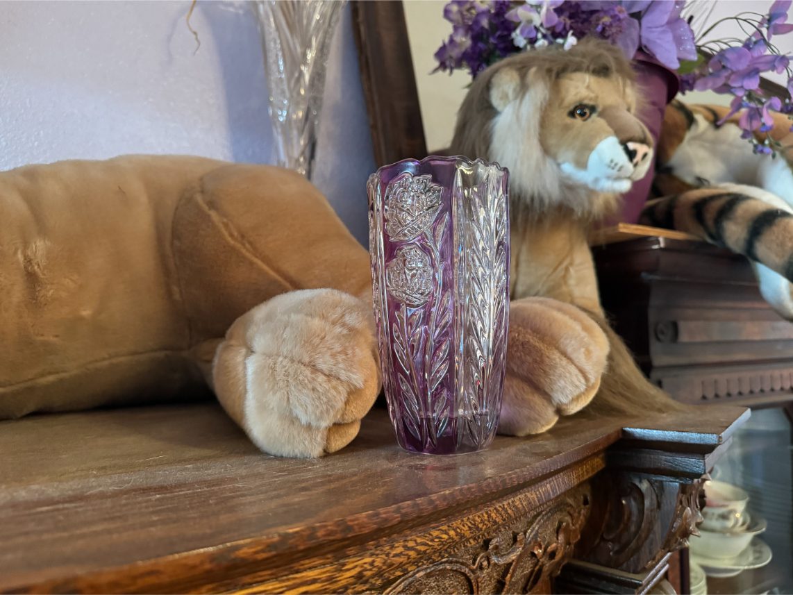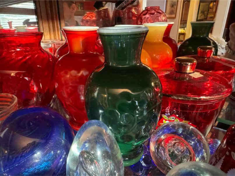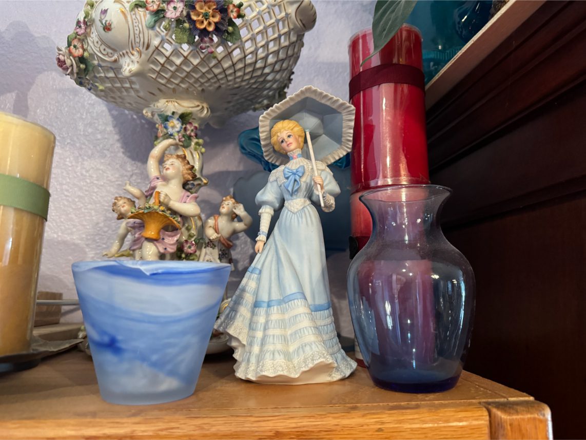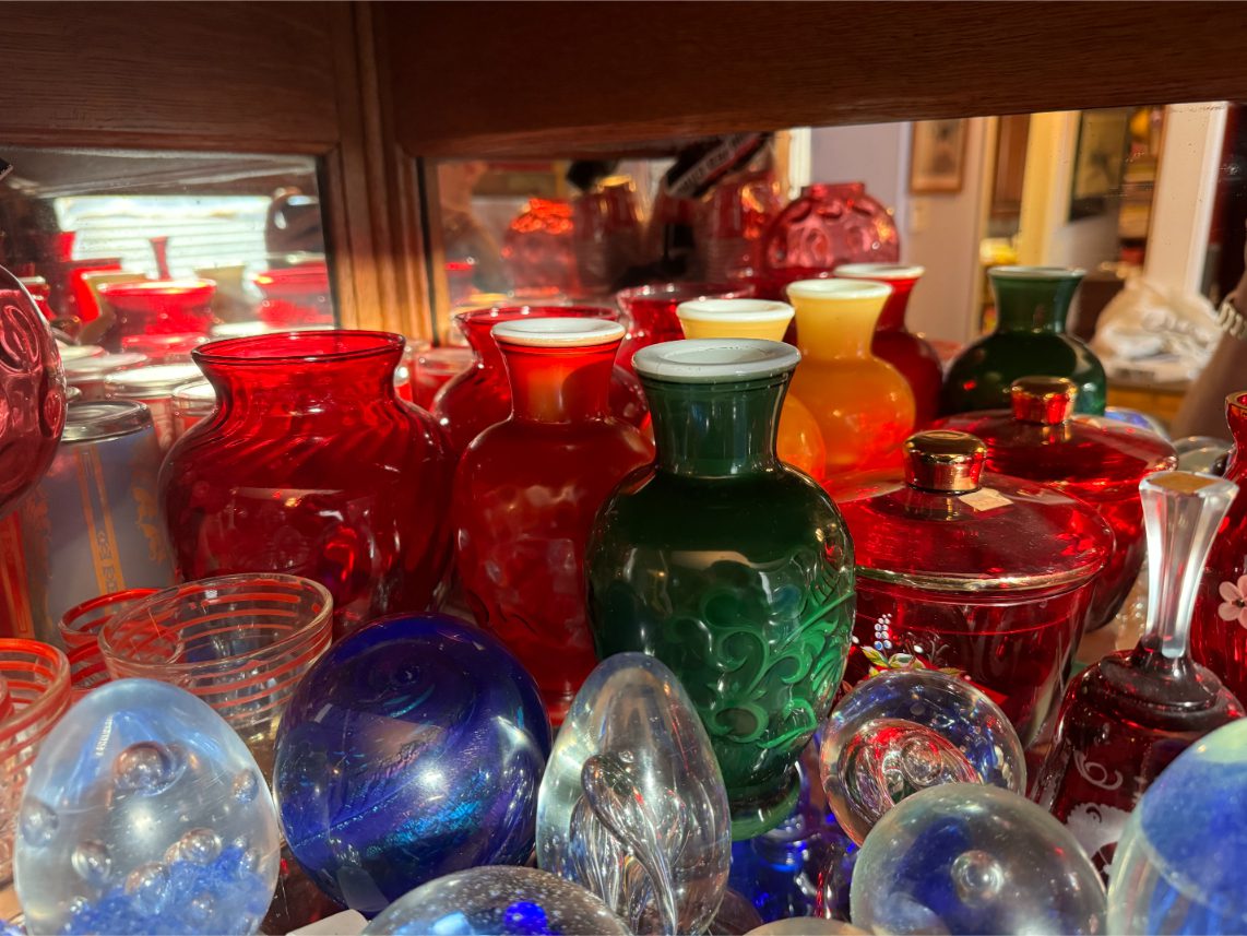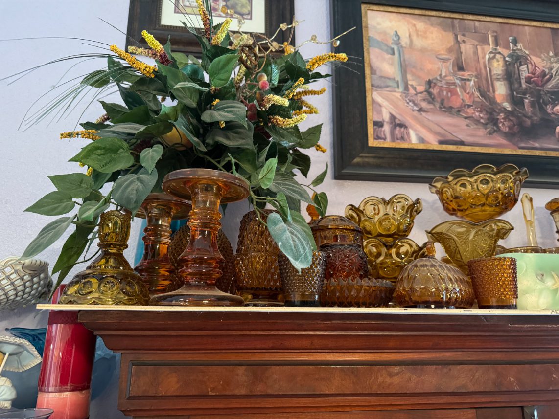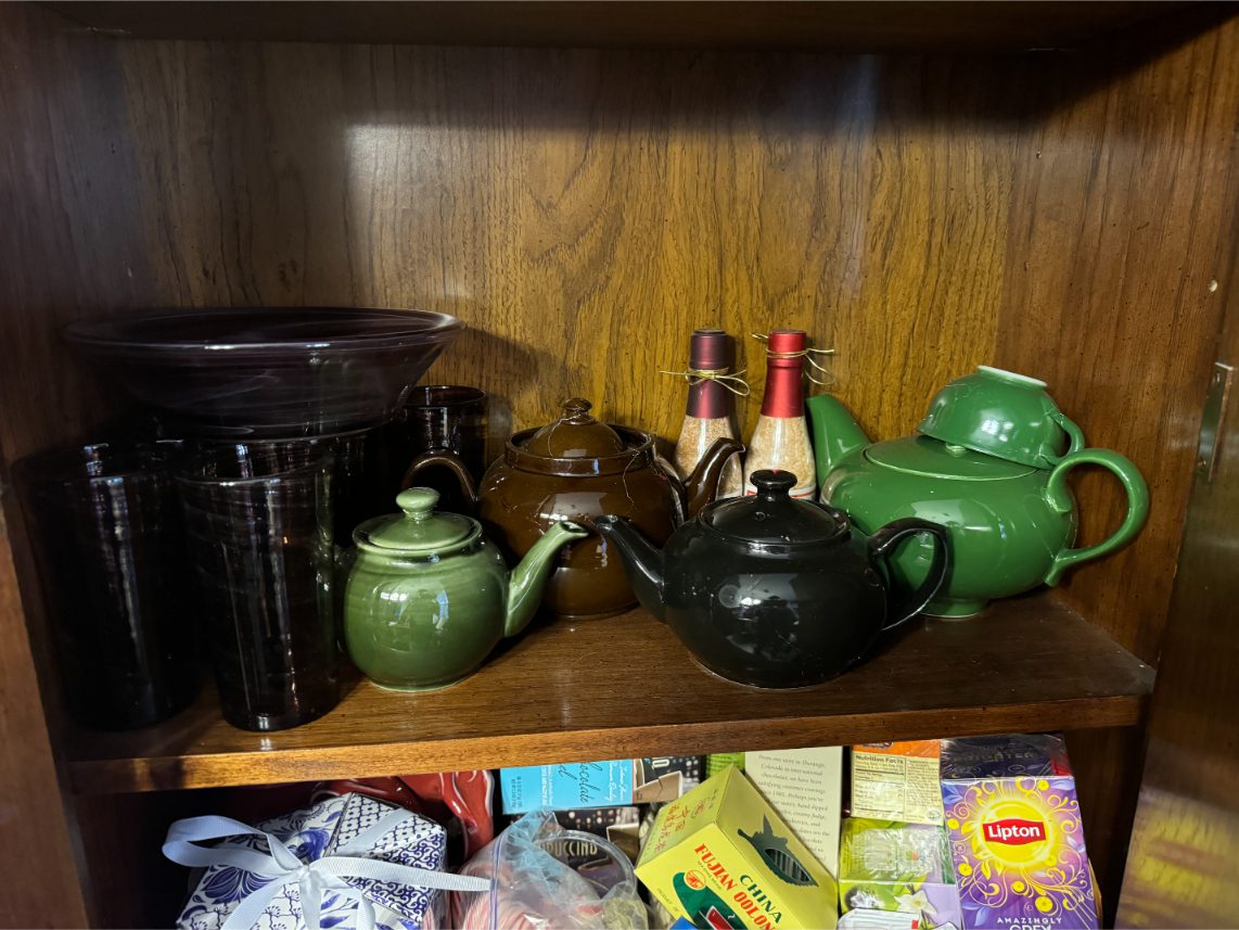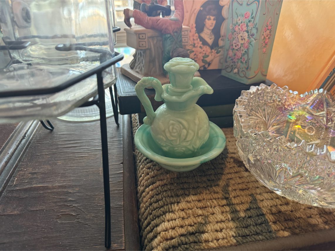 Glassware: Serving Dishes – Wine Glasses – Pitchers – Amber Glass – Fenton – Porcelain Honeypot – Dresden Pitcher – Wedding Vases – Corelle Snowflake Glasses – Crystal Bowls – Rosaline Crystal – Fenton Lavender Wisteria Tree of Life Compote – Depression – Avon Glasses – Ruby Red Glasses – Carnival Glass – Nippon Pink Roses Tea Set – Fenton Bells – Limoge Punch Bowls – CorningwareÂ