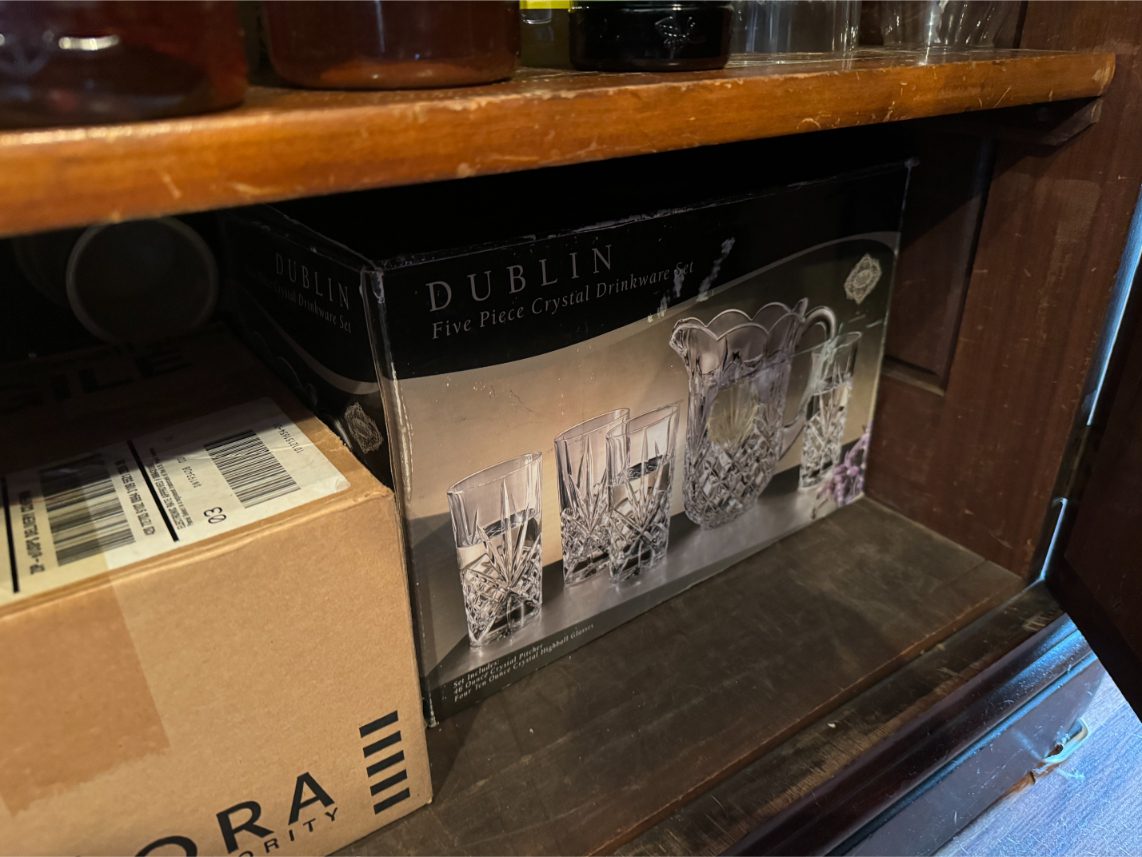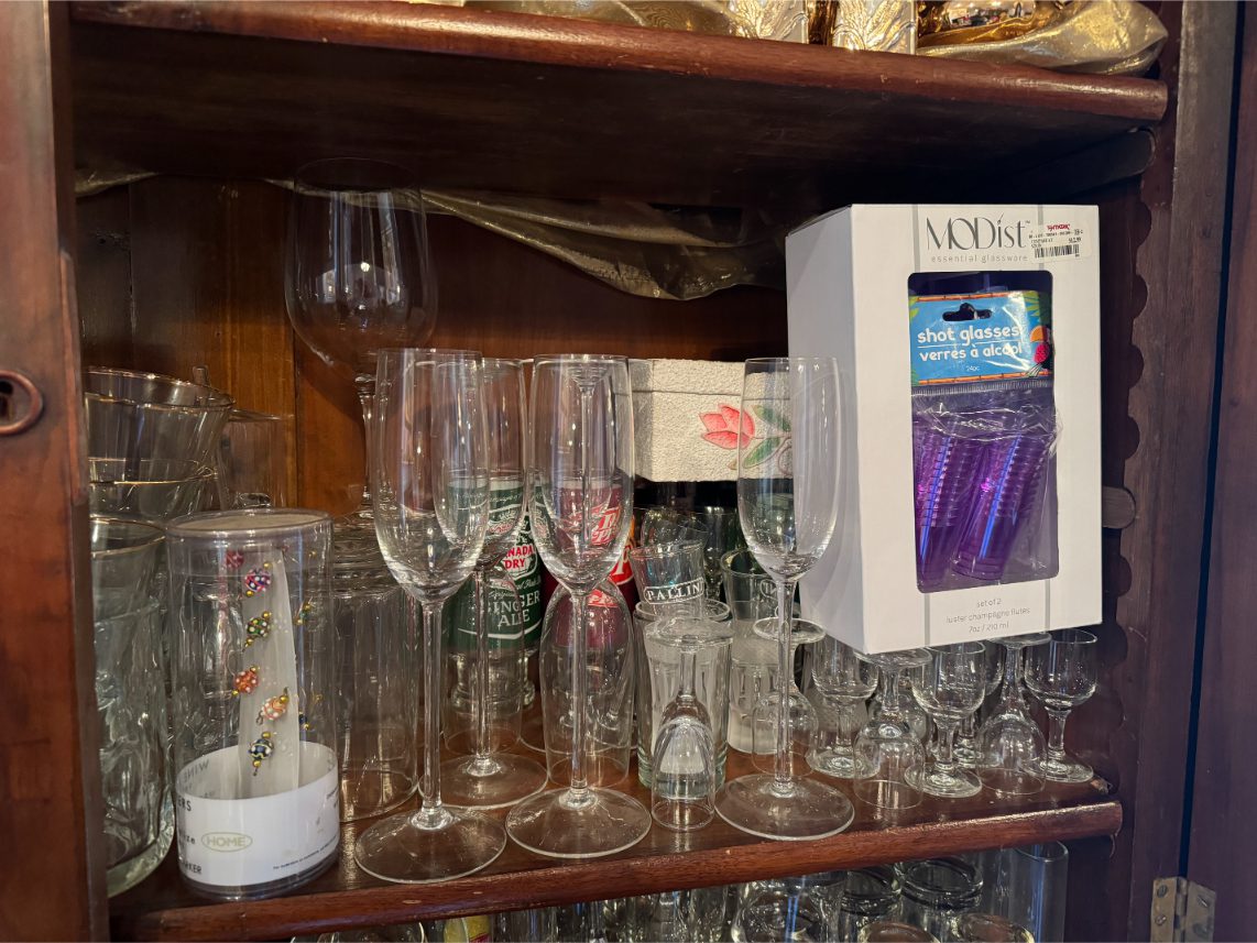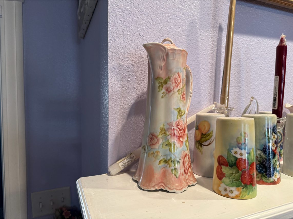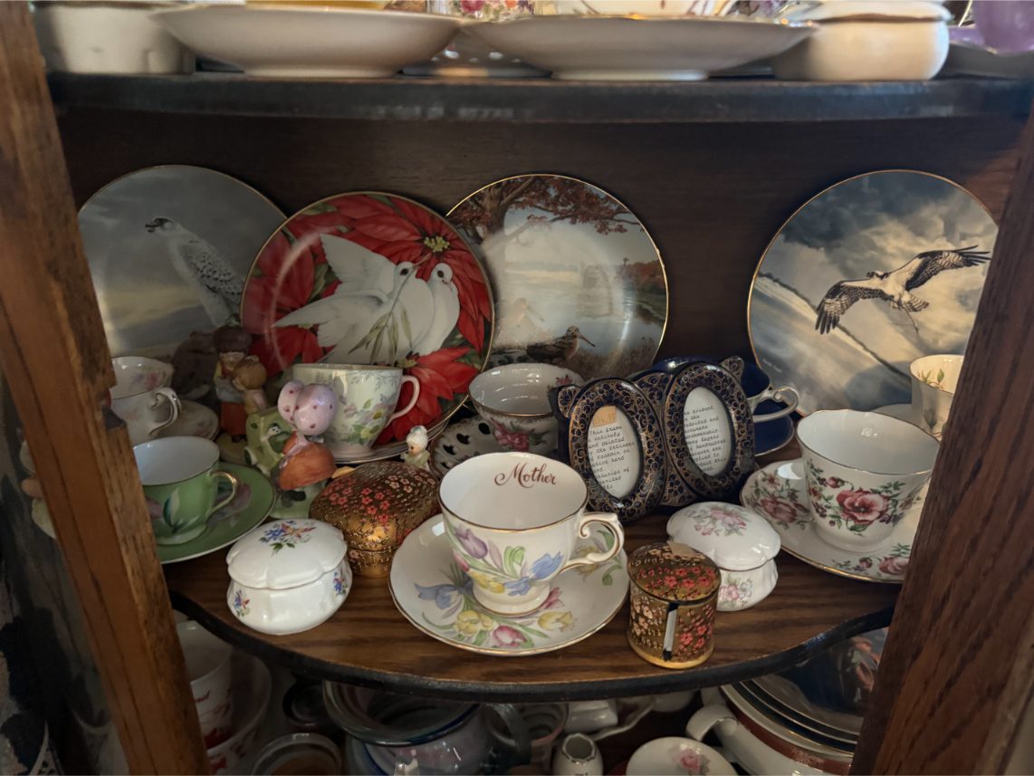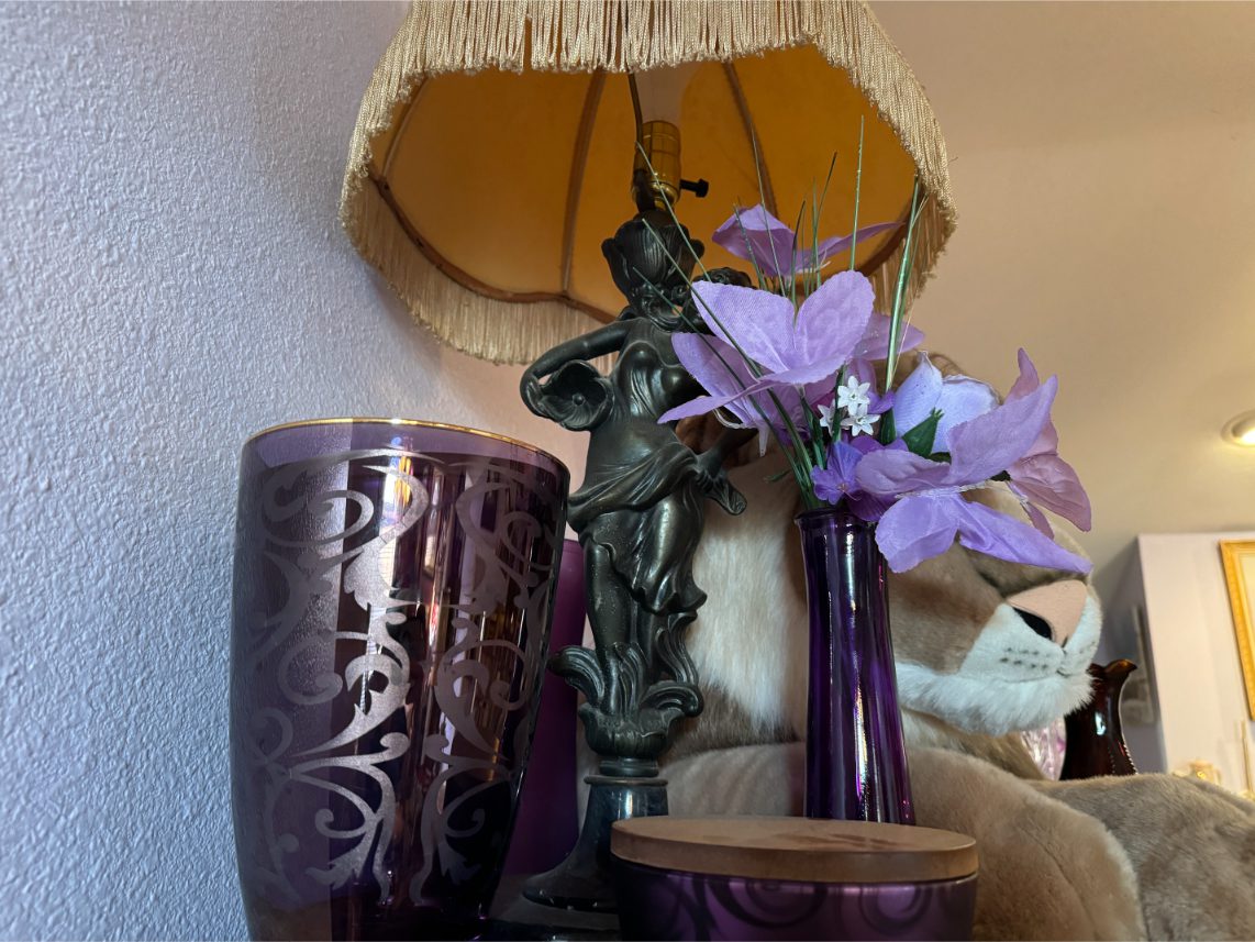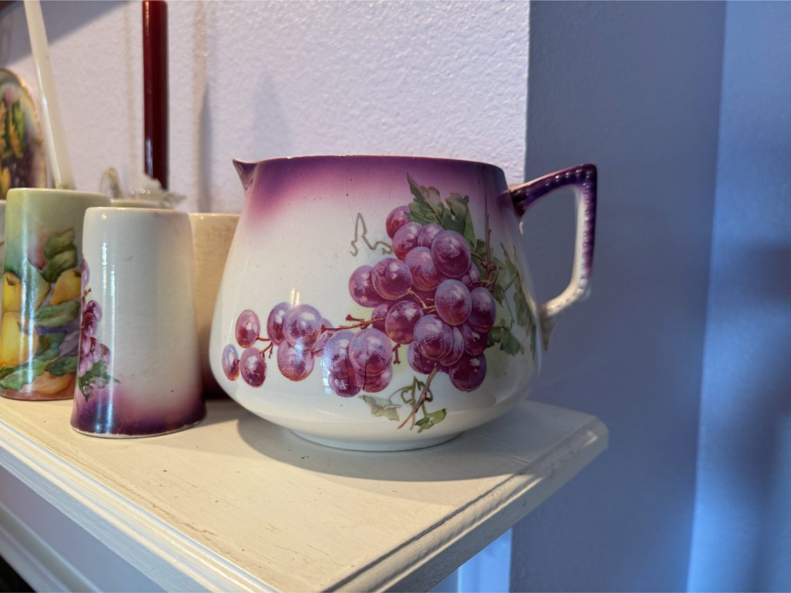 Glassware: Serving Dishes – Wine Glasses – Pitchers – Amber Glass – Fenton – Porcelain Honeypot – Dresden Pitcher – Wedding Vases – Corelle Snowflake Glasses – Crystal Bowls – Rosaline Crystal – Fenton Lavender Wisteria Tree of Life Compote – Depression – Avon Glasses – Ruby Red Glasses – Carnival Glass – Nippon Pink Roses Tea Set – Fenton Bells – Limoge Punch Bowls – CorningwareÂ