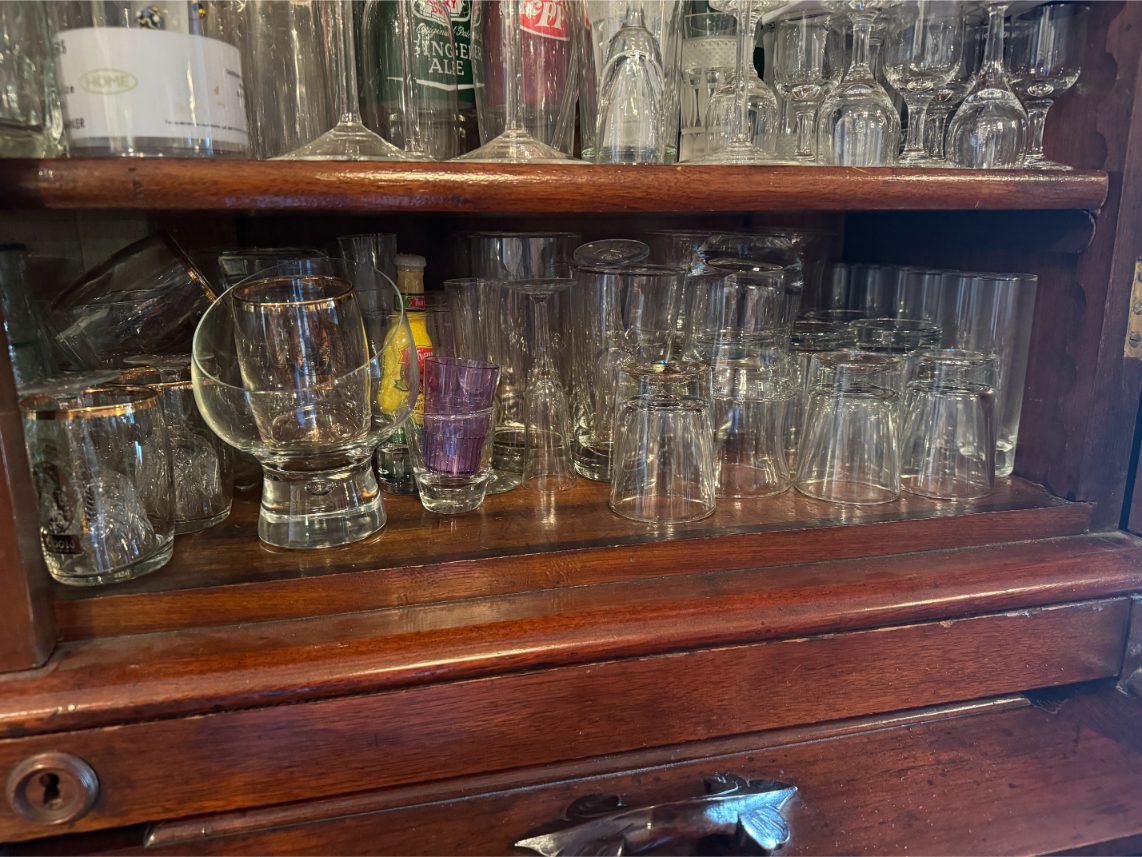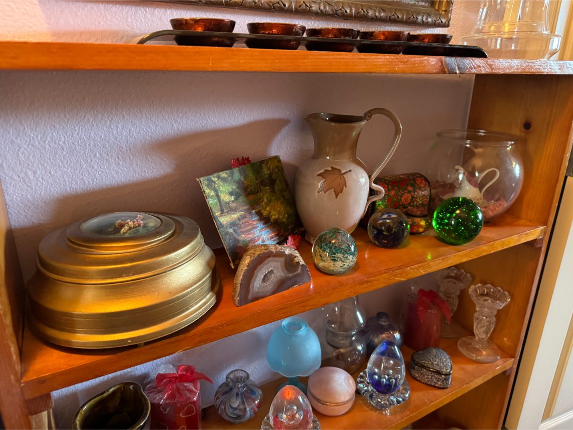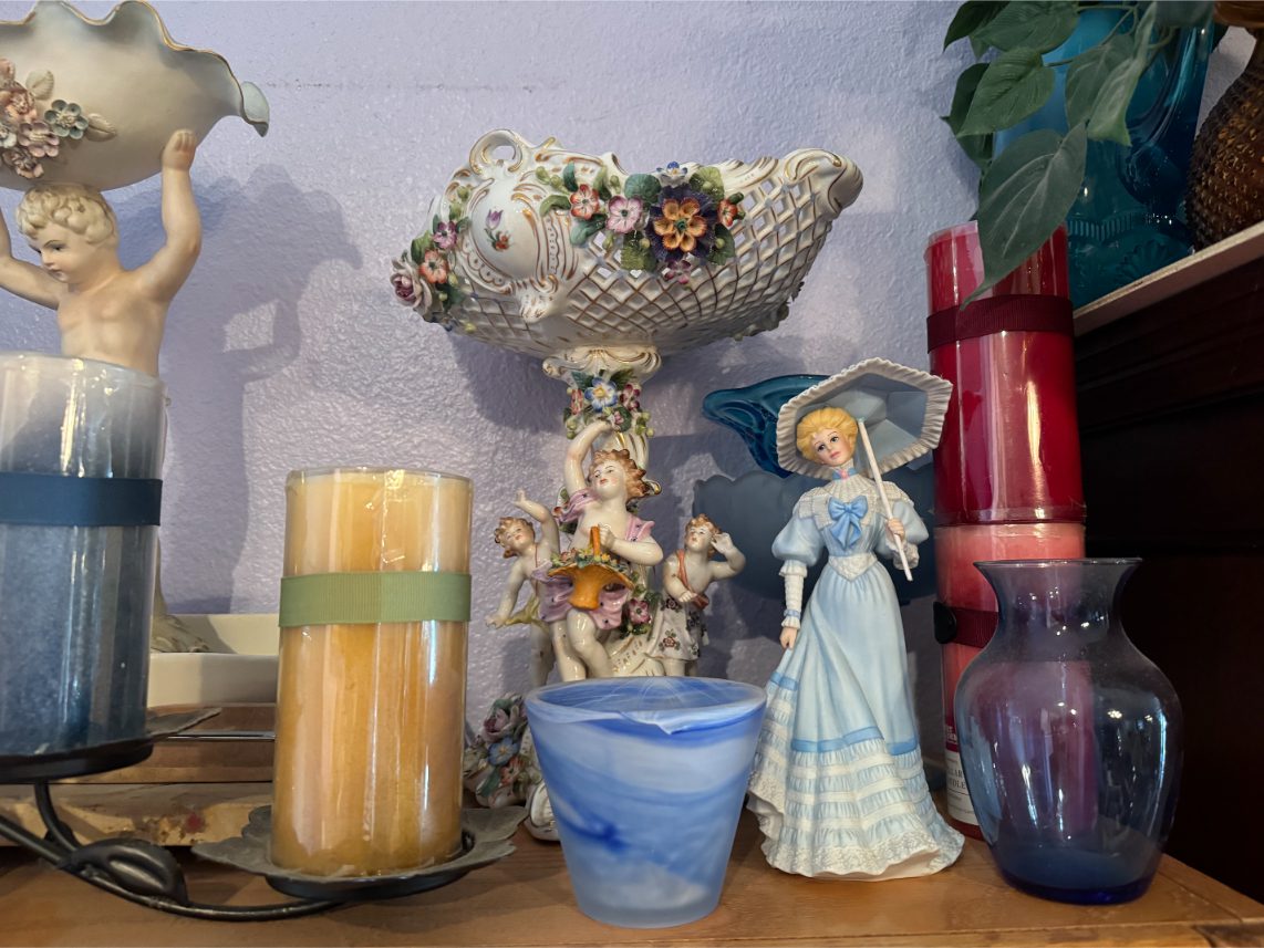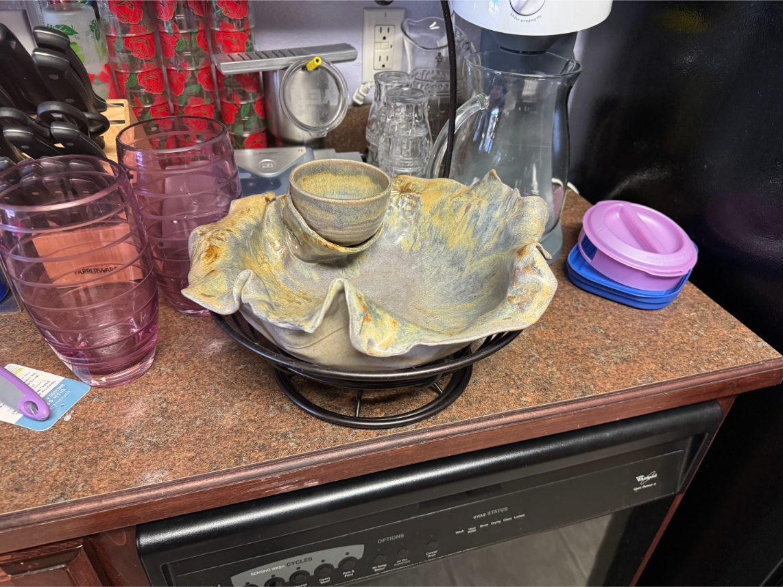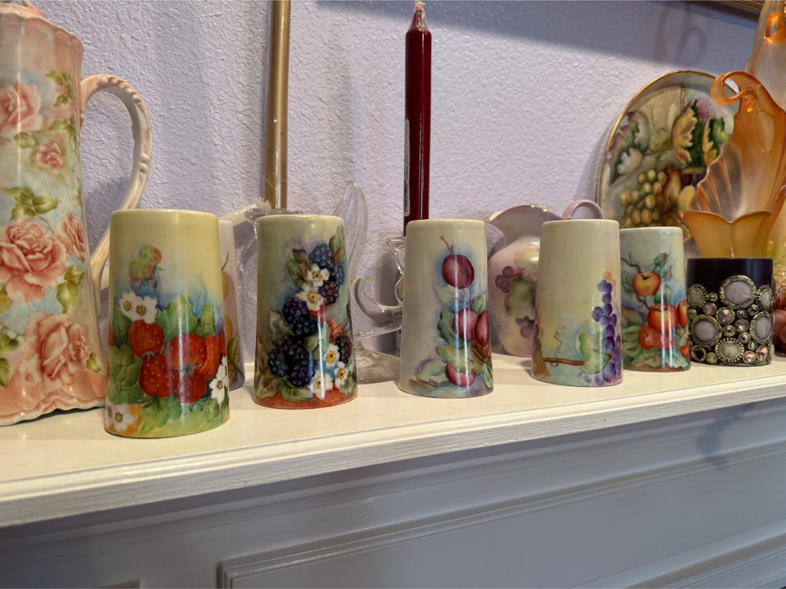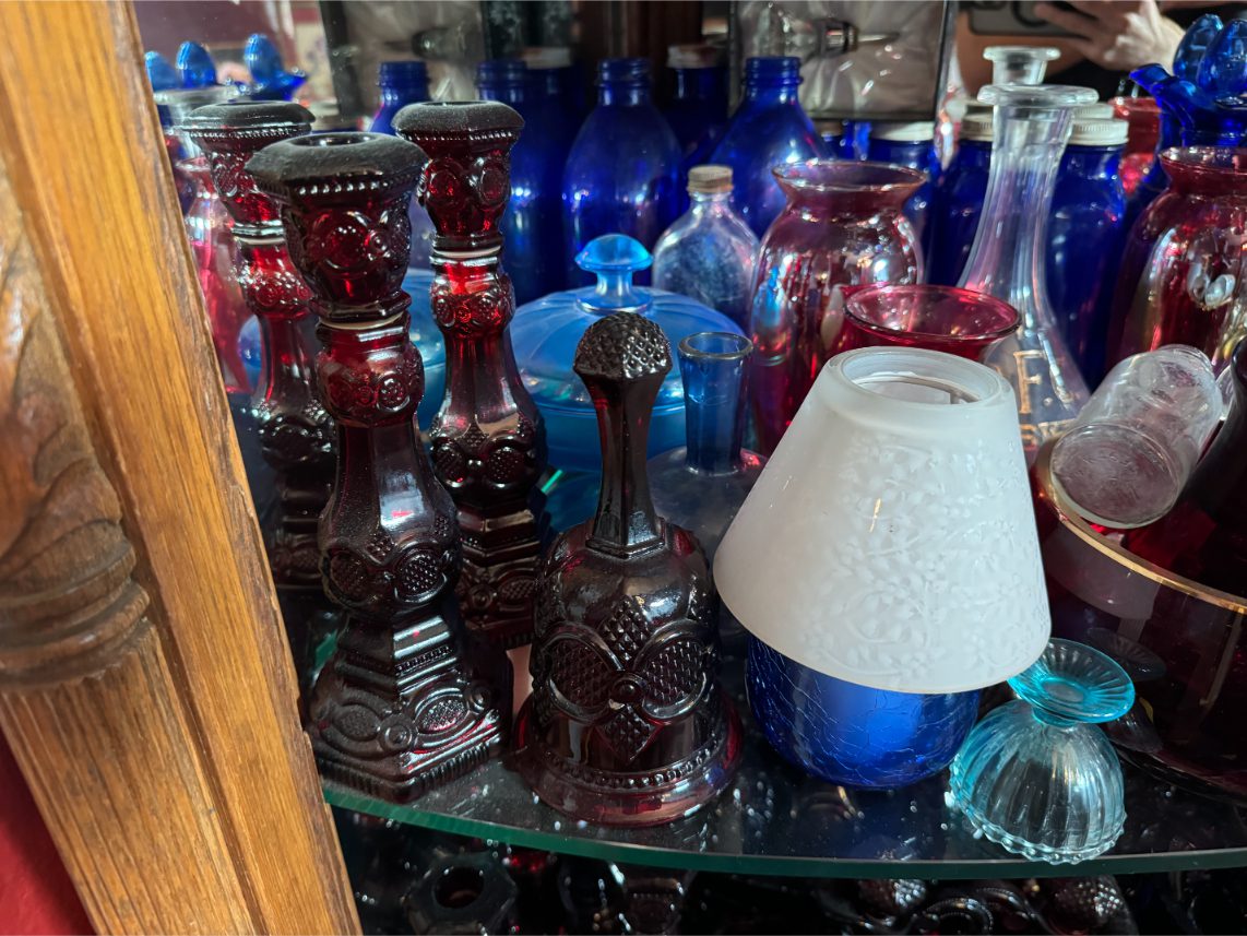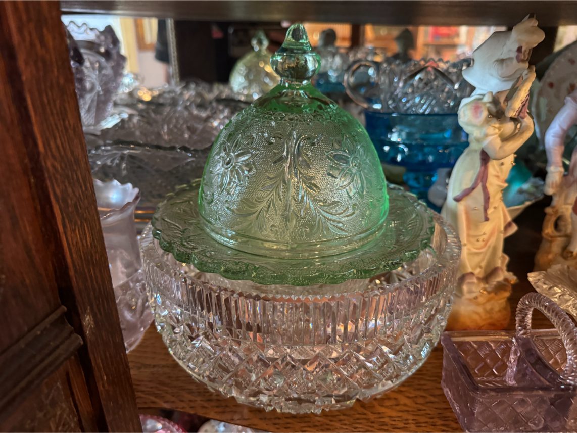 Glassware: Serving Dishes – Wine Glasses – Pitchers – Amber Glass – Fenton – Porcelain Honeypot – Dresden Pitcher – Wedding Vases – Corelle Snowflake Glasses – Crystal Bowls – Rosaline Crystal – Fenton Lavender Wisteria Tree of Life Compote – Depression – Avon Glasses – Ruby Red Glasses – Carnival Glass – Nippon Pink Roses Tea Set – Fenton Bells – Limoge Punch Bowls – CorningwareÂ