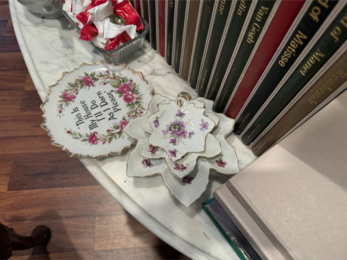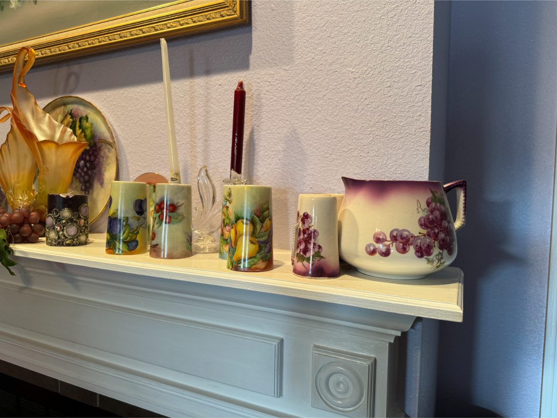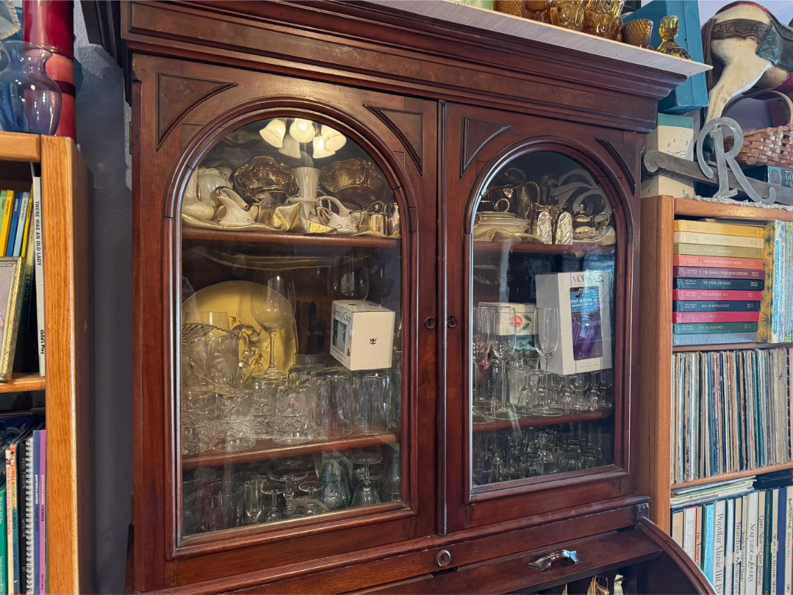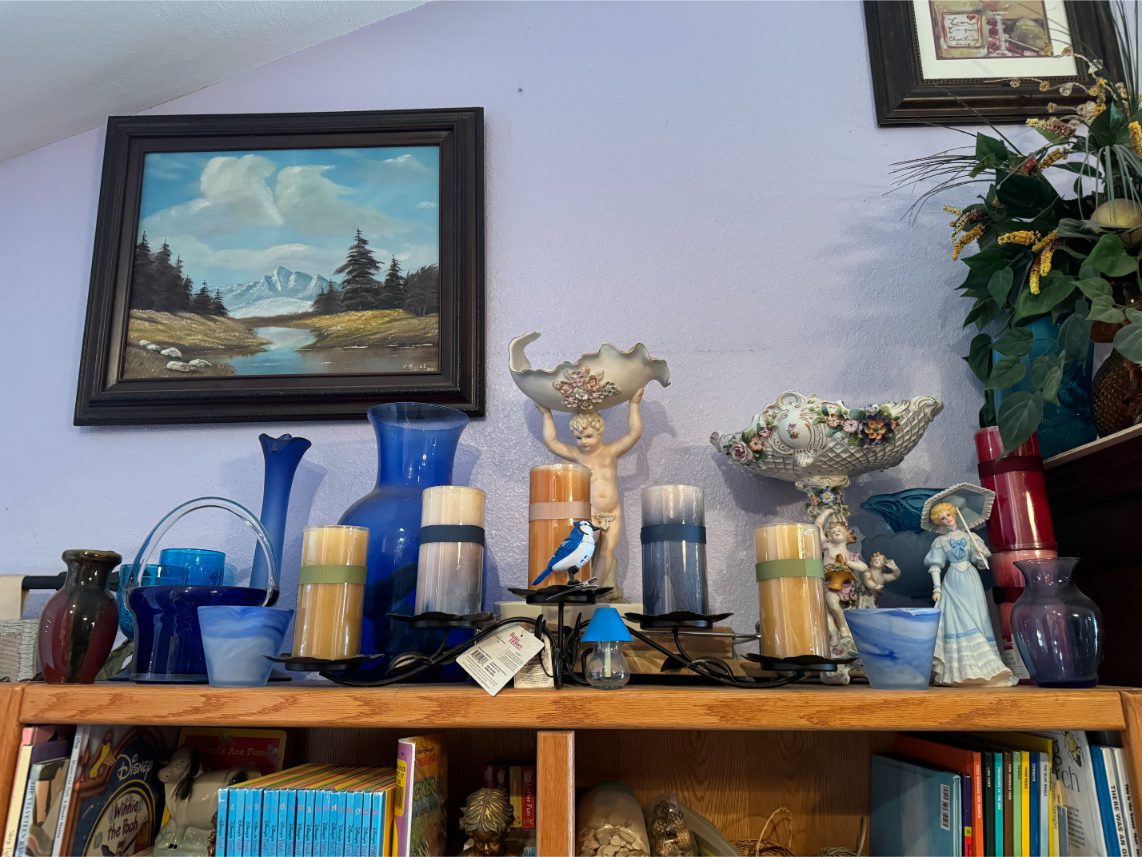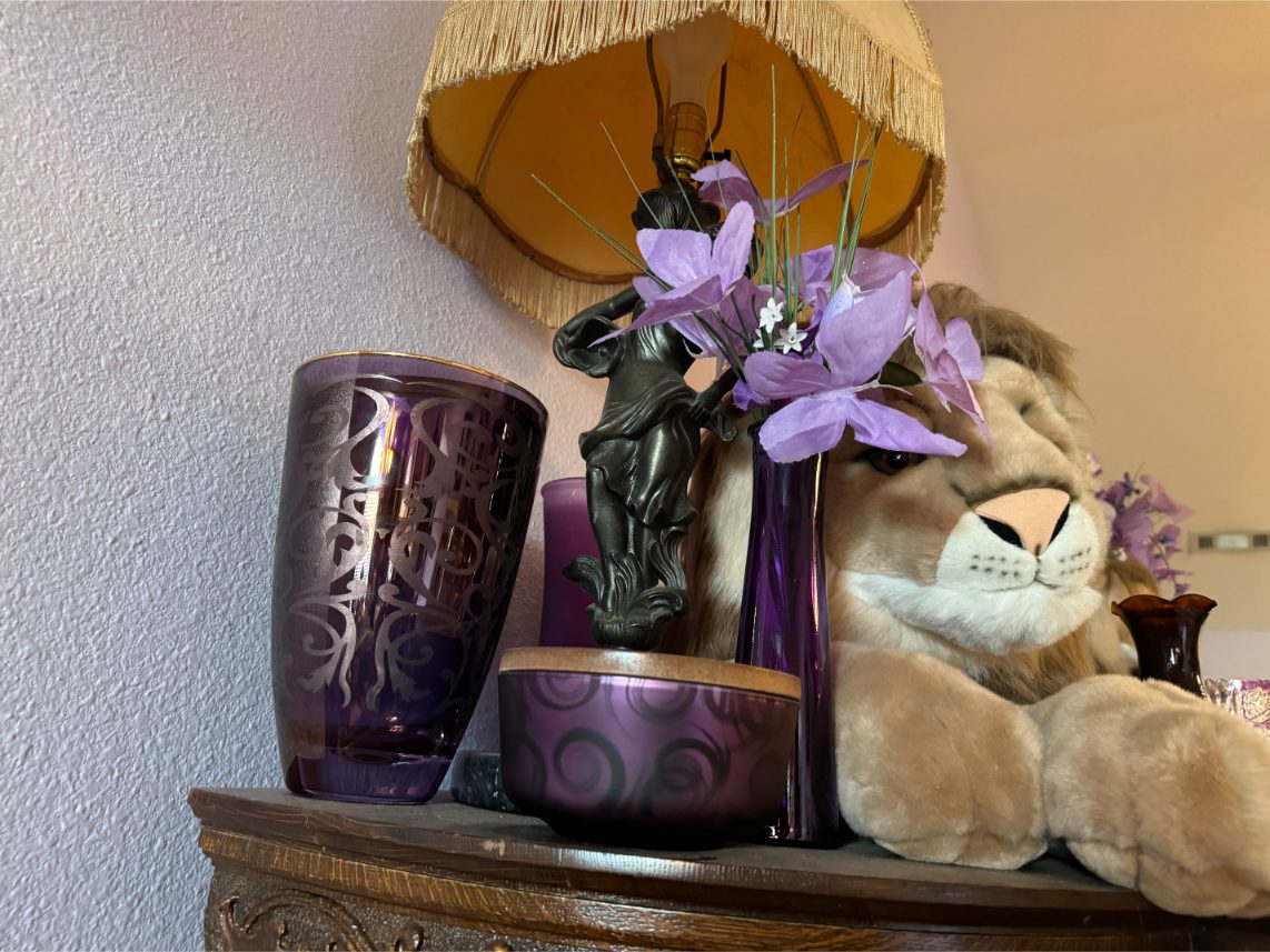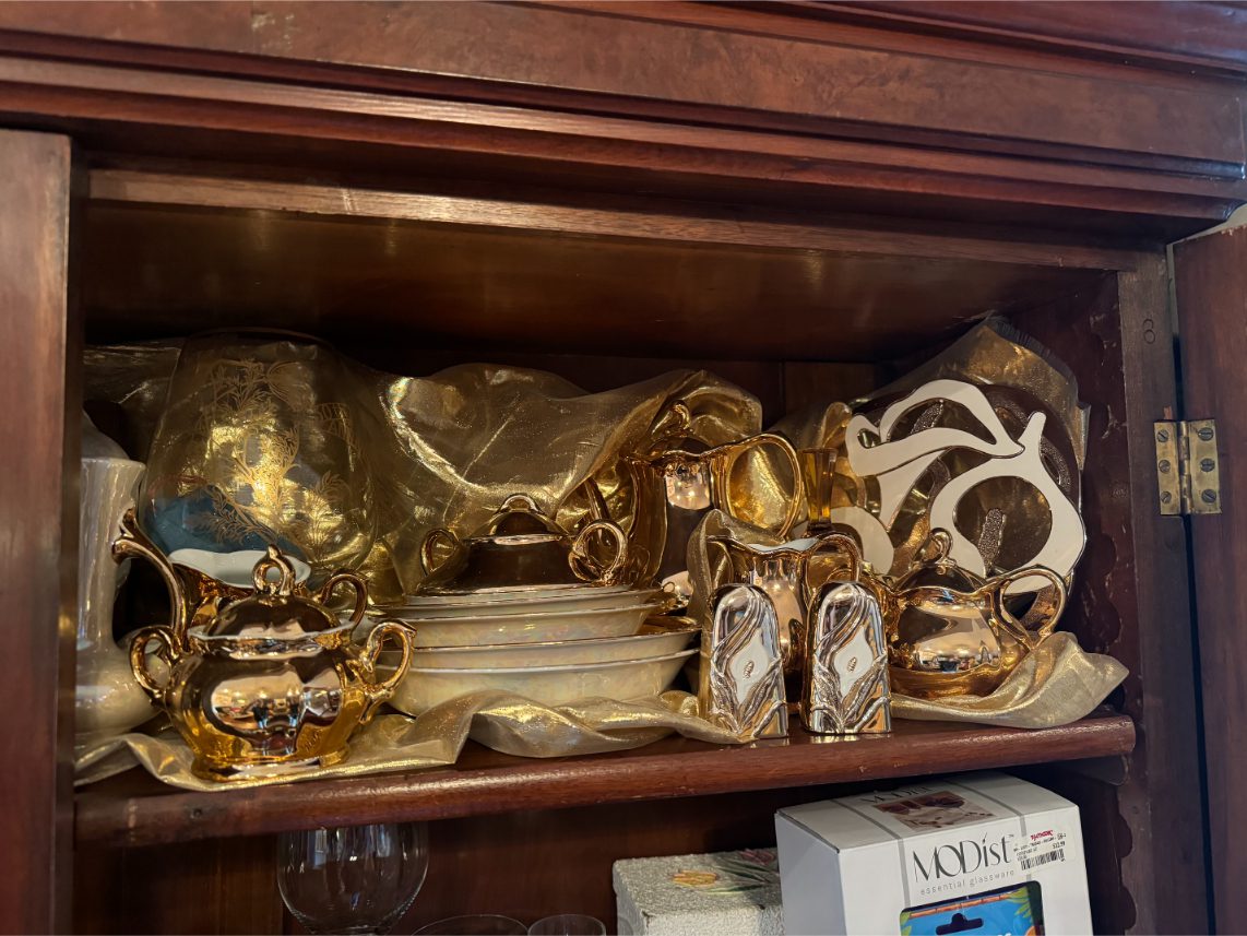 Glassware: Serving Dishes – Wine Glasses – Pitchers – Amber Glass – Fenton – Porcelain Honeypot – Dresden Pitcher – Wedding Vases – Corelle Snowflake Glasses – Crystal Bowls – Rosaline Crystal – Fenton Lavender Wisteria Tree of Life Compote – Depression – Avon Glasses – Ruby Red Glasses – Carnival Glass – Nippon Pink Roses Tea Set – Fenton Bells – Limoge Punch Bowls – CorningwareÂ